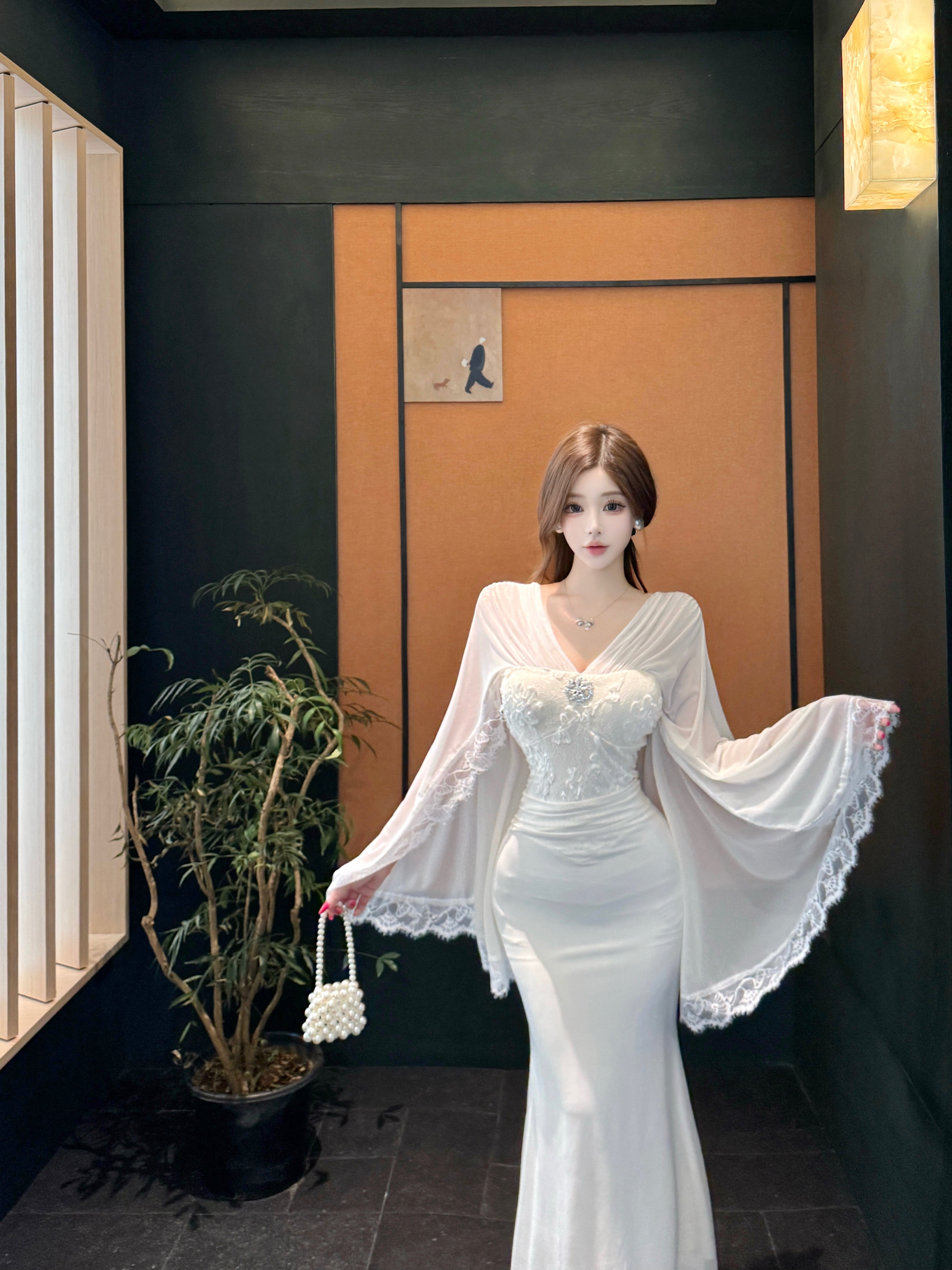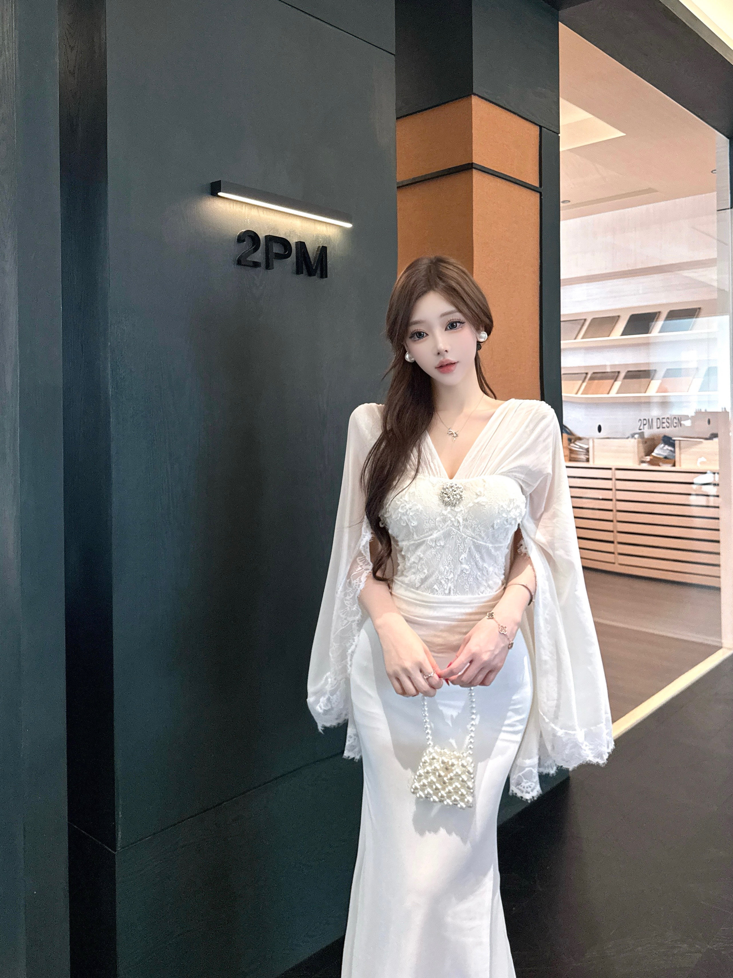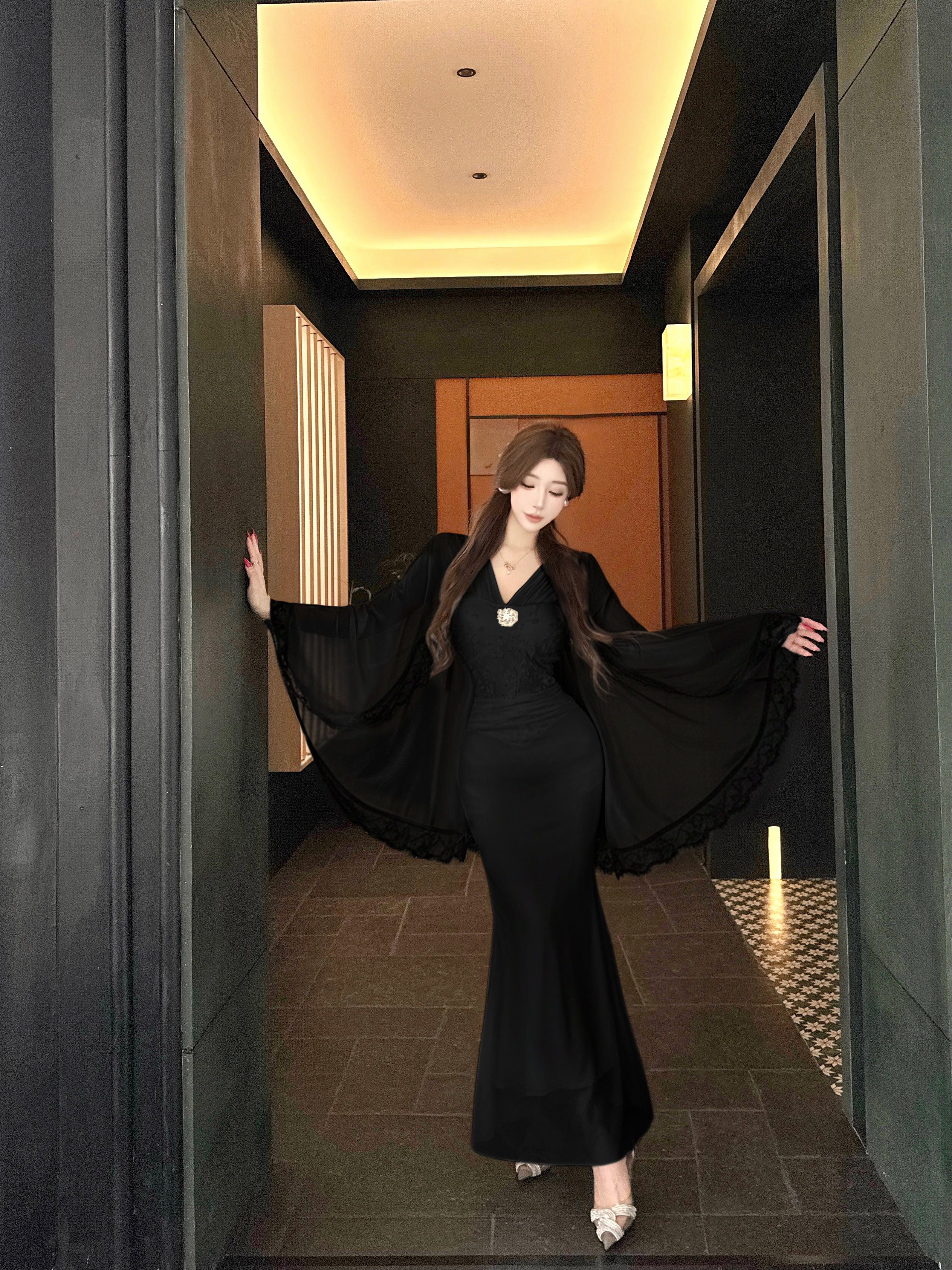 MY14077# 江南美人绝美高级感温柔纯欲性感飘带连肩袖设计感礼服显瘦裙女裝貨源服裝批發