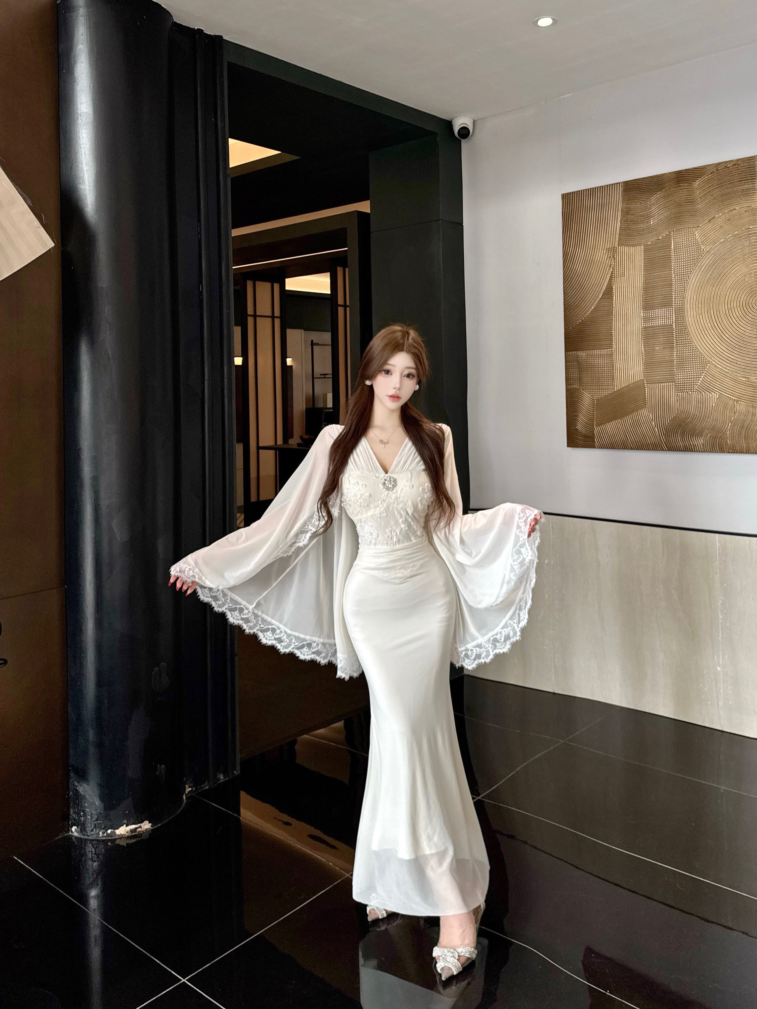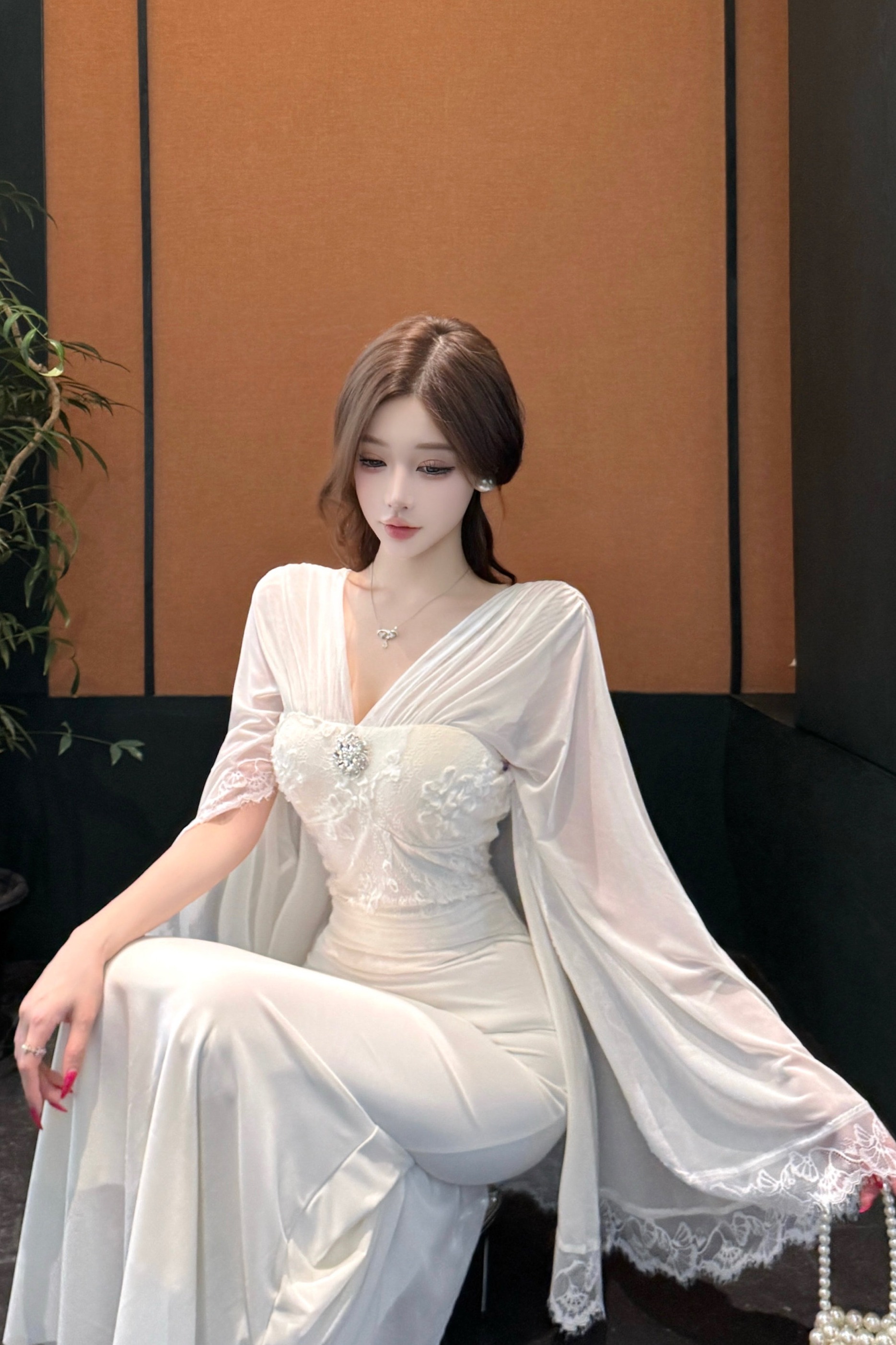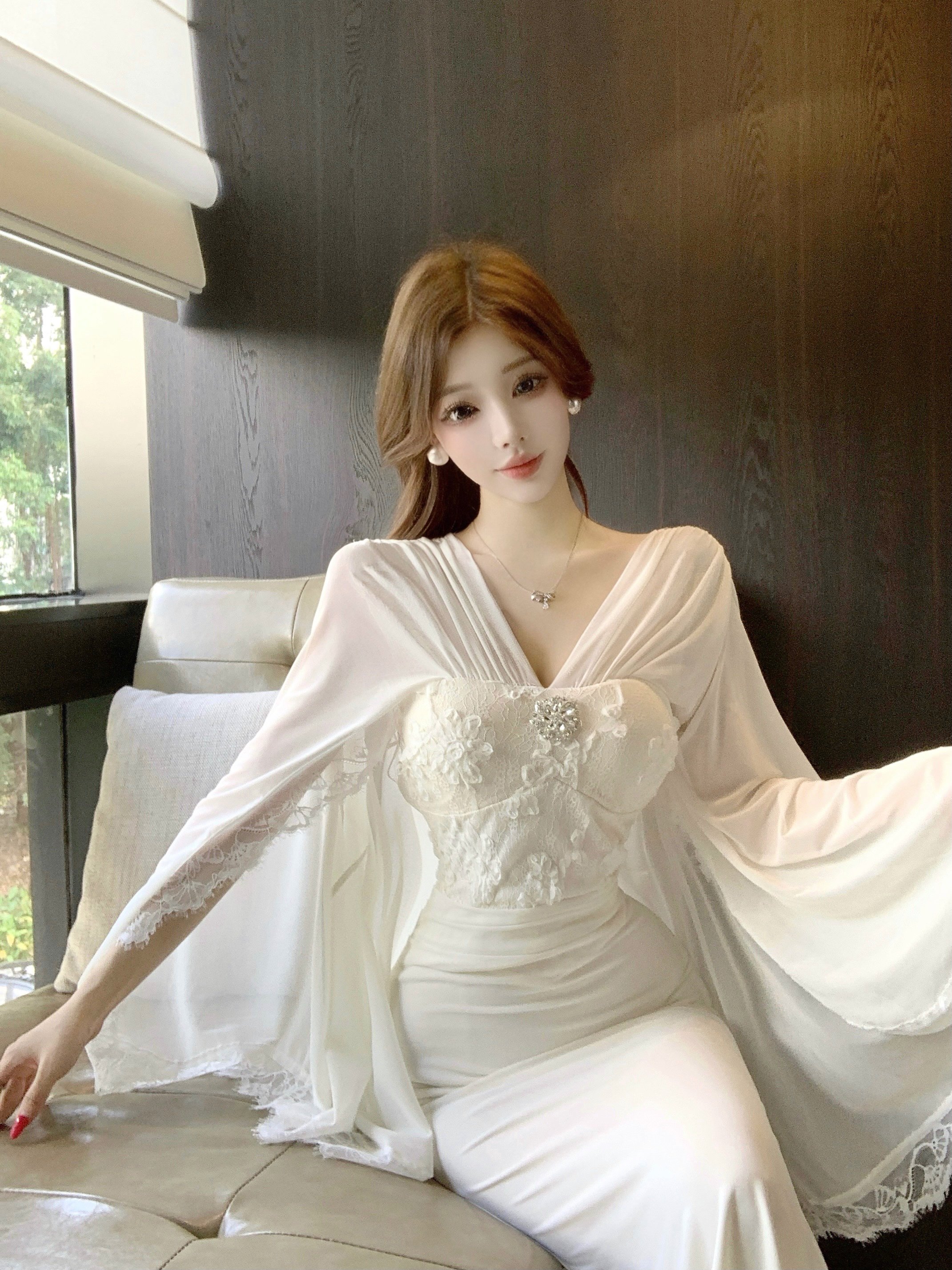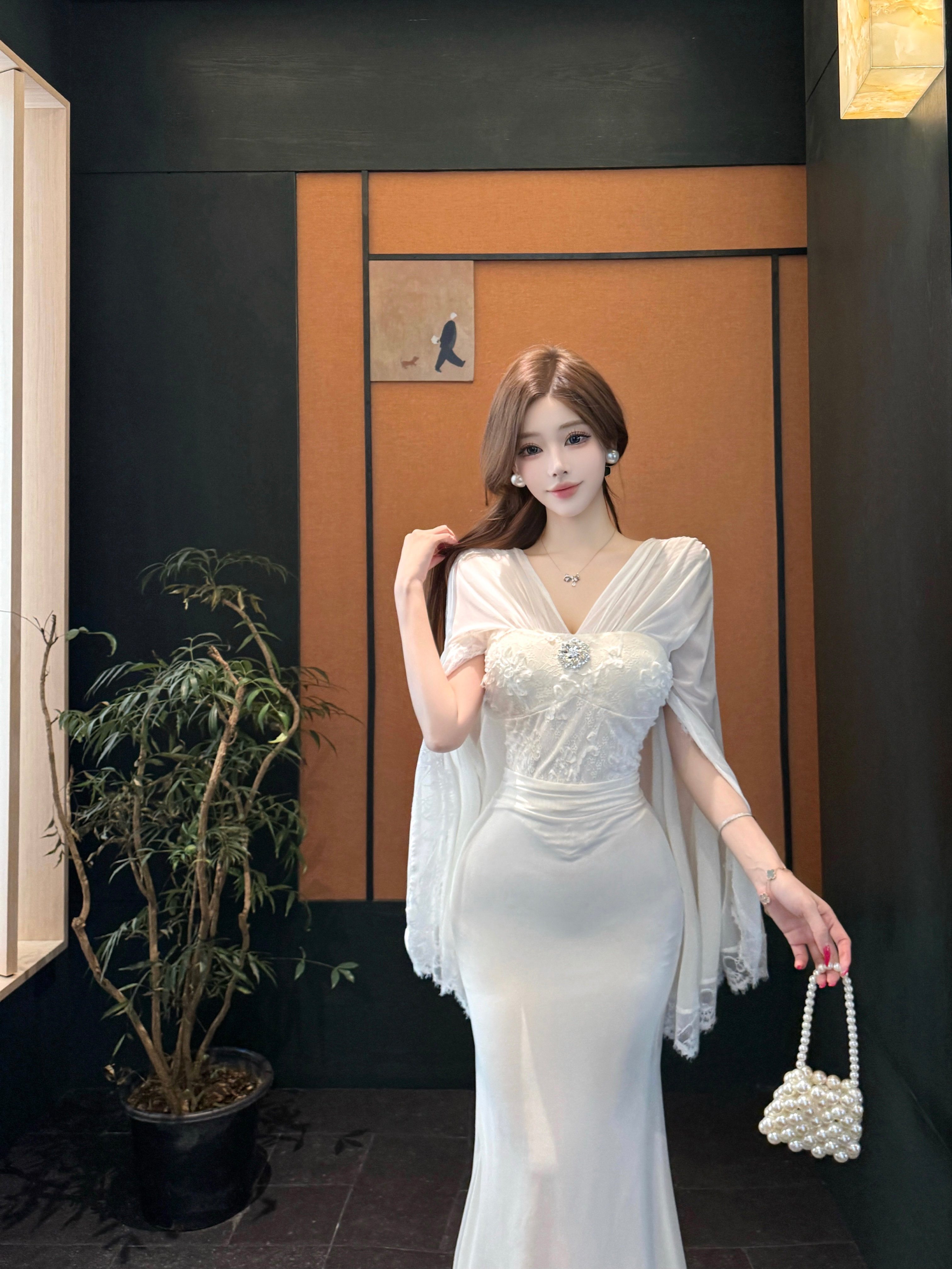 MY14077# 江南美人绝美高级感温柔纯欲性感飘带连肩袖设计感礼服显瘦裙女裝貨源服裝批發