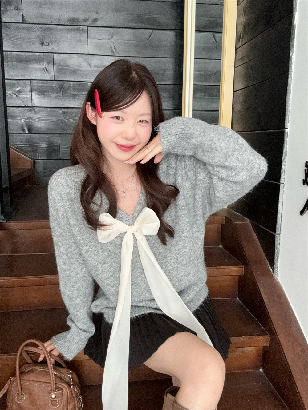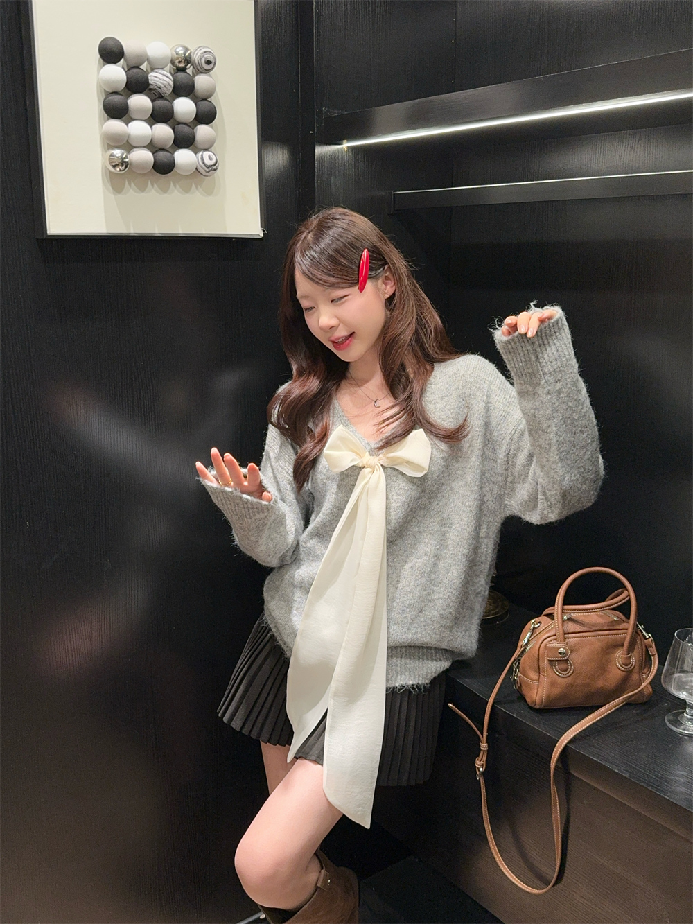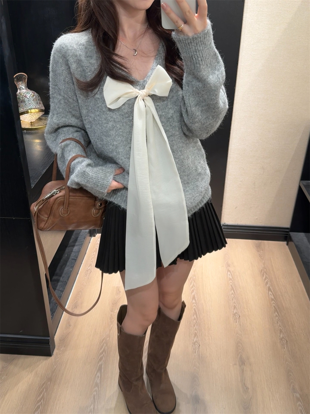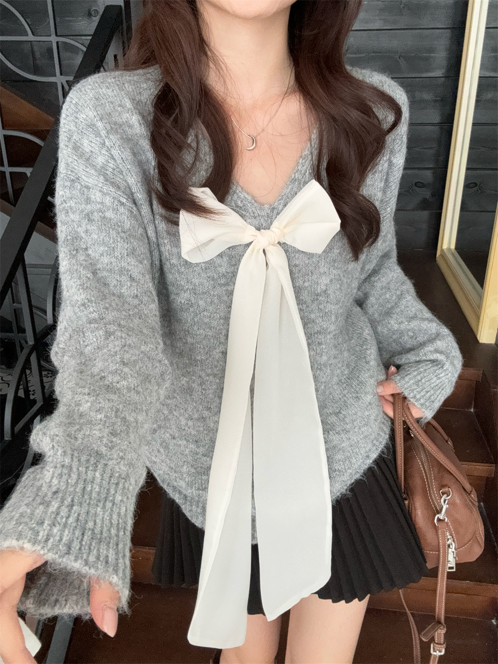 MY14082# 加厚慵懒宽松针织衫小香风上衣蝴蝶结V领套头毛衣女女裝貨源服裝批發