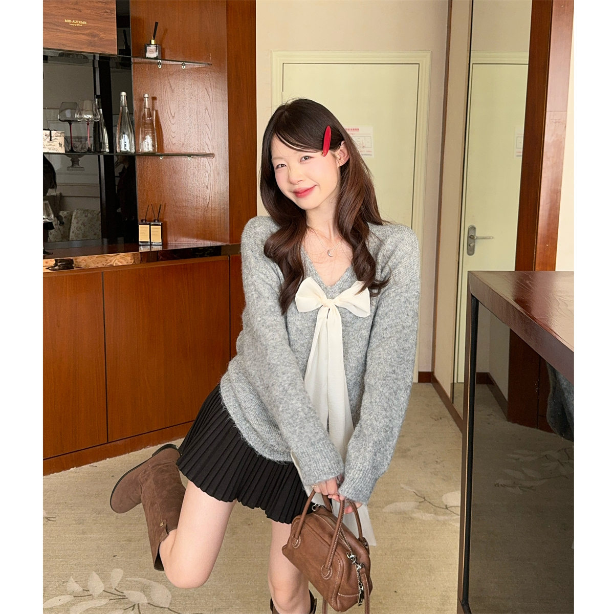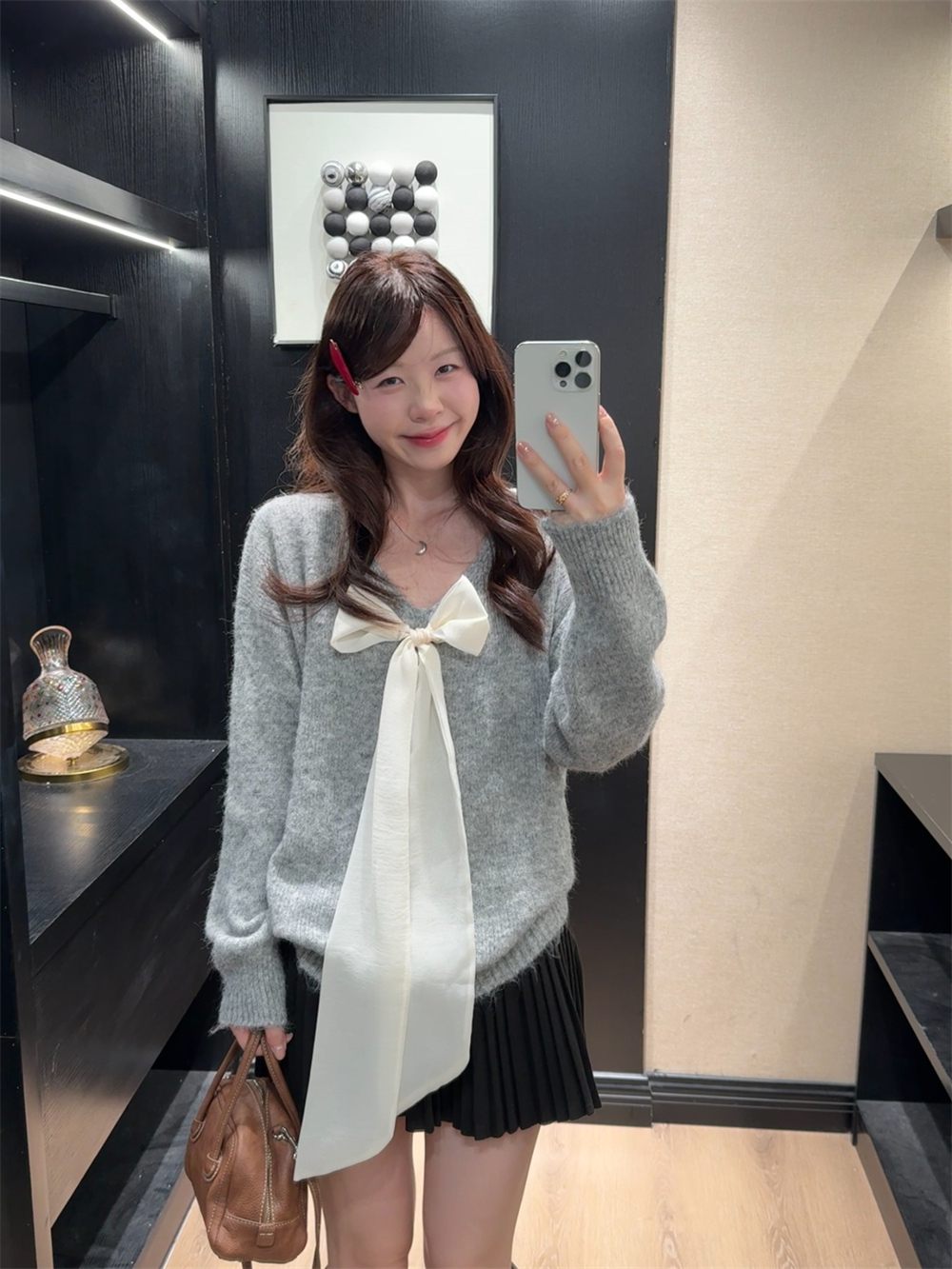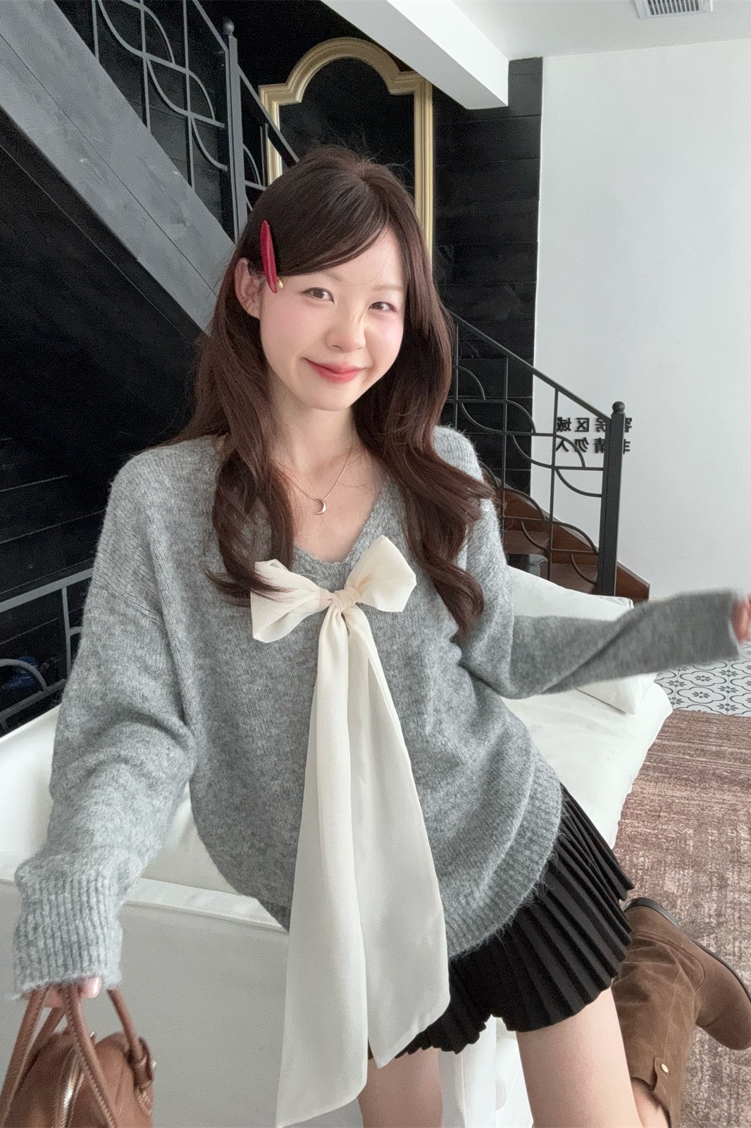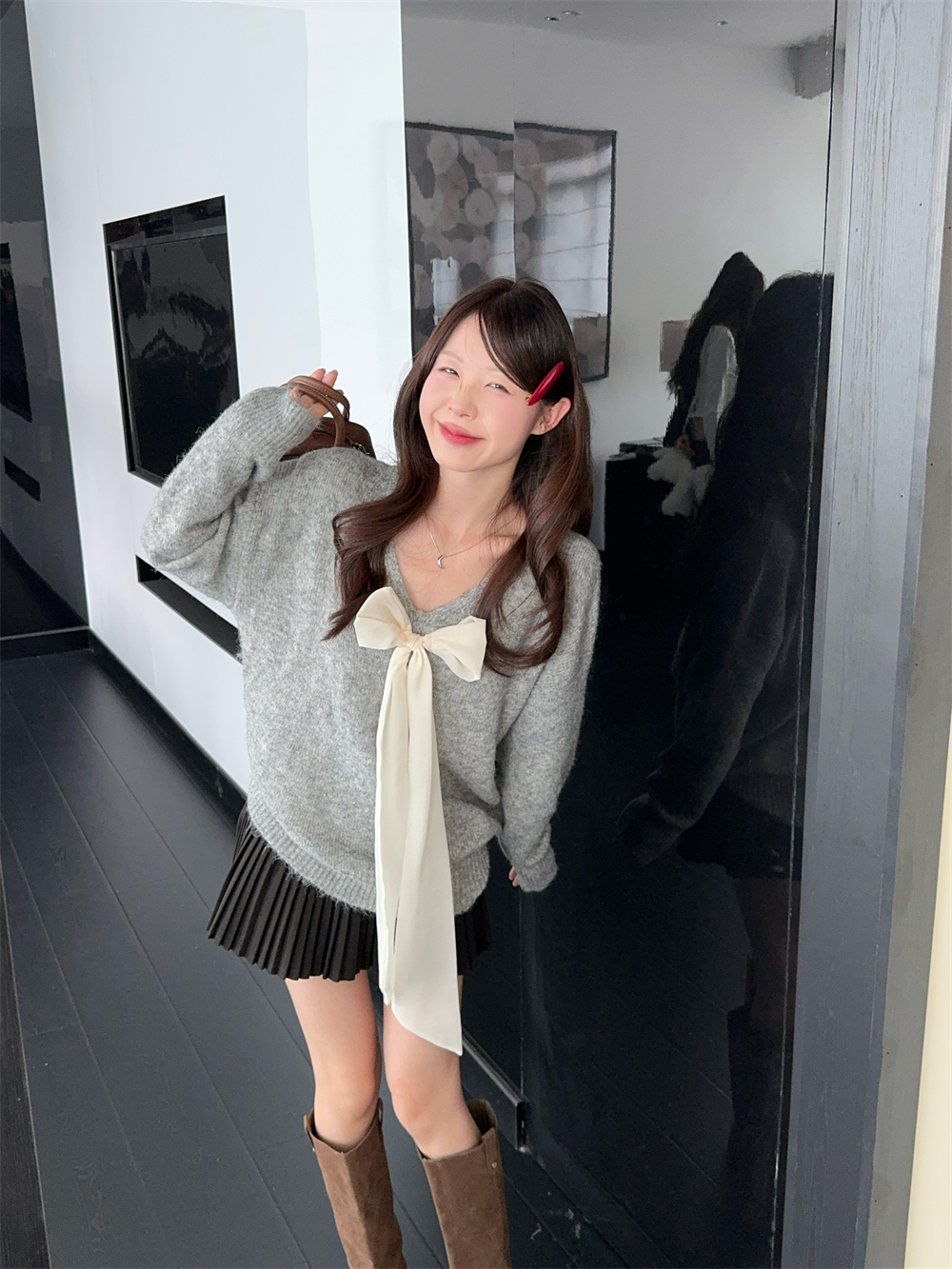 MY14082# 加厚慵懒宽松针织衫小香风上衣蝴蝶结V领套头毛衣女女裝貨源服裝批發