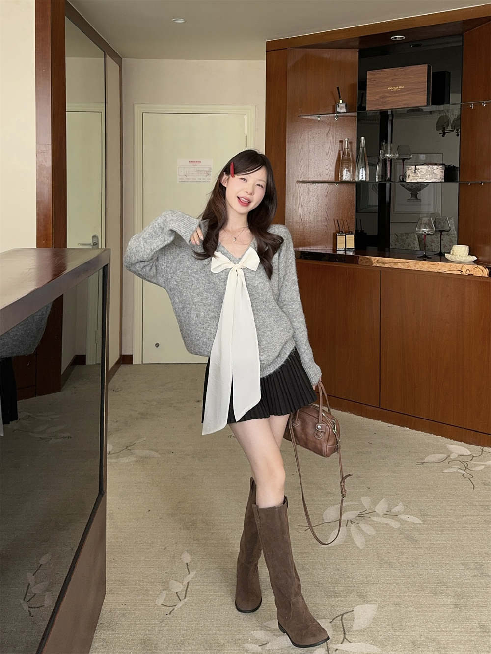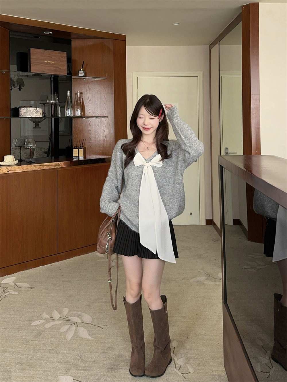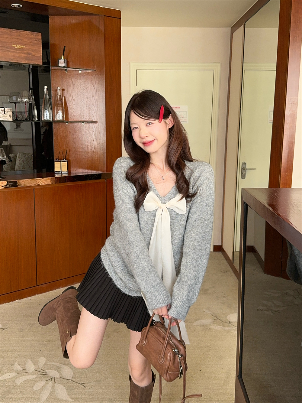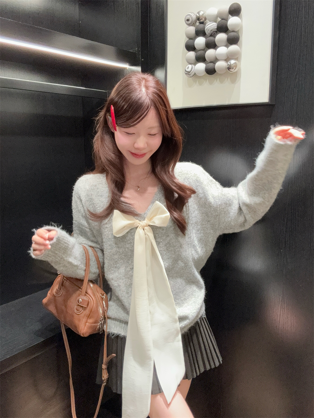MY14082# 加厚慵懒宽松针织衫小香风上衣蝴蝶结V领套头毛衣女女裝貨源服裝批發