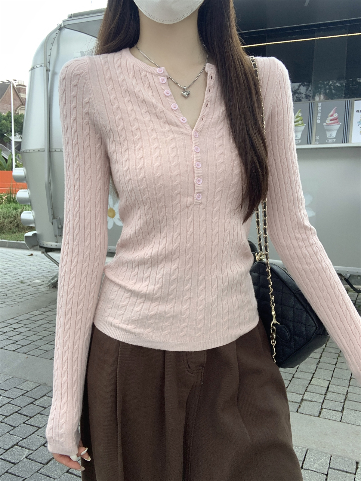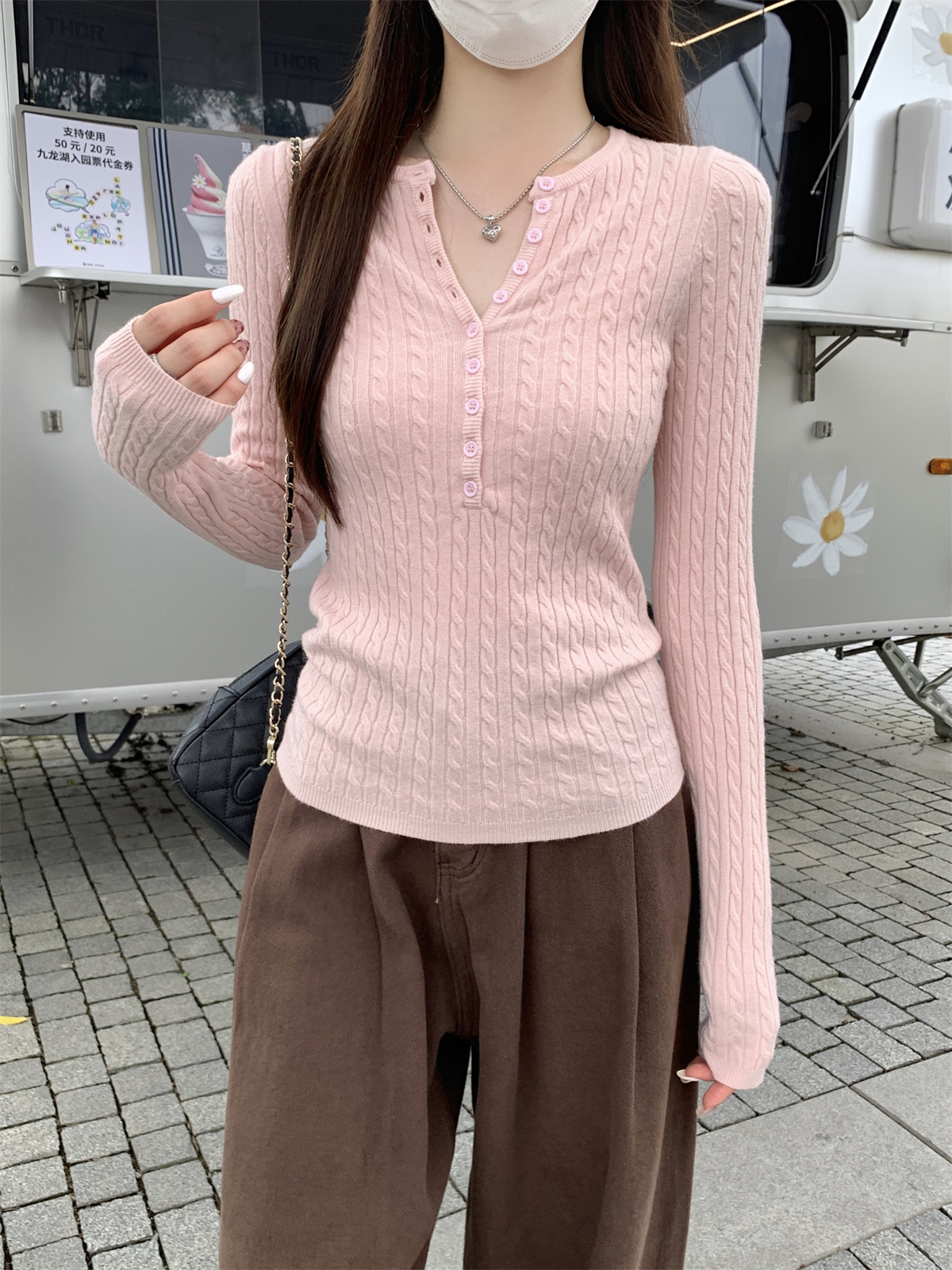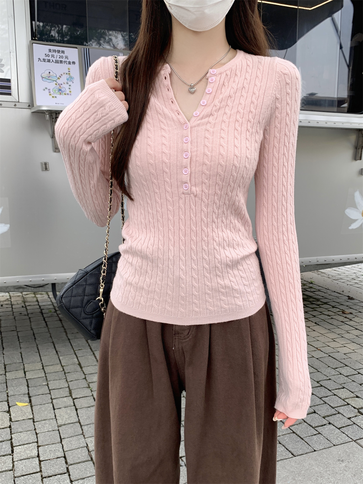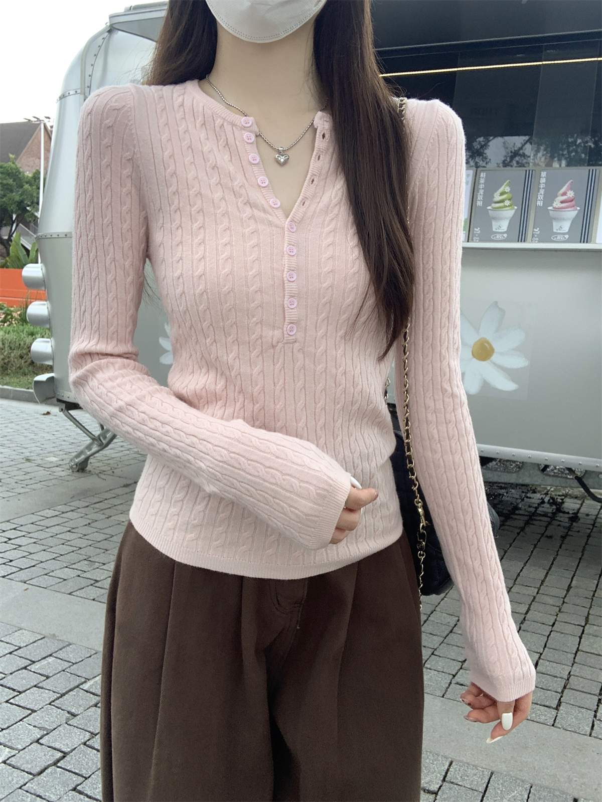 MY14084# 韩版麻花温柔百搭纽扣半开领安迪绒内搭针织衫毛衣女裝貨源服裝批發