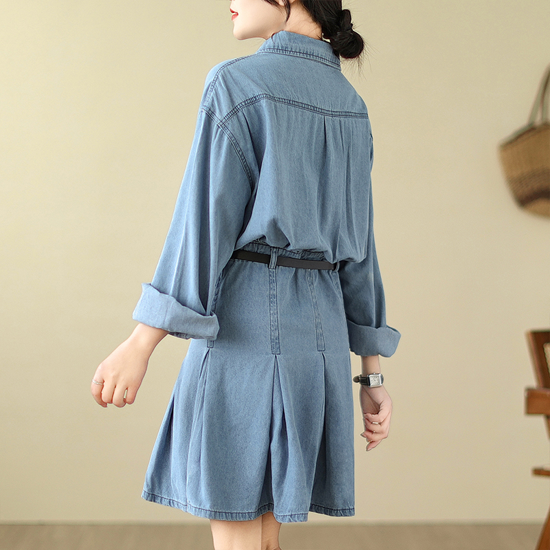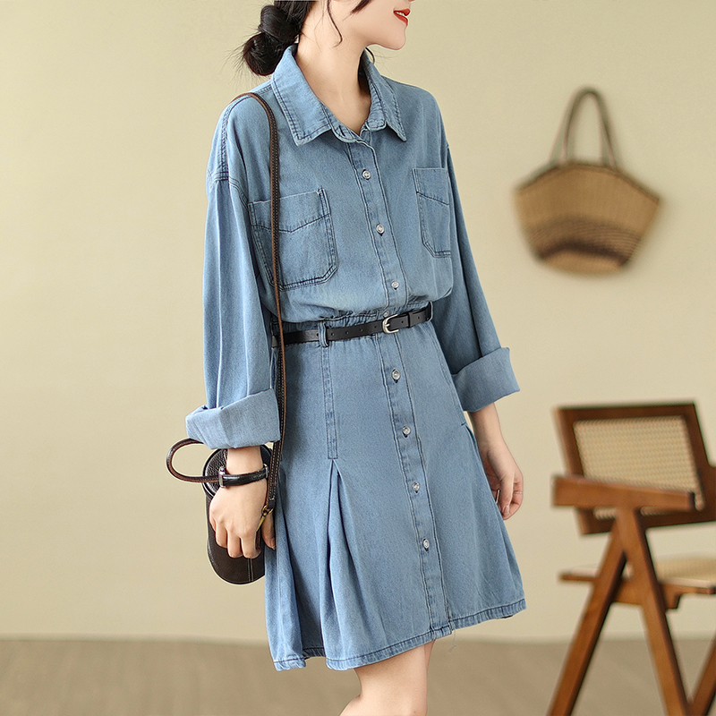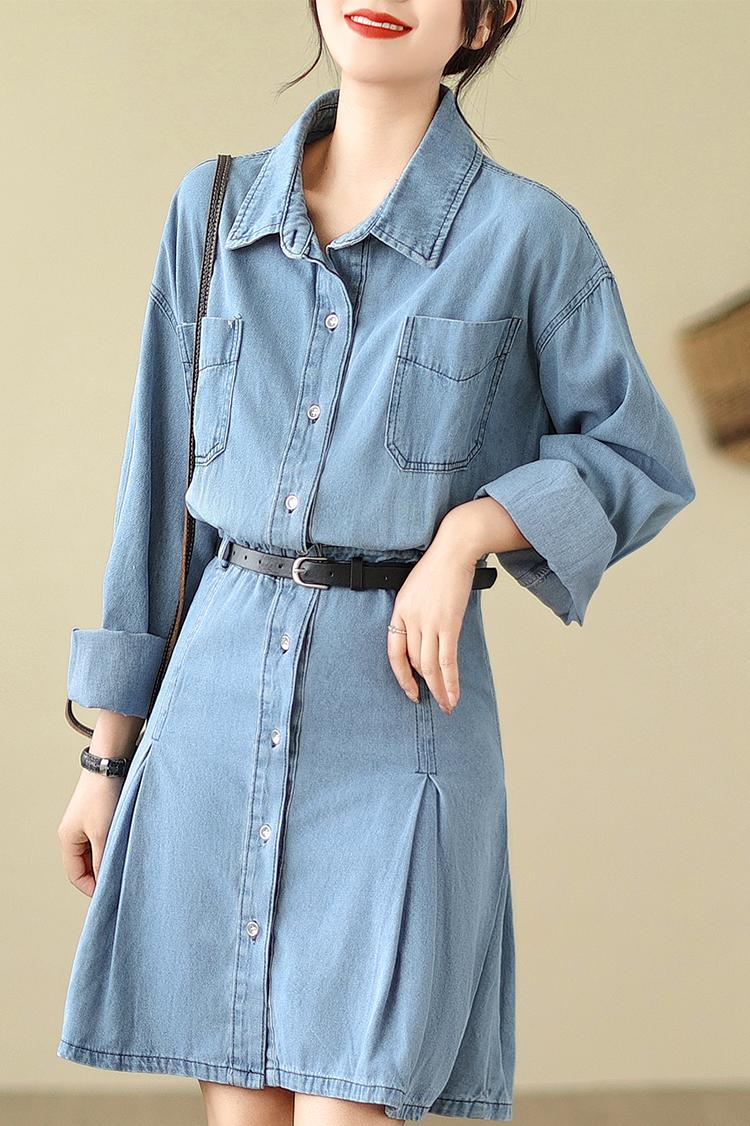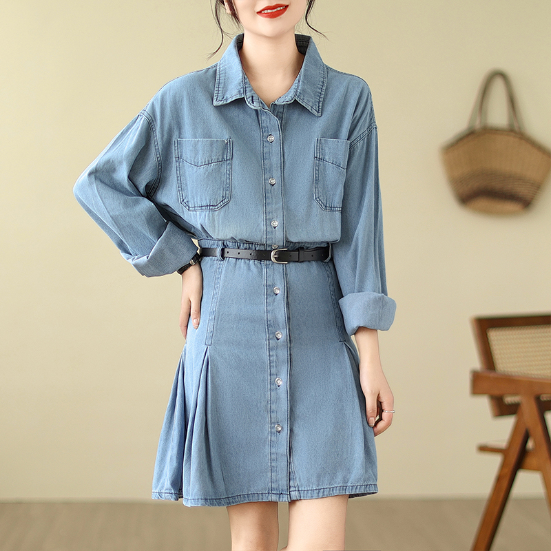 MY14095# 复古牛仔衬衫连衣裙收腰显瘦百褶裙短裙女裝貨源服裝批發