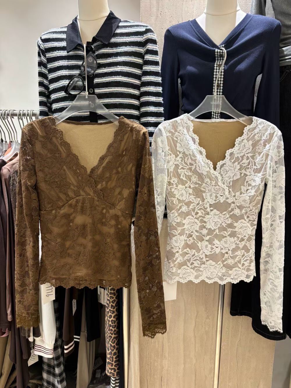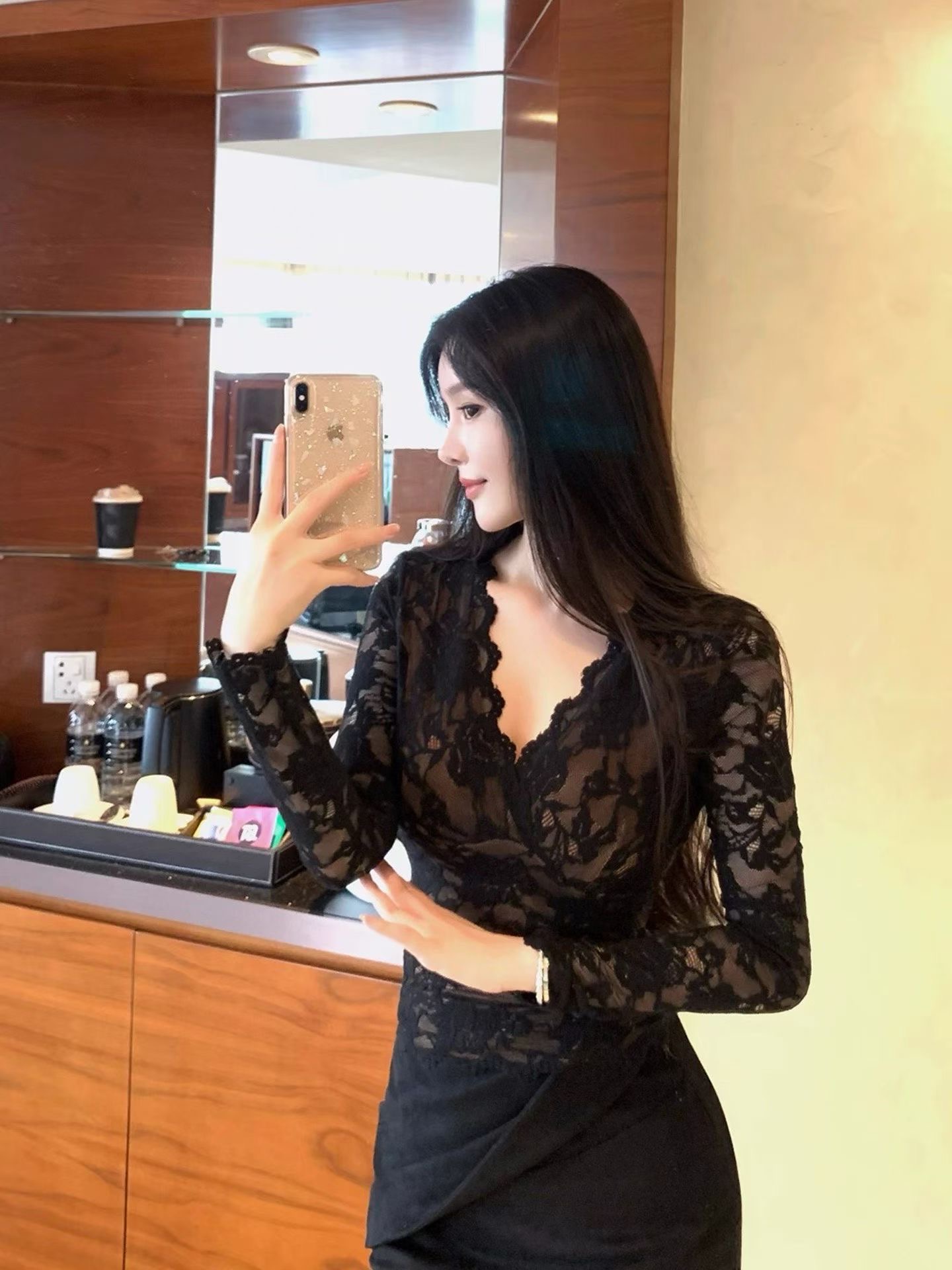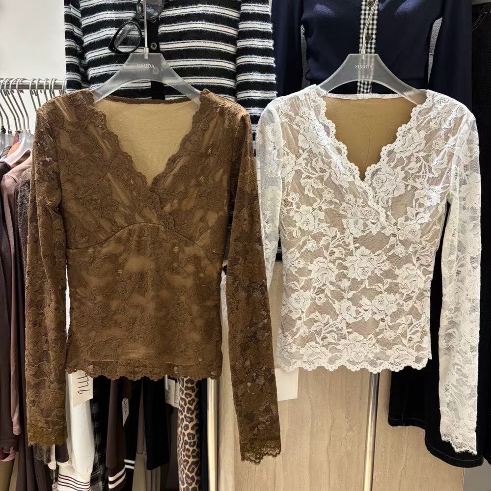 MY14098# 韩系纯欲风钩花镂空交叉V领磨毛内里蕾丝衫长袖修身打底上衣女裝貨源服裝批發