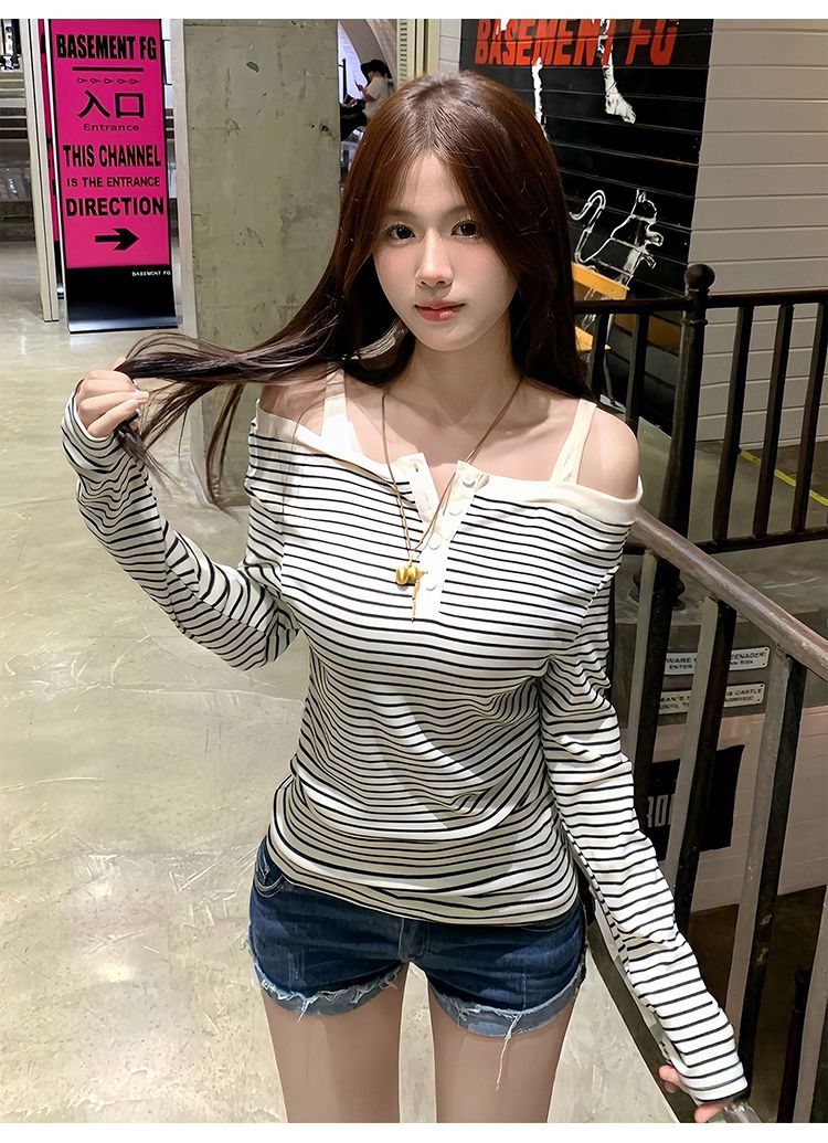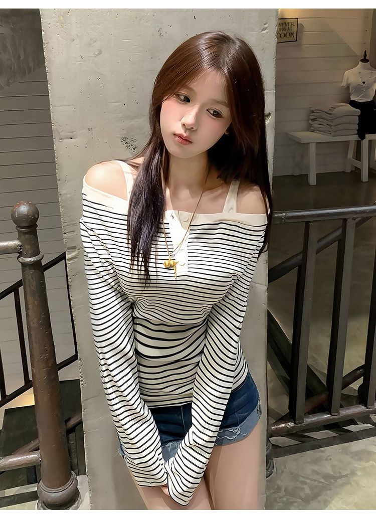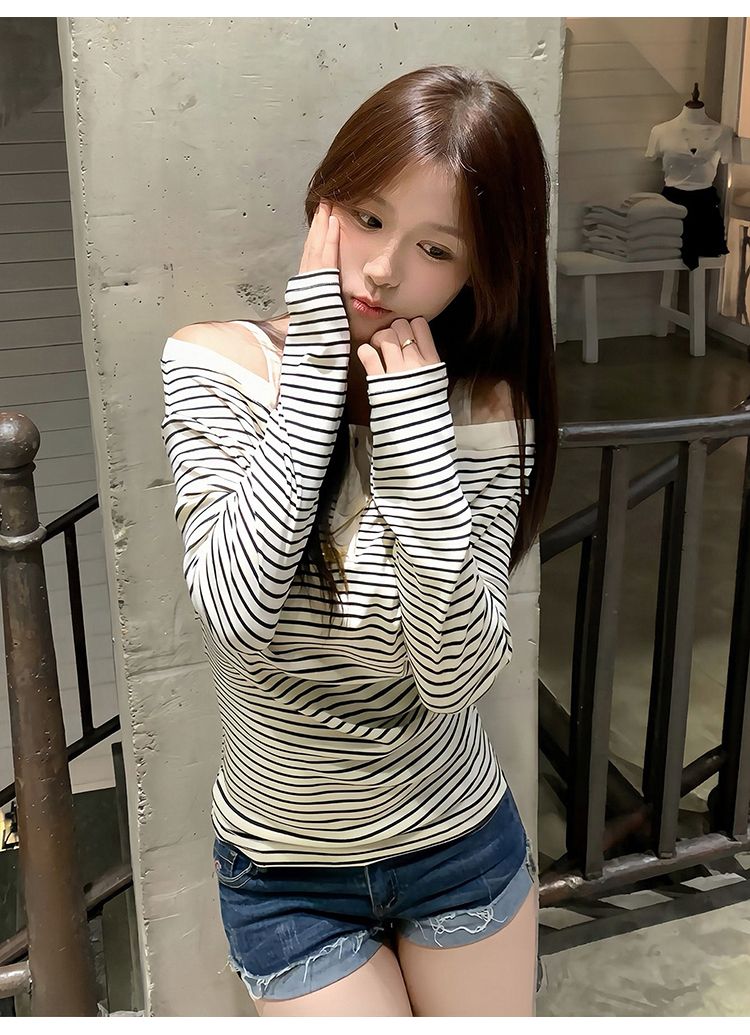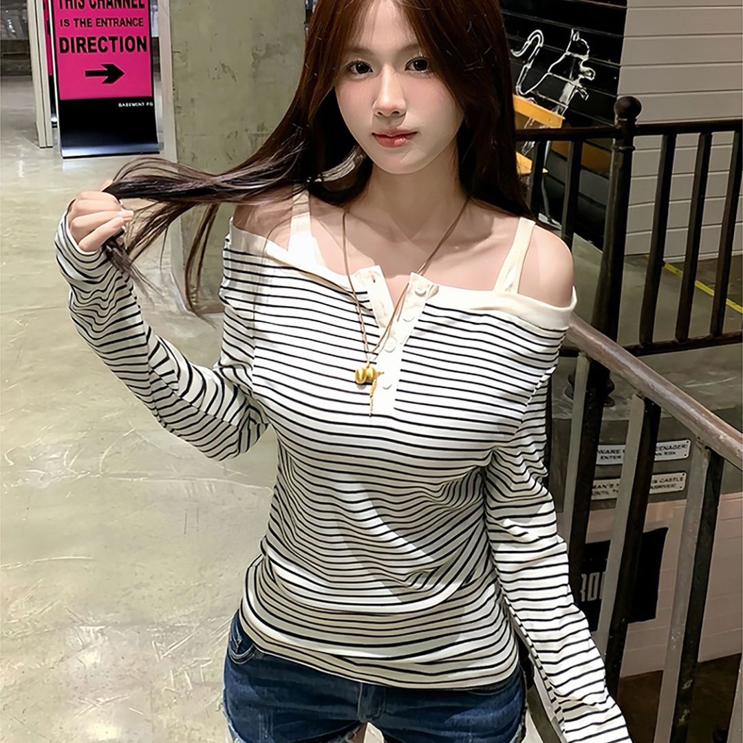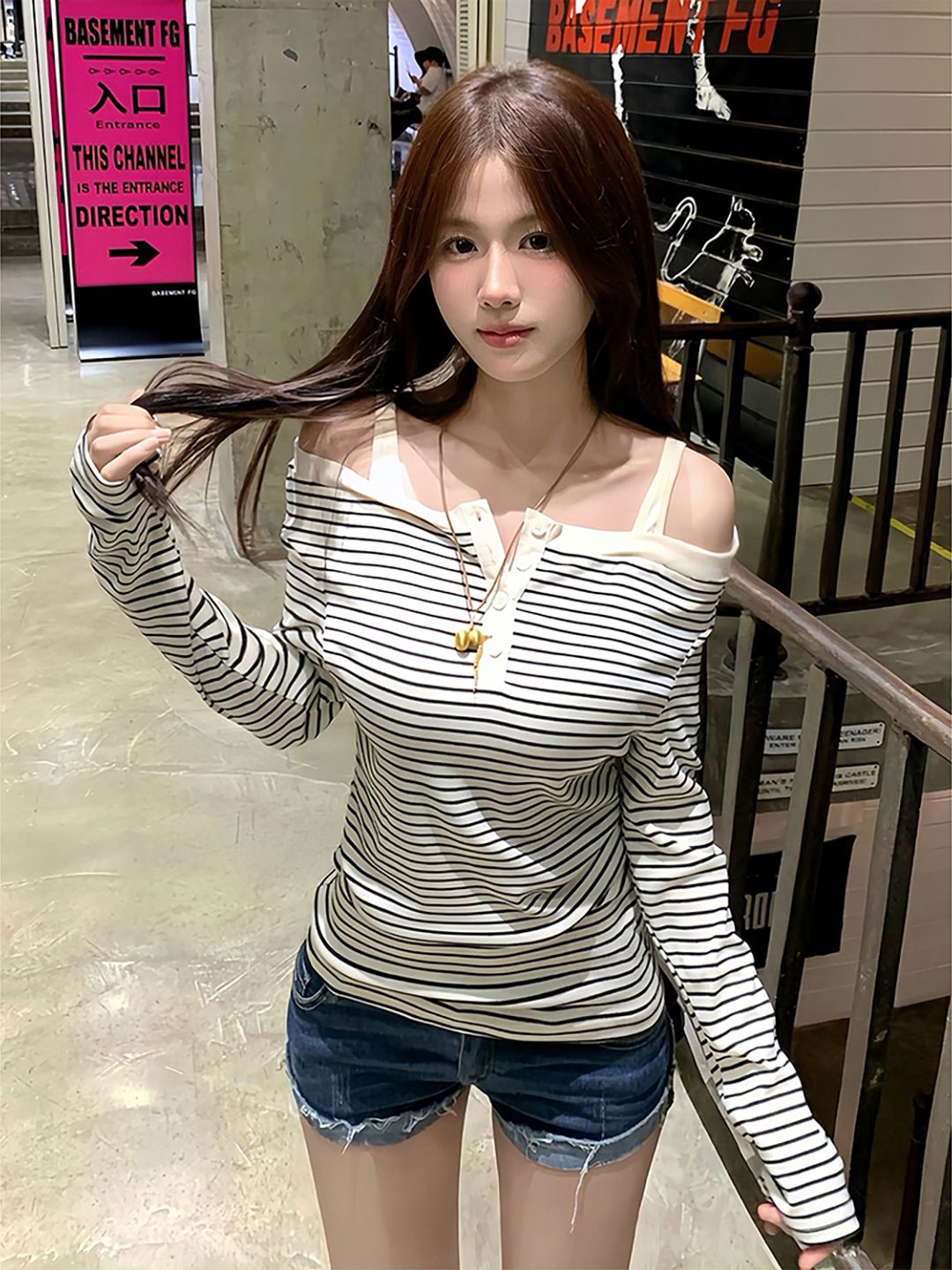 MY14099# 原版做法美式辣妹条纹一字肩长袖t恤女秋季修身显瘦露肩上衣女裝貨源服裝批發