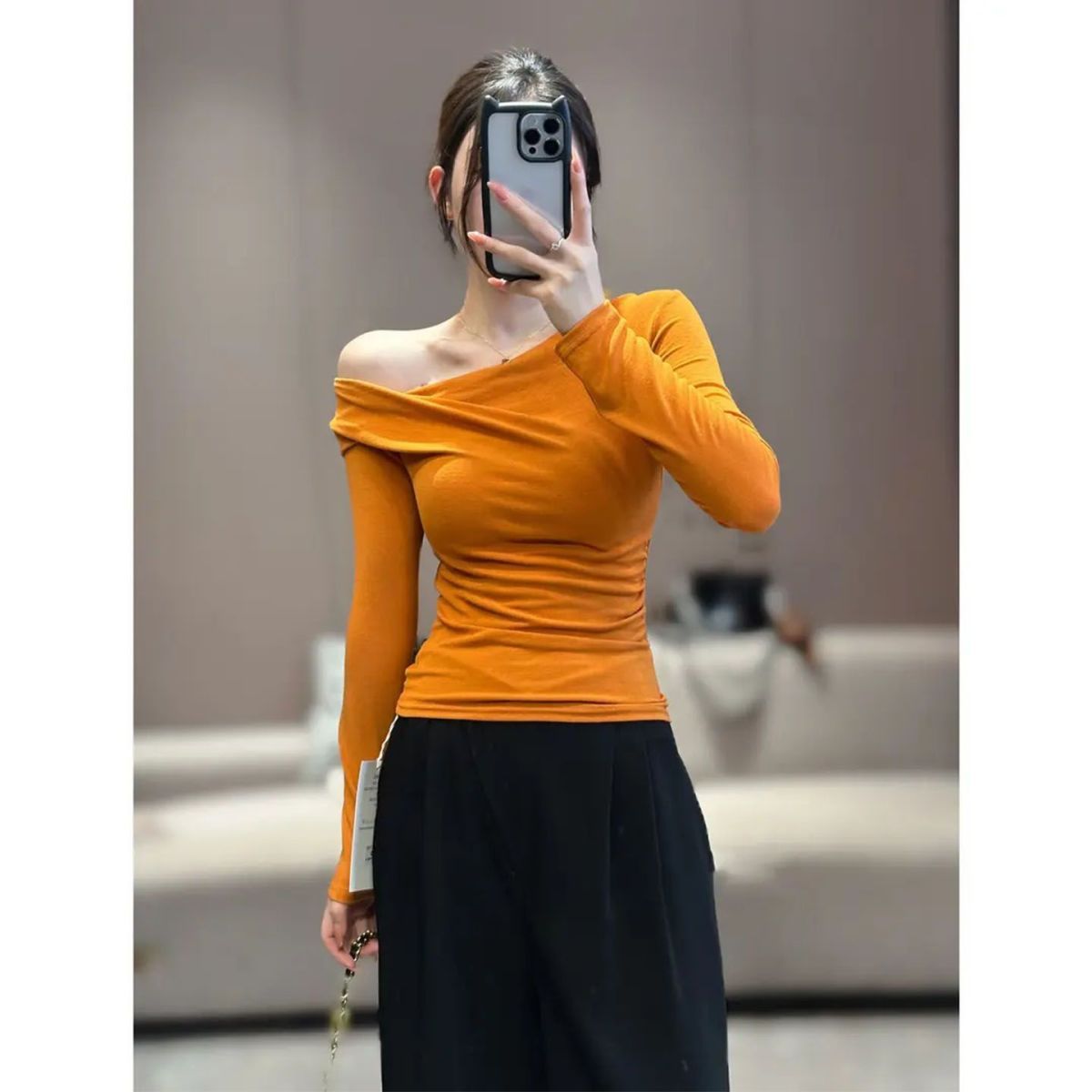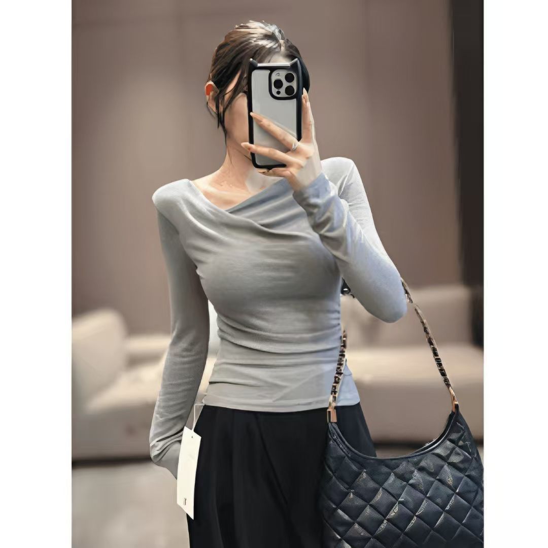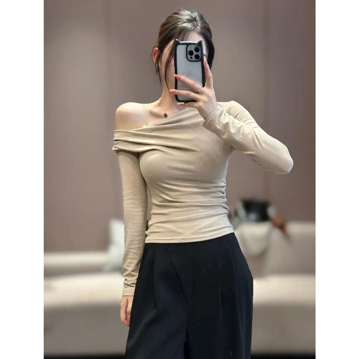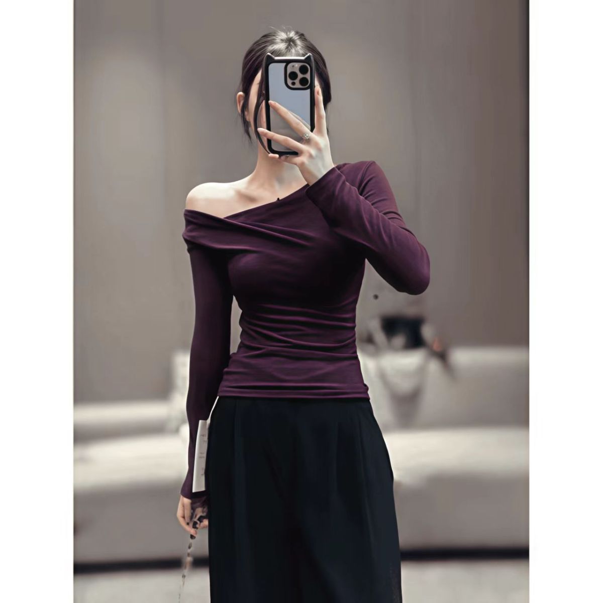 MY14102# 莫代尔人棉纯色长袖一字领秋季新款修身显瘦打底上衣女裝貨源服裝批發