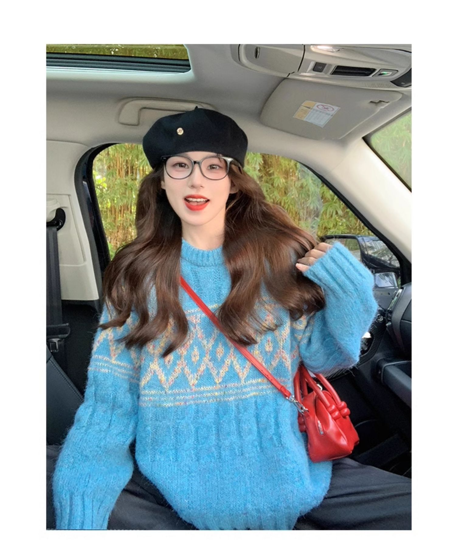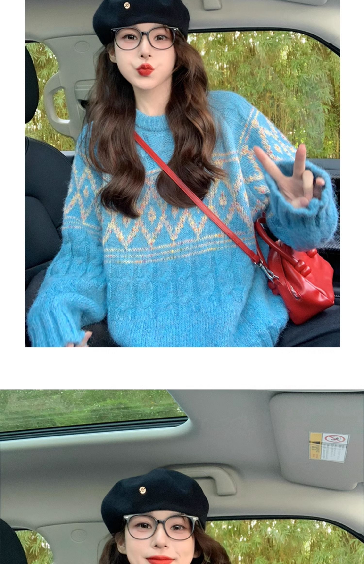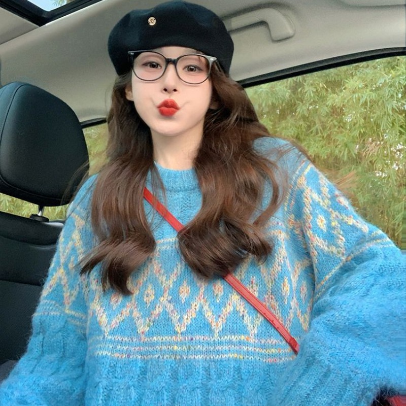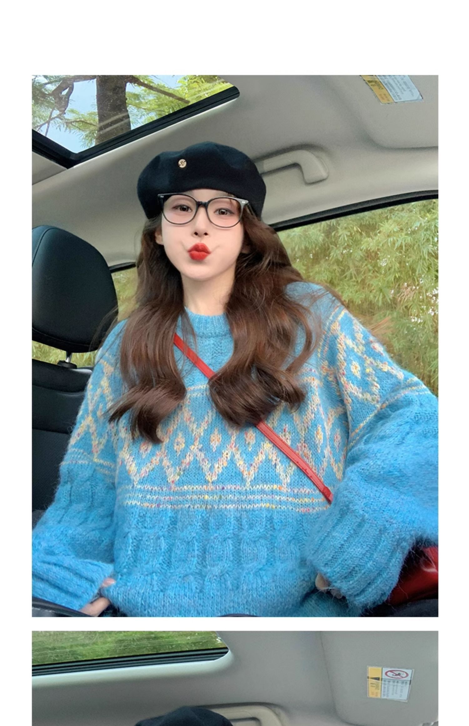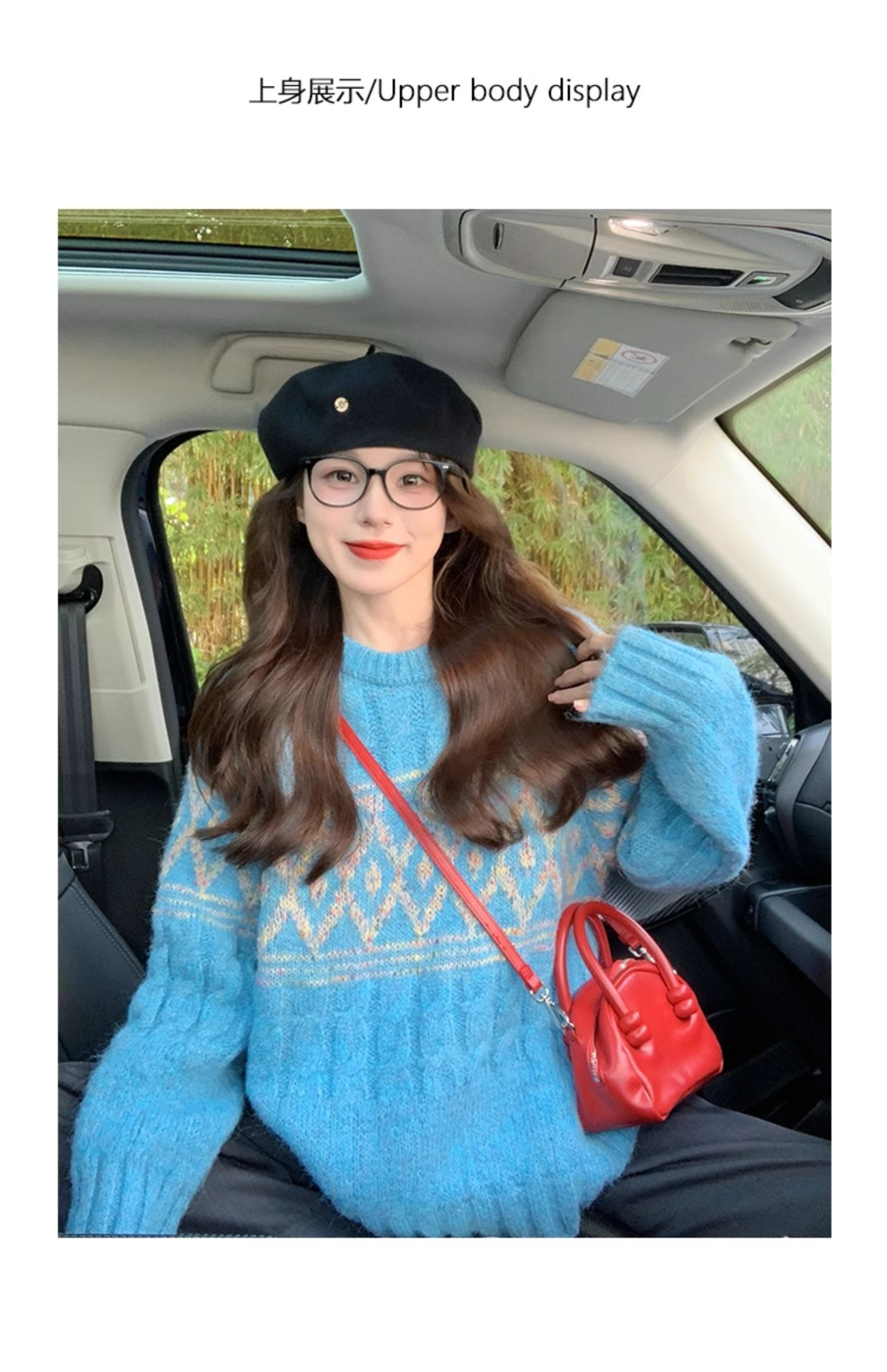MY14108# 羊驼绒蓝色麻花毛衣新款加厚内搭菱格撞色复古针织衫女裝貨源服裝批發