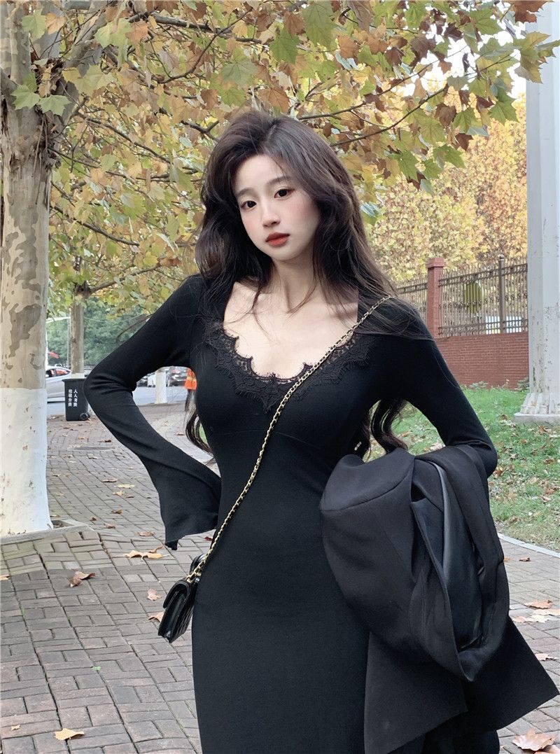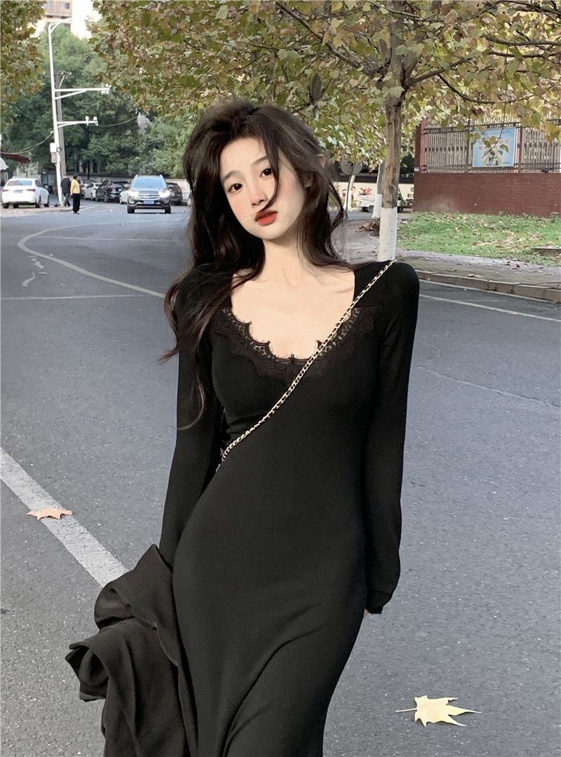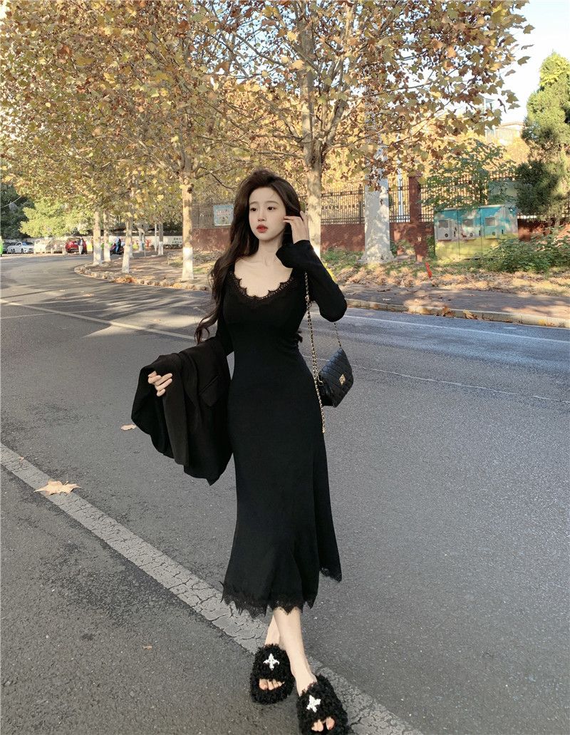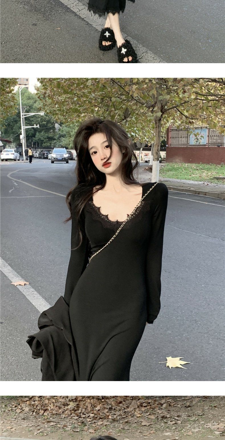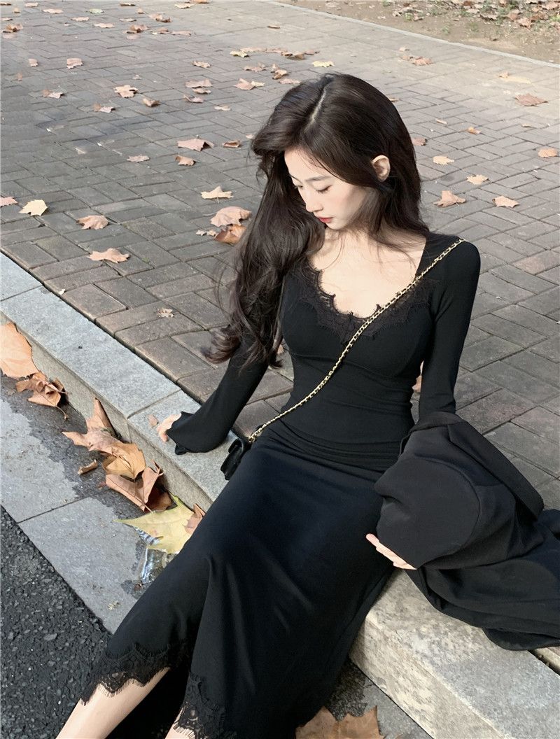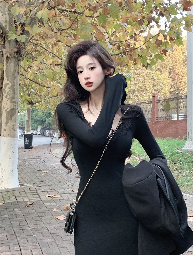 MY14112# 淑女性感蕾丝拼接长袖连衣裙女内搭配大衣小个子修身包臀长裙女裝貨源服裝批發