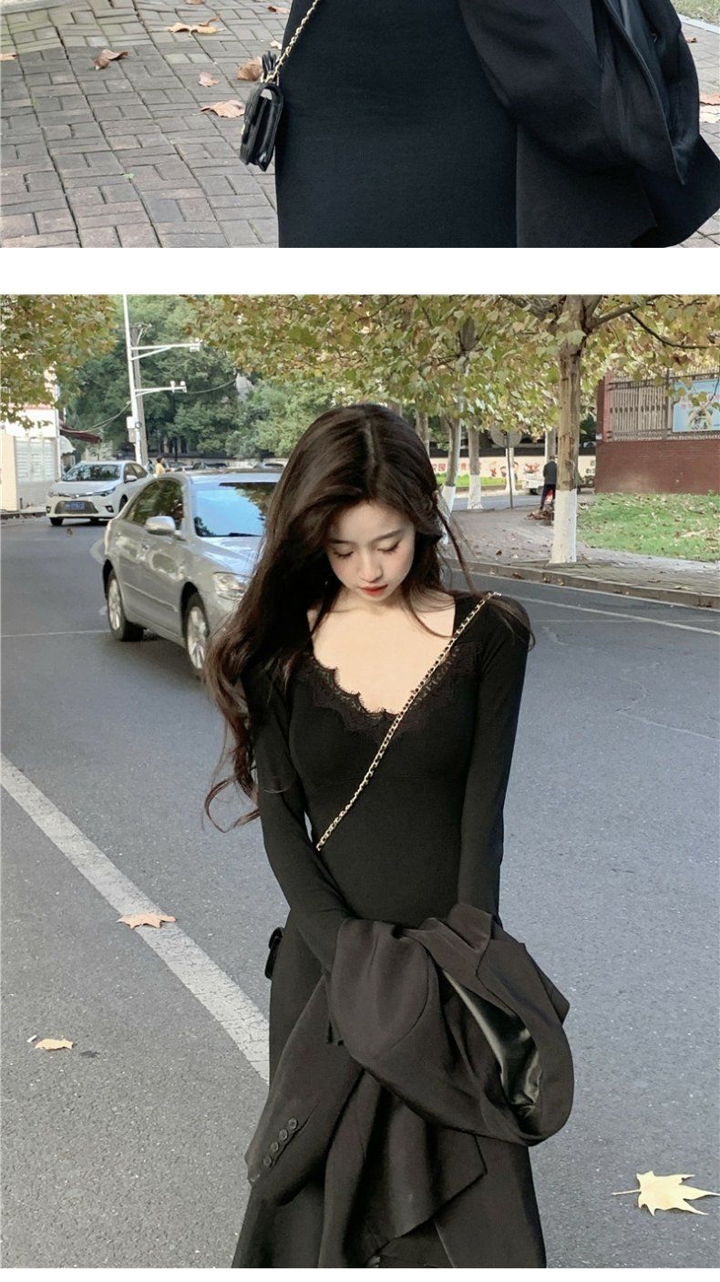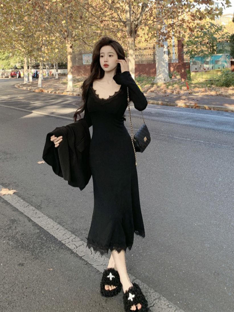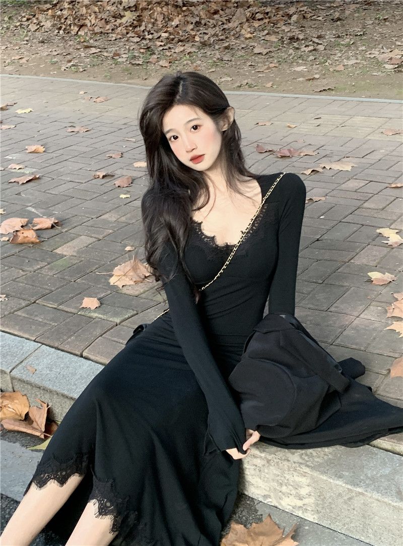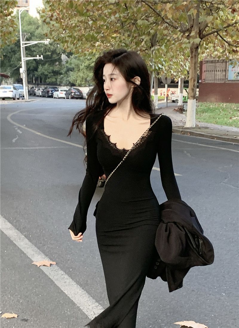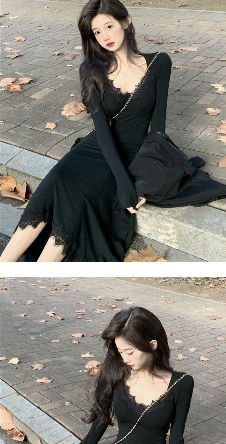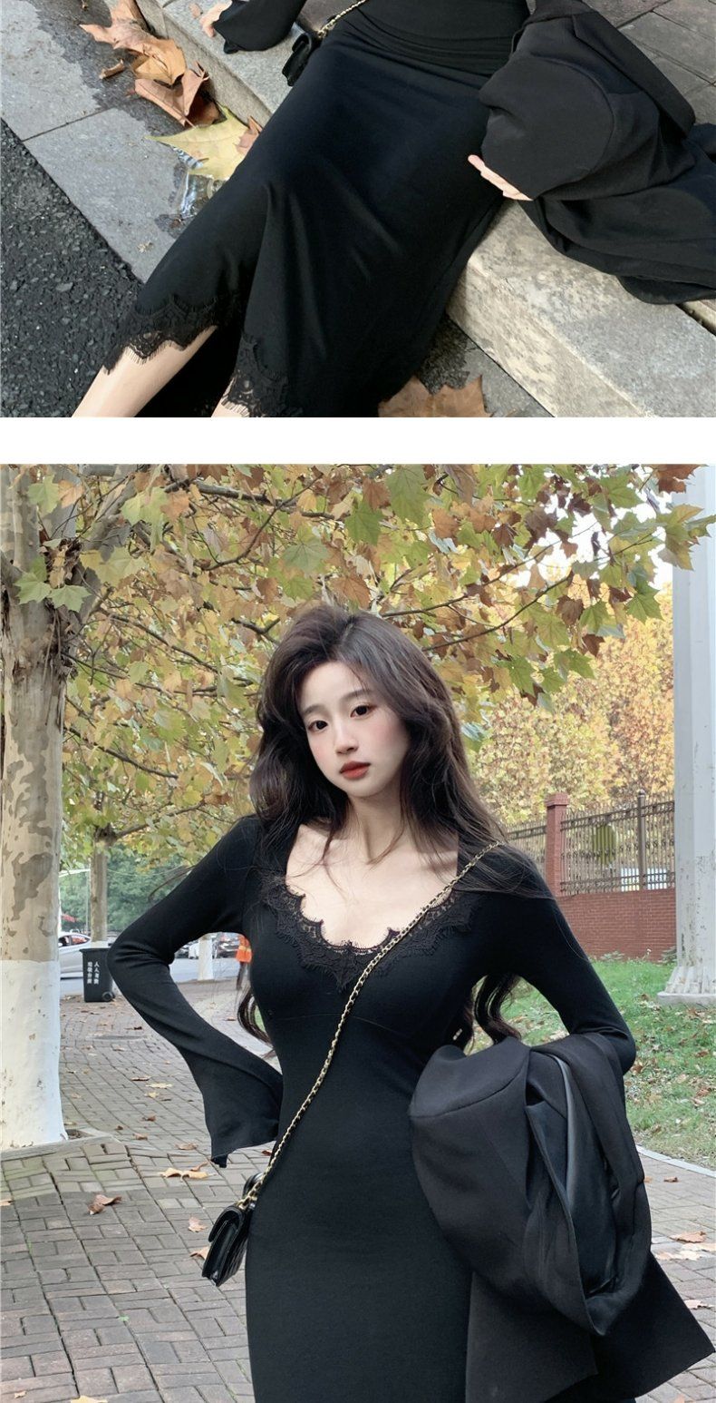 MY14112# 淑女性感蕾丝拼接长袖连衣裙女内搭配大衣小个子修身包臀长裙女裝貨源服裝批發
