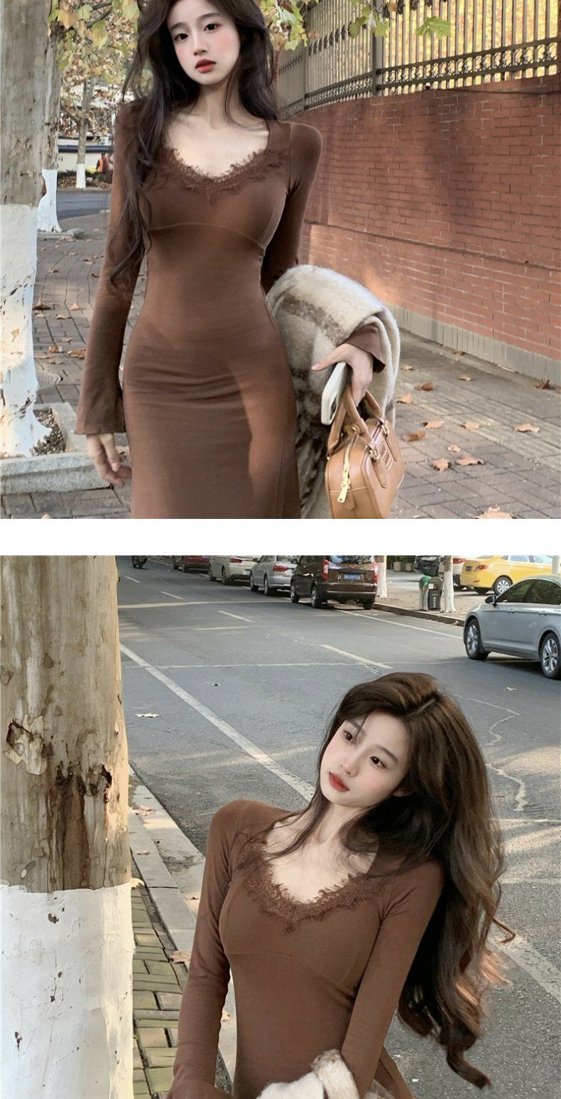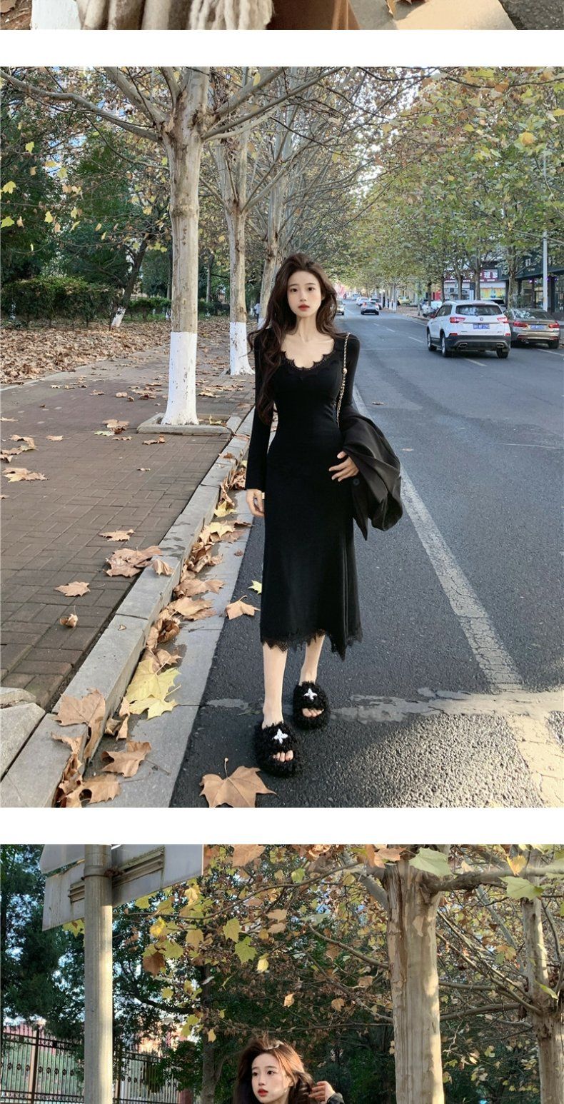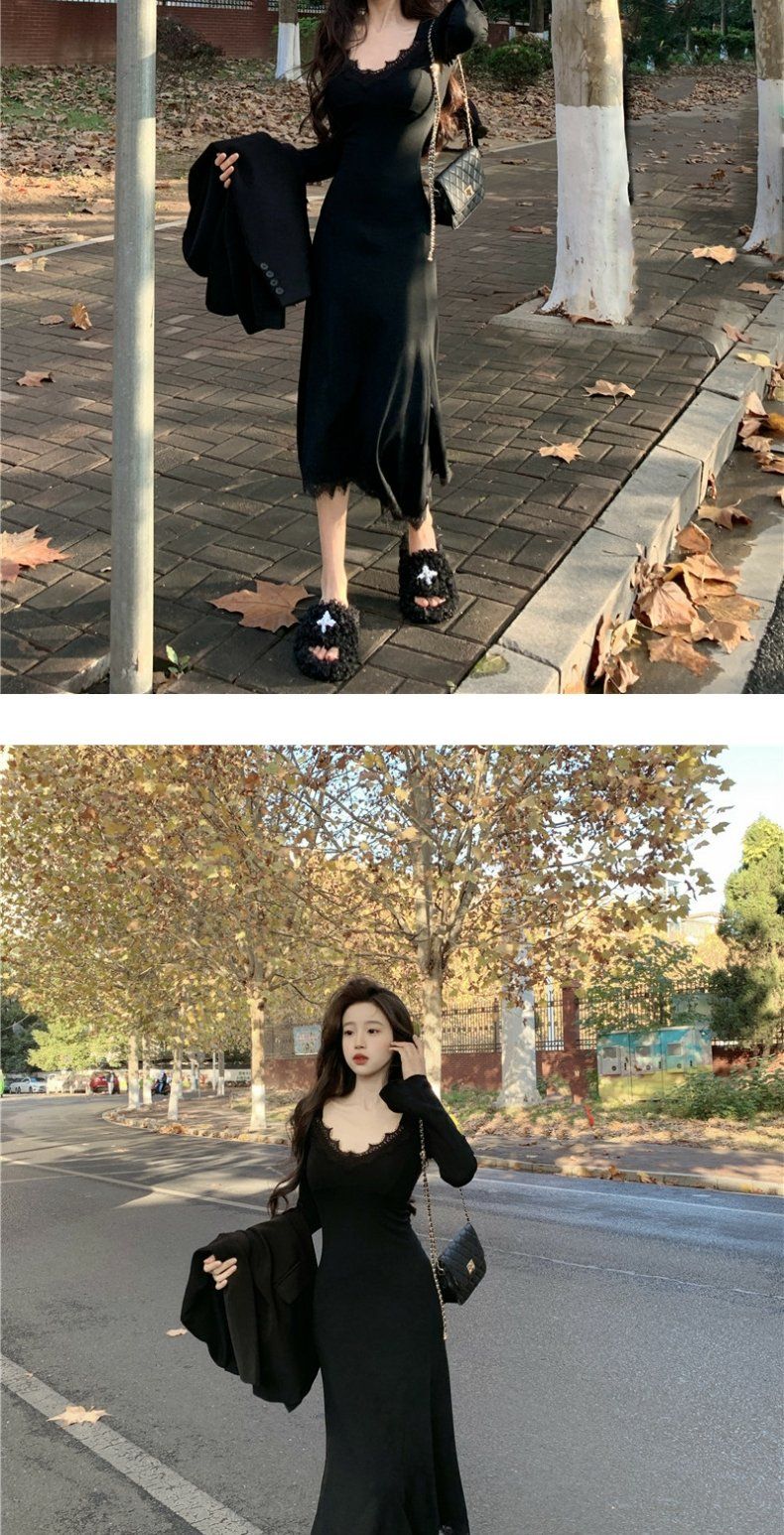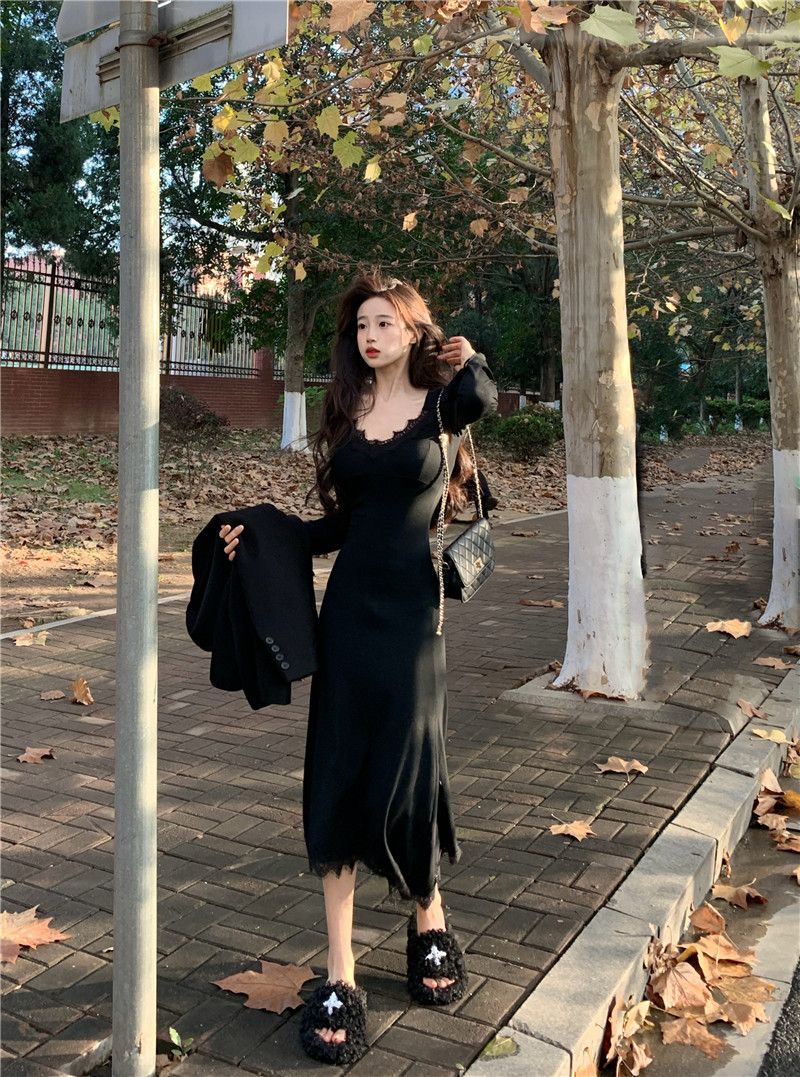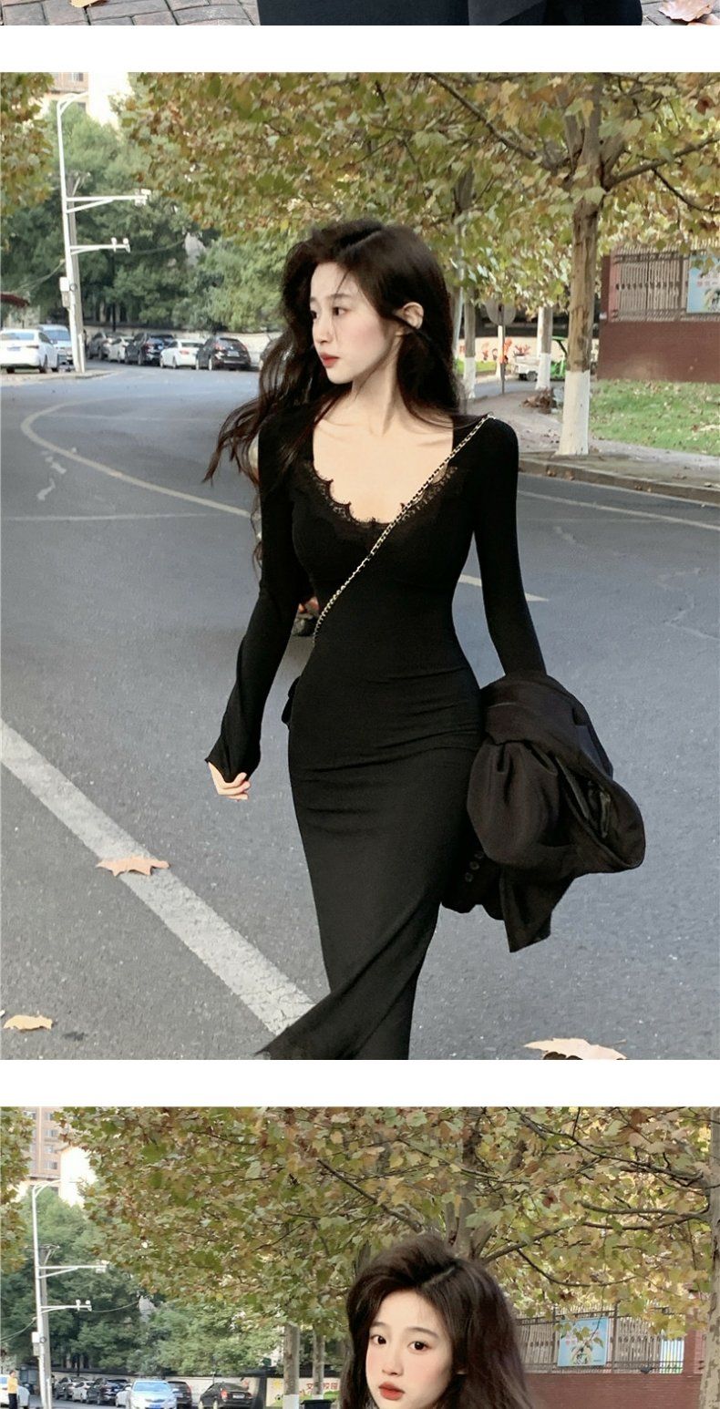 MY14112# 淑女性感蕾丝拼接长袖连衣裙女内搭配大衣小个子修身包臀长裙女裝貨源服裝批發