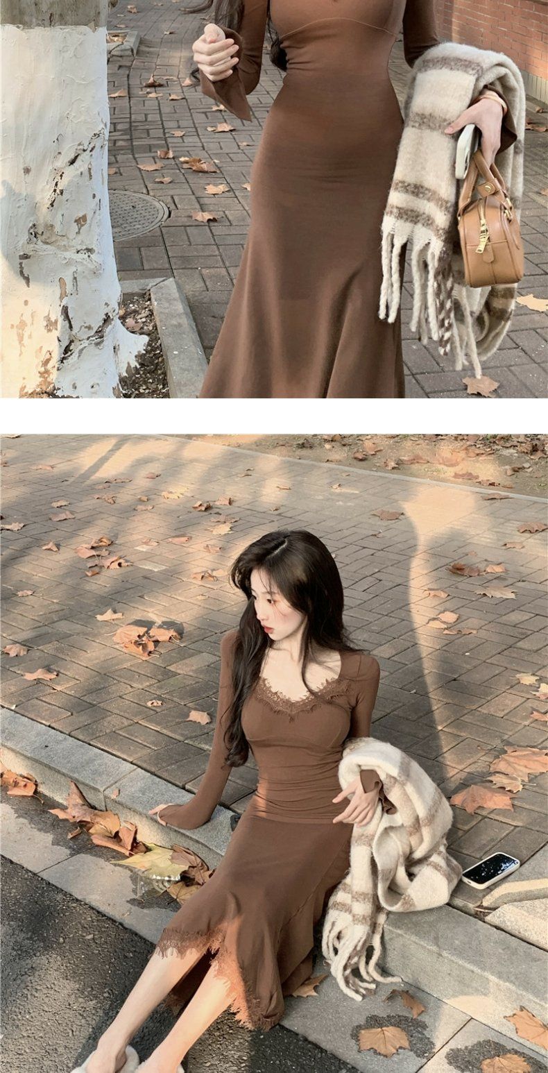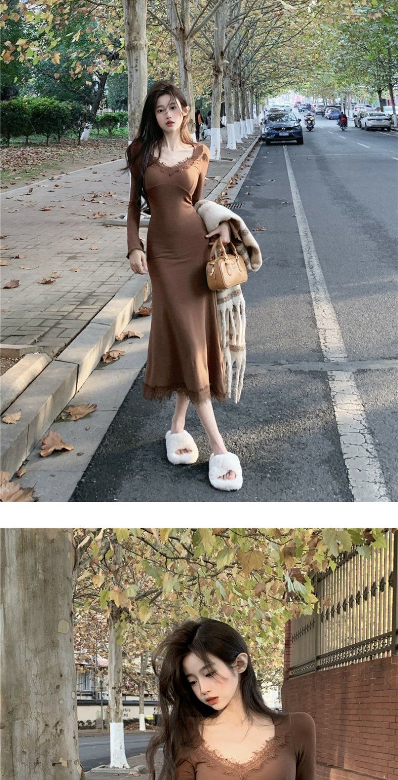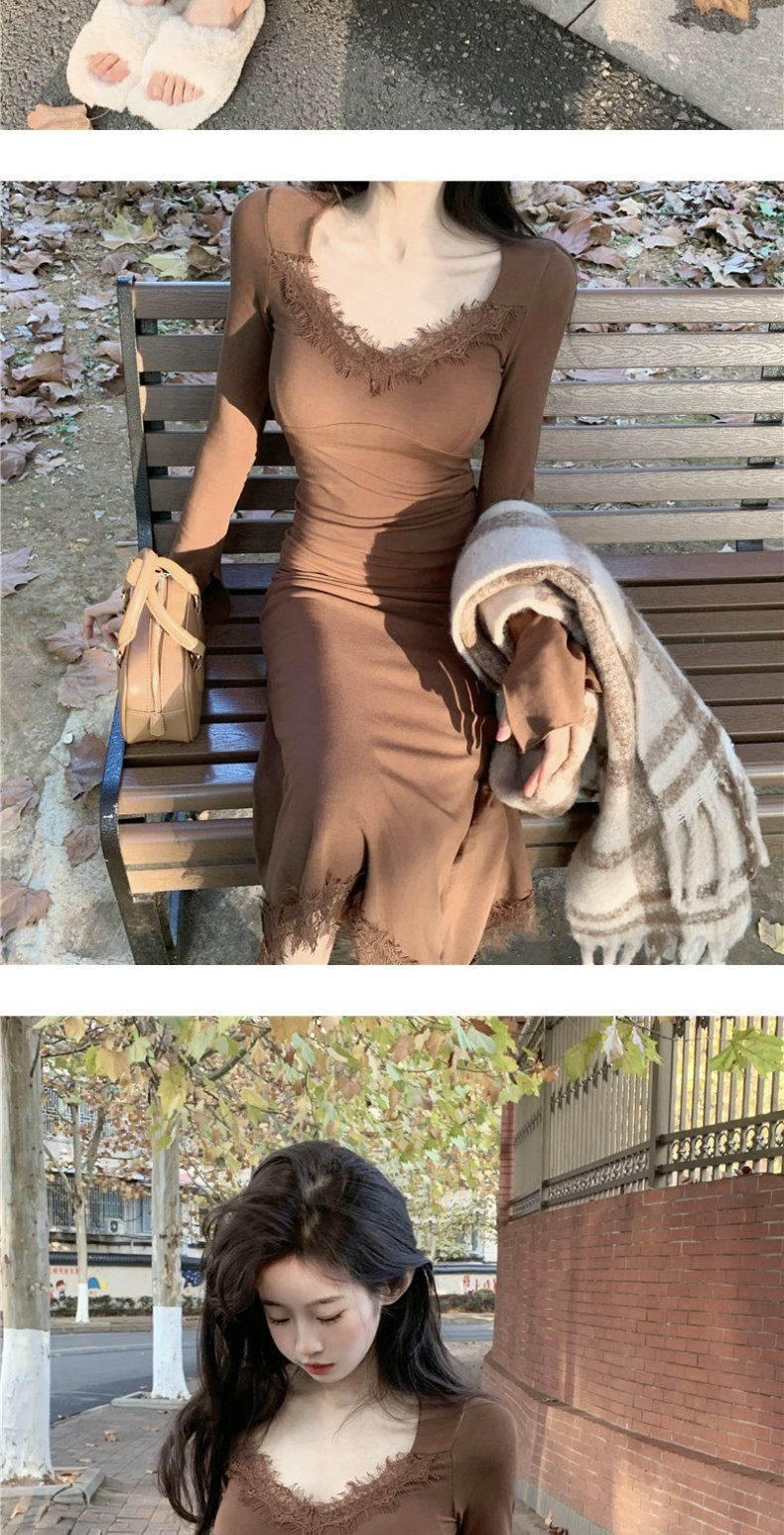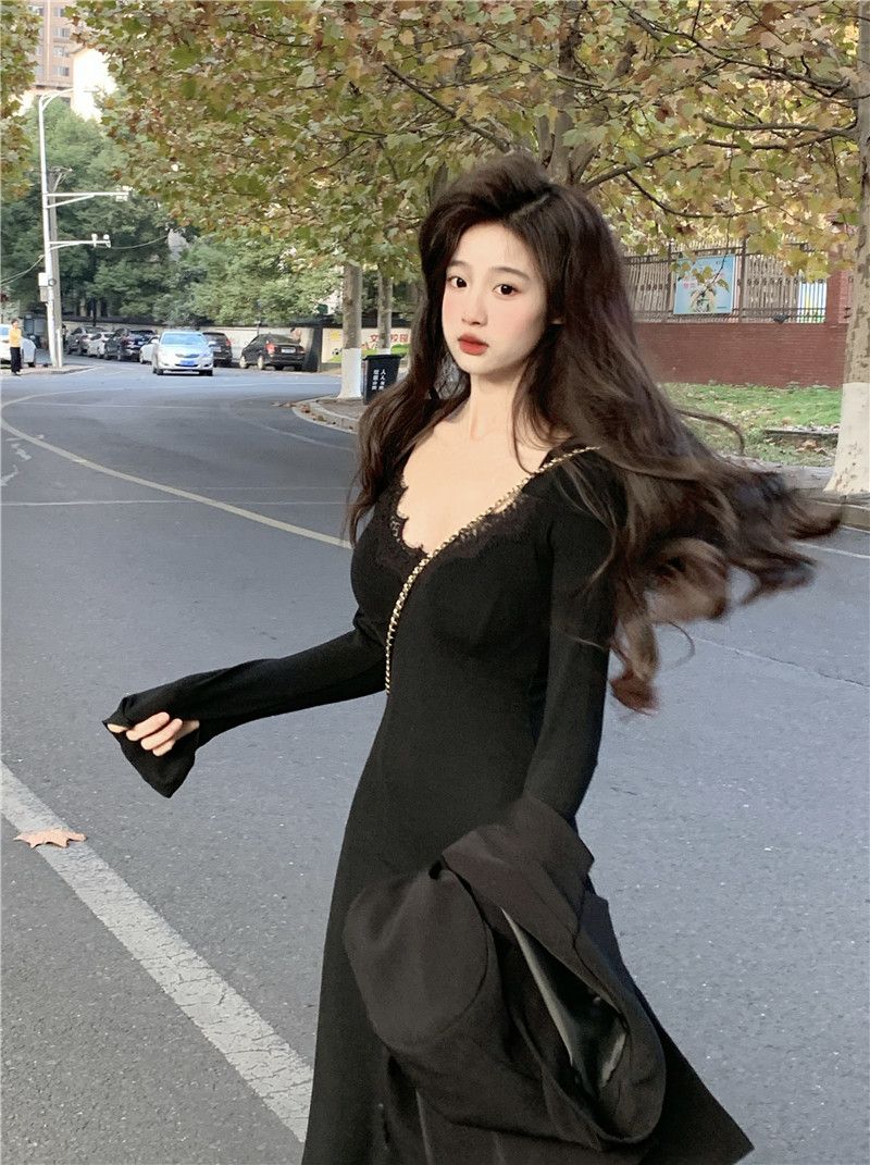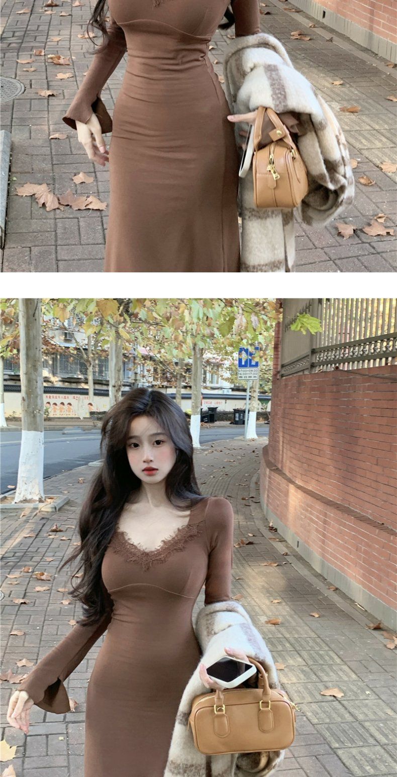 MY14112# 淑女性感蕾丝拼接长袖连衣裙女内搭配大衣小个子修身包臀长裙女裝貨源服裝批發
