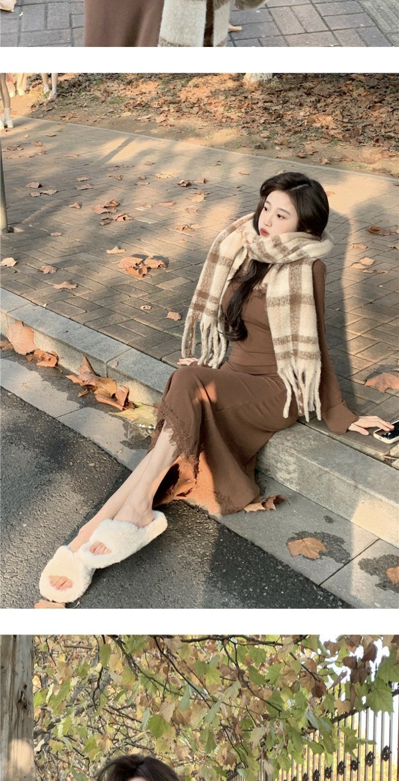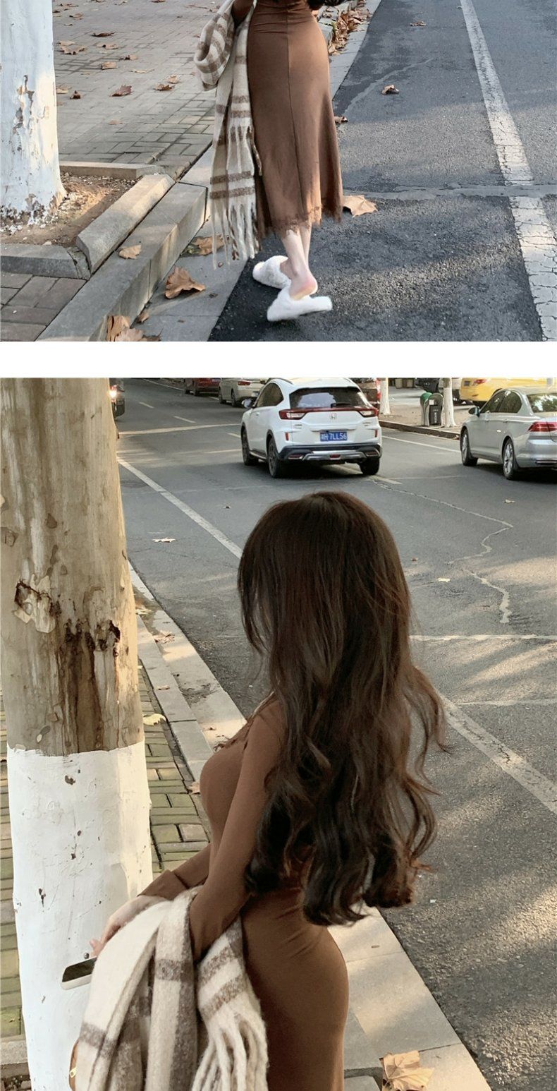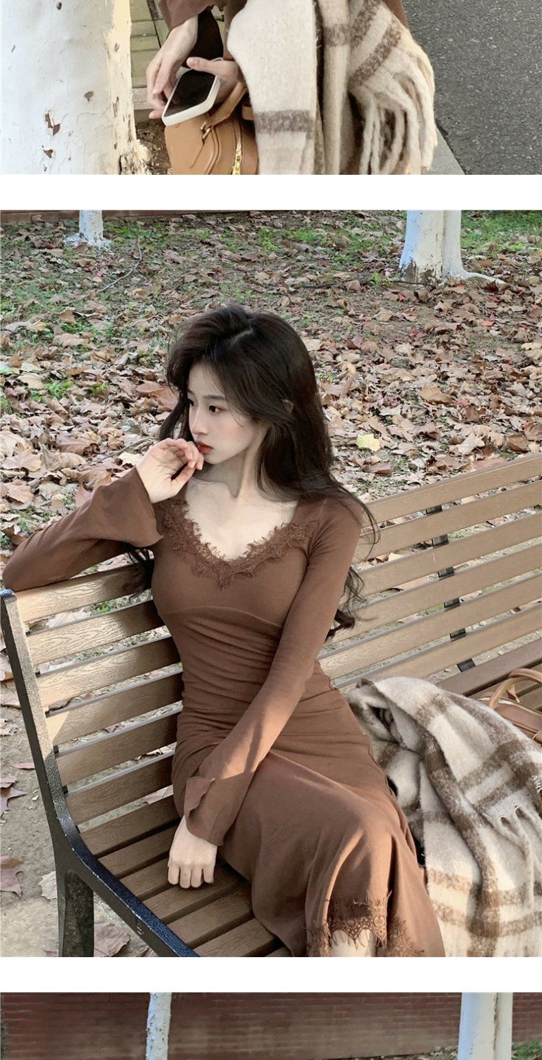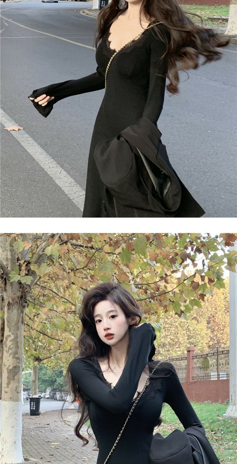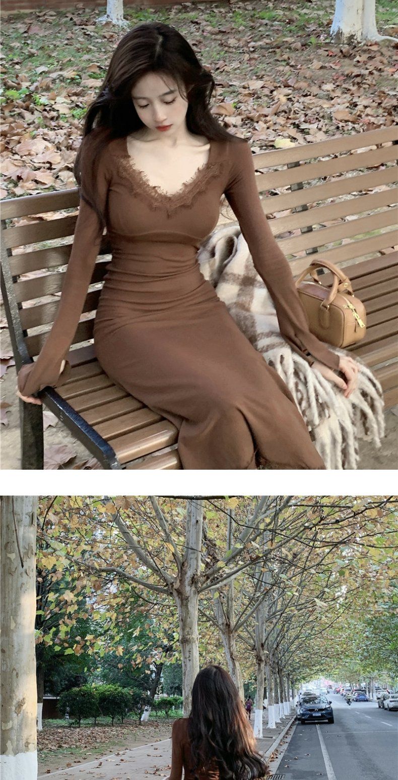 MY14112# 淑女性感蕾丝拼接长袖连衣裙女内搭配大衣小个子修身包臀长裙女裝貨源服裝批發