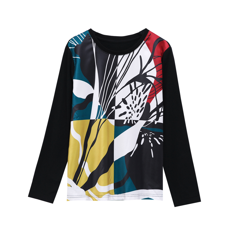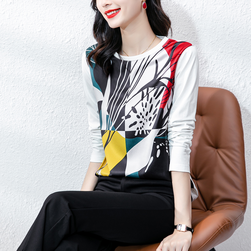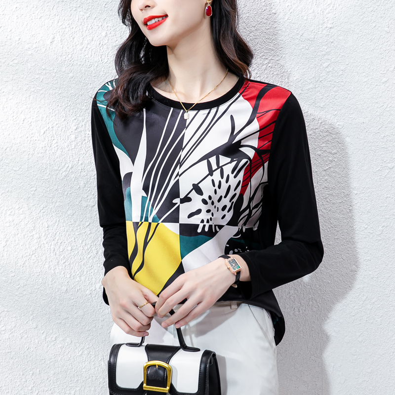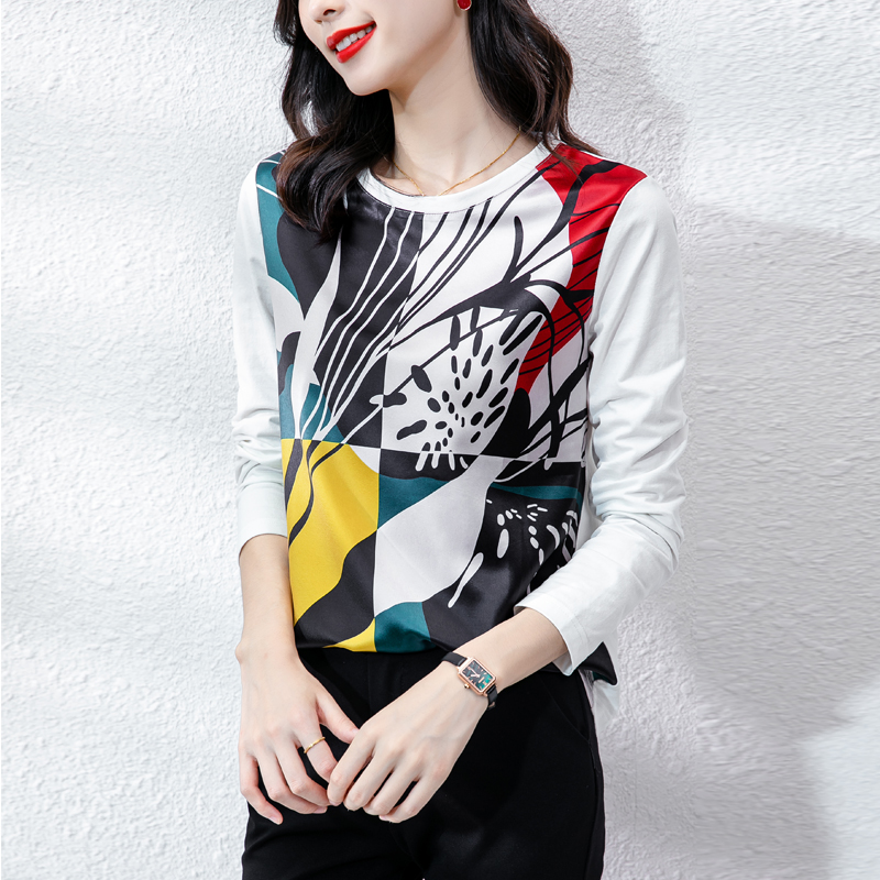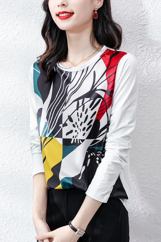 MY14117#重磅仿真丝T恤宽松内搭长袖印花圆领打底上衣