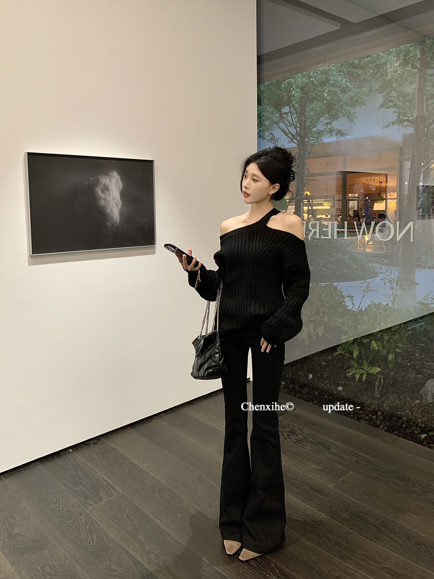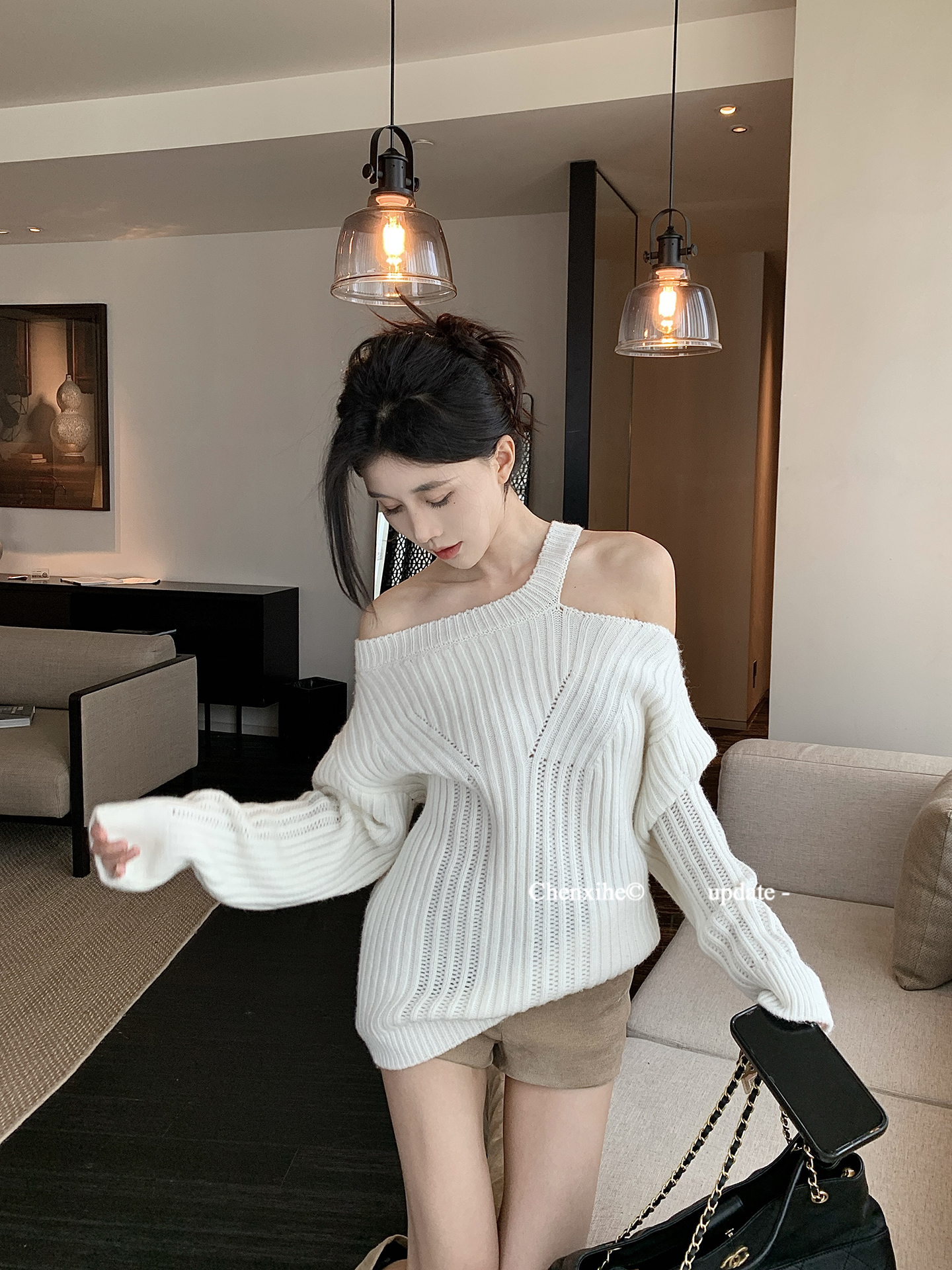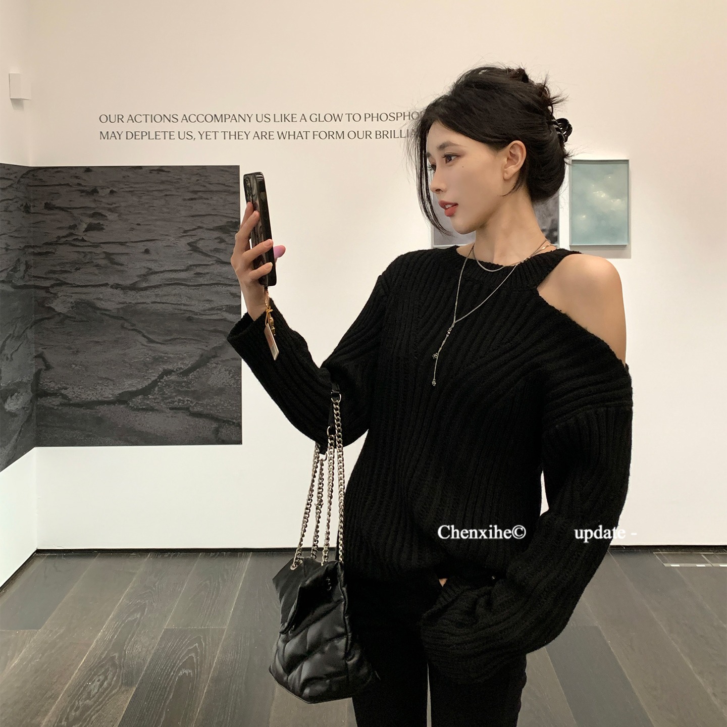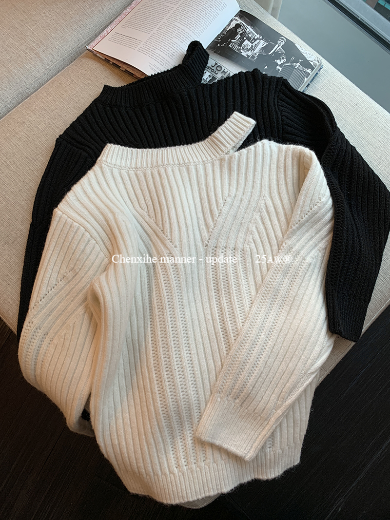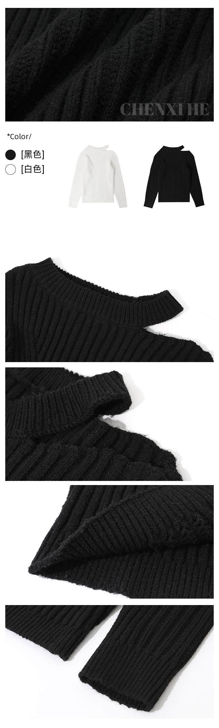 通过非常规的斜肩与肩破缝设计打破传统毛衣的沉闷感