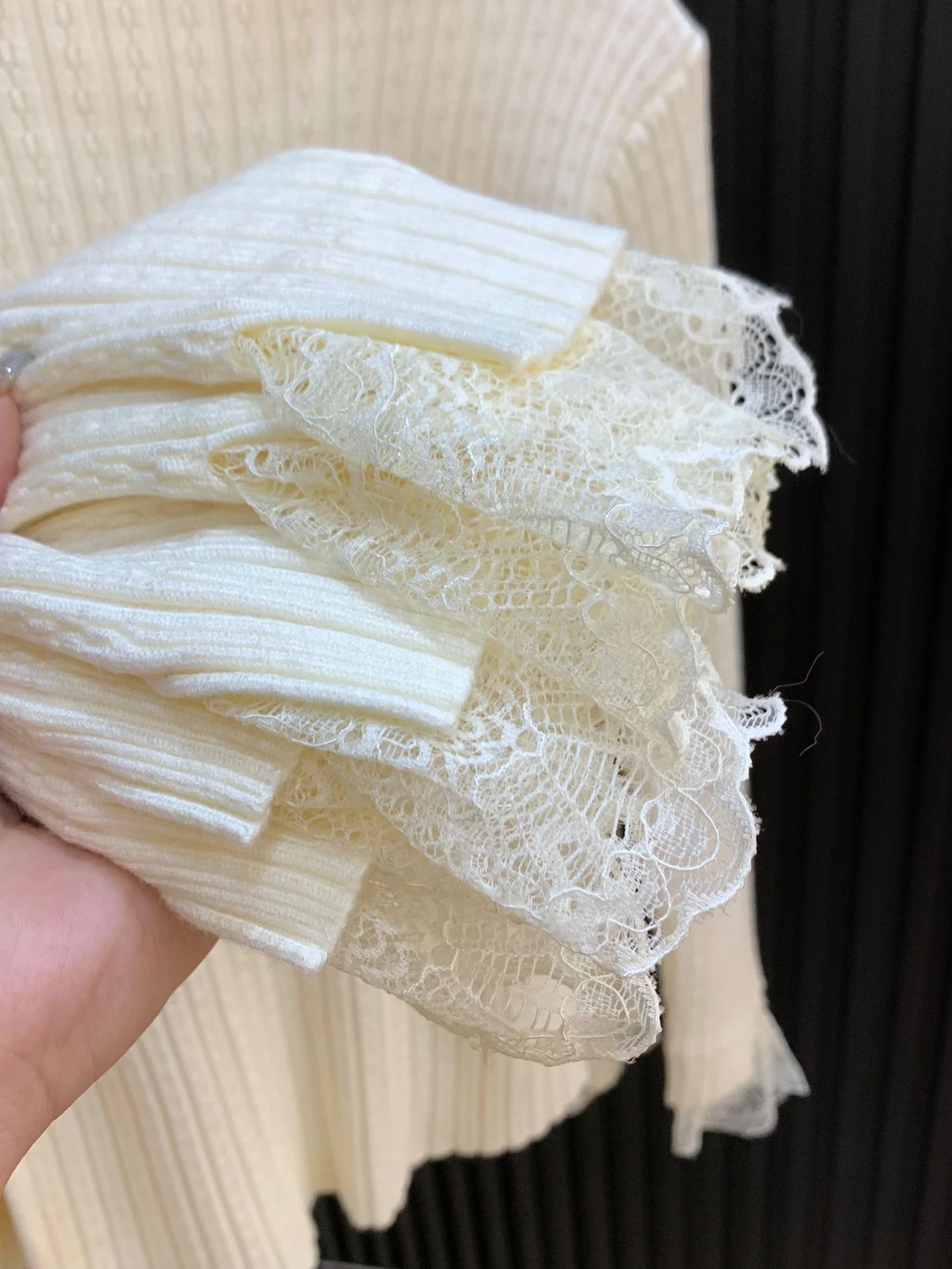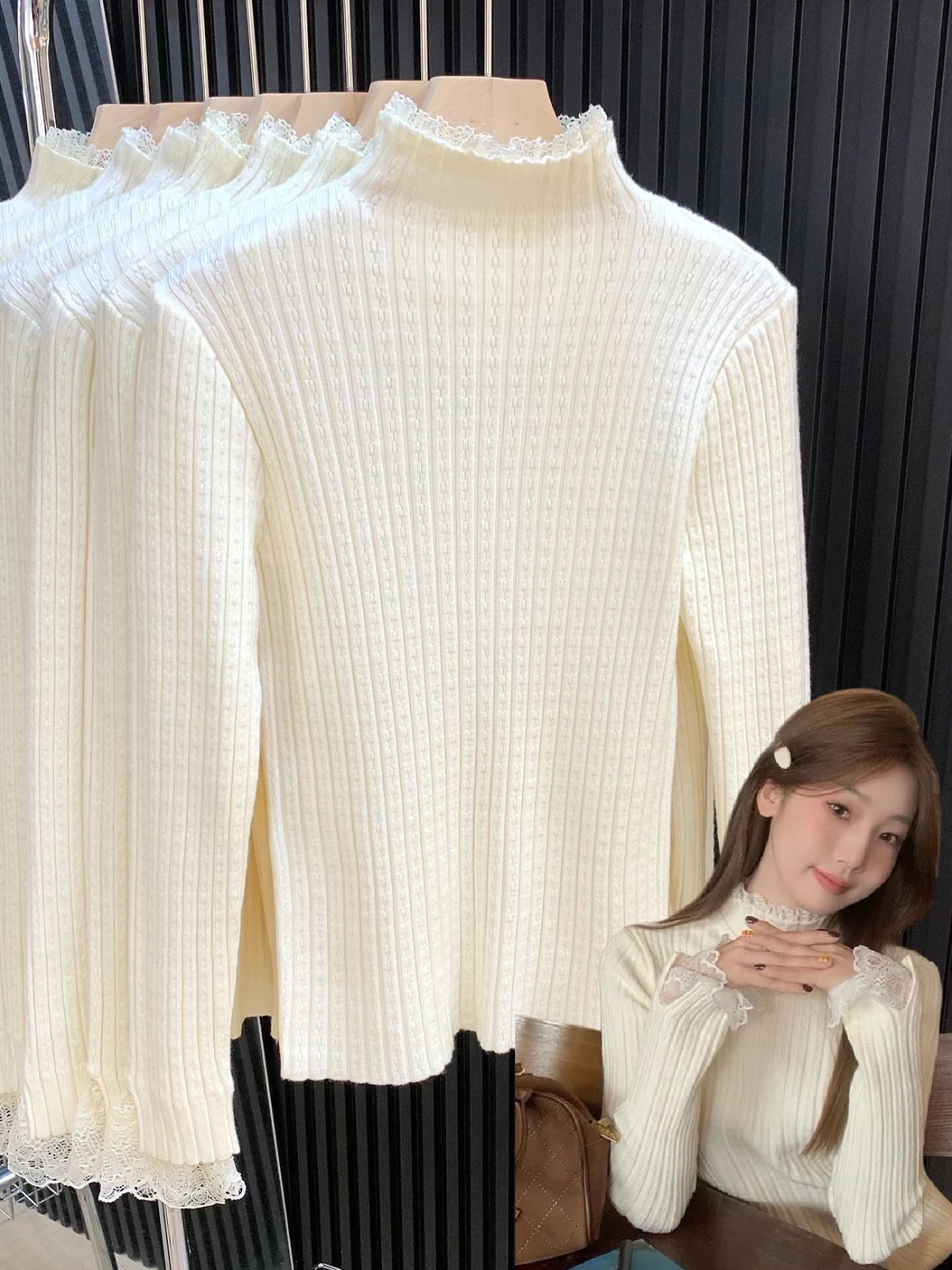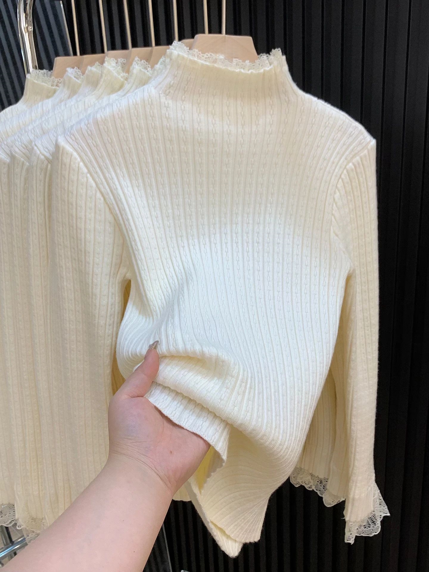 MY14253# 温柔风蕾丝拼接半高领内搭针织毛衣女chic肌理感绝美打底上衣女裝貨源服裝批發