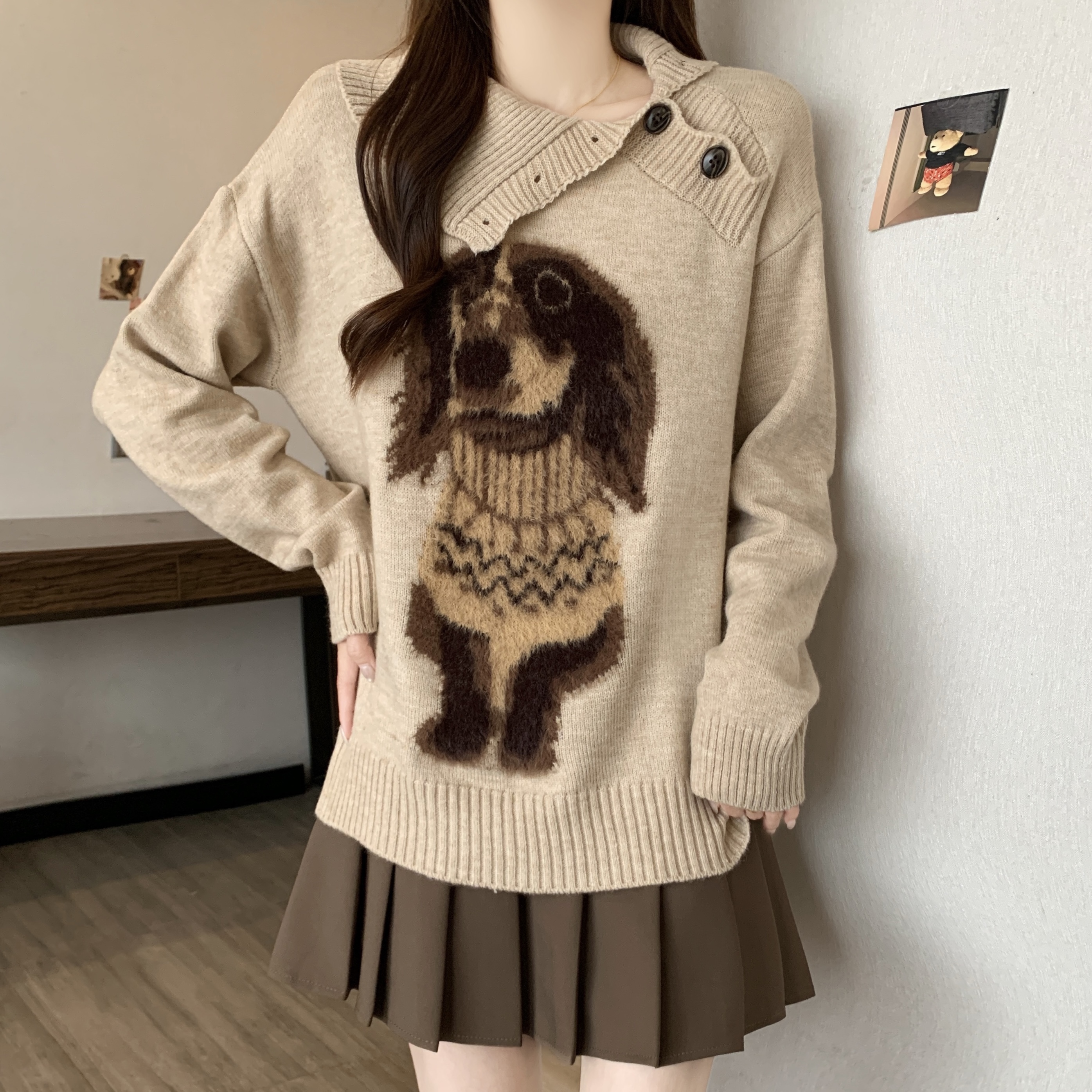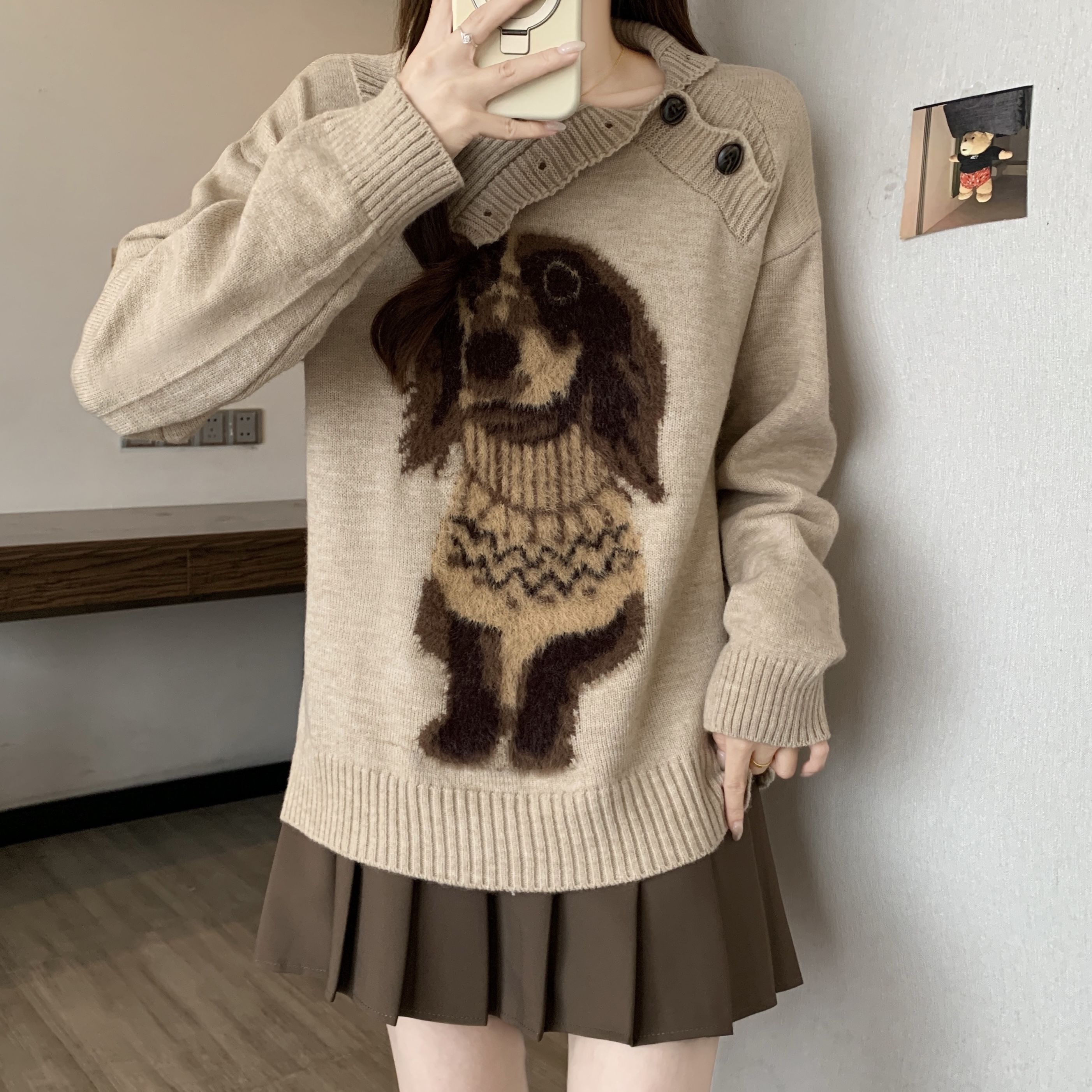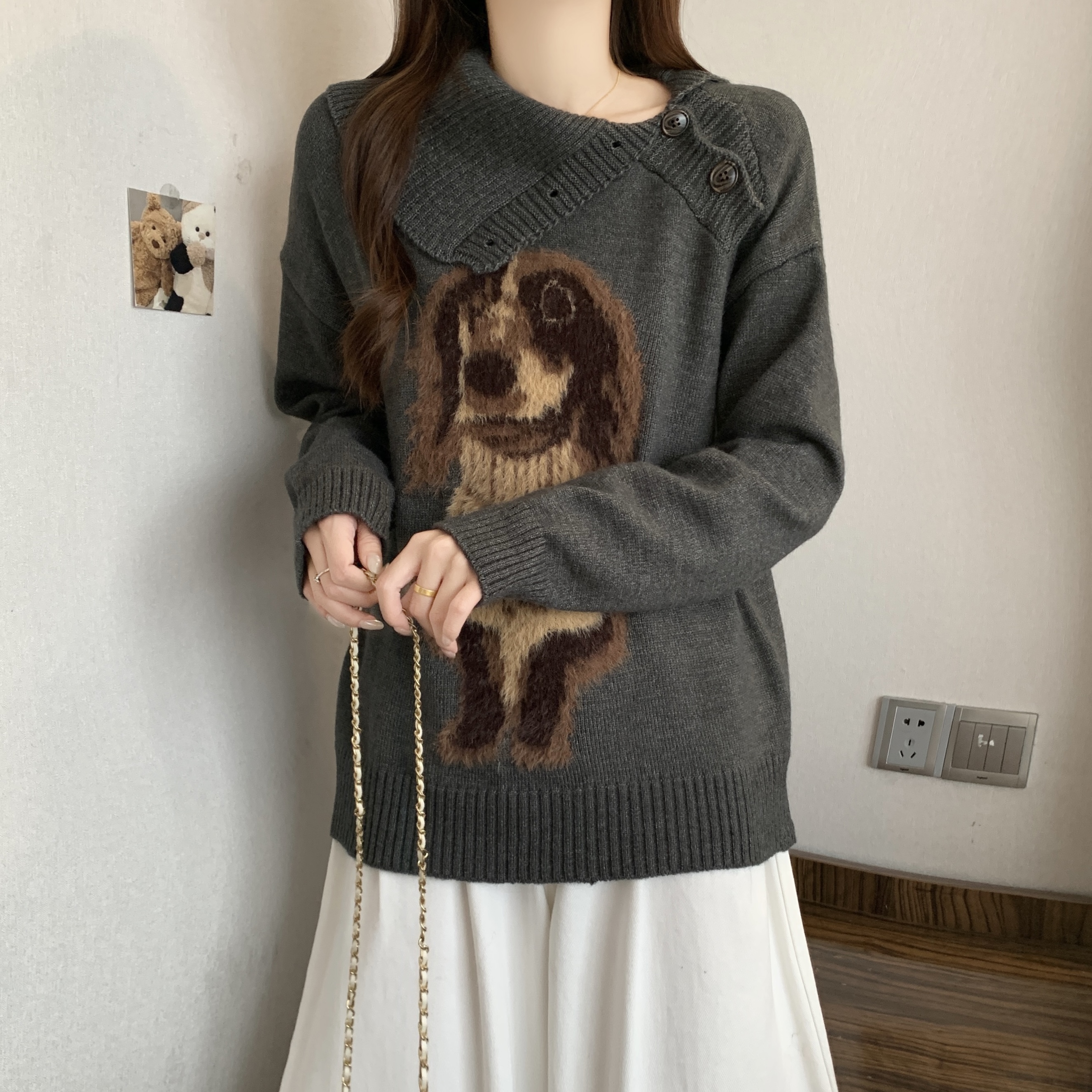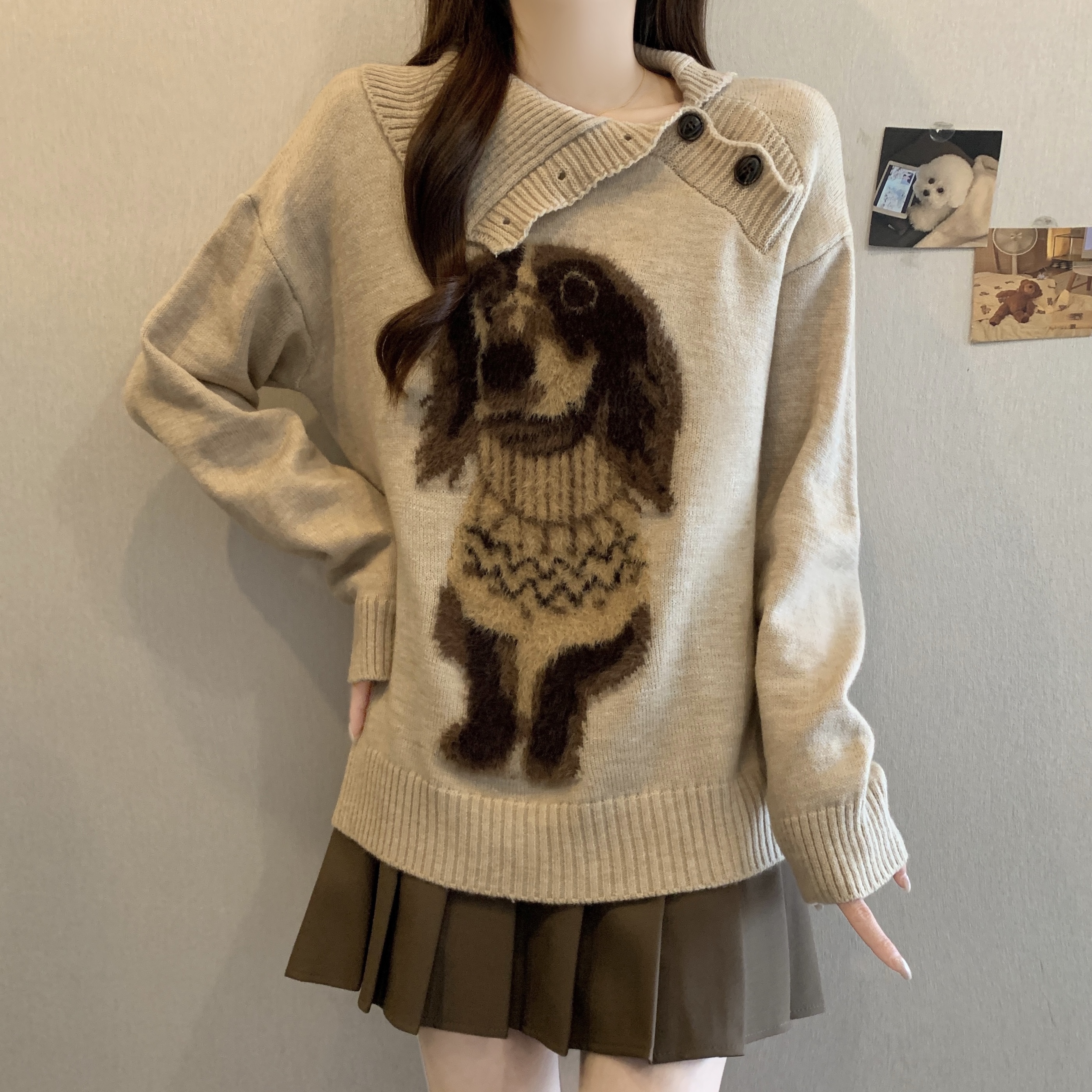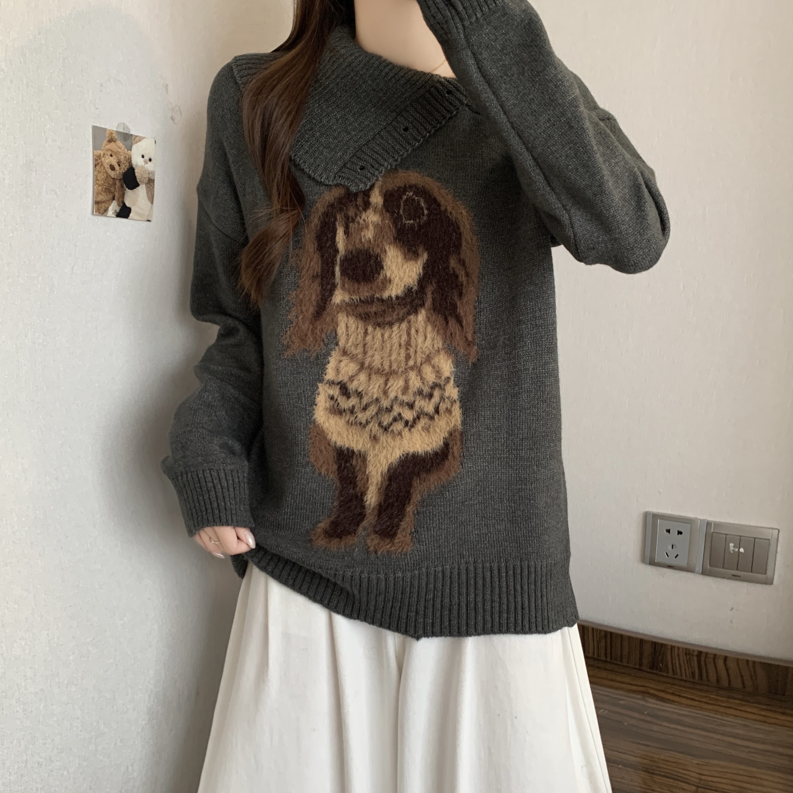 MY14276# 高级感韩系小狗翻领套头毛衣复古宽松慵懒风外穿针织上衣女裝貨源服裝批發