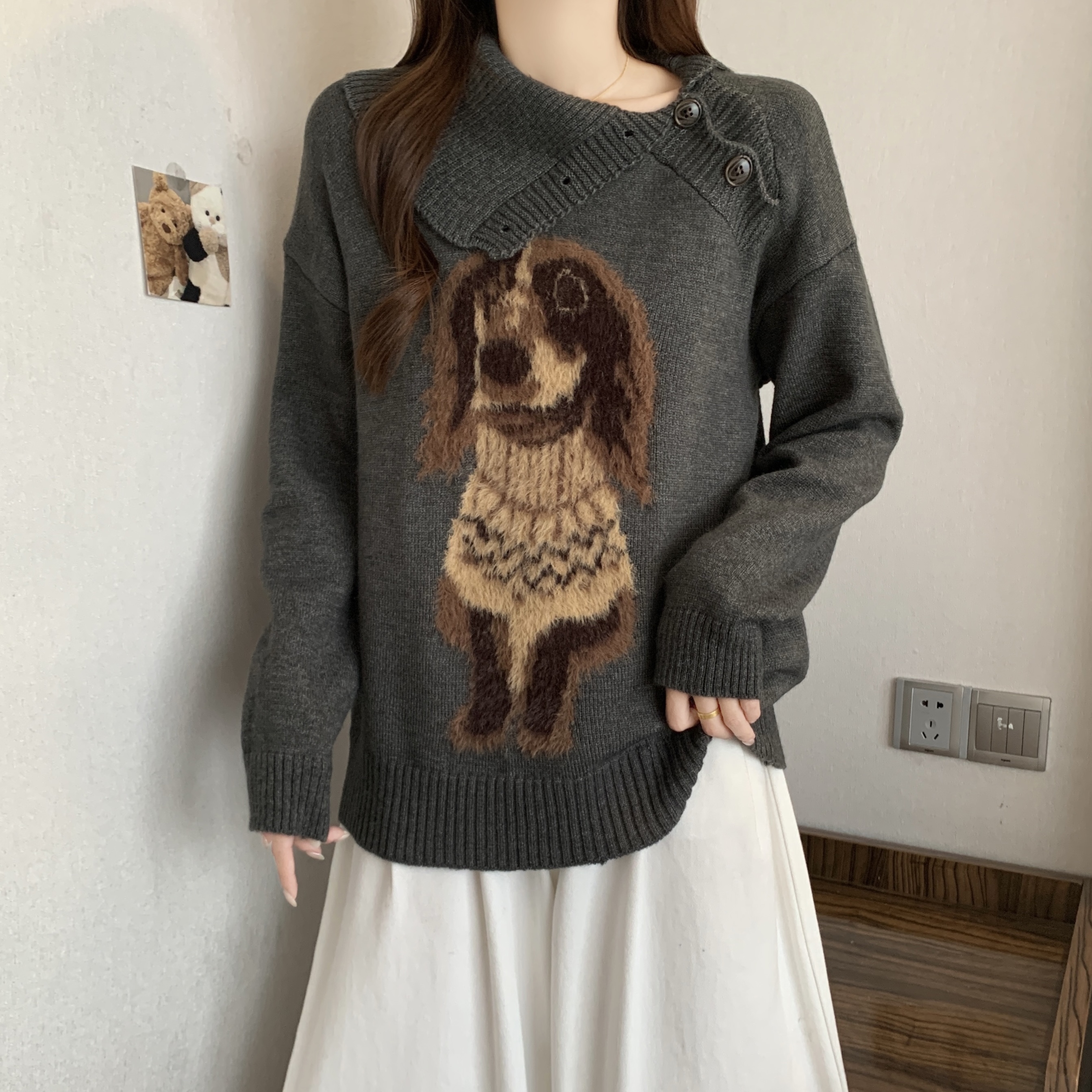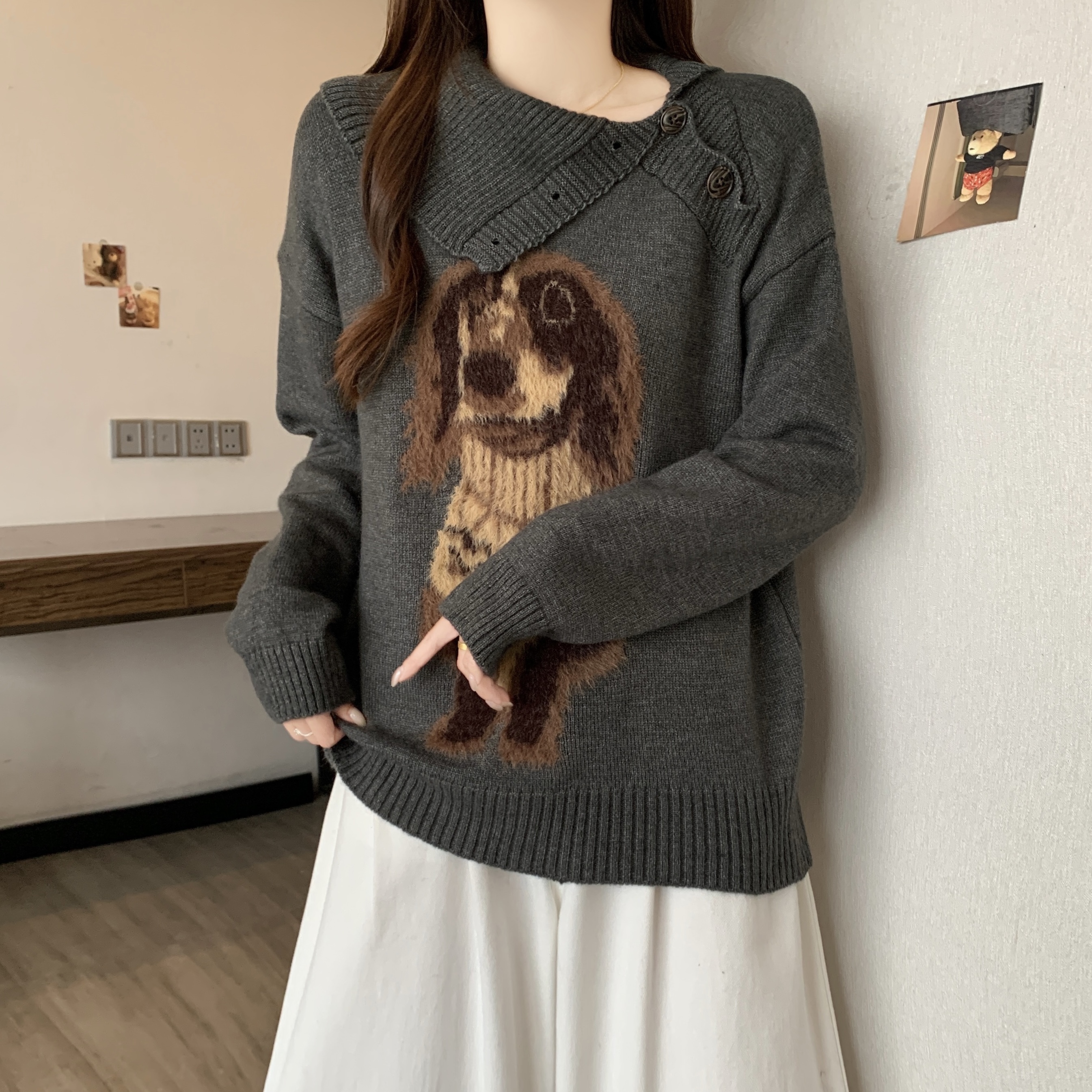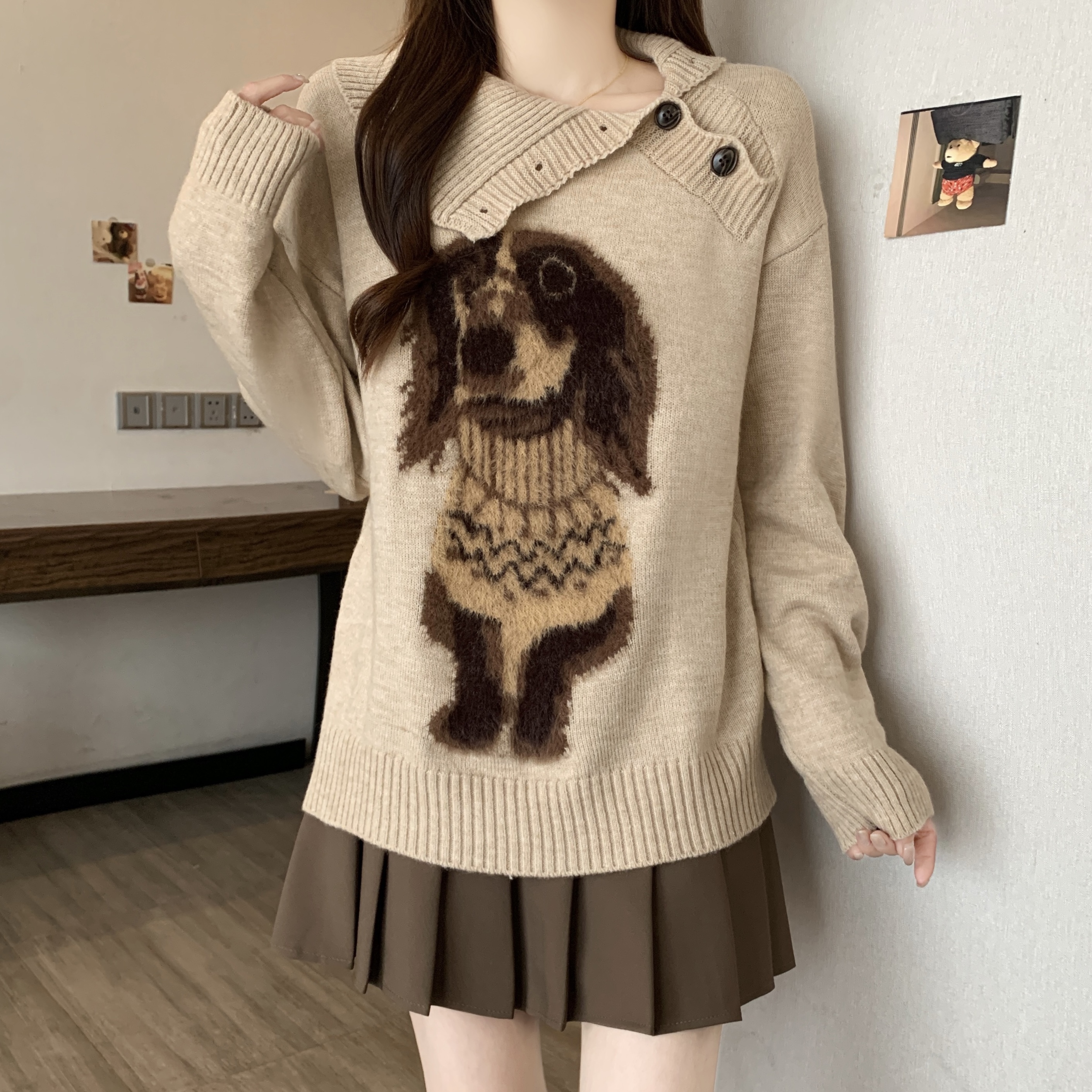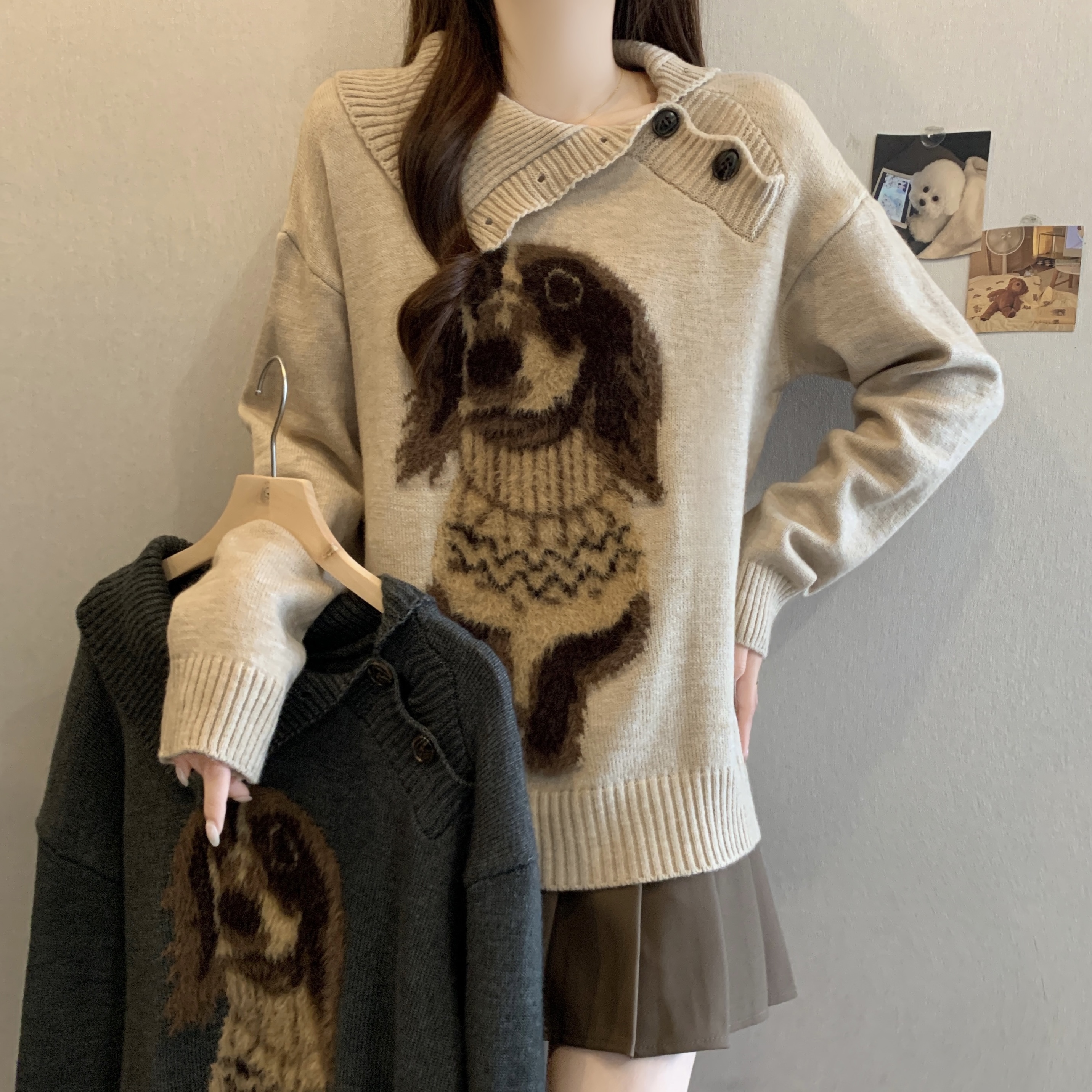 MY14276# 高级感韩系小狗翻领套头毛衣复古宽松慵懒风外穿针织上衣女裝貨源服裝批發