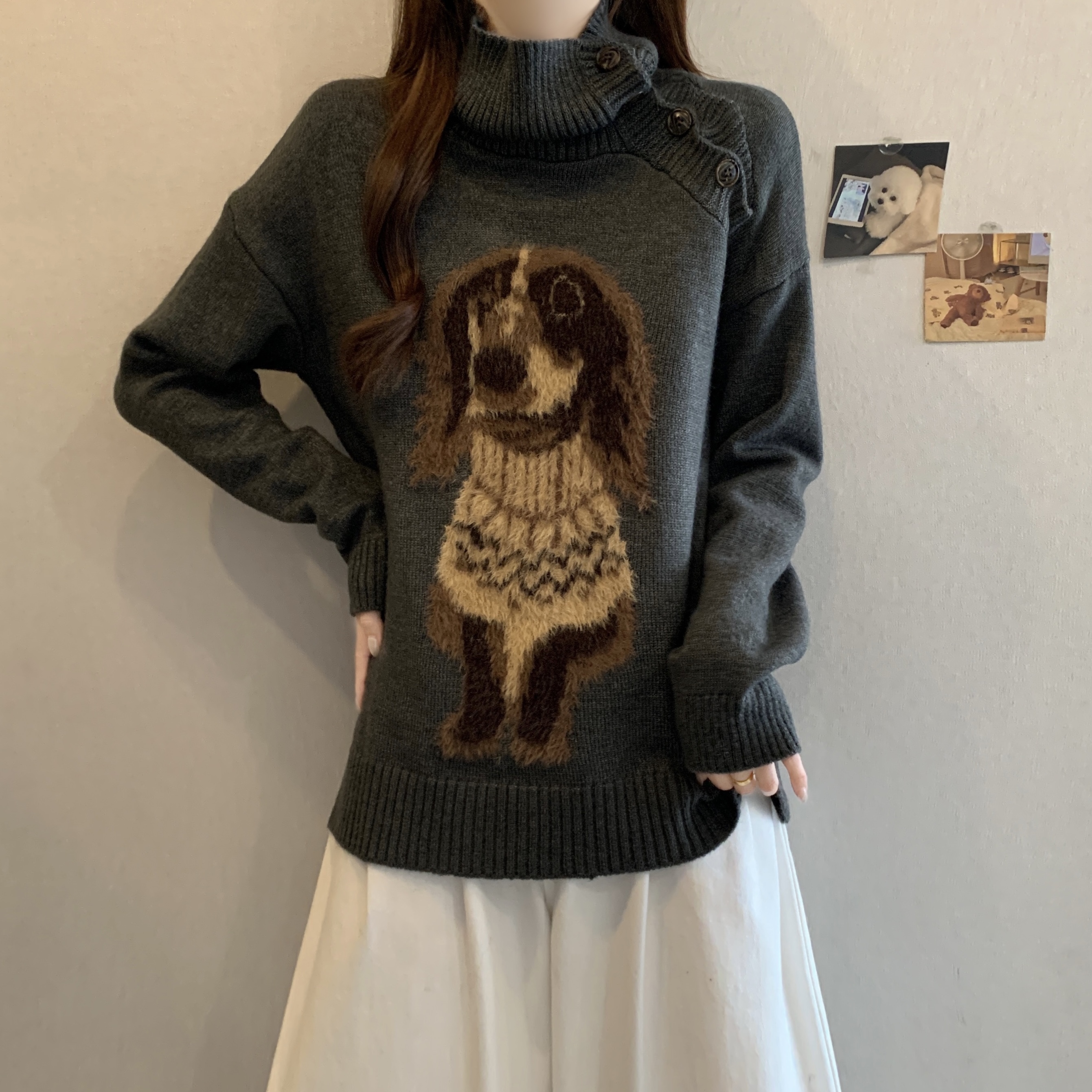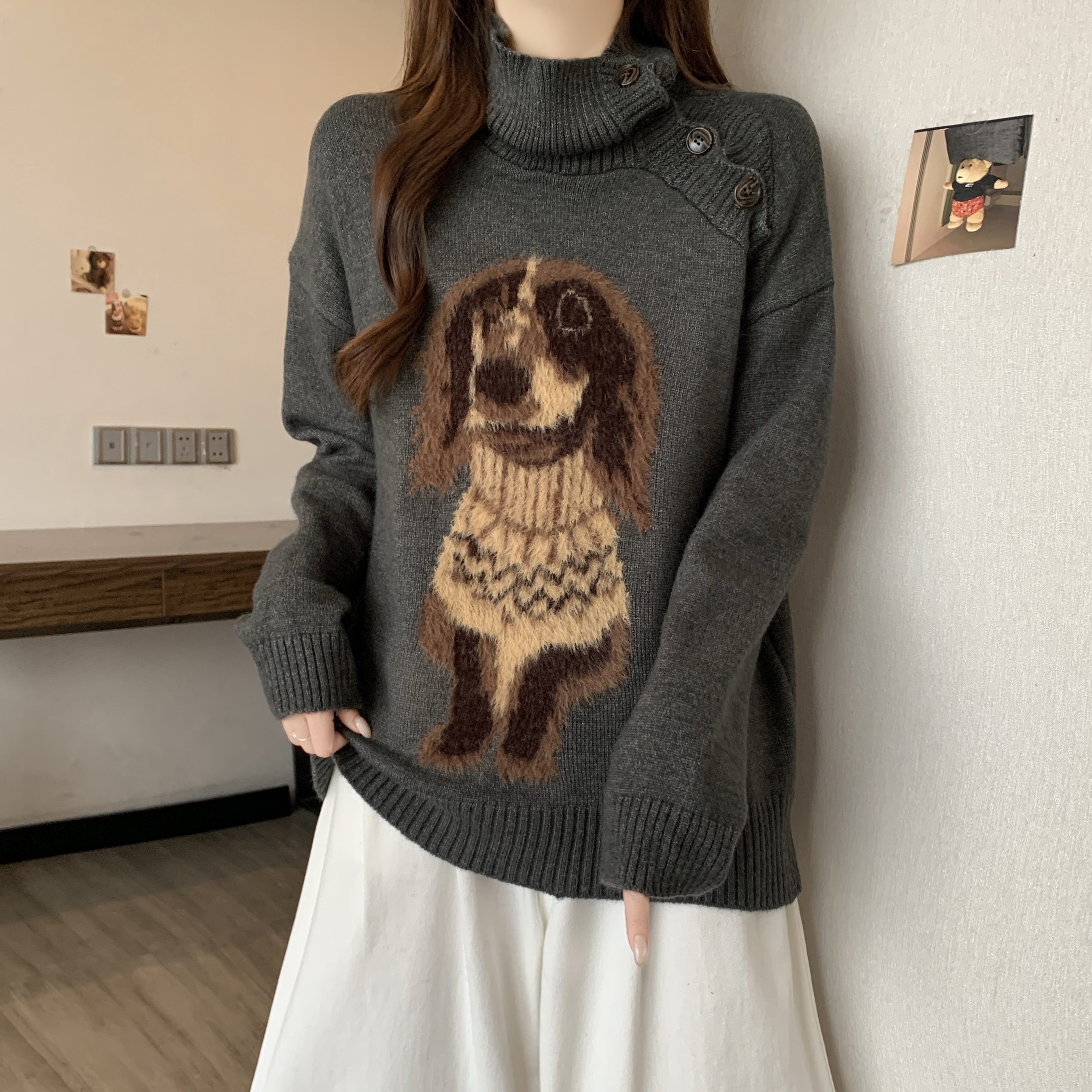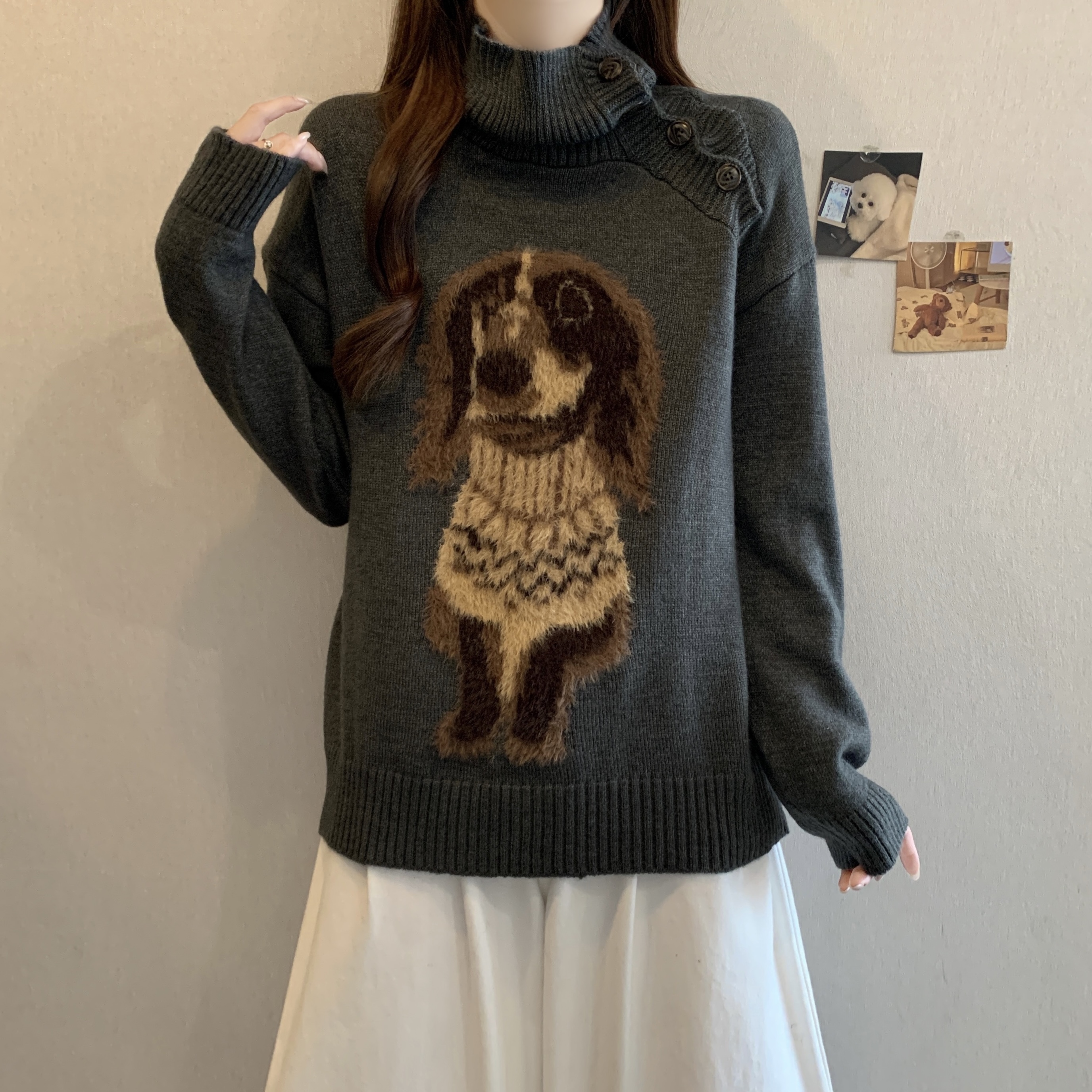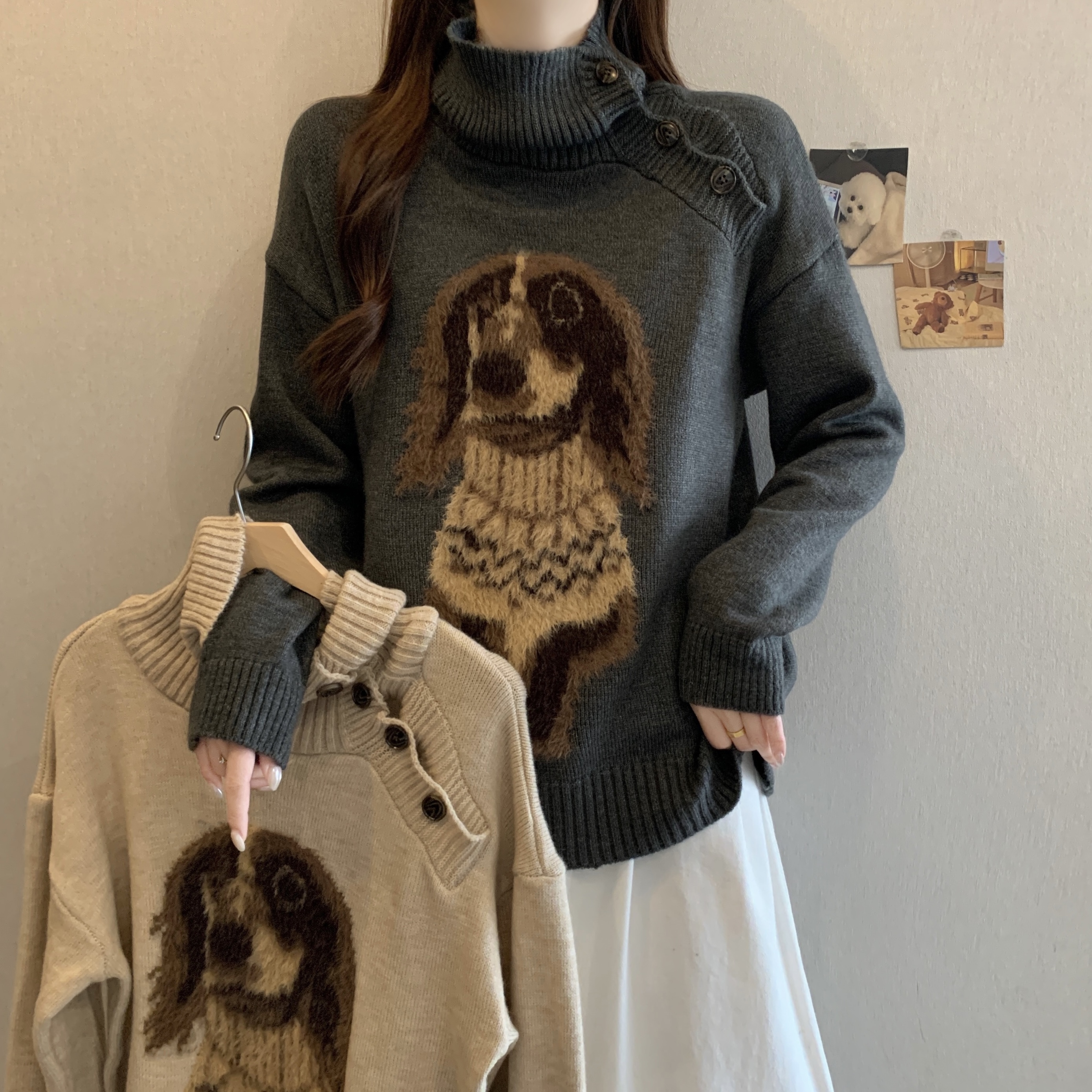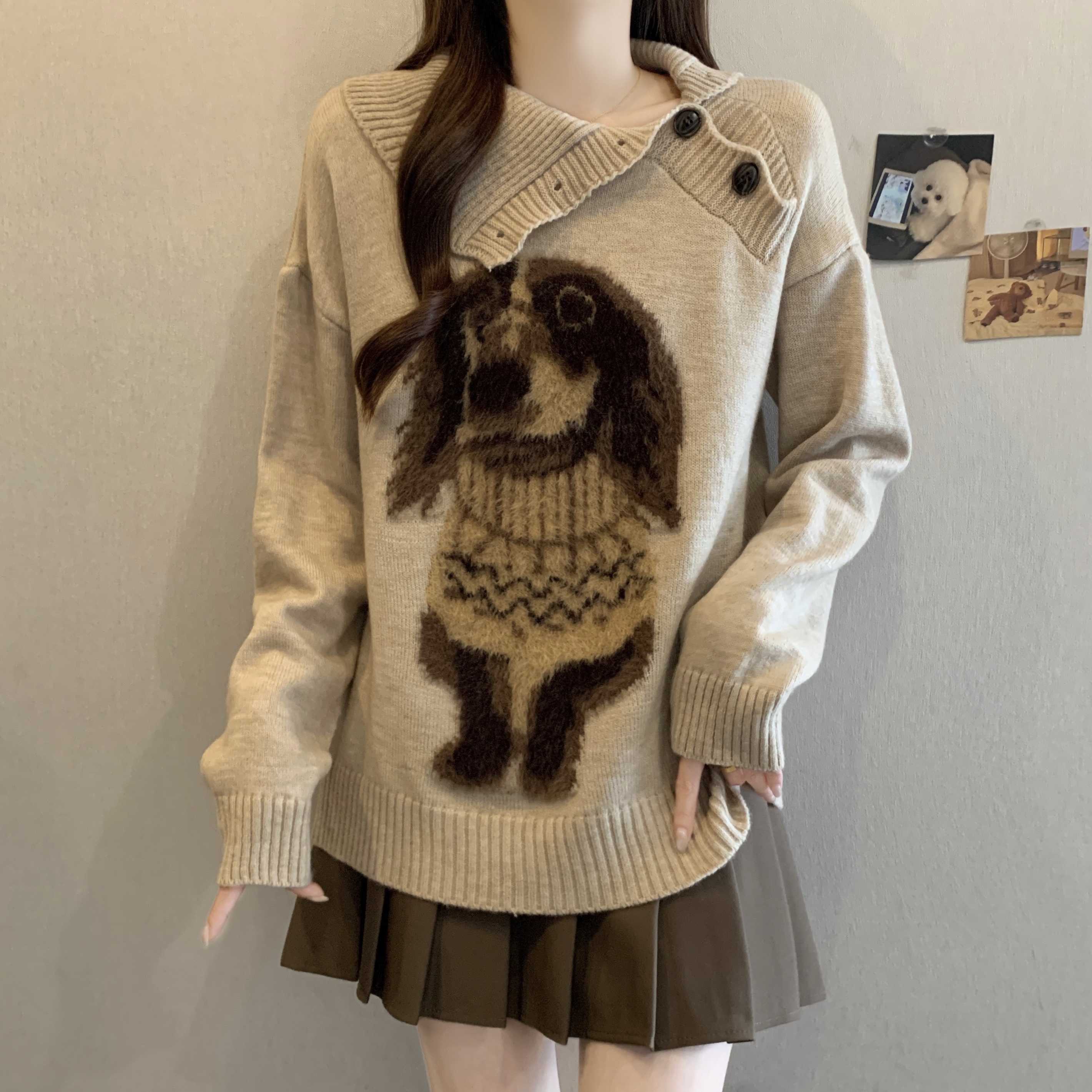 MY14276# 高级感韩系小狗翻领套头毛衣复古宽松慵懒风外穿针织上衣女裝貨源服裝批發