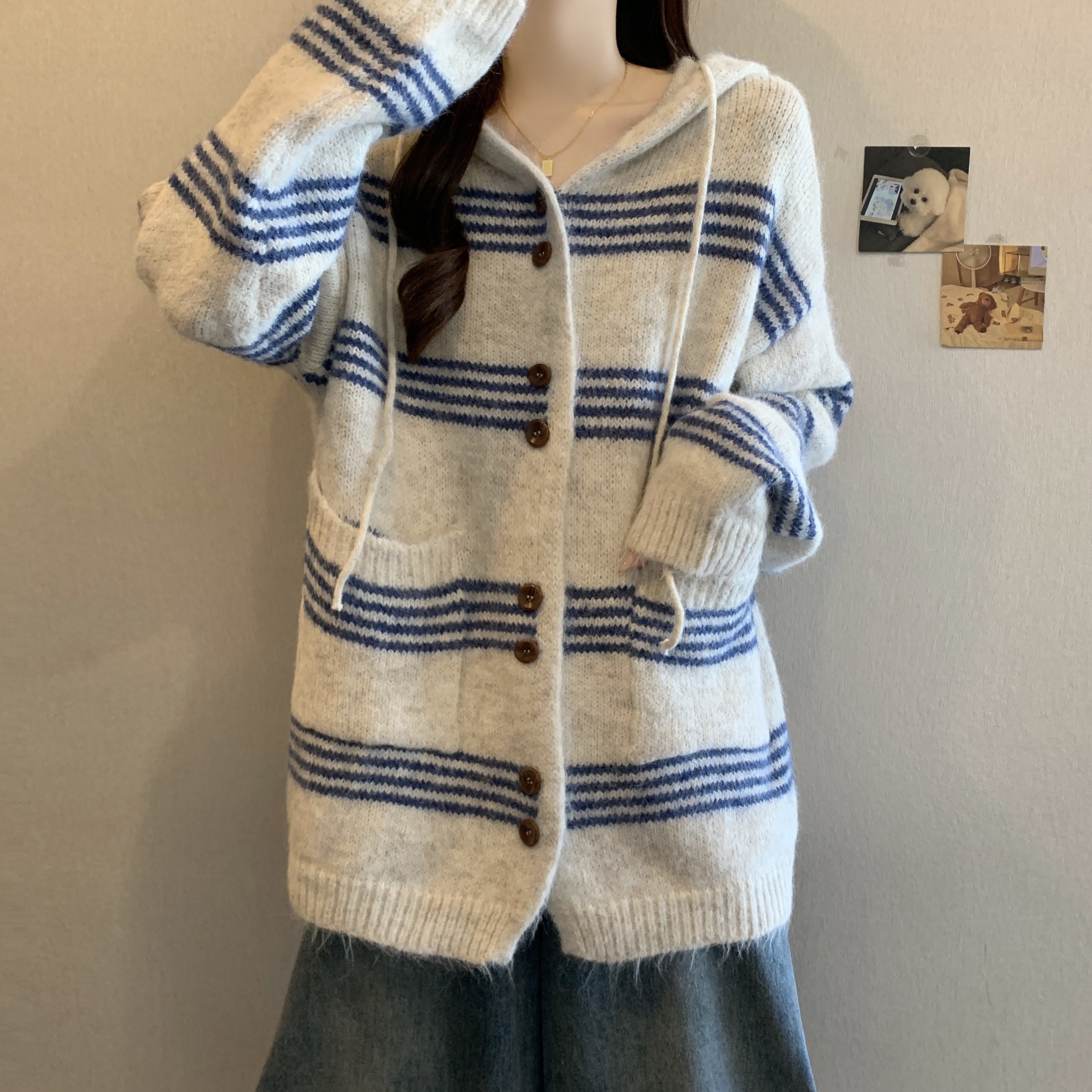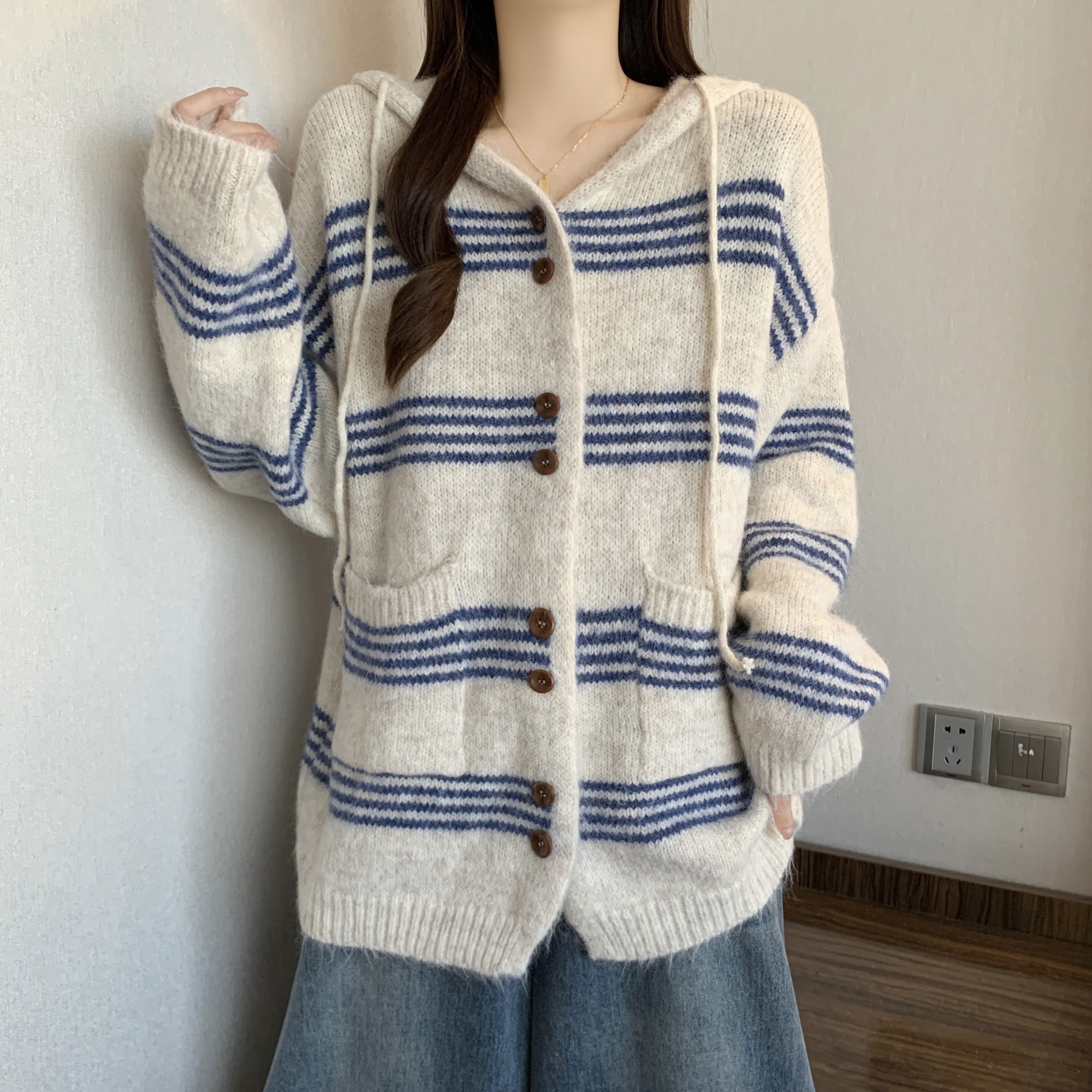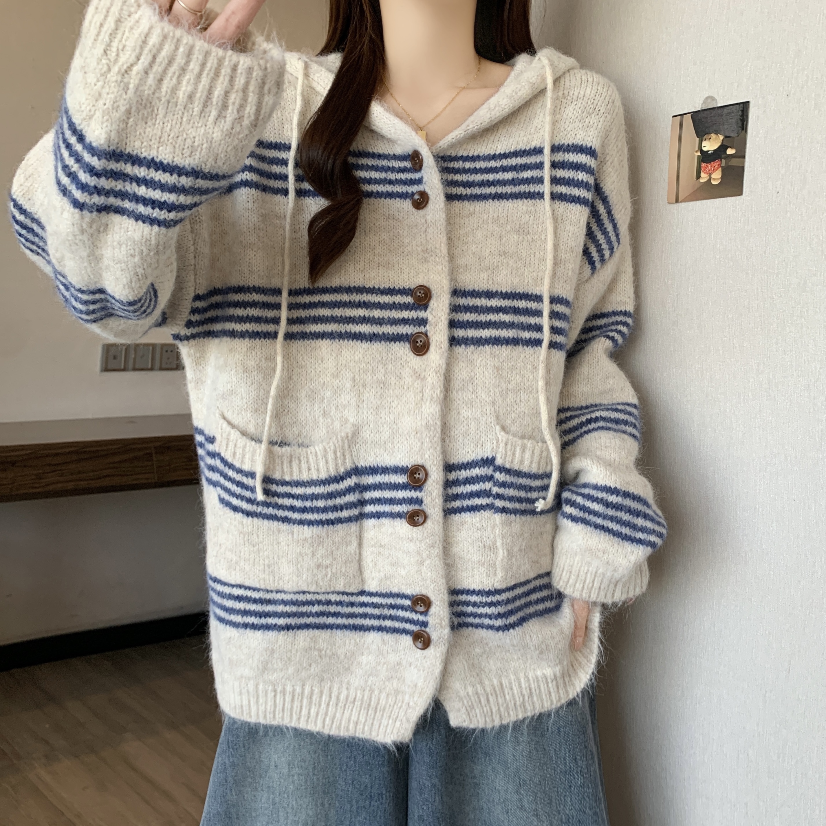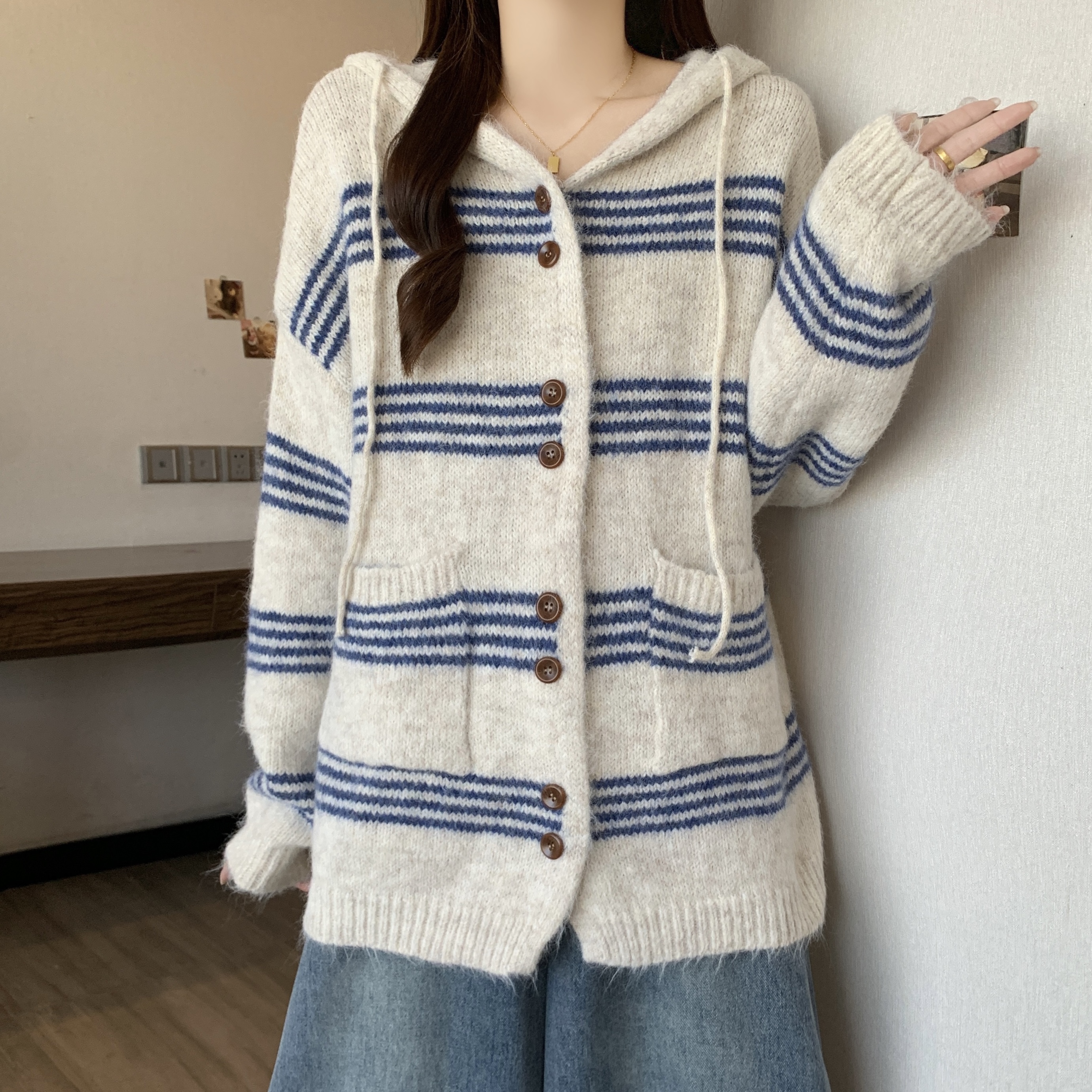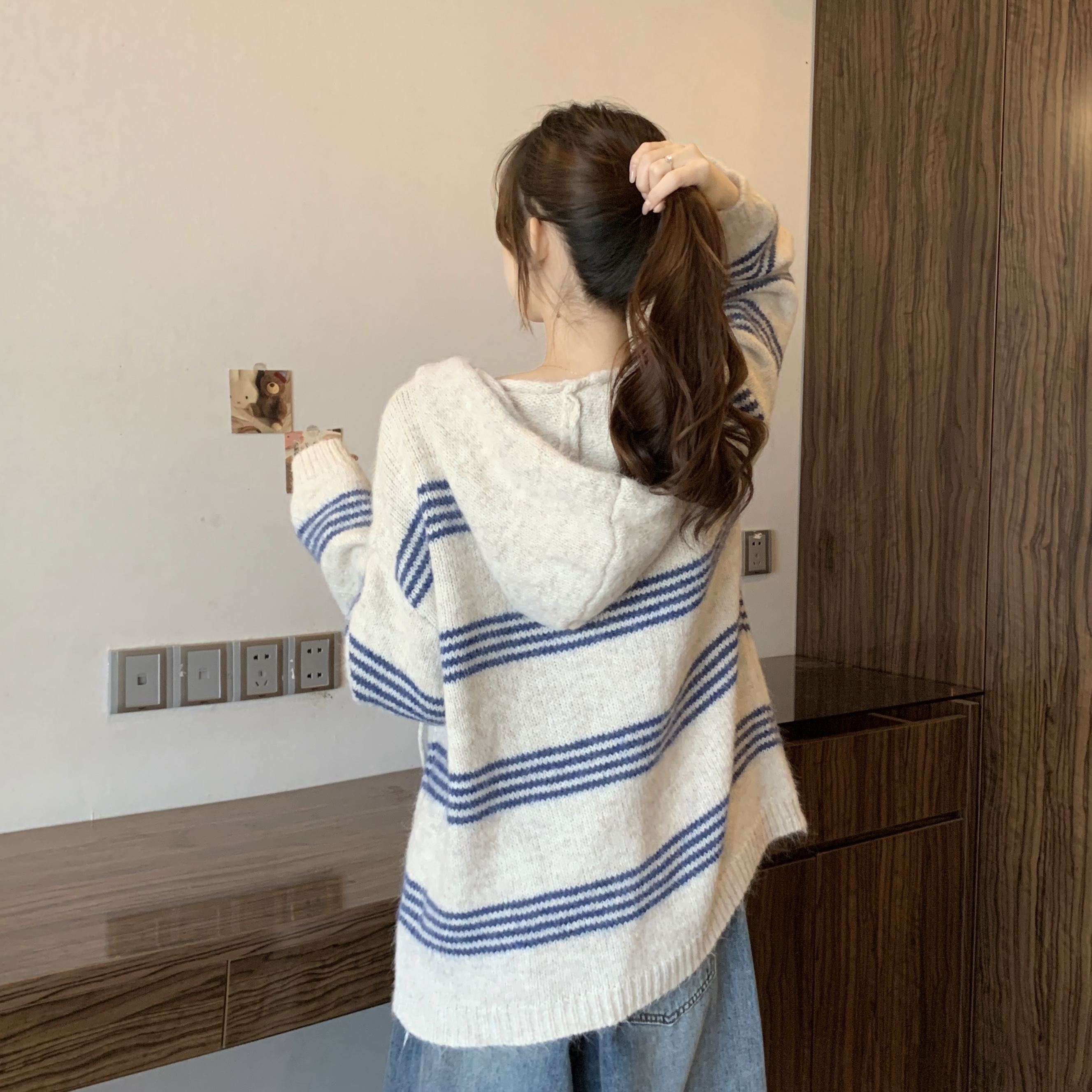 MY14278# 学院风韩系慵懒设计感毛衣外套条纹连帽长袖针织上衣女裝貨源服裝批發