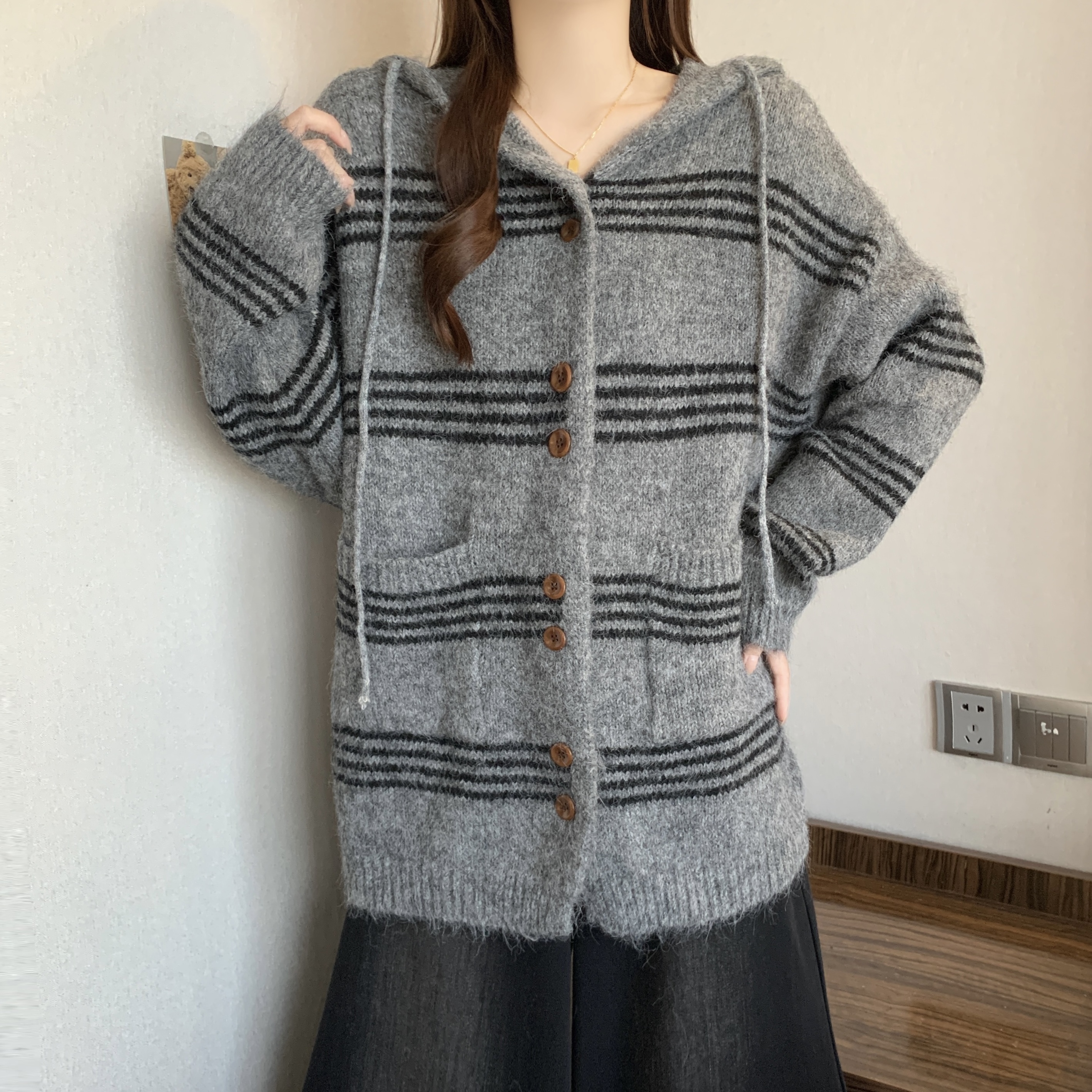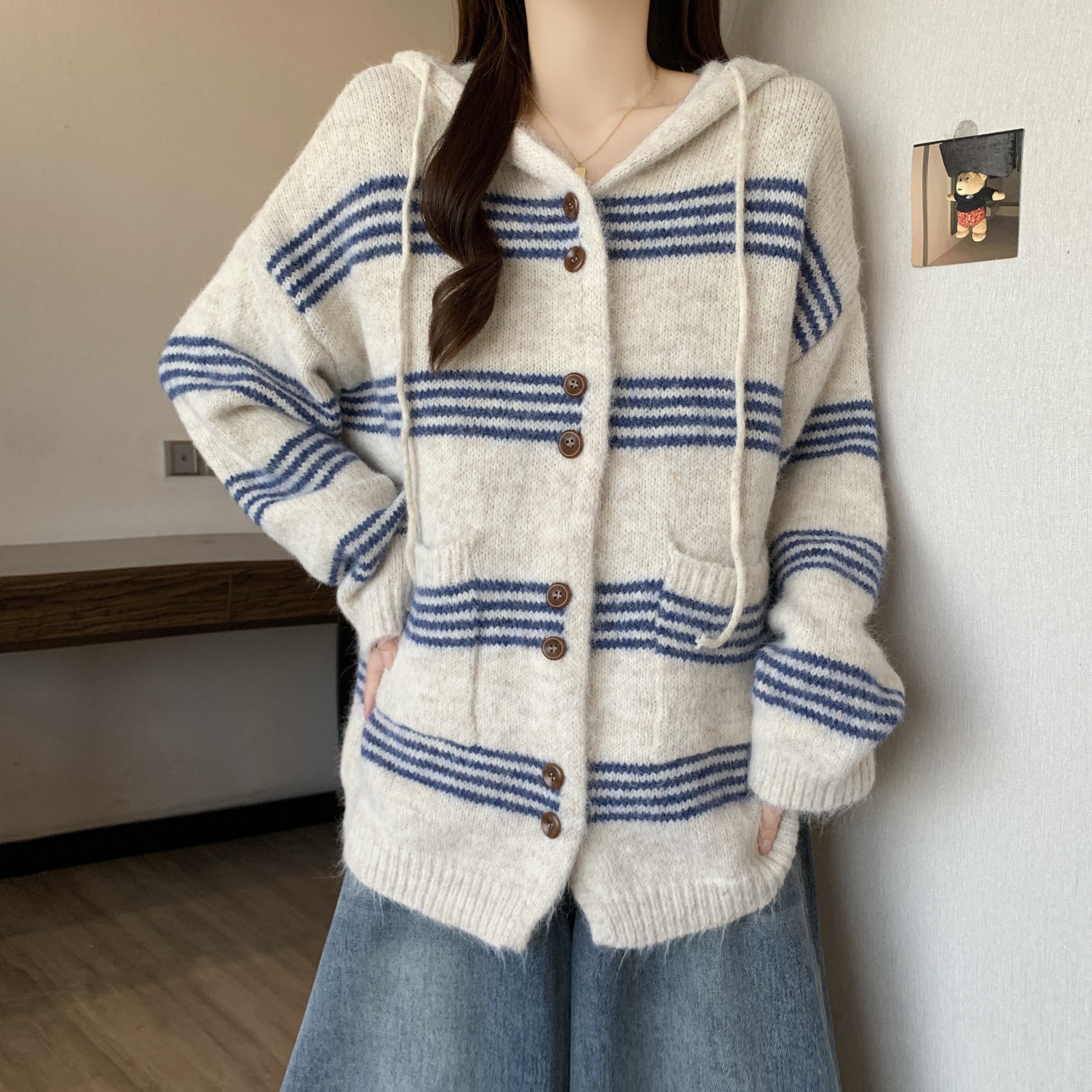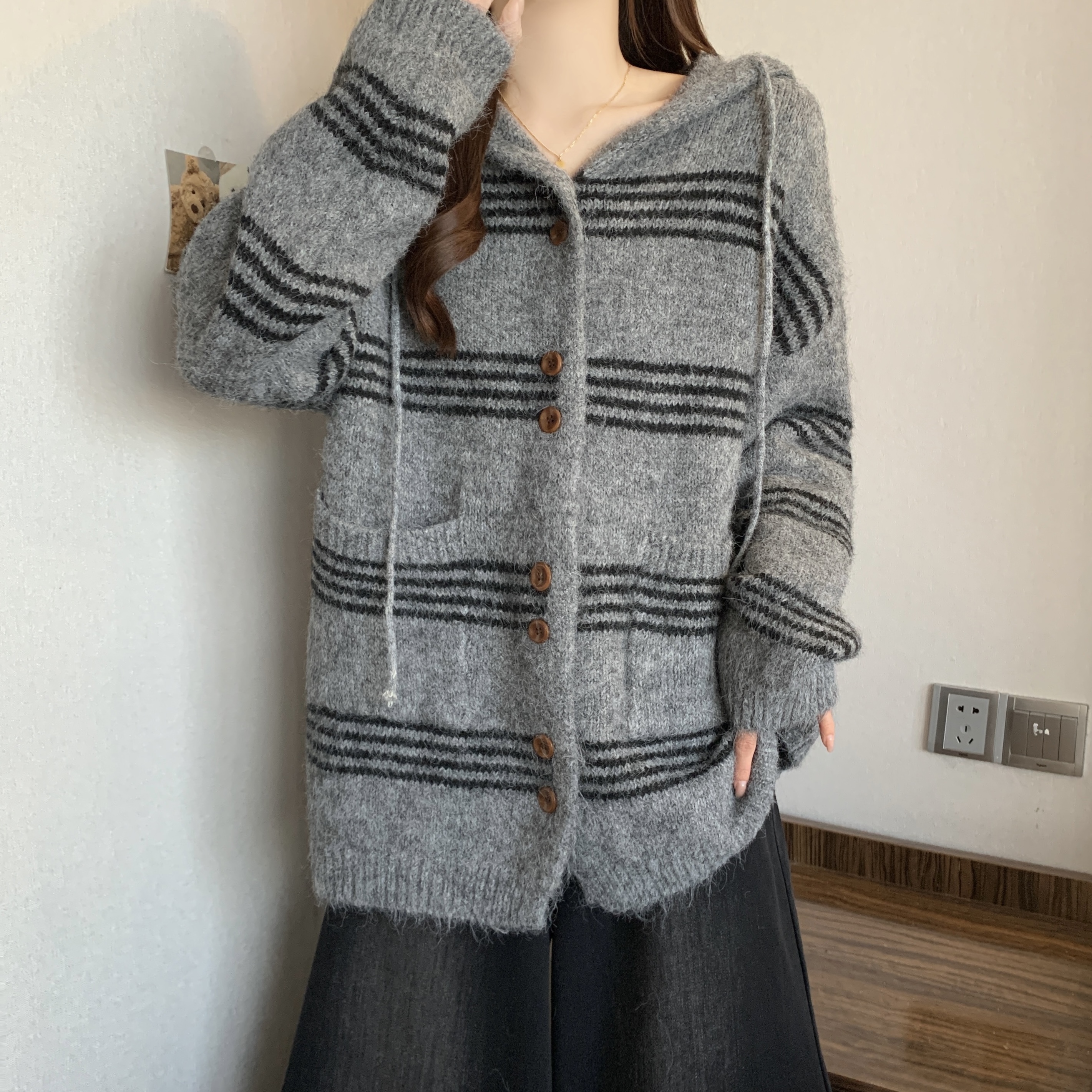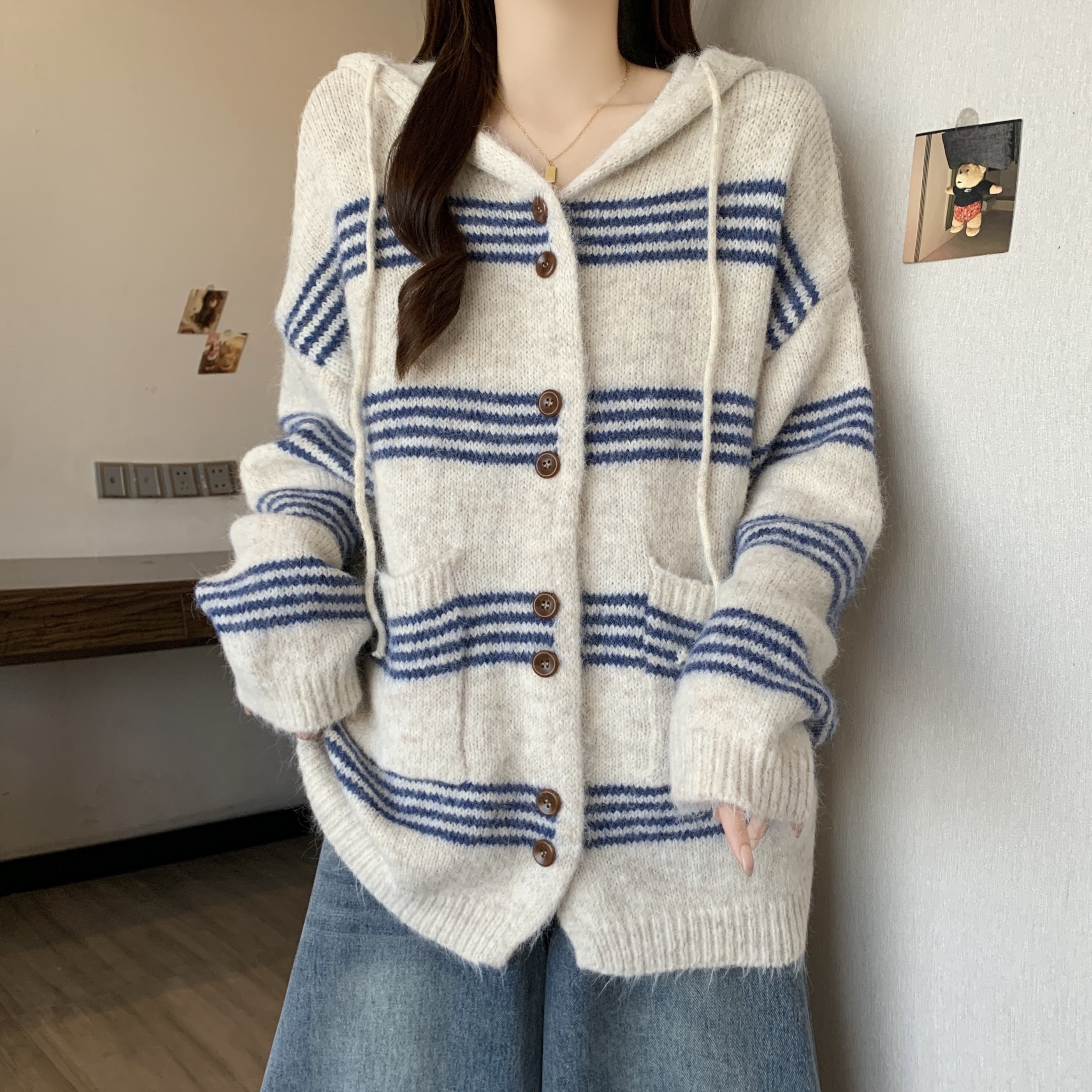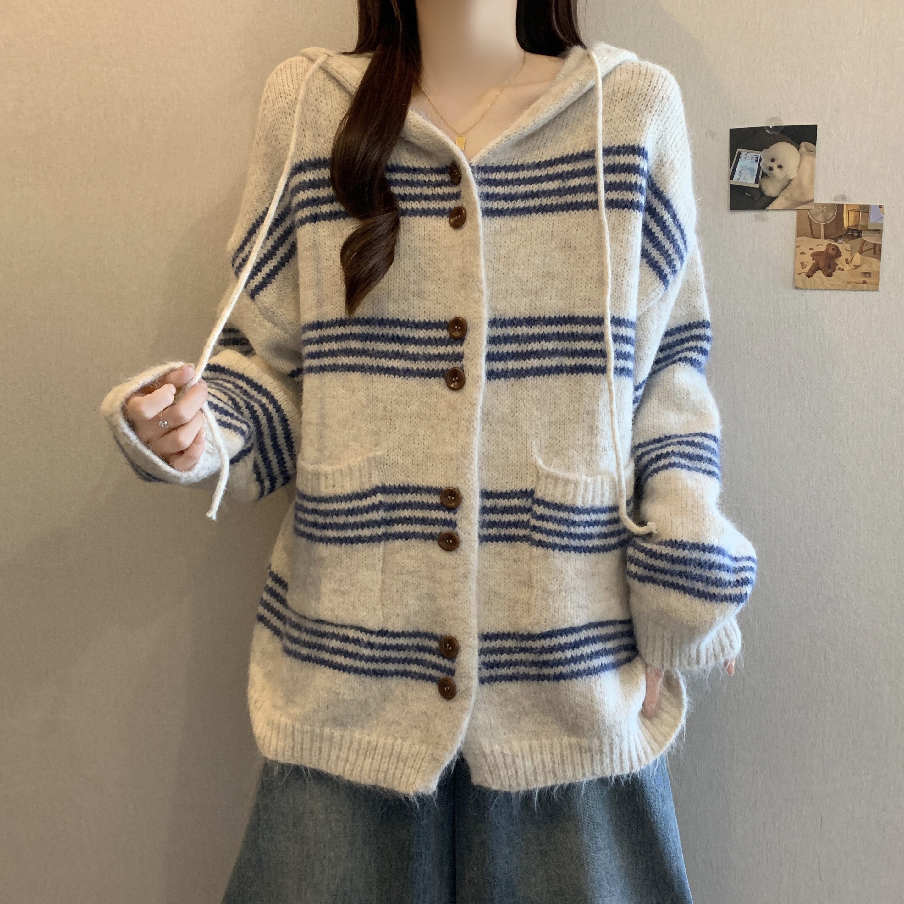 MY14278# 学院风韩系慵懒设计感毛衣外套条纹连帽长袖针织上衣女裝貨源服裝批發