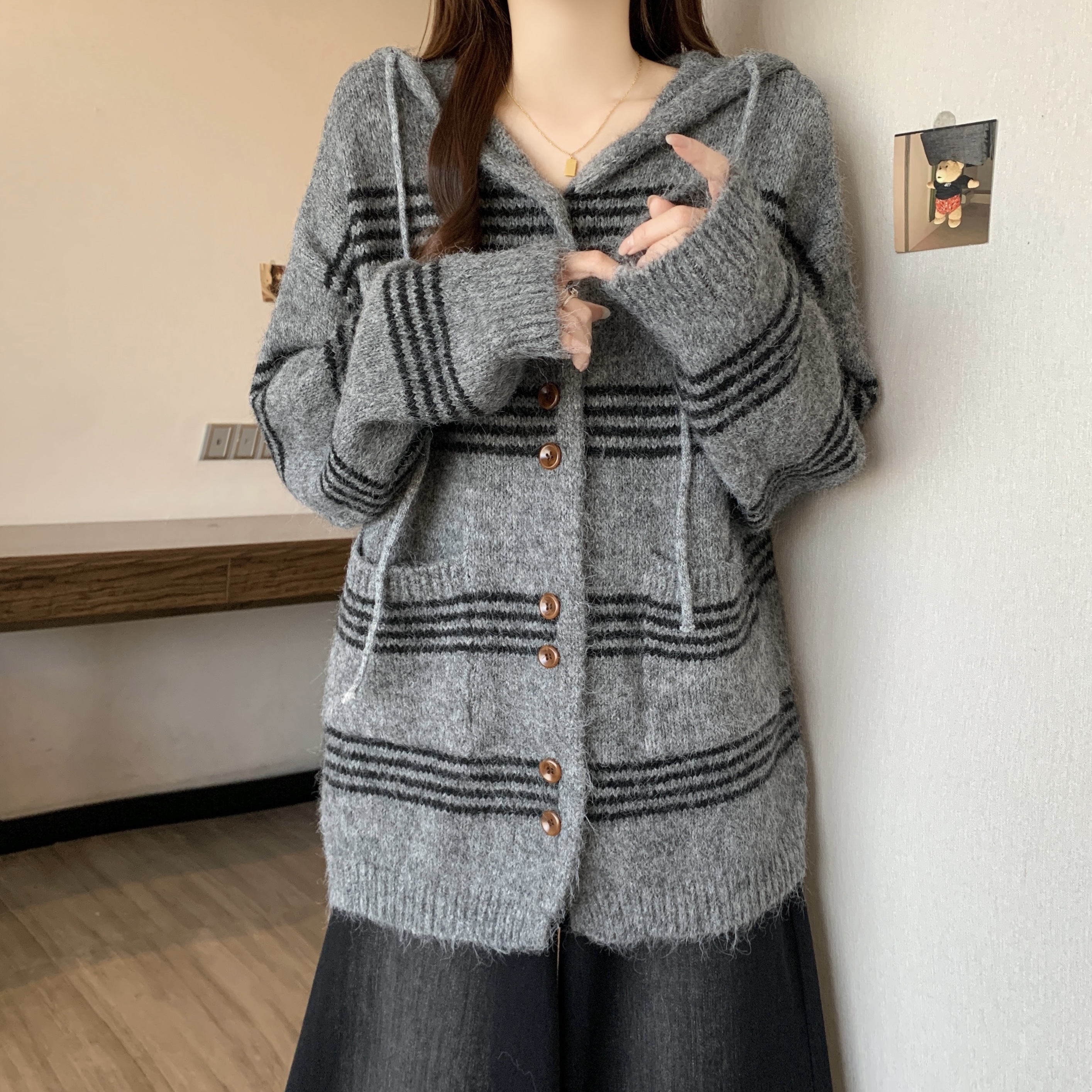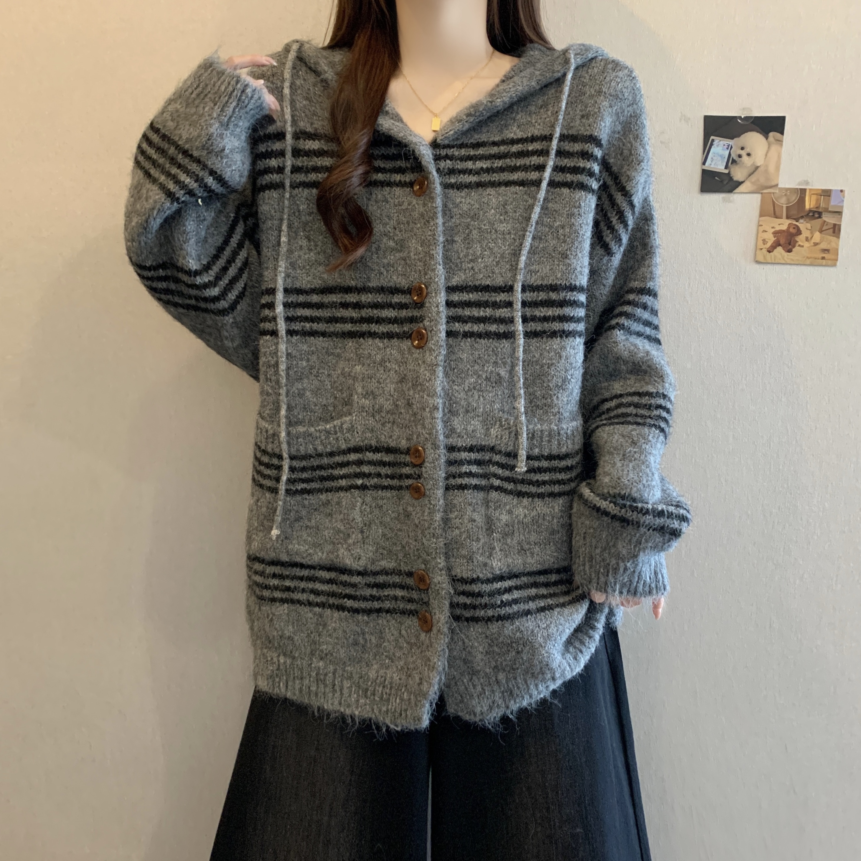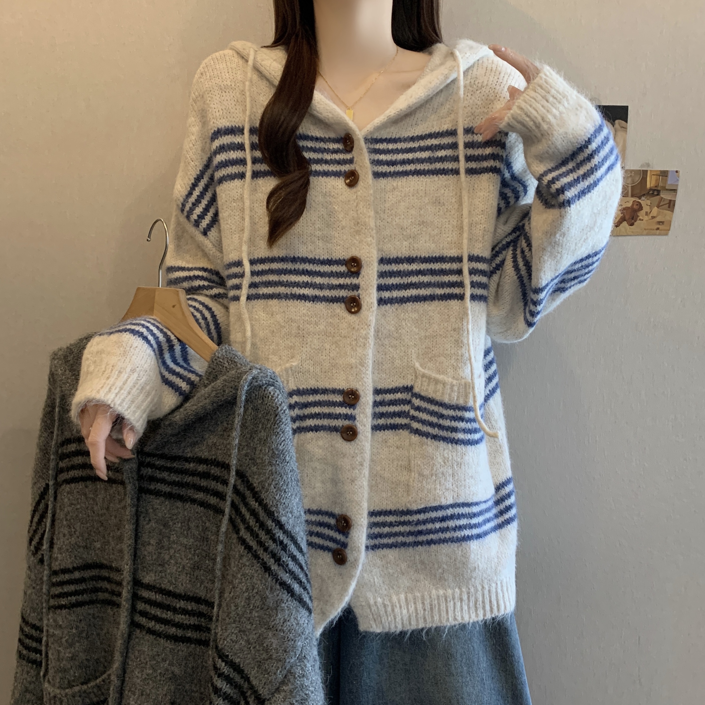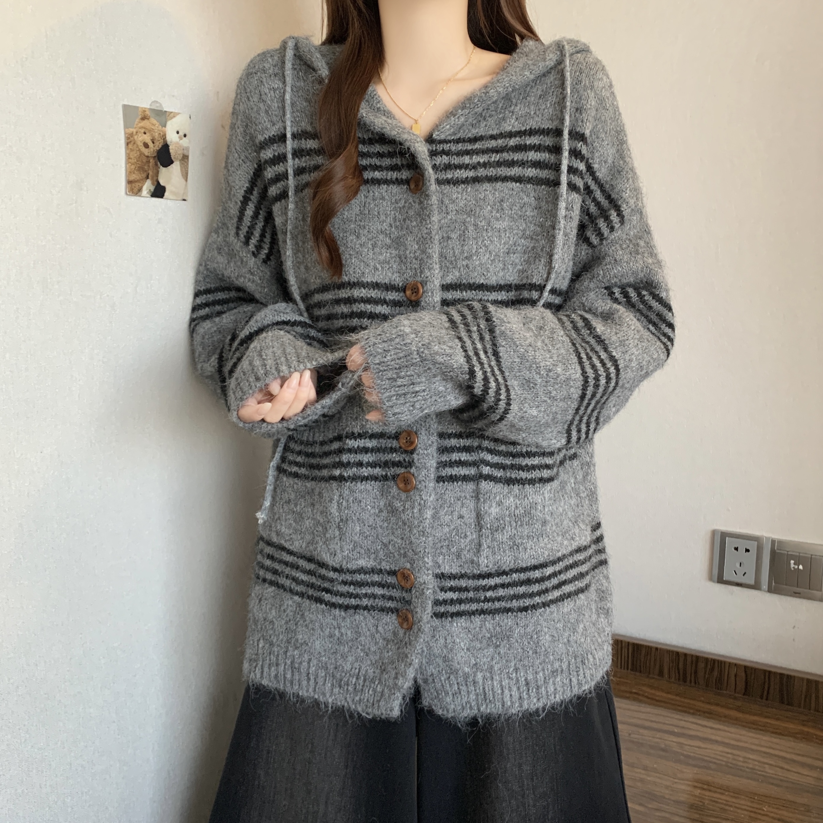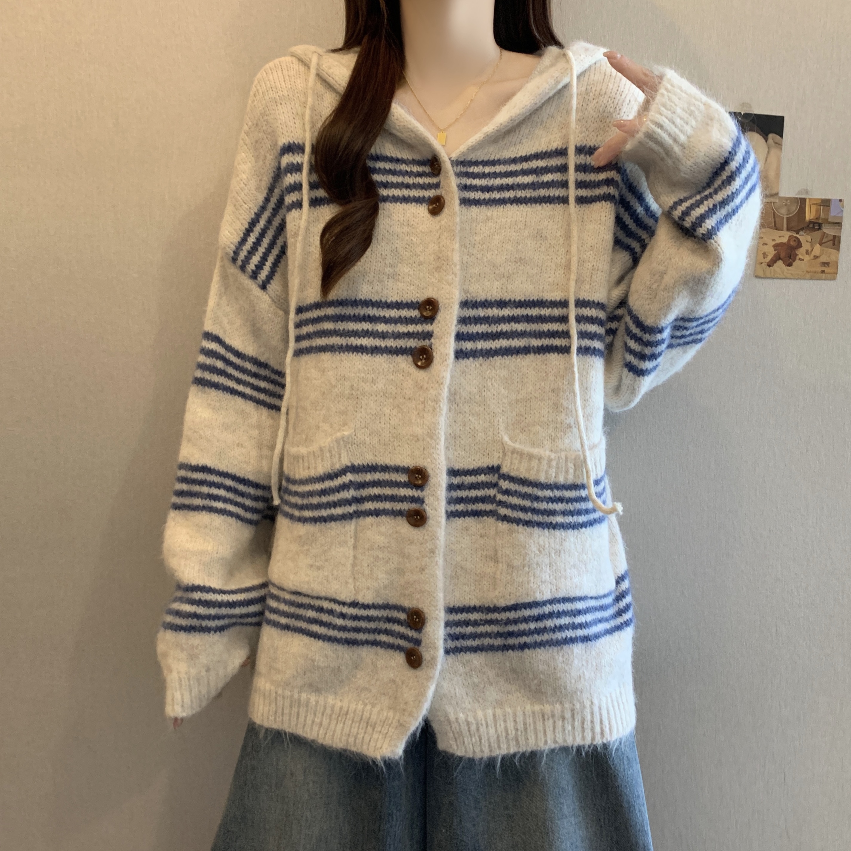 MY14278# 学院风韩系慵懒设计感毛衣外套条纹连帽长袖针织上衣女裝貨源服裝批發