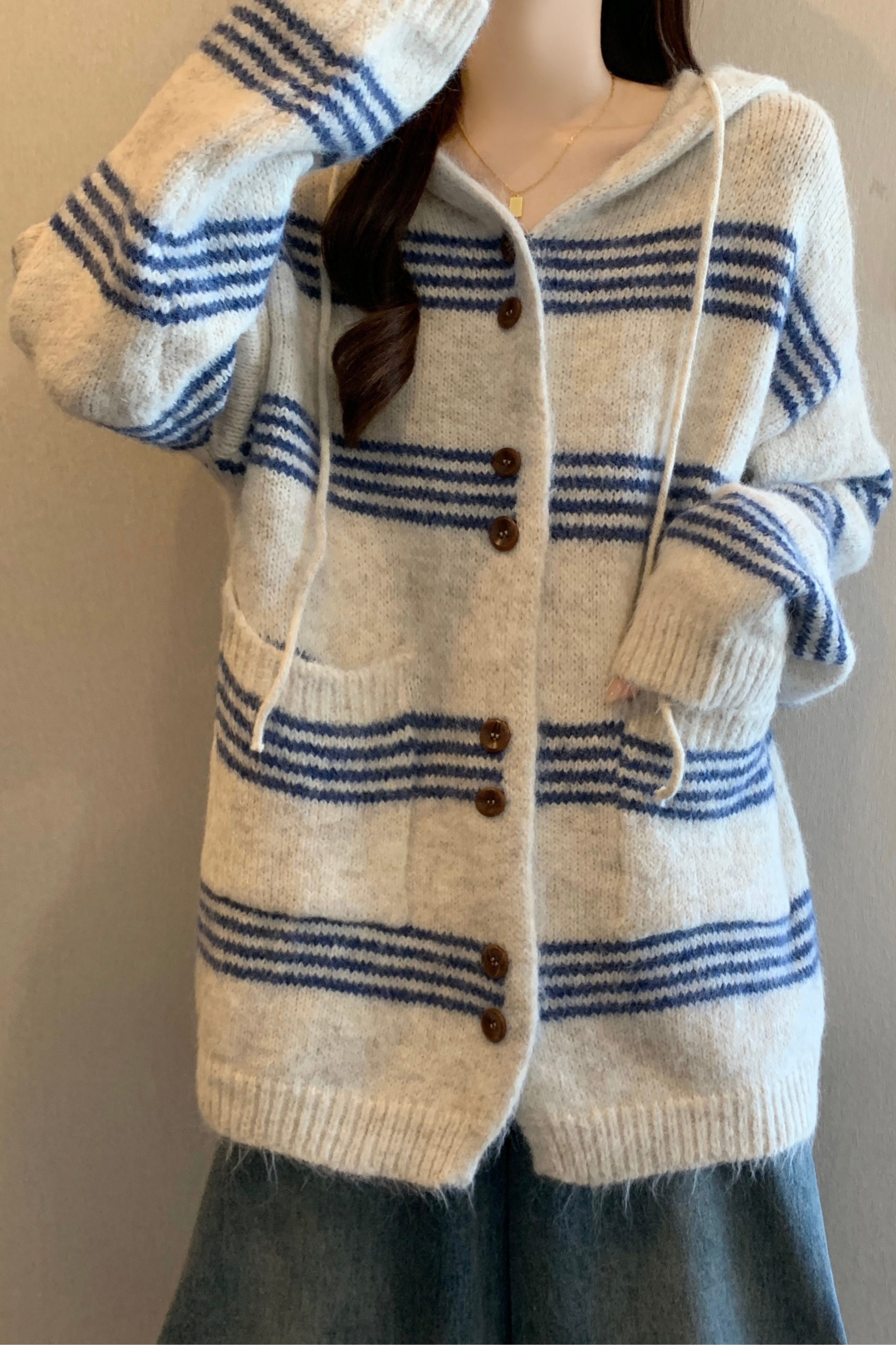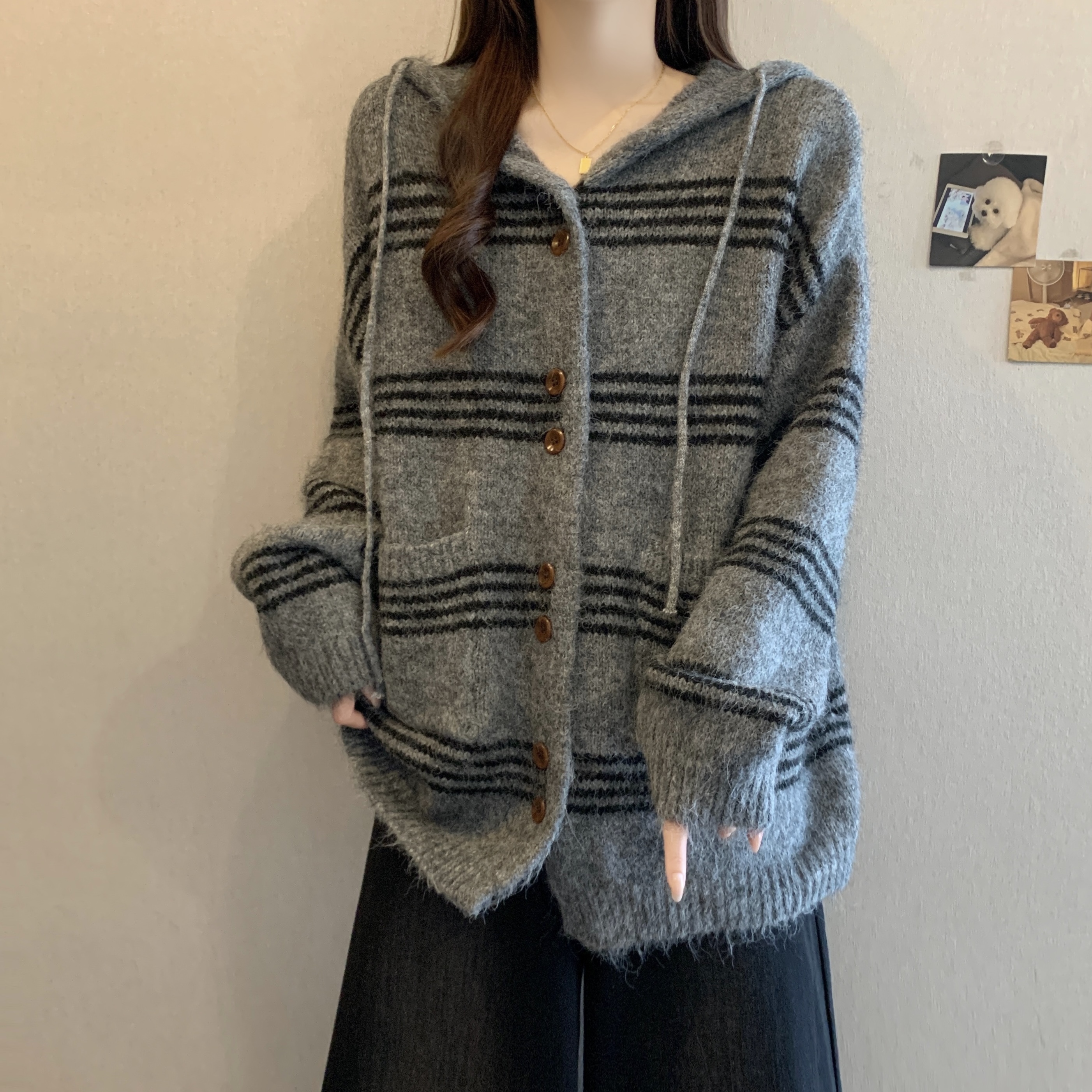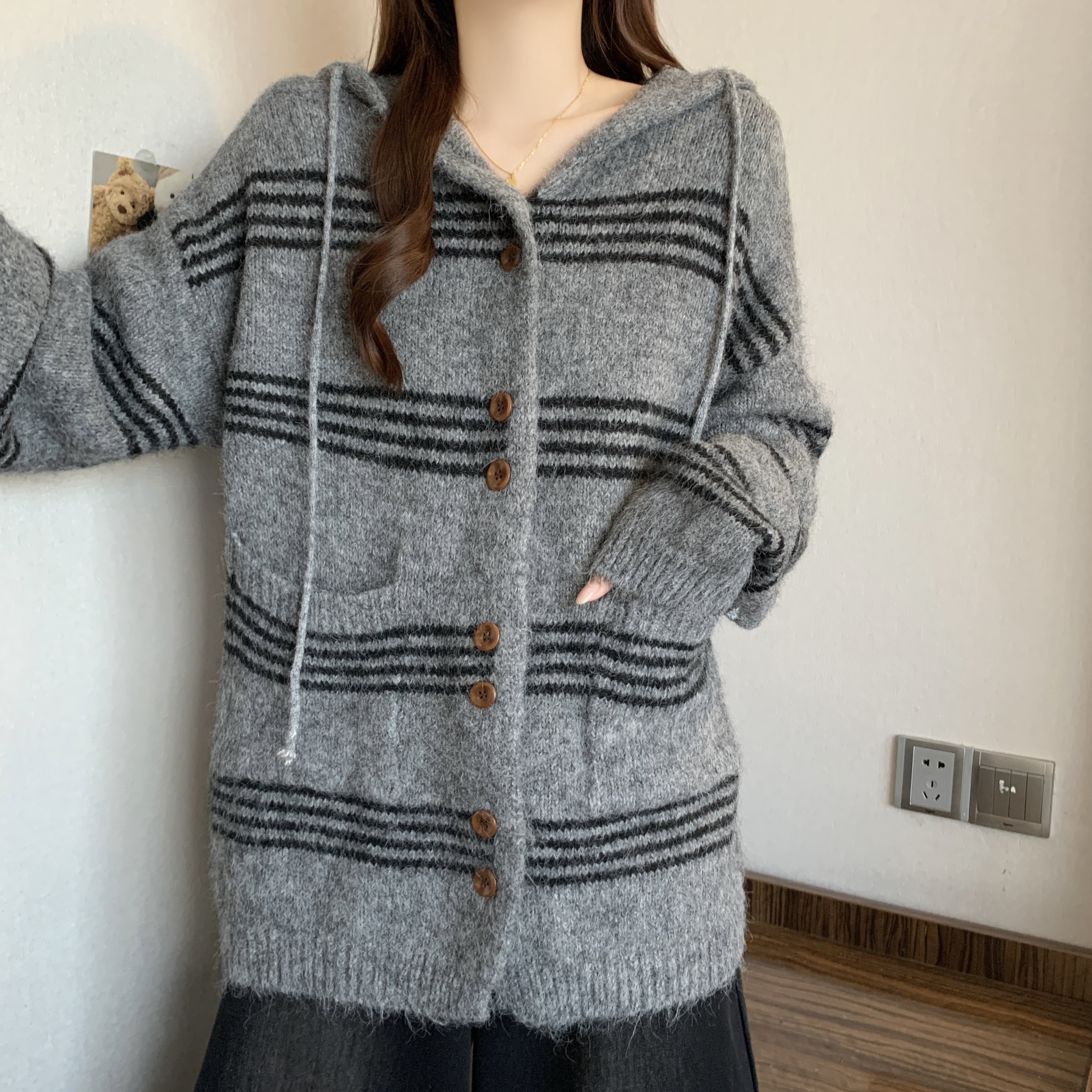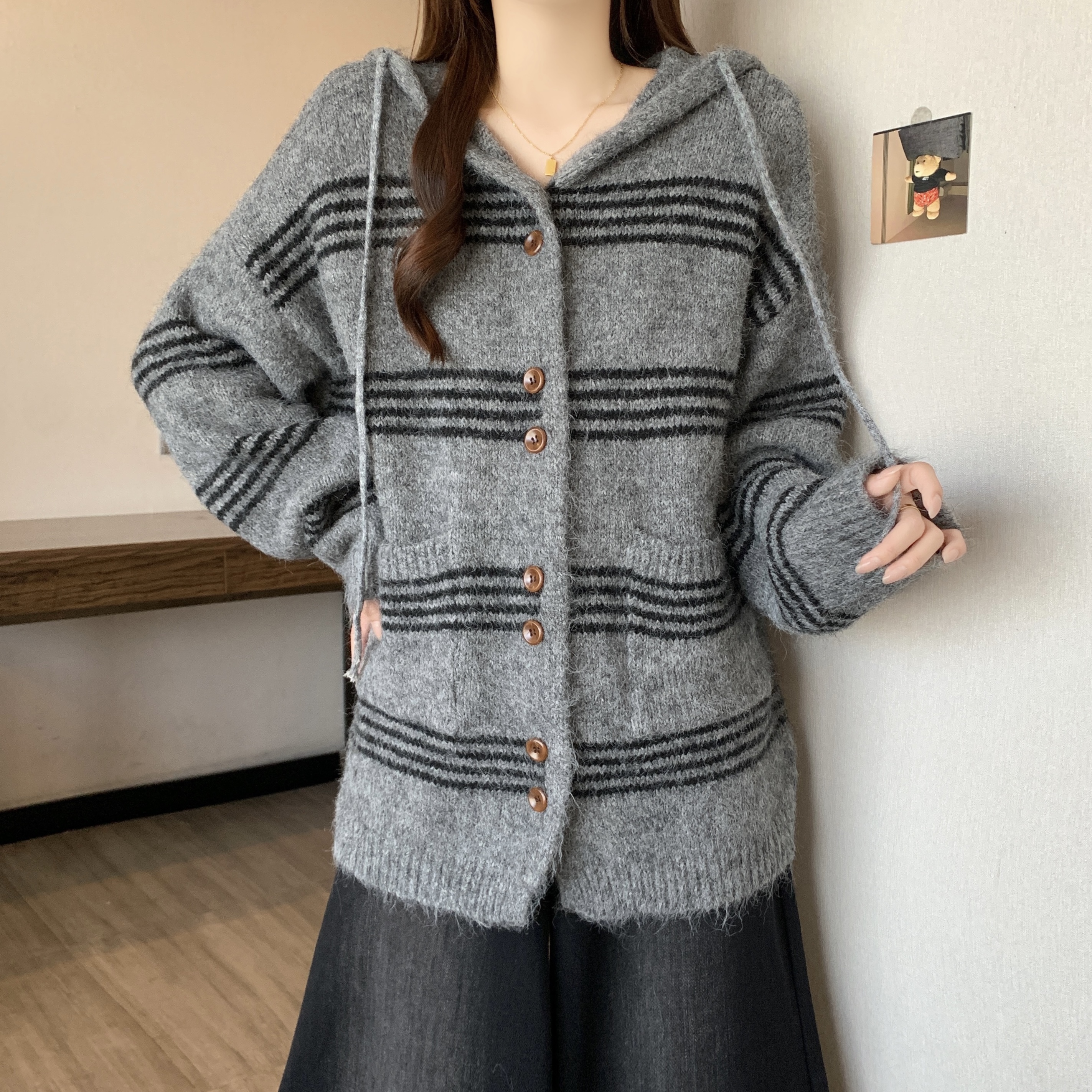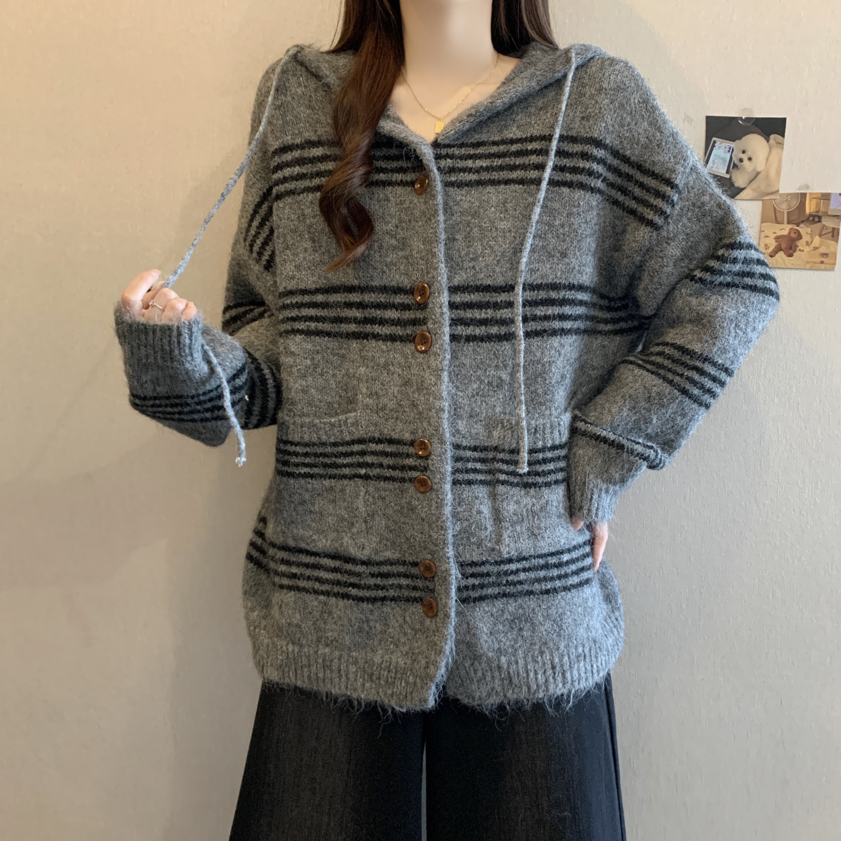 MY14278# 学院风韩系慵懒设计感毛衣外套条纹连帽长袖针织上衣女裝貨源服裝批發