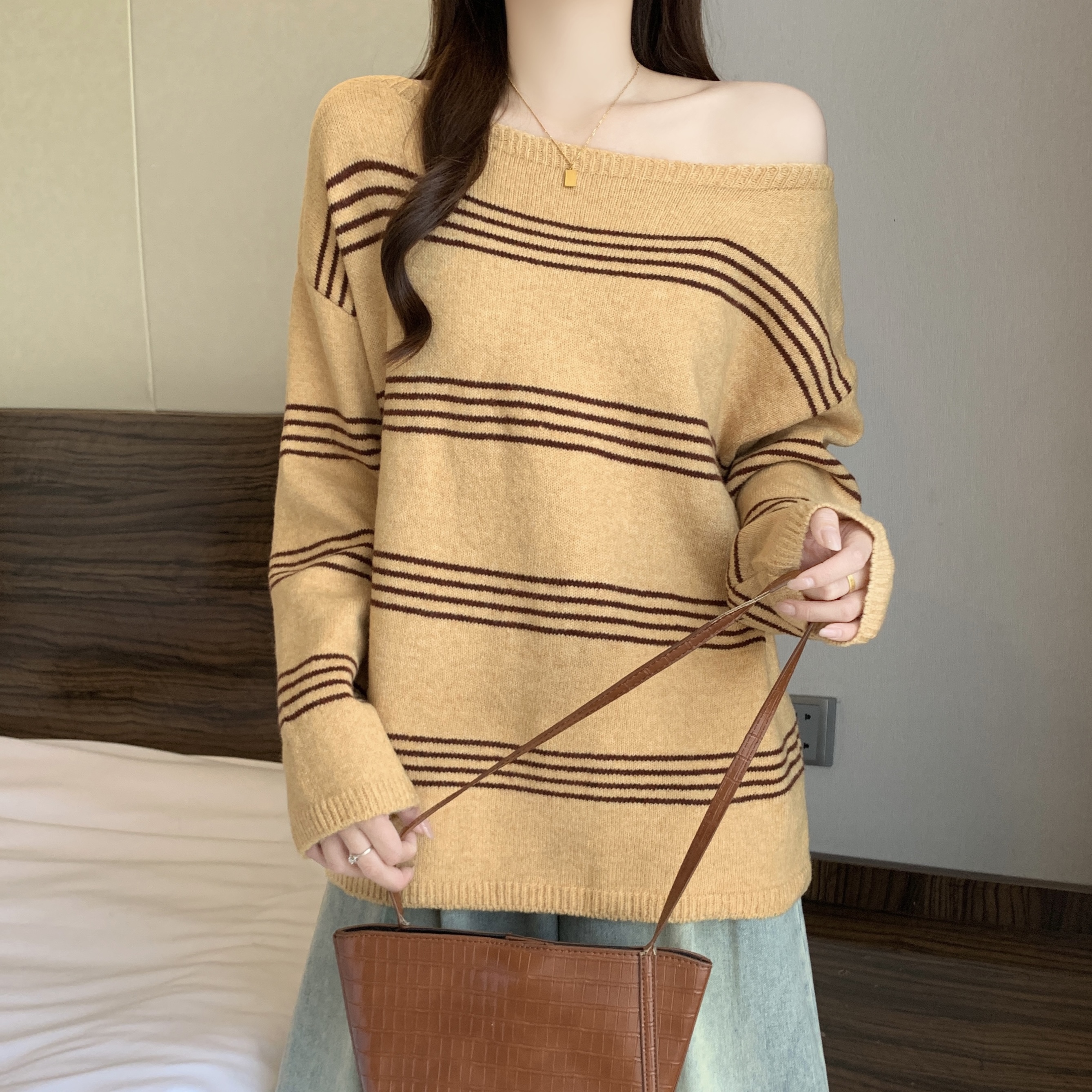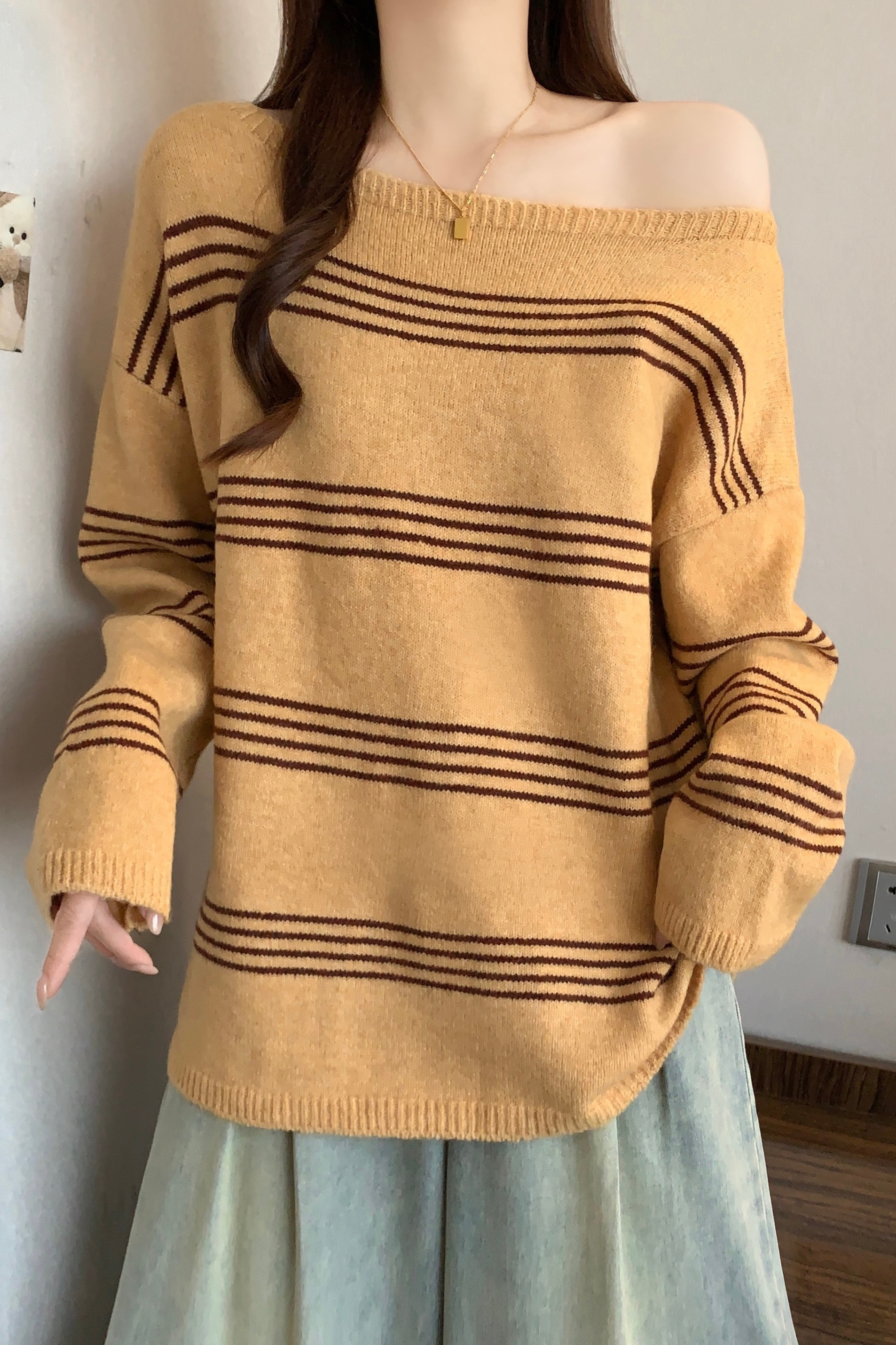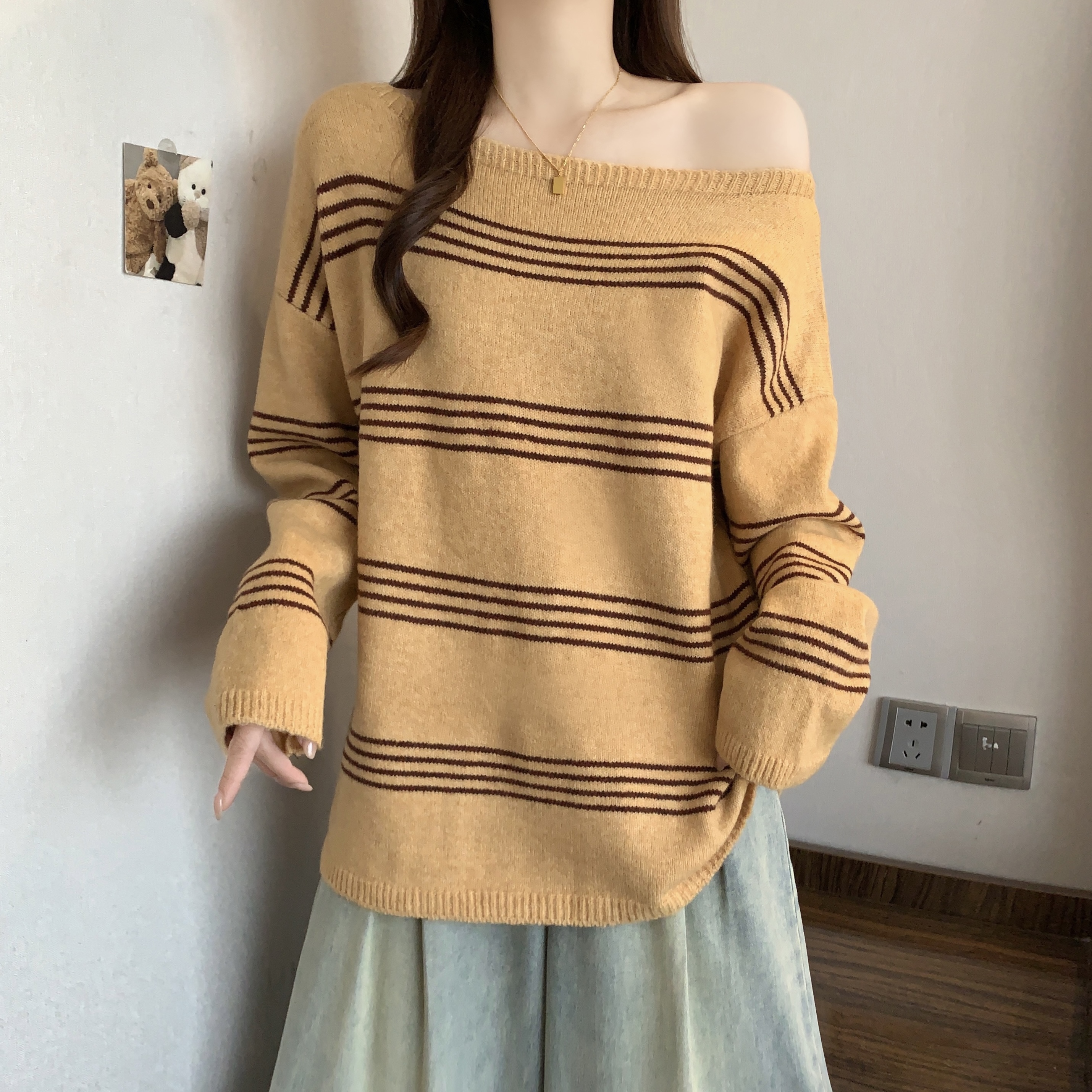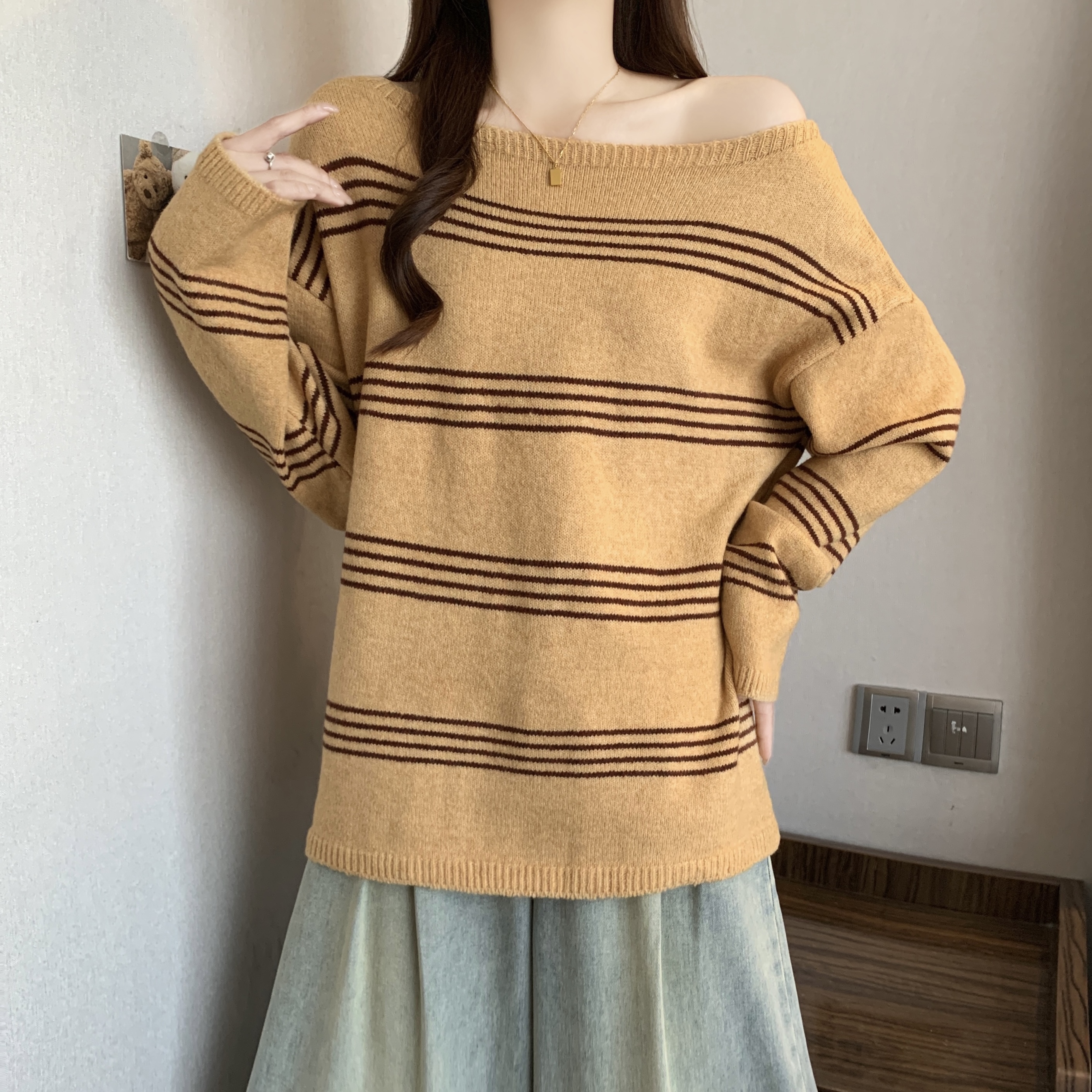 MY14279# 韩系单肩穿搭条纹姜黄色毛衣慵懒宽松休闲上衣女裝貨源服裝批發