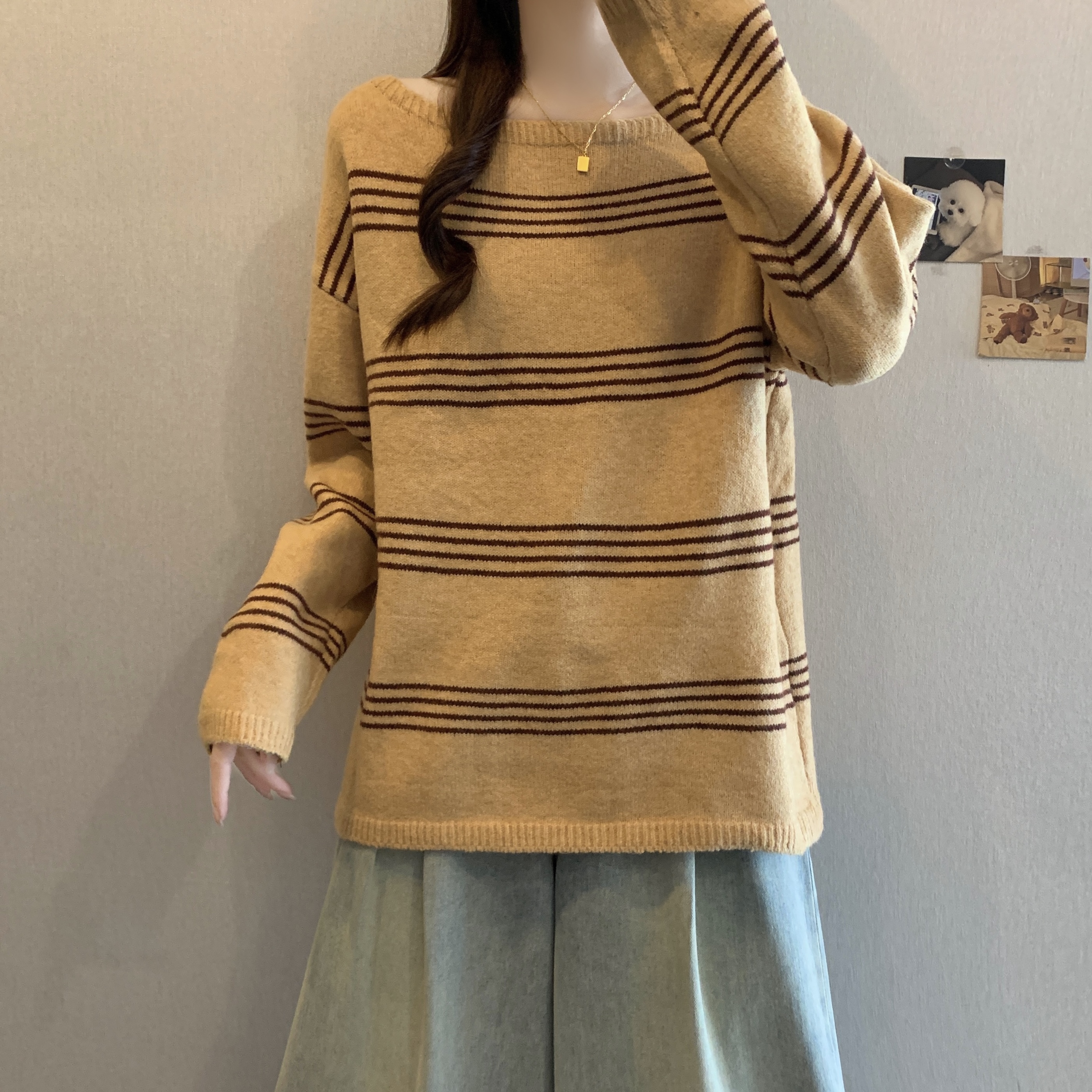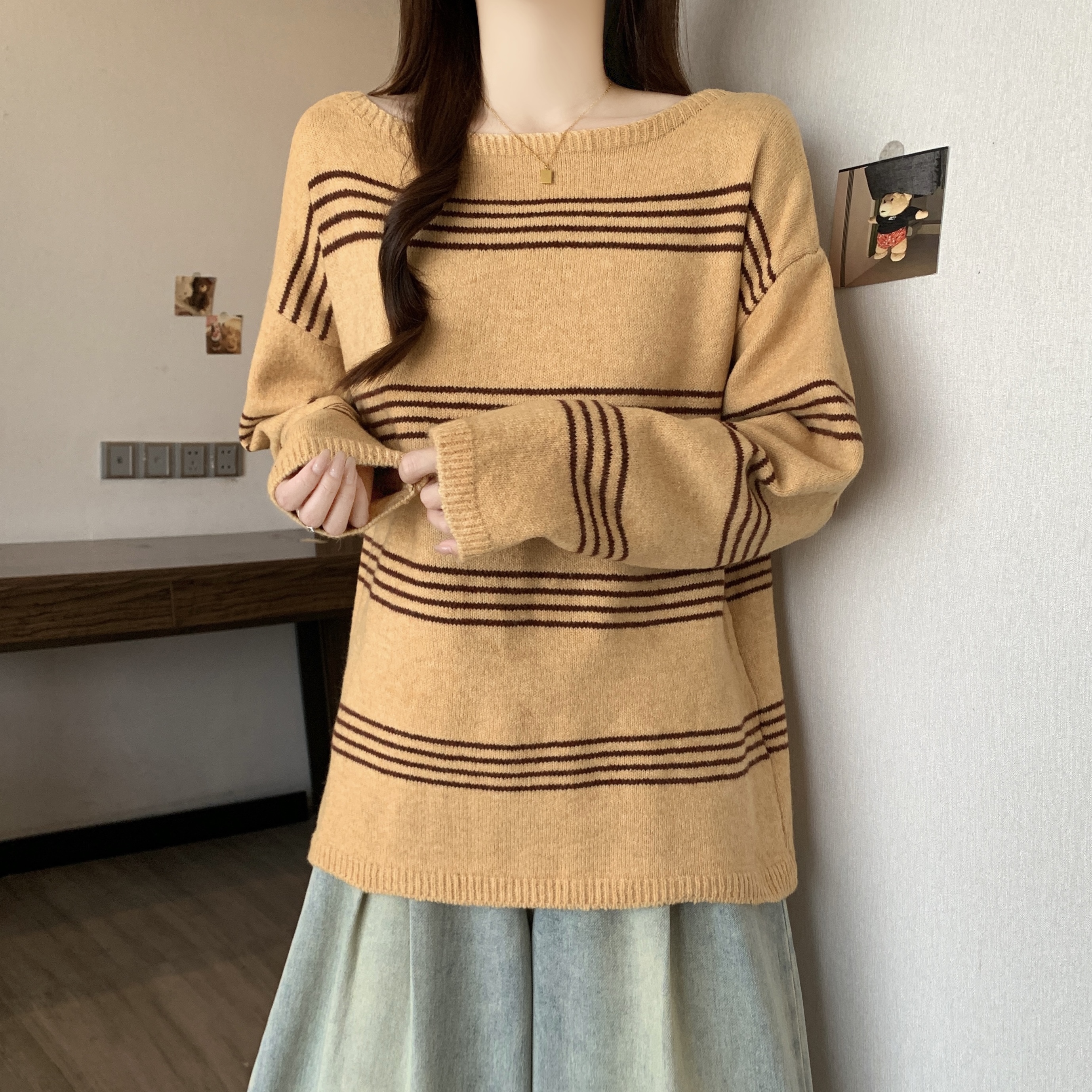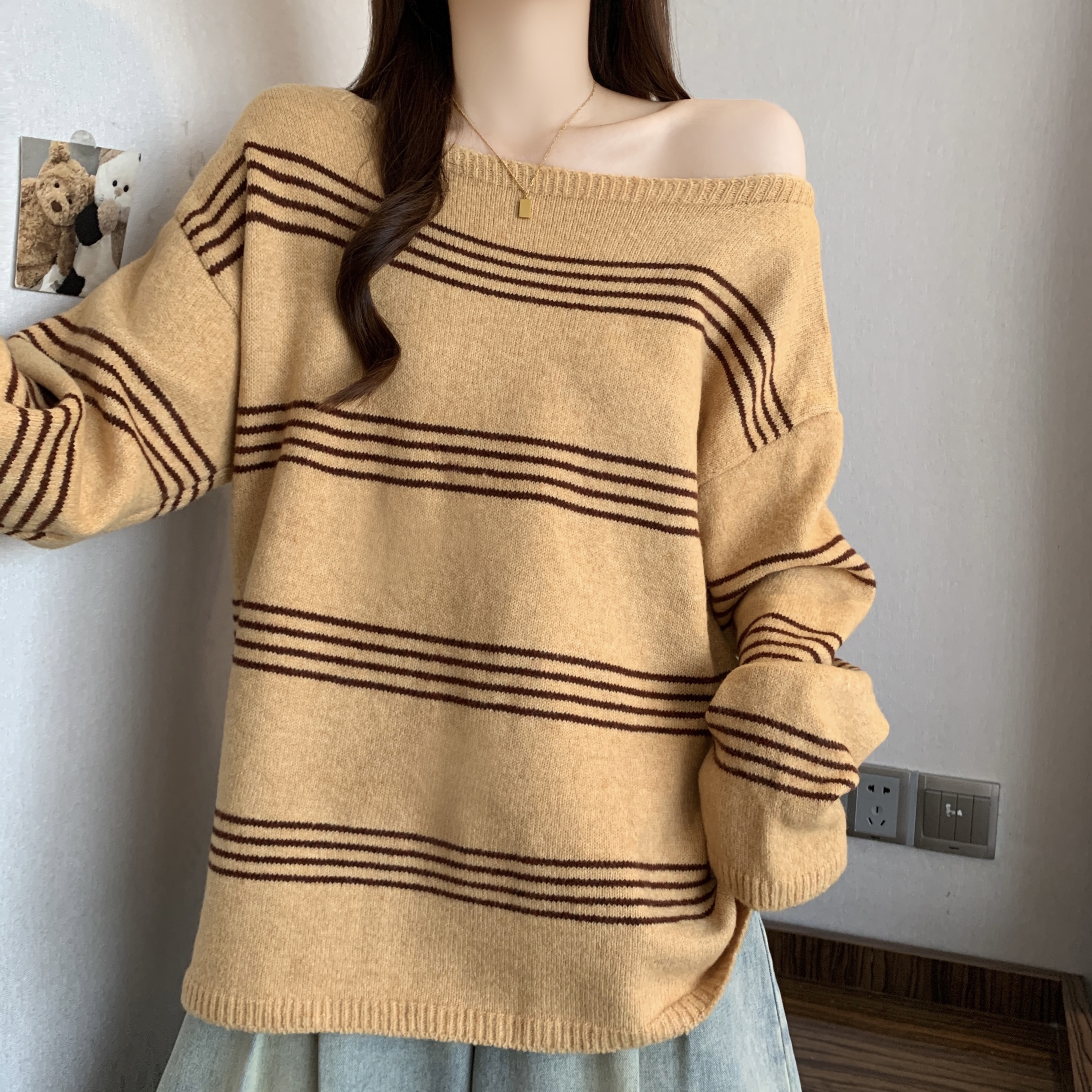 MY14279# 韩系单肩穿搭条纹姜黄色毛衣慵懒宽松休闲上衣女裝貨源服裝批發