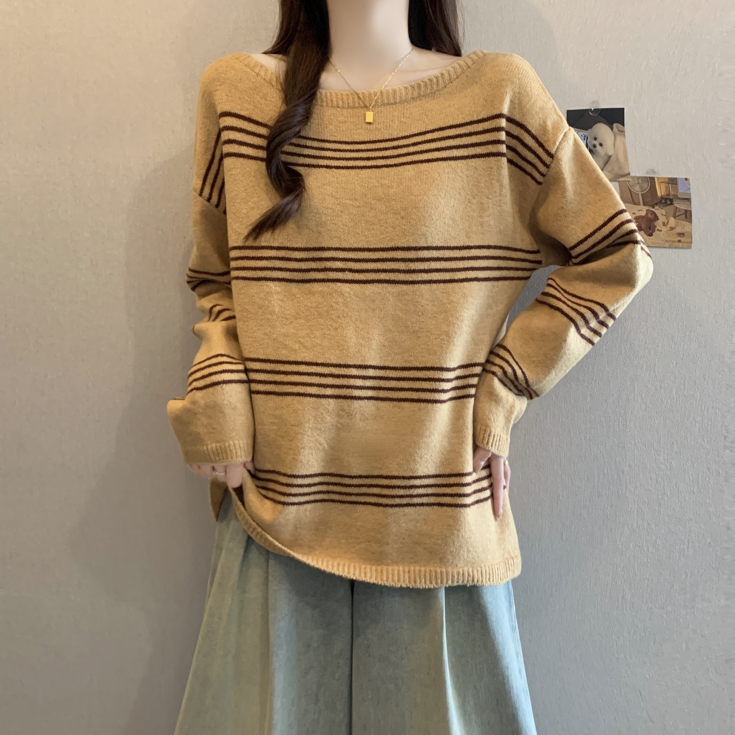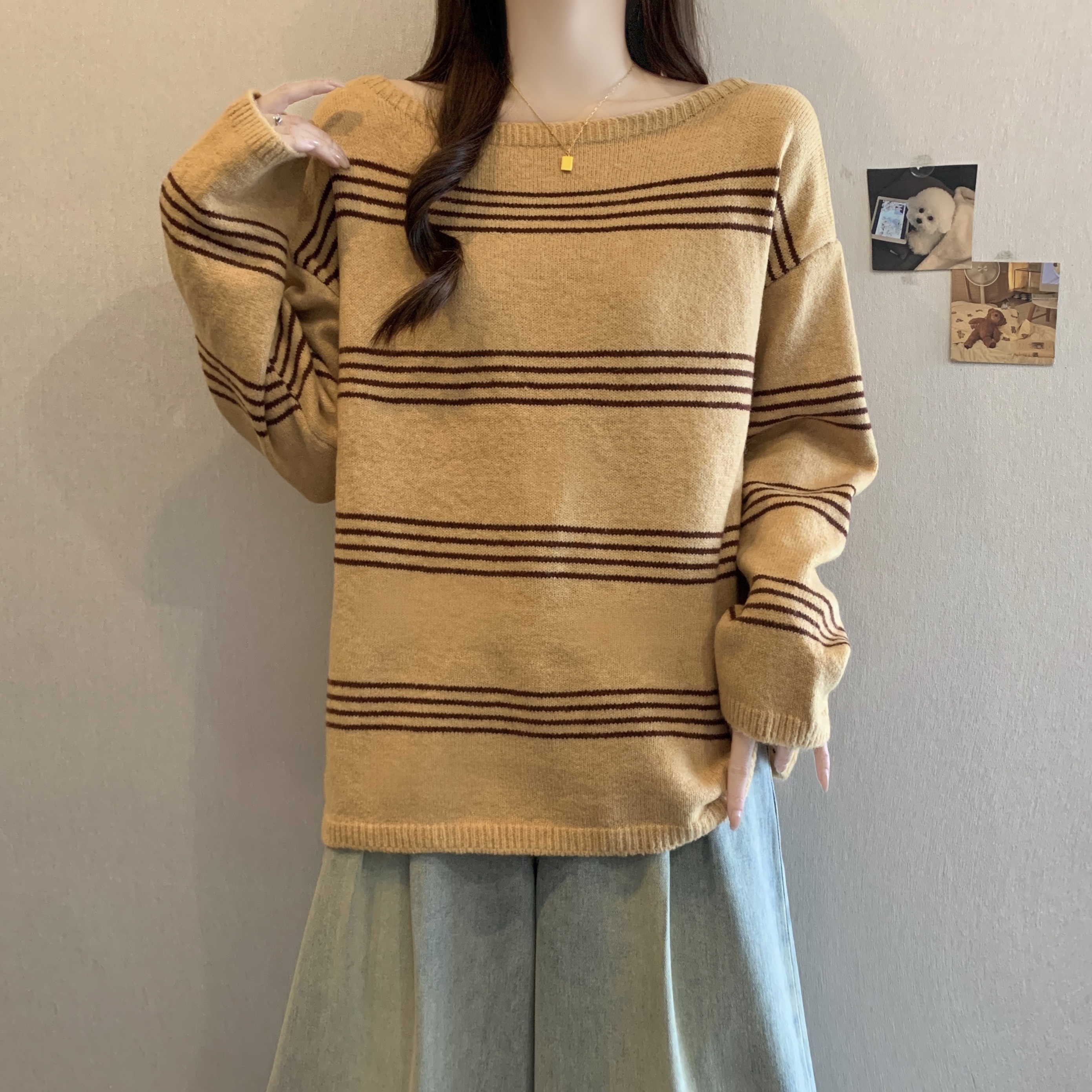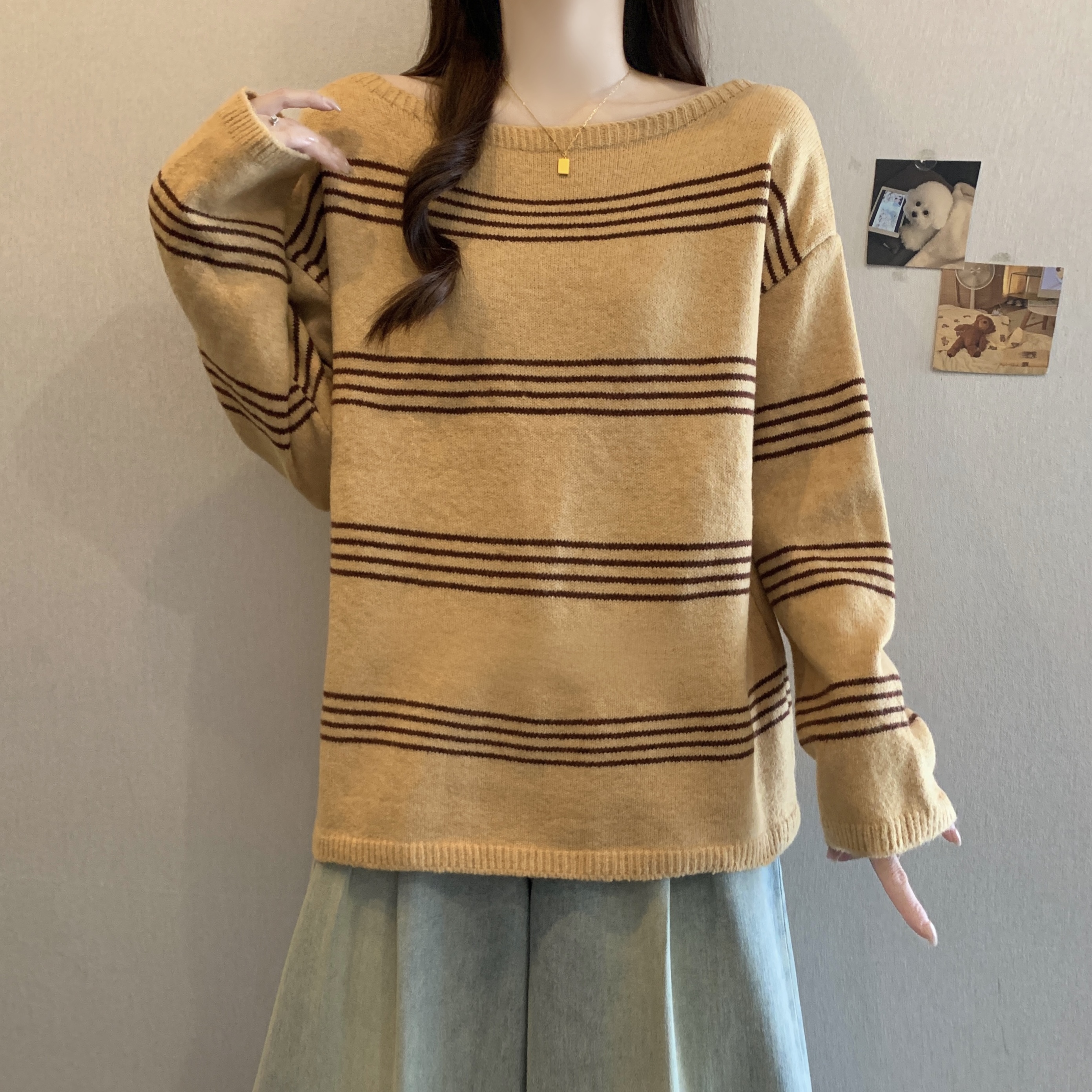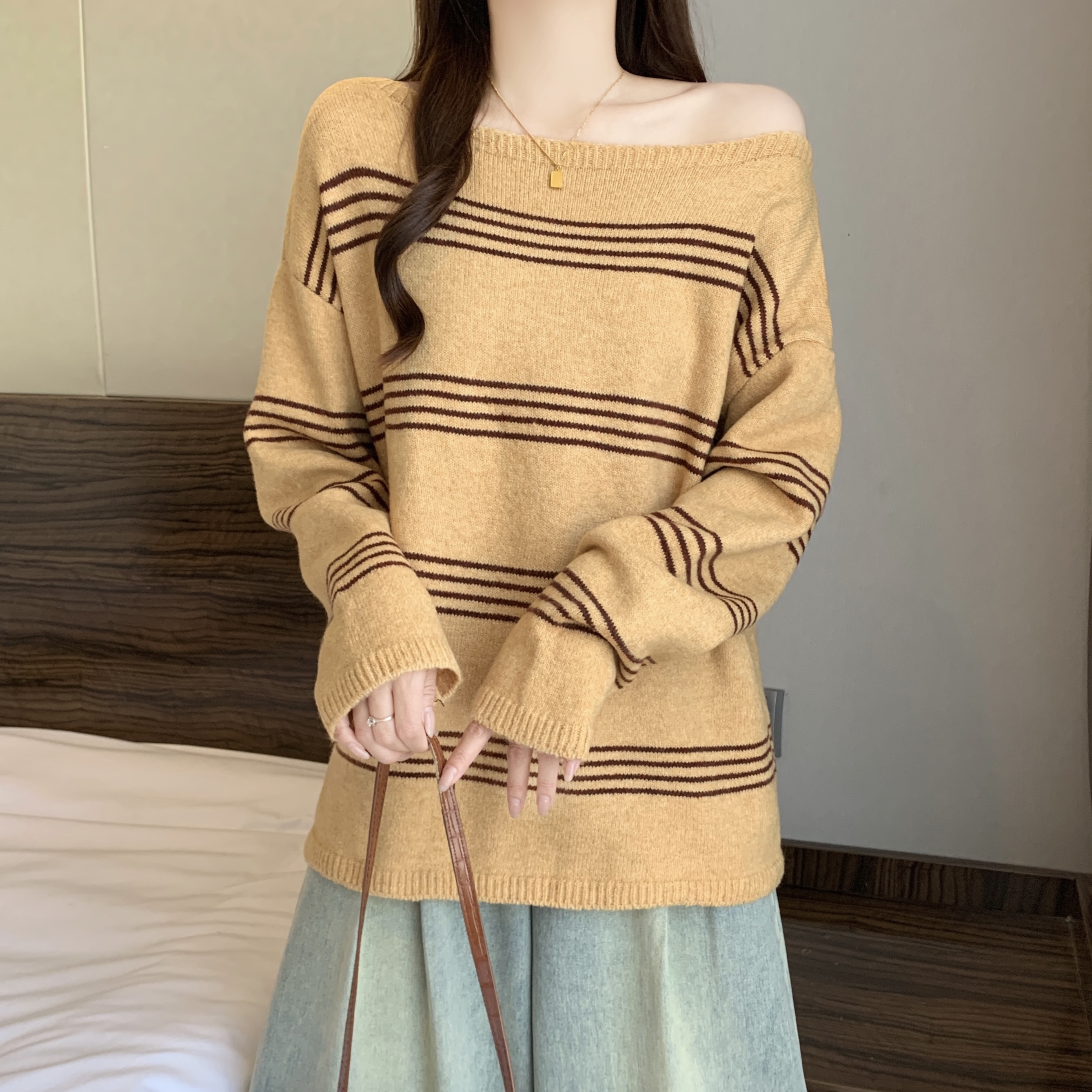 MY14279# 韩系单肩穿搭条纹姜黄色毛衣慵懒宽松休闲上衣女裝貨源服裝批發