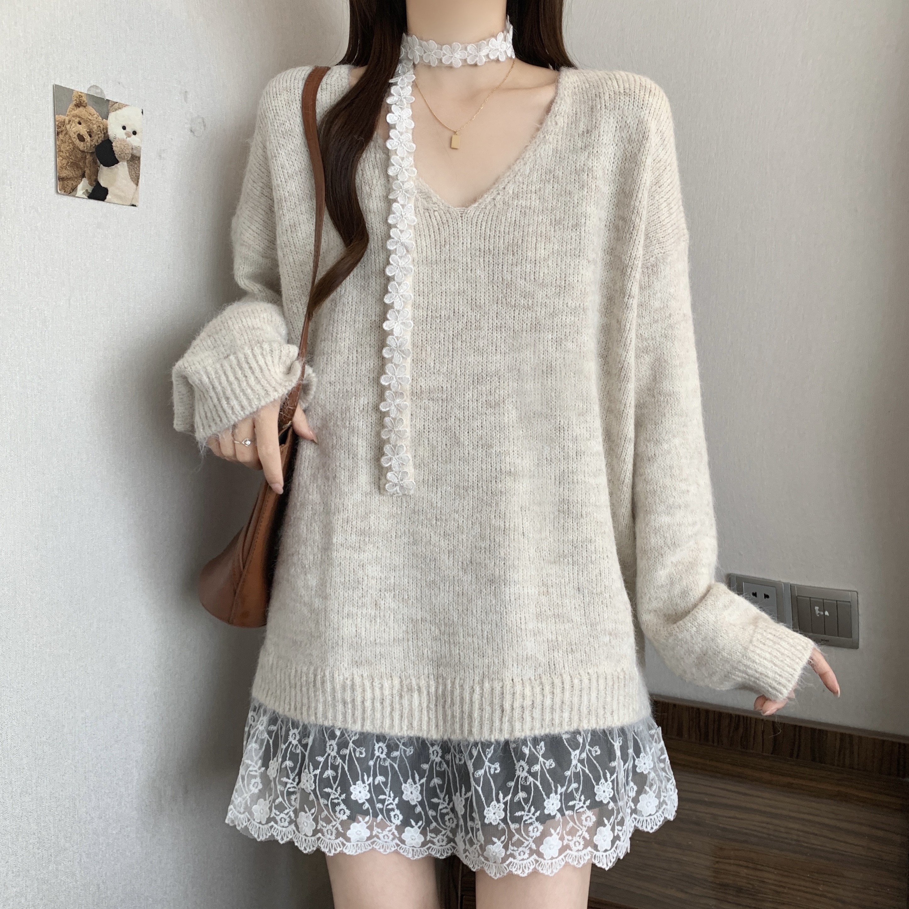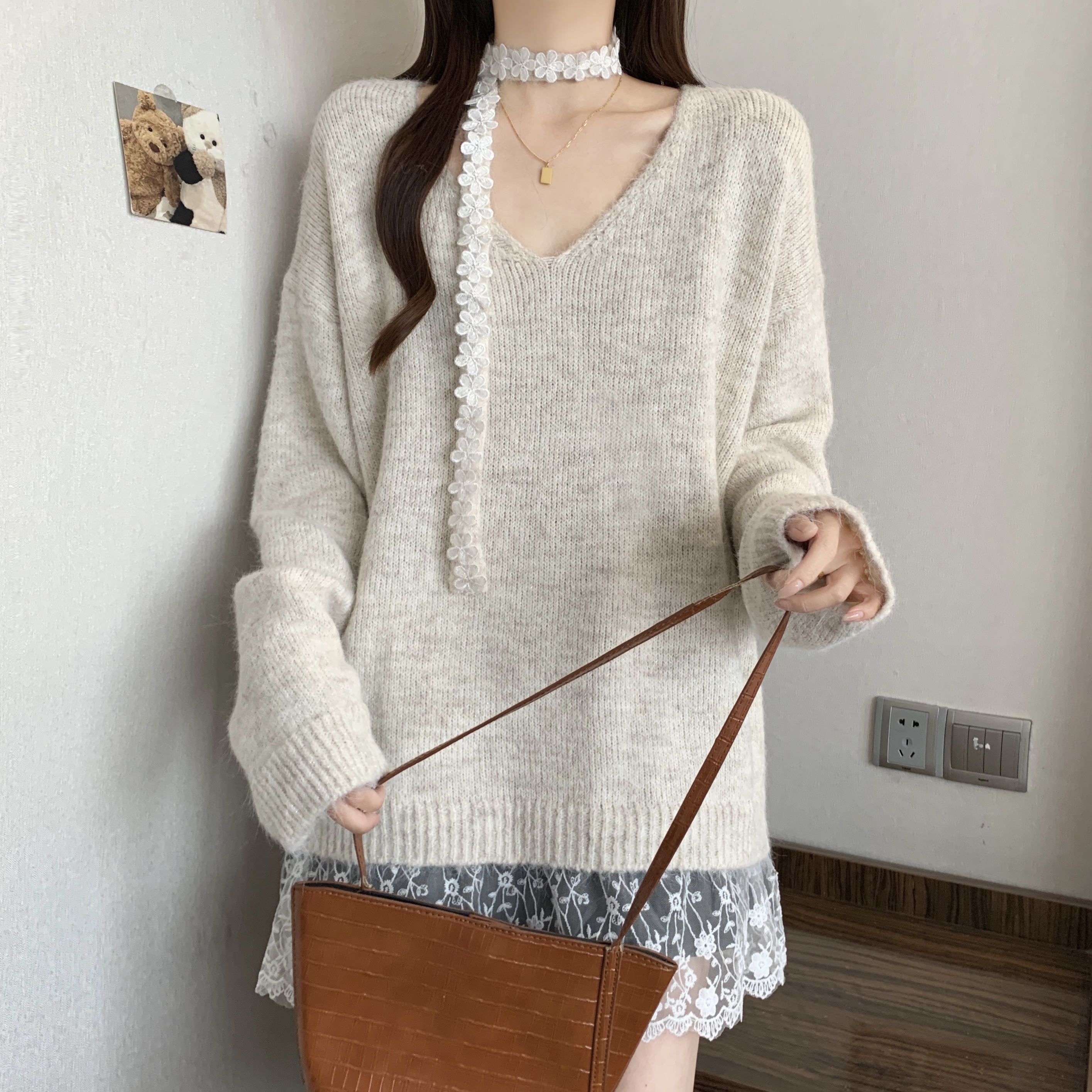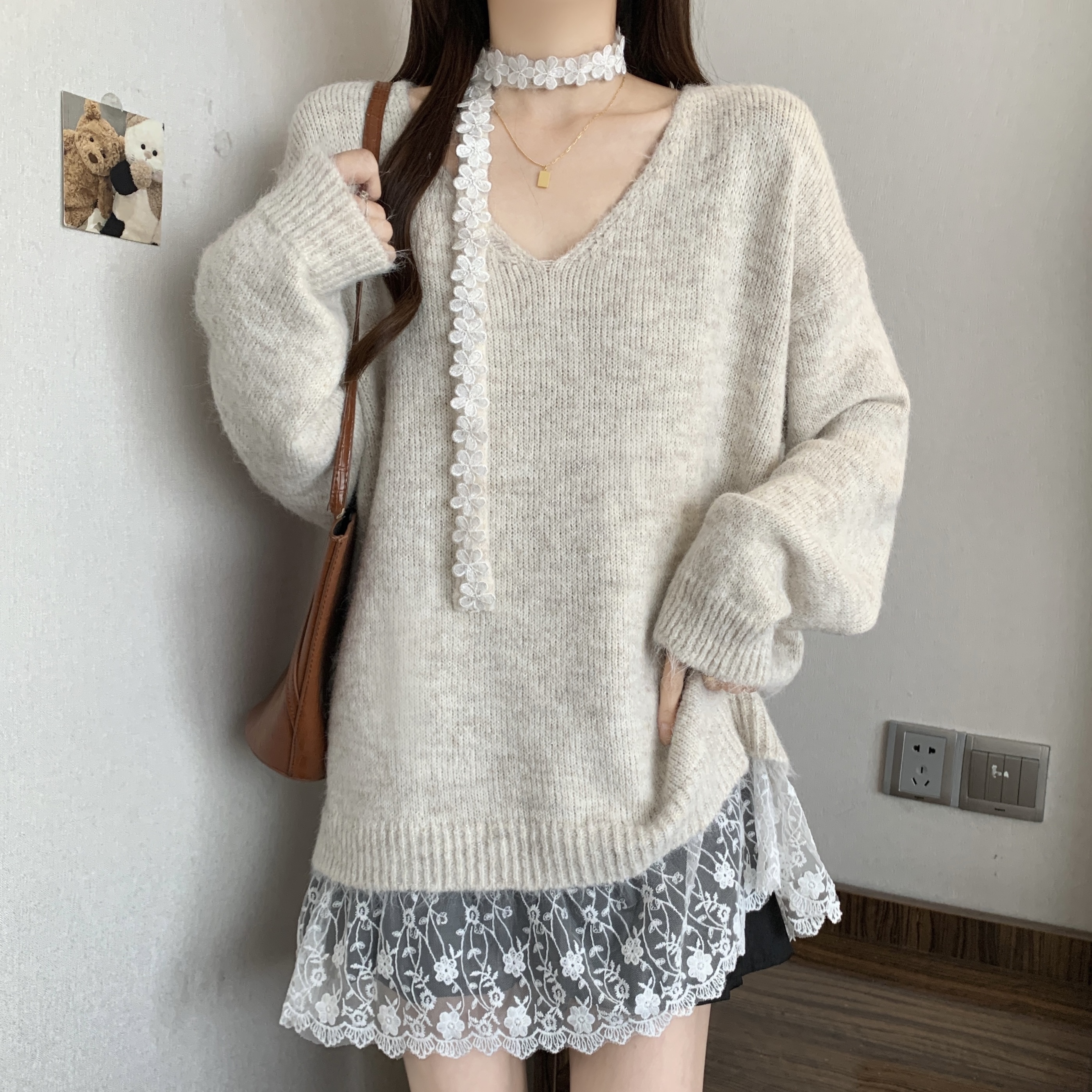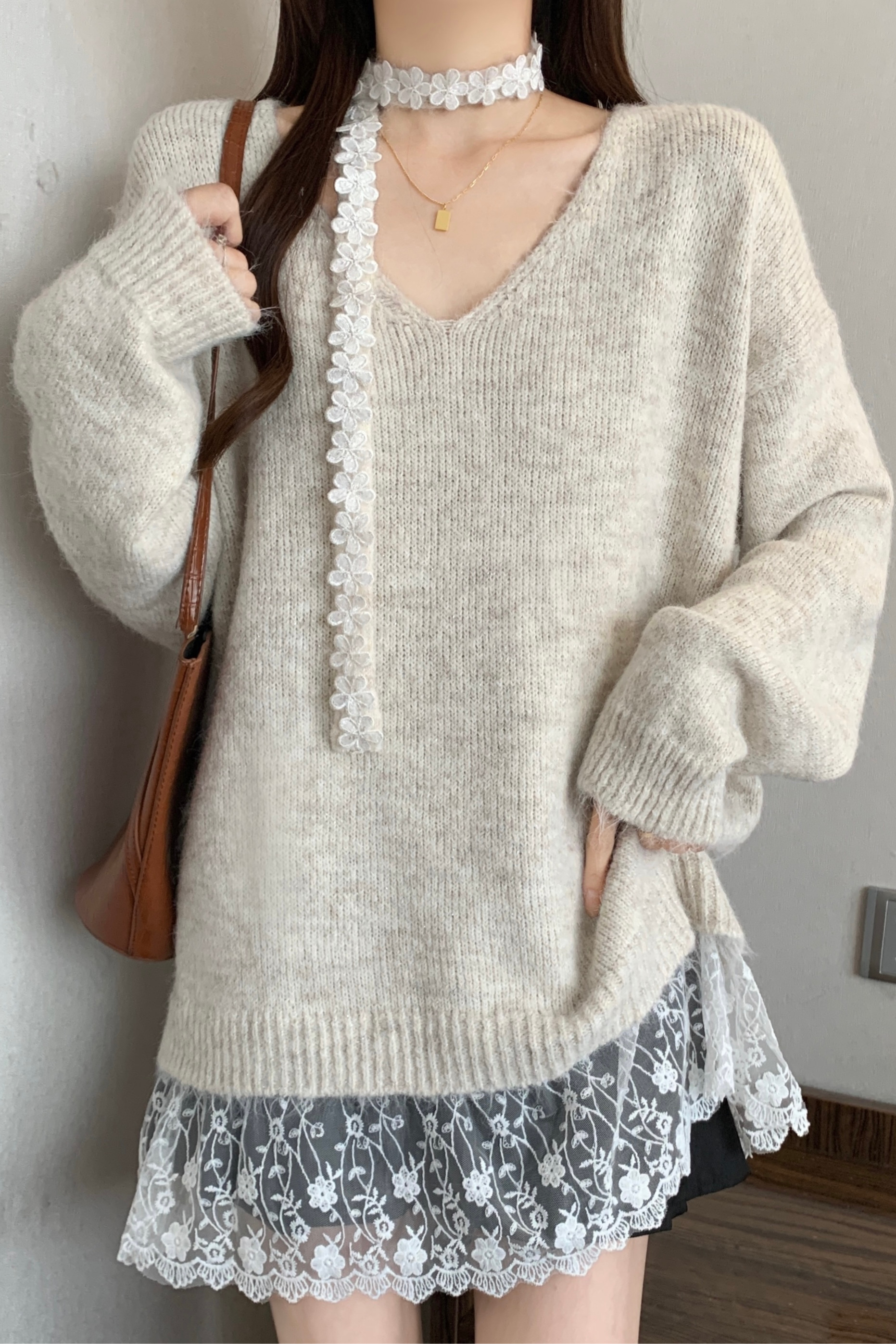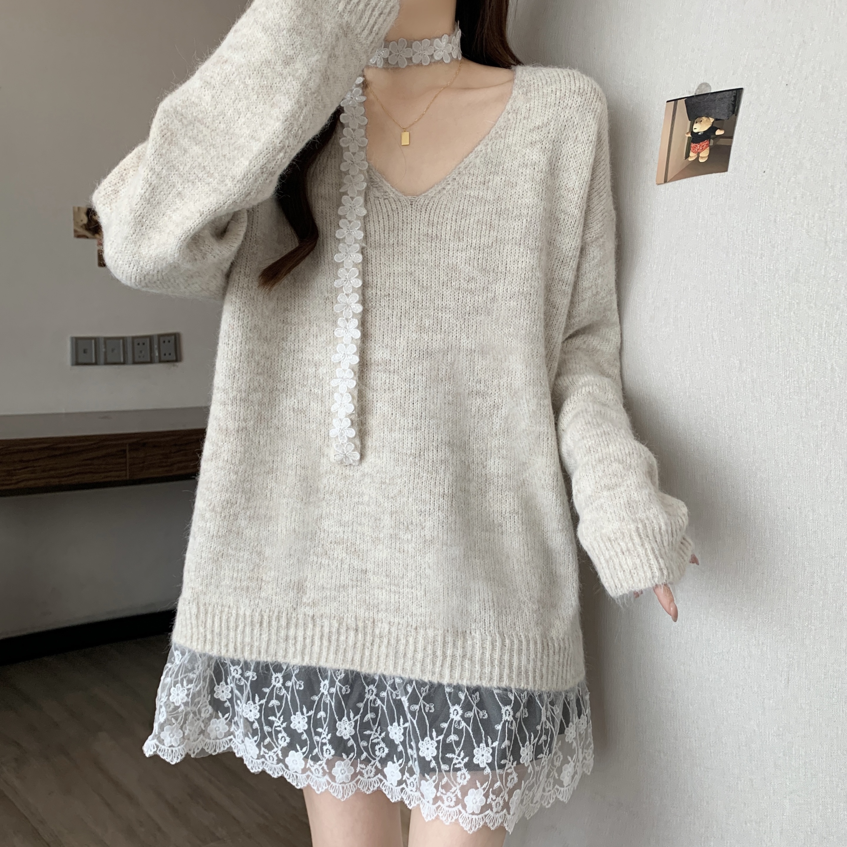 MY14280# 温柔韩版宽松蕾丝拼接V领毛衣慵懒高级感内搭针织上衣女裝貨源服裝批發