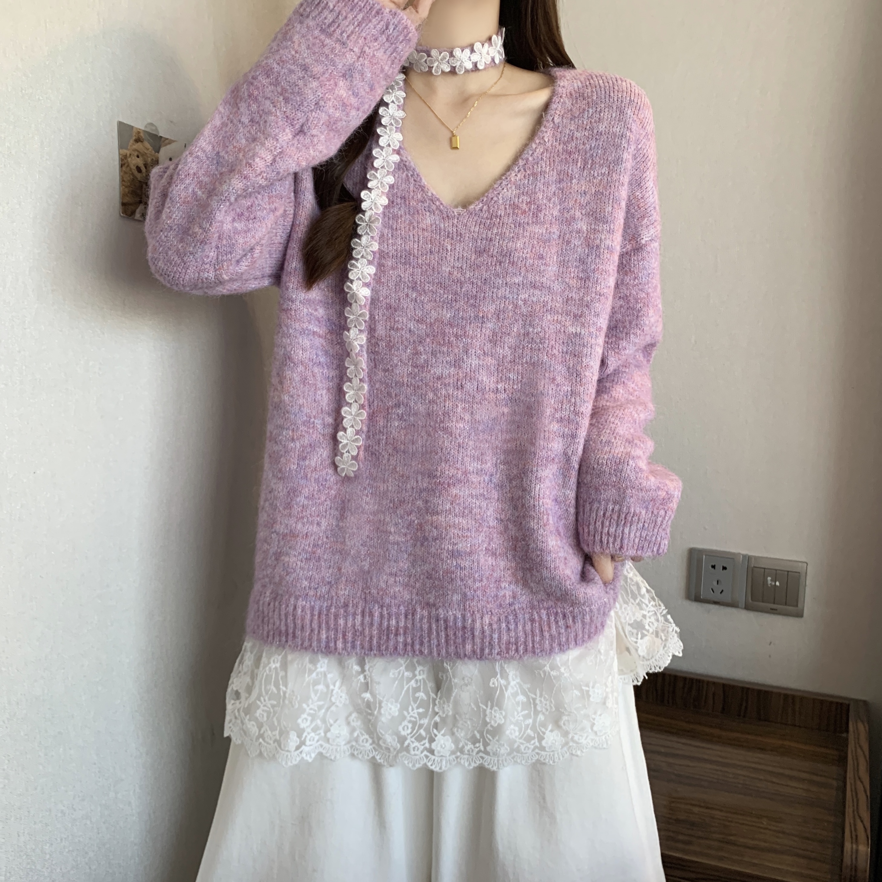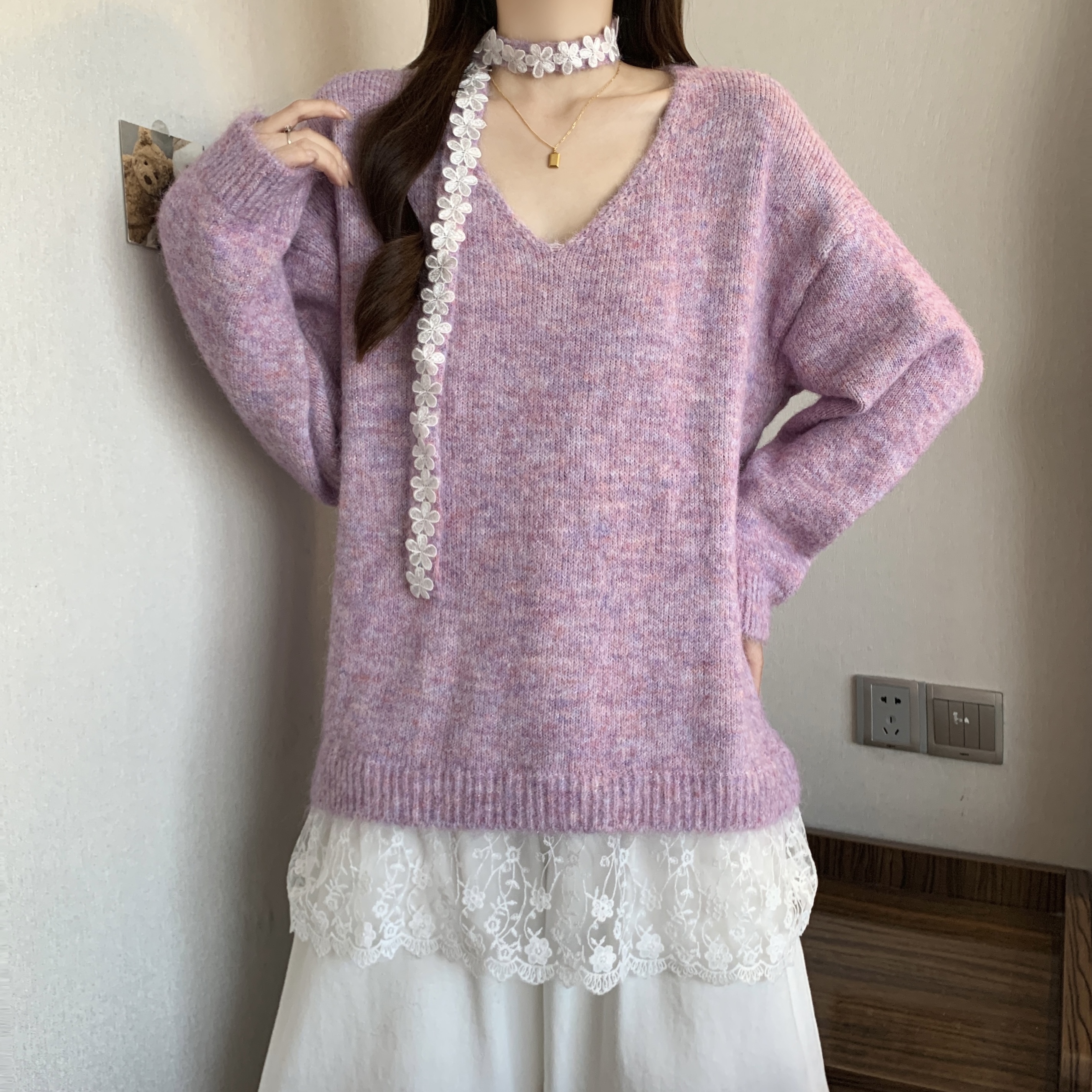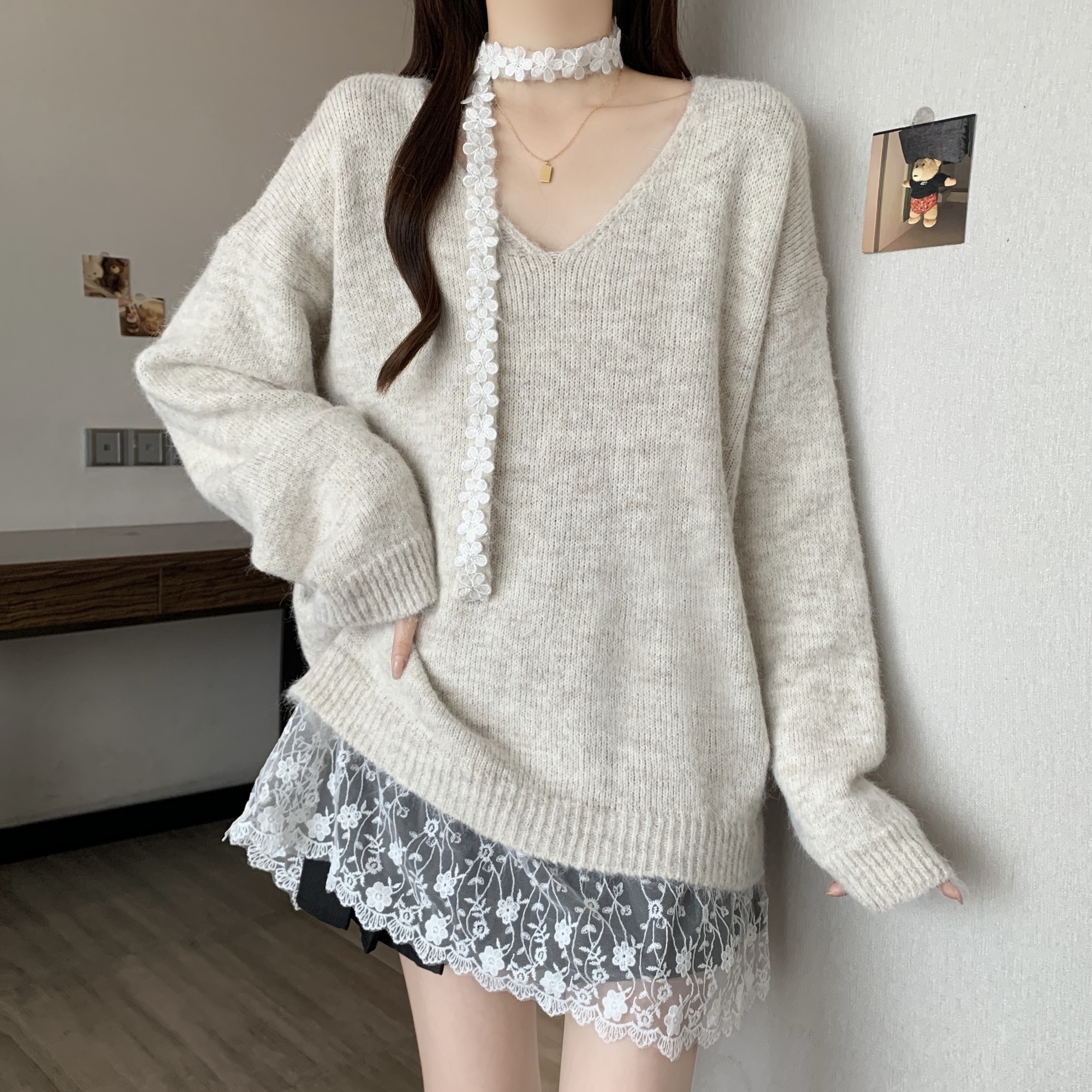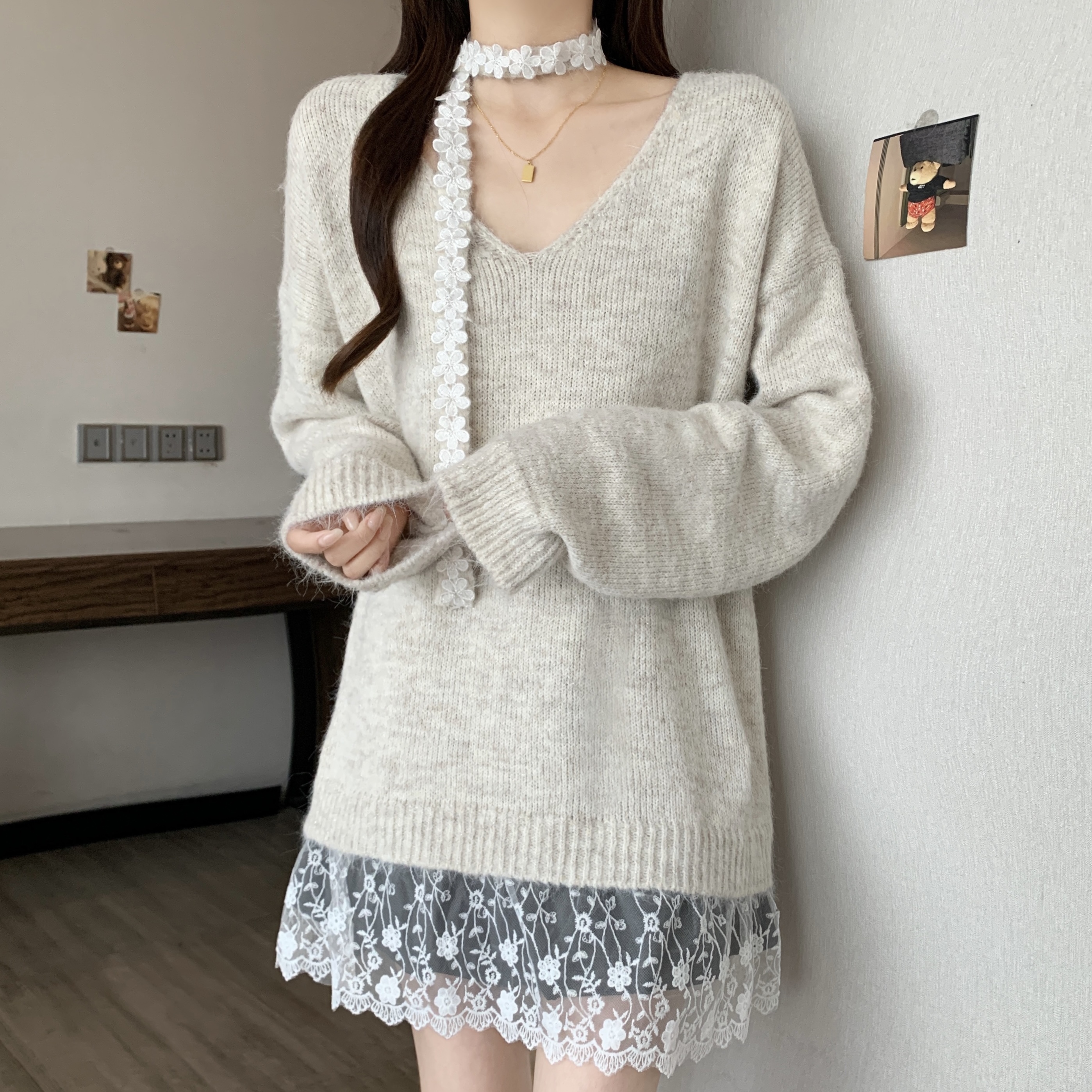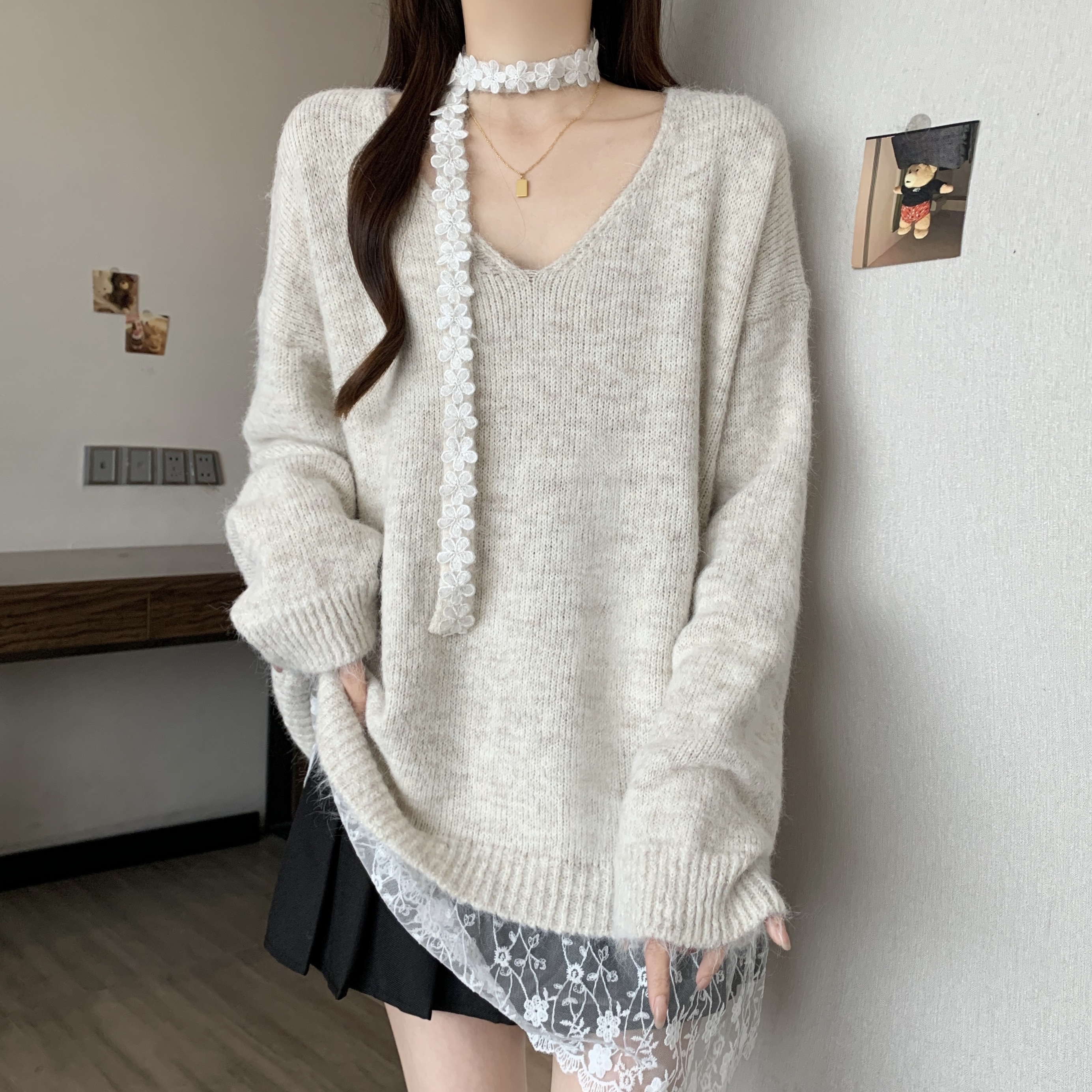 MY14280# 温柔韩版宽松蕾丝拼接V领毛衣慵懒高级感内搭针织上衣女裝貨源服裝批發