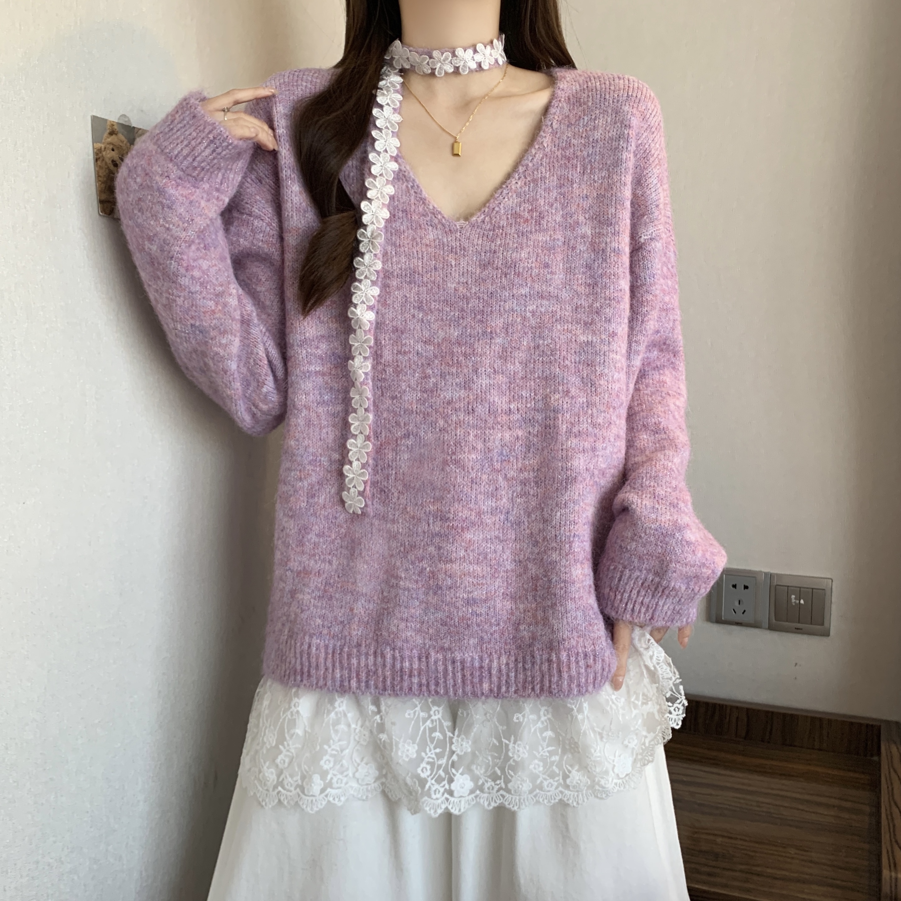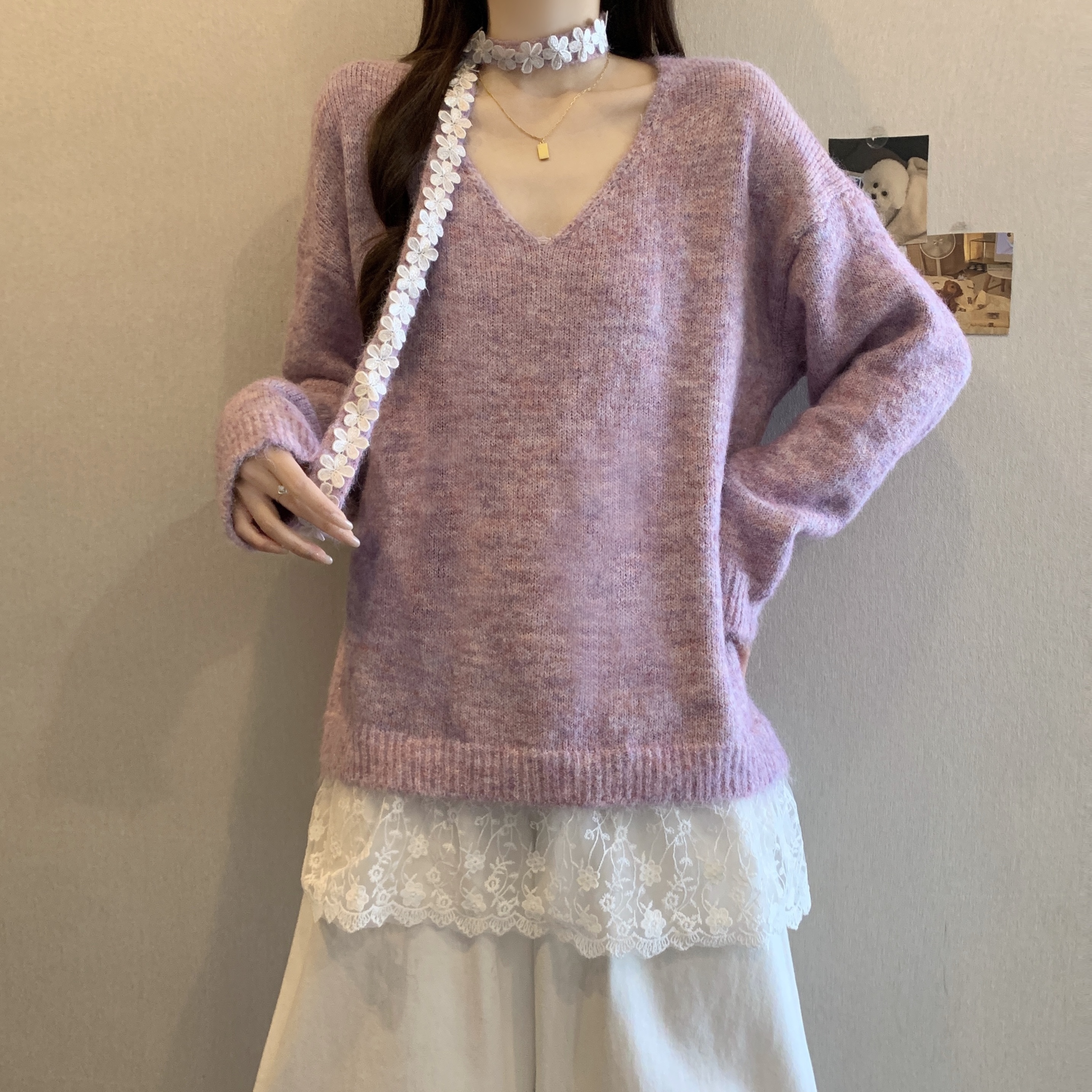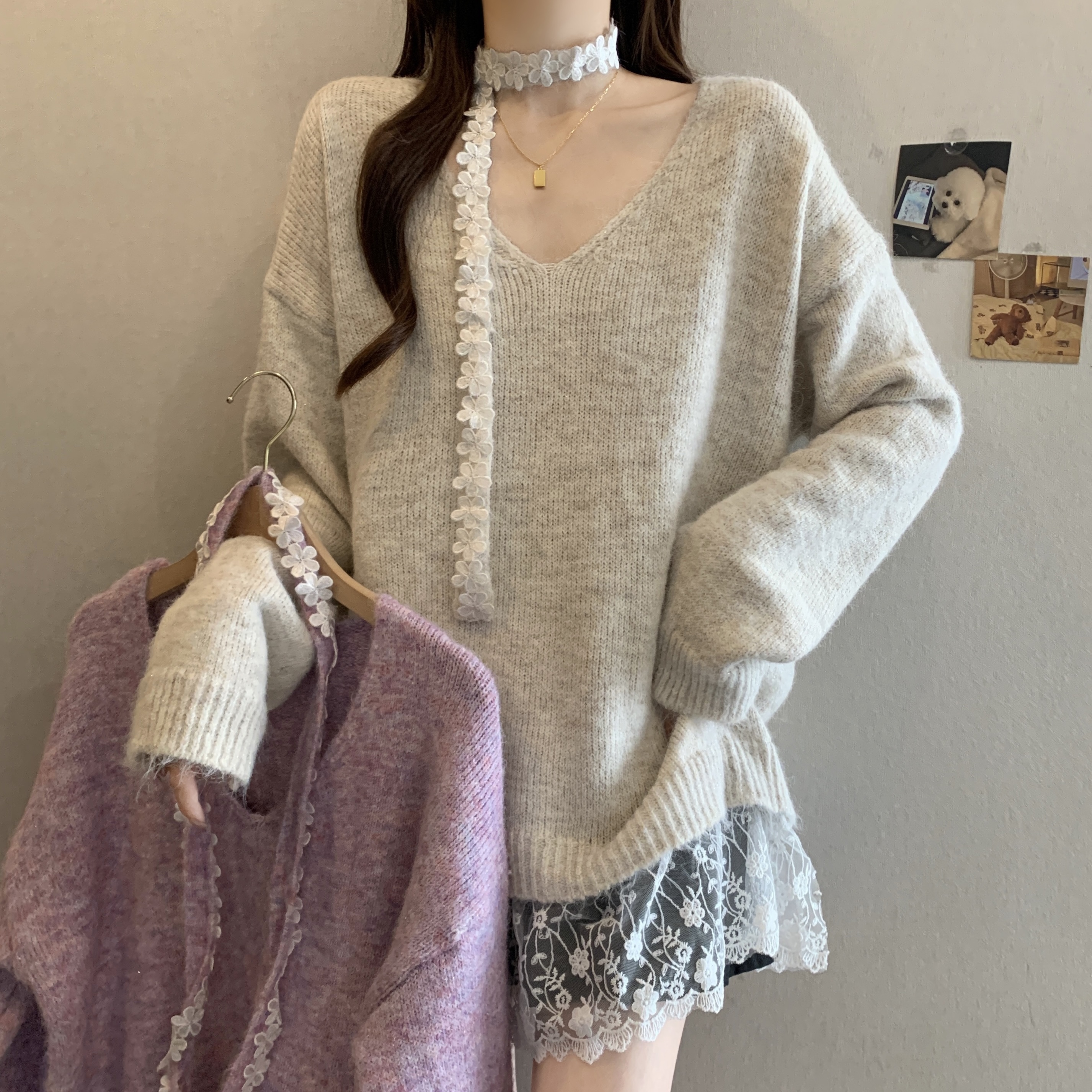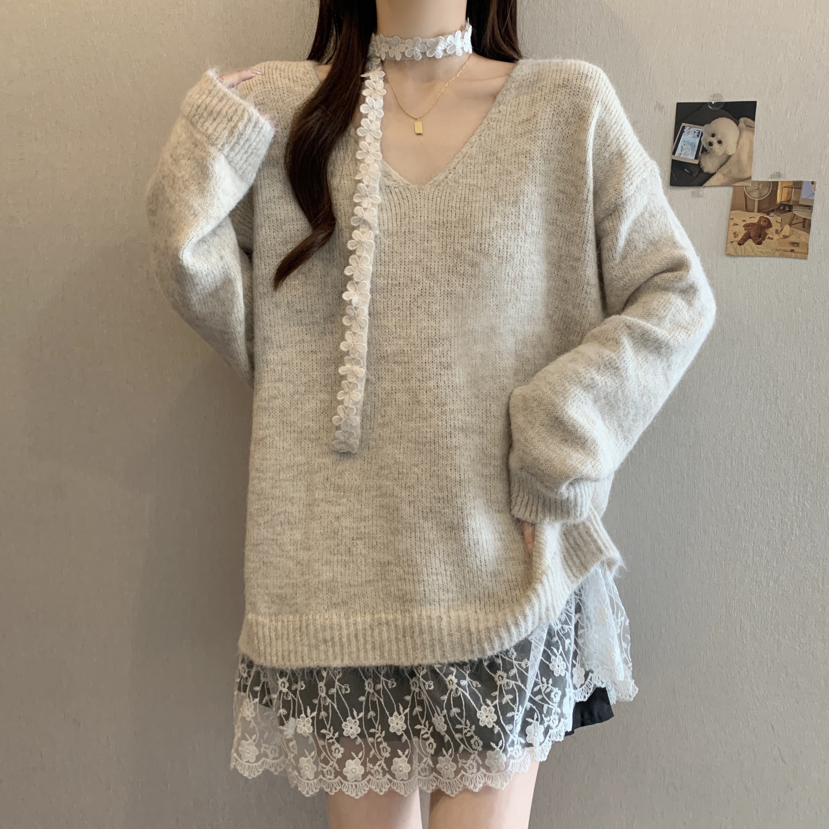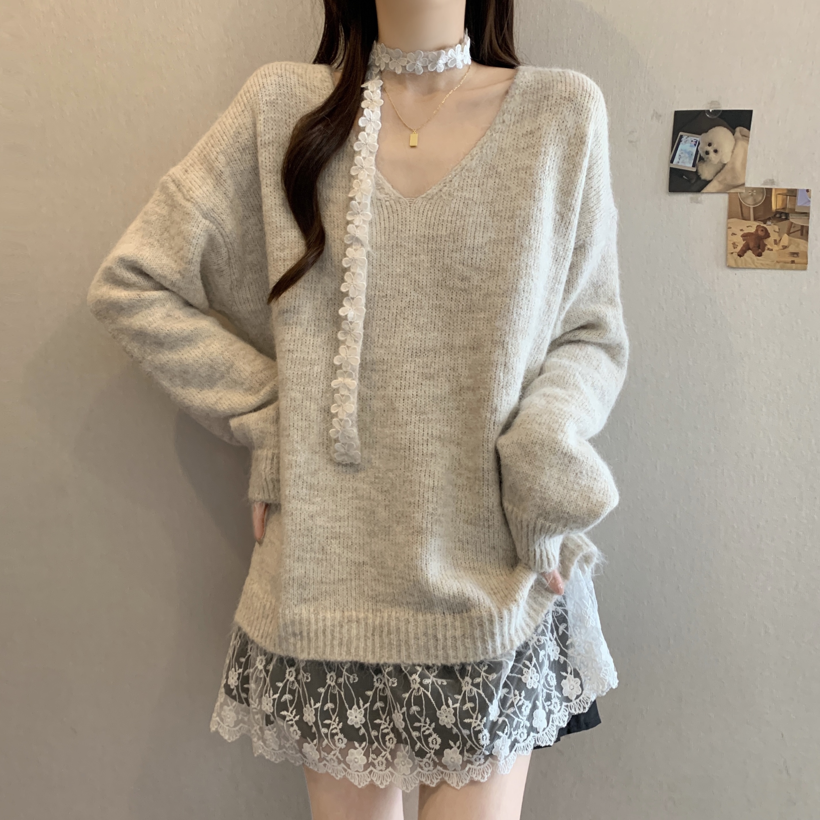 MY14280# 温柔韩版宽松蕾丝拼接V领毛衣慵懒高级感内搭针织上衣女裝貨源服裝批發