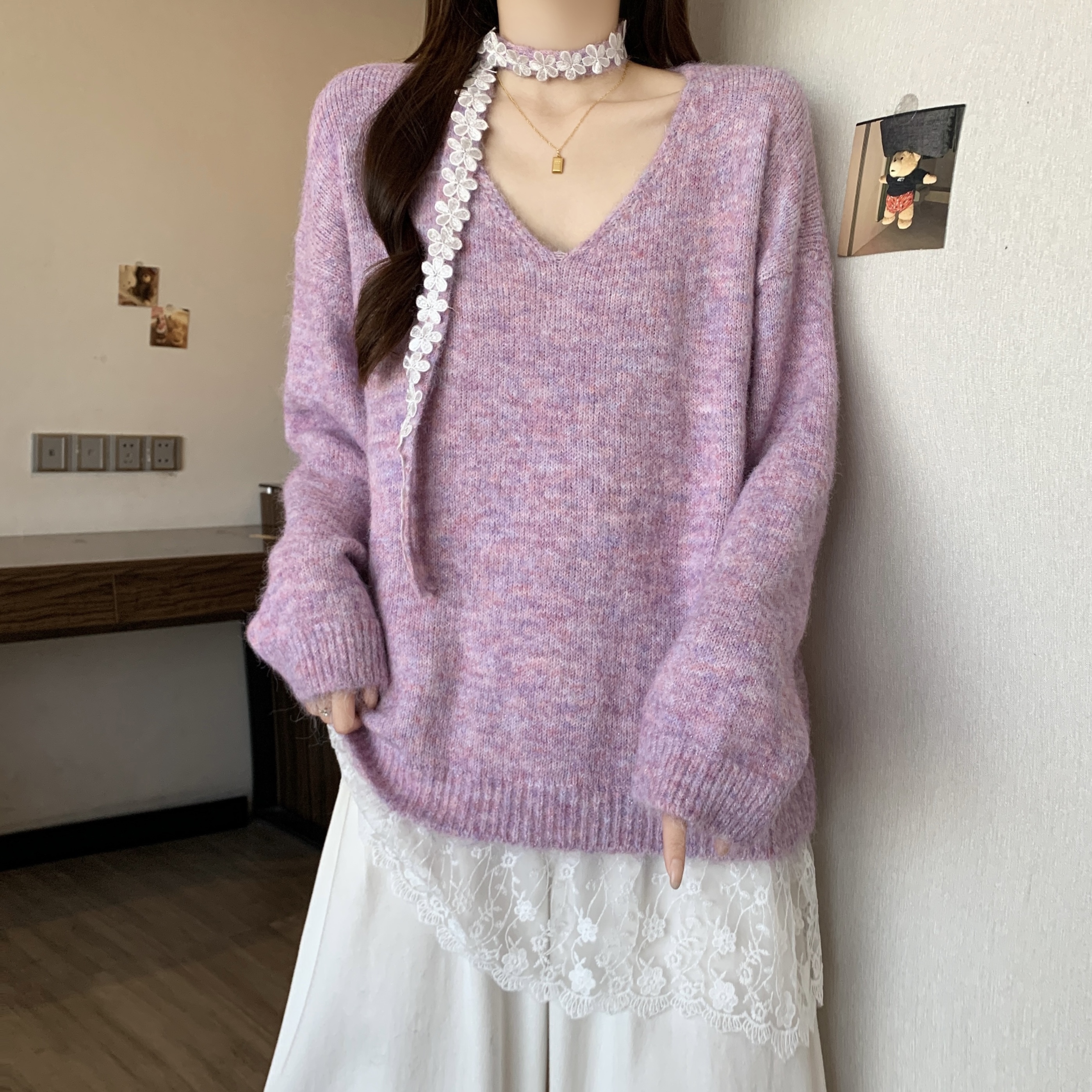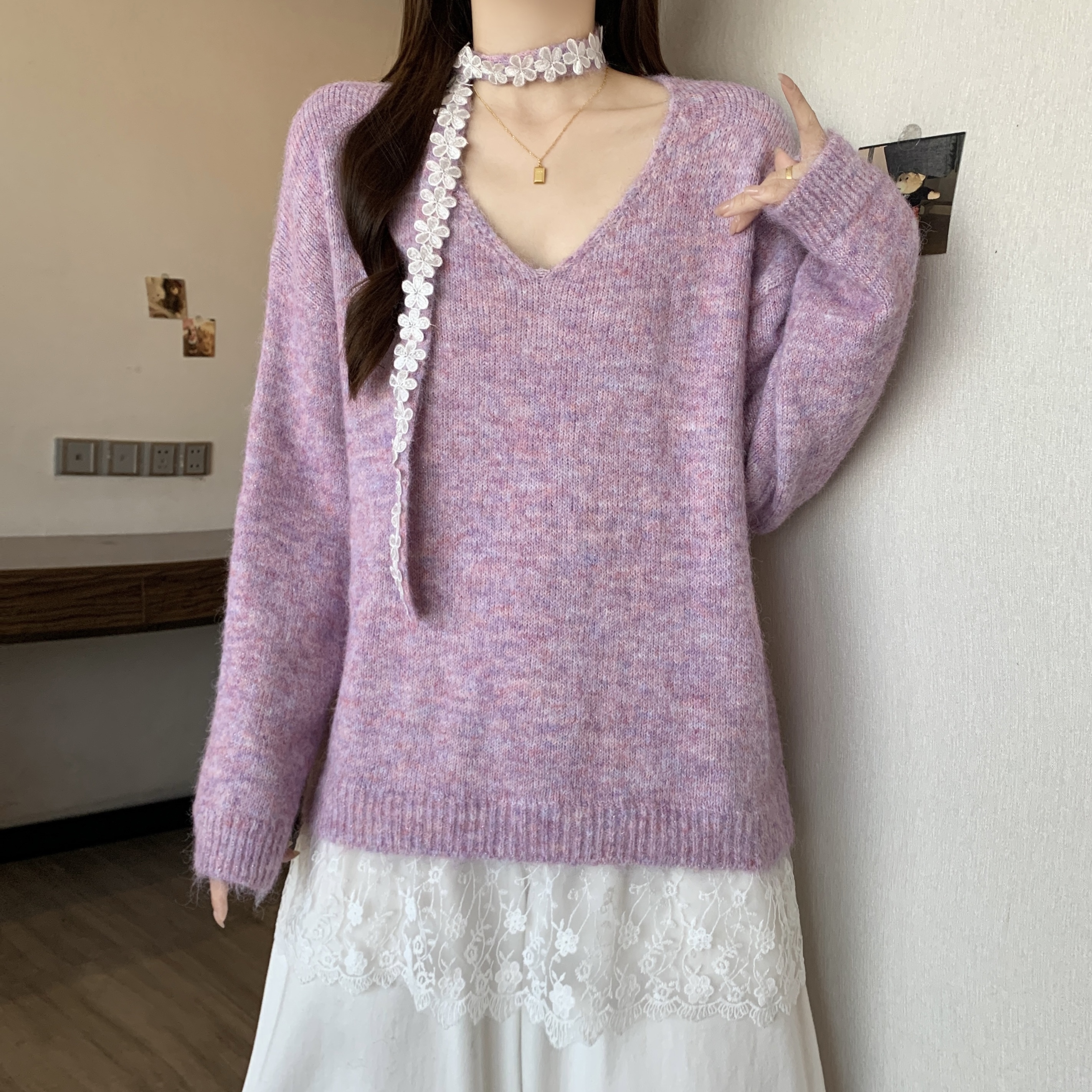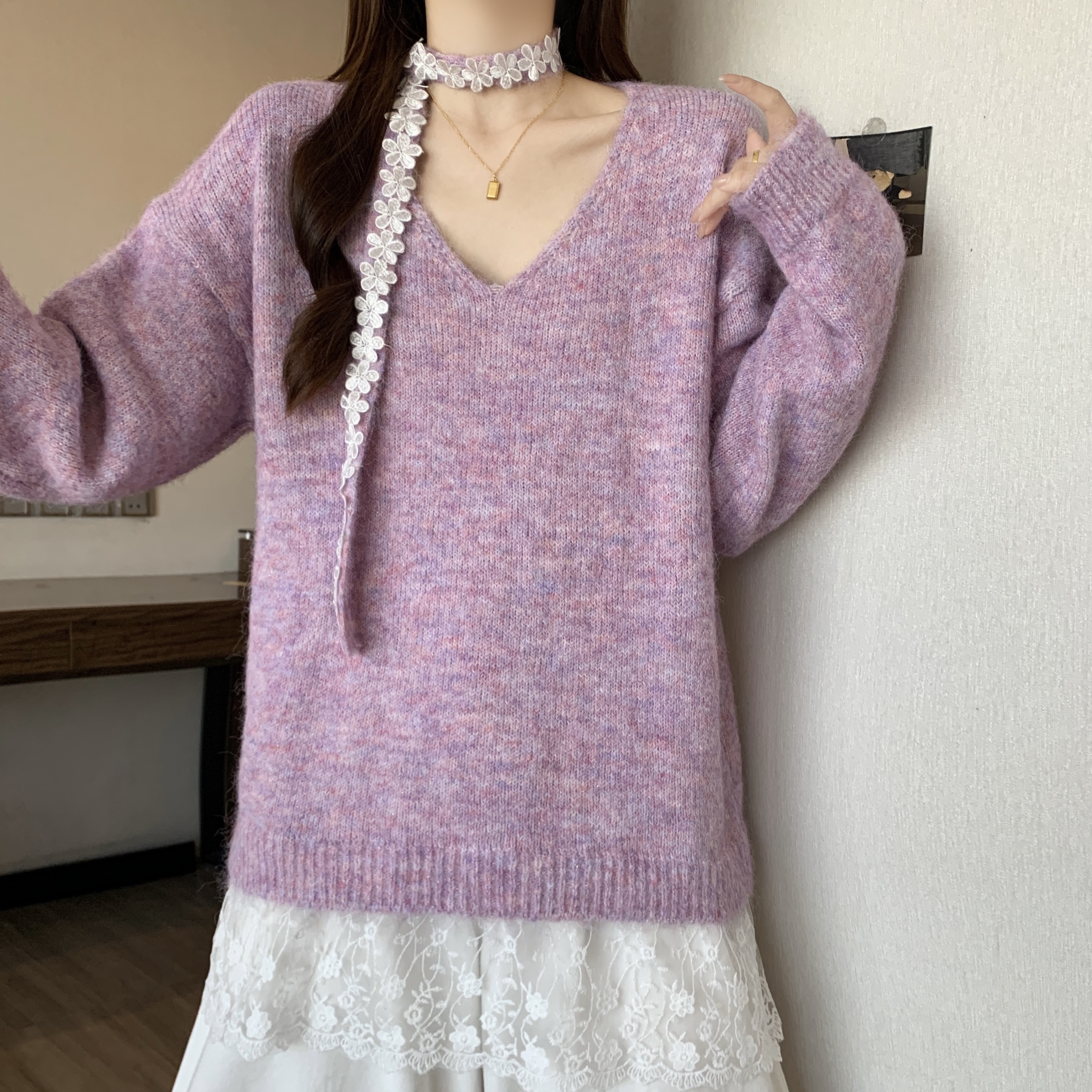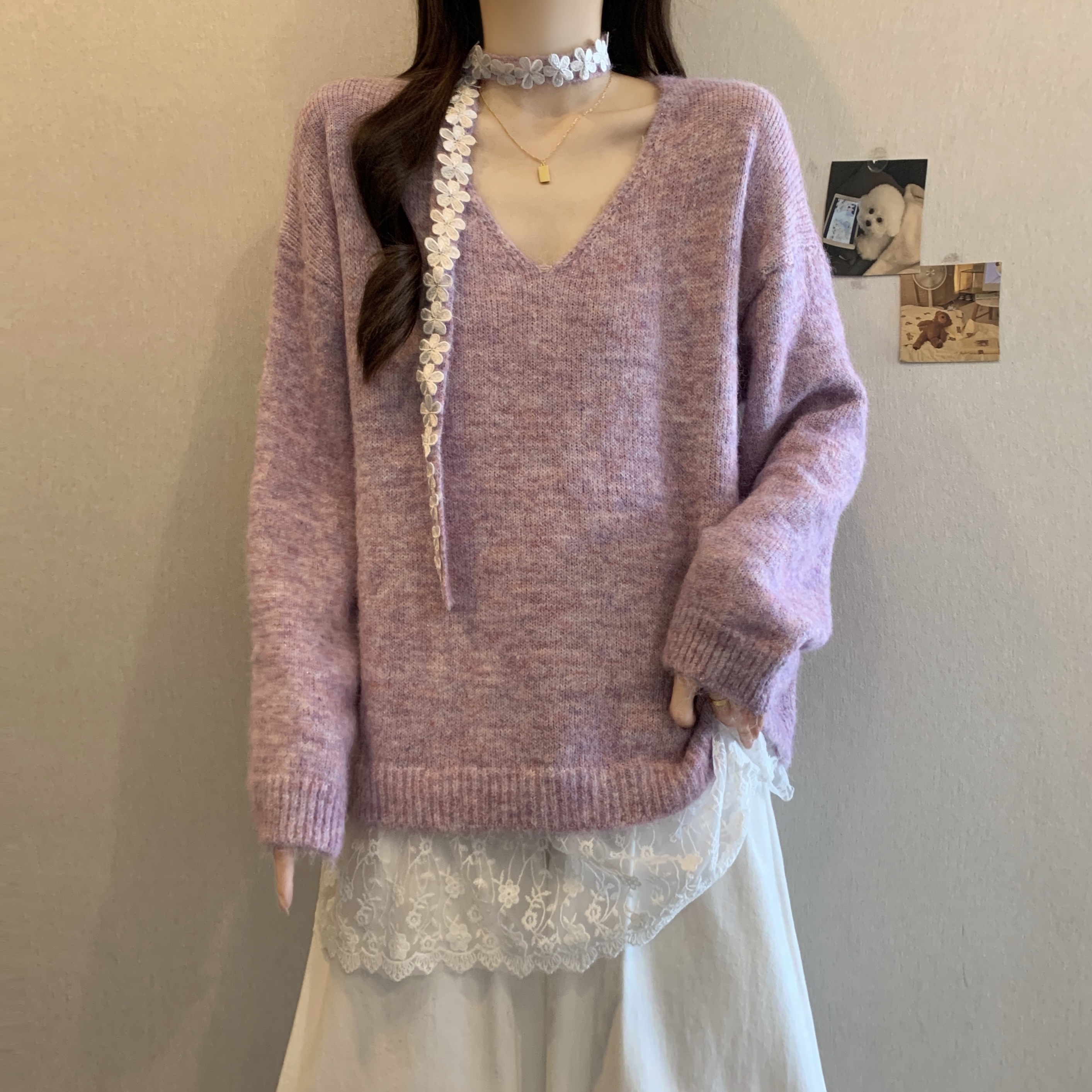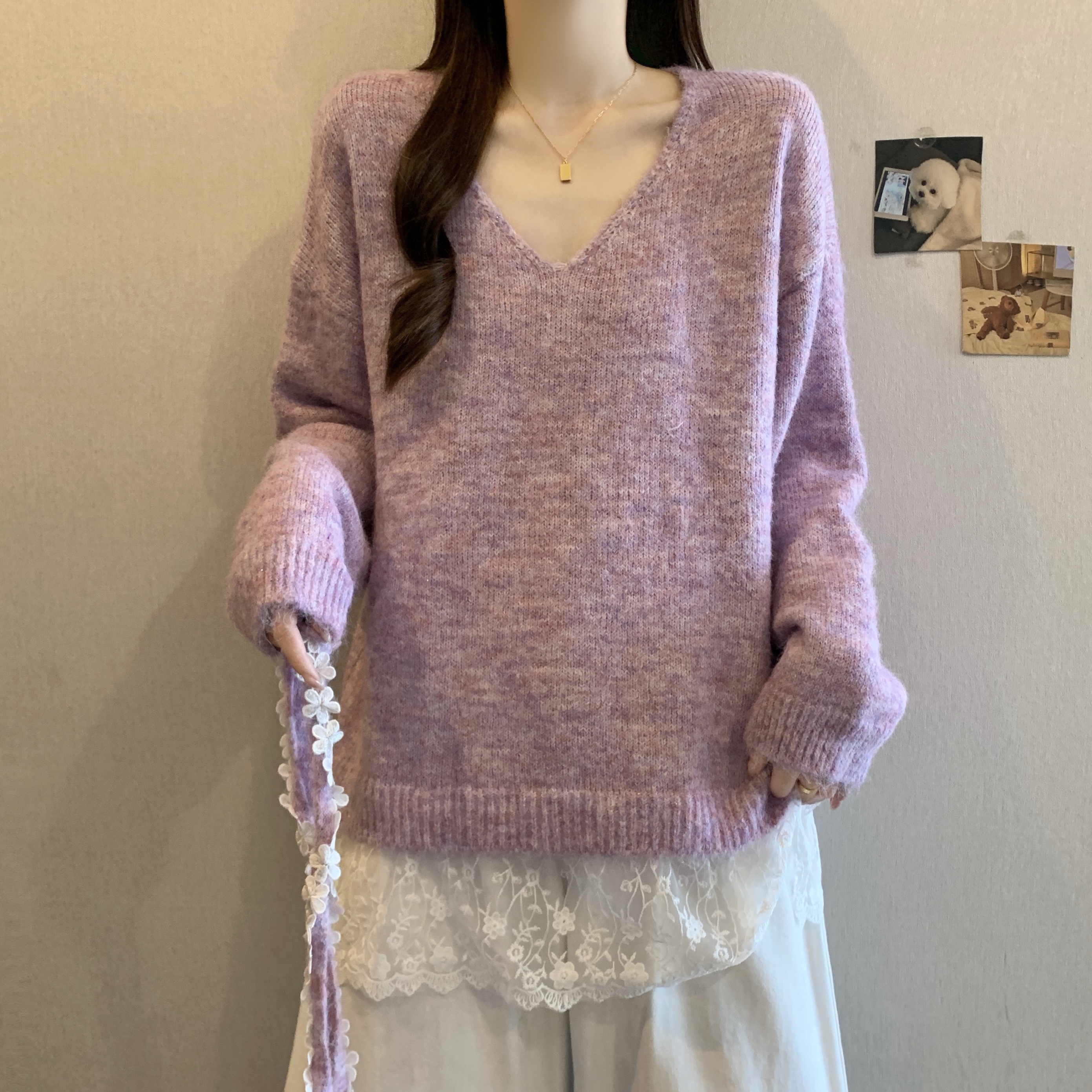 MY14280# 温柔韩版宽松蕾丝拼接V领毛衣慵懒高级感内搭针织上衣女裝貨源服裝批發