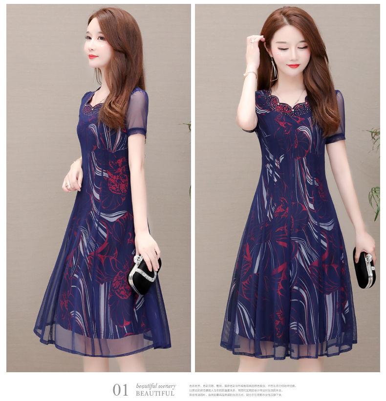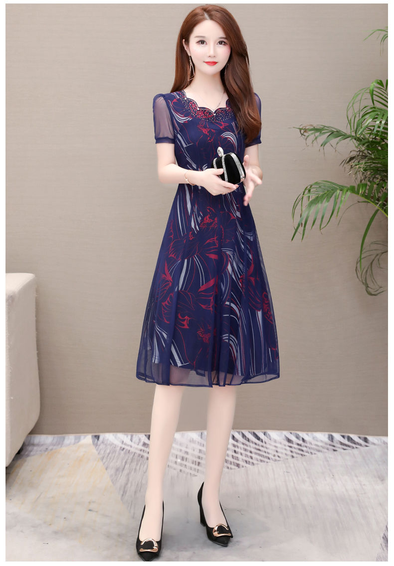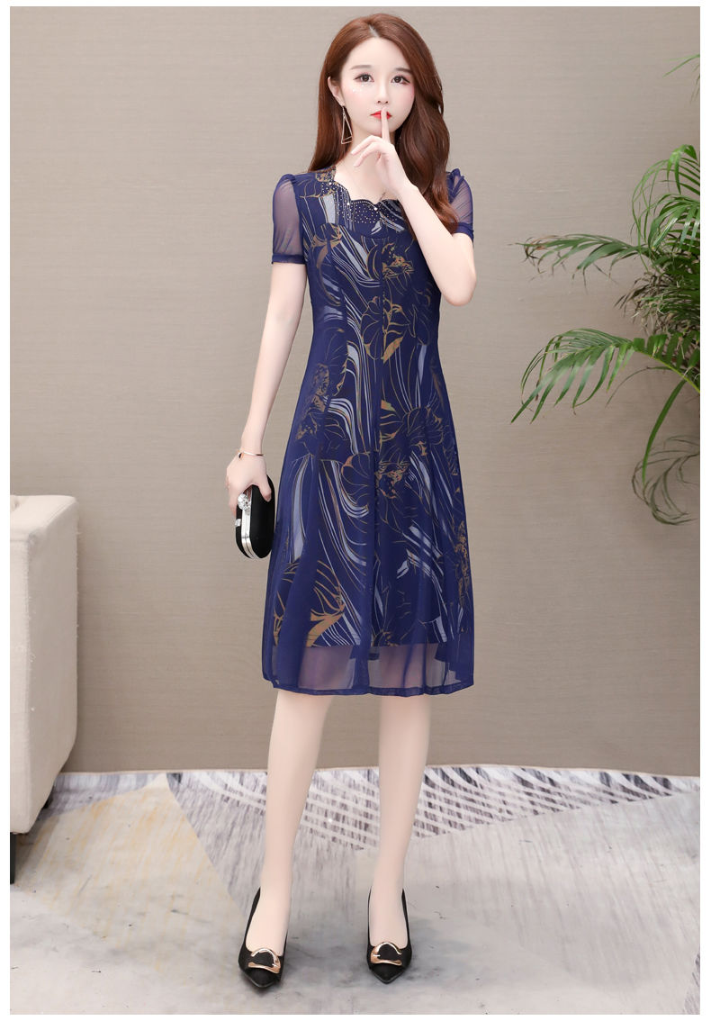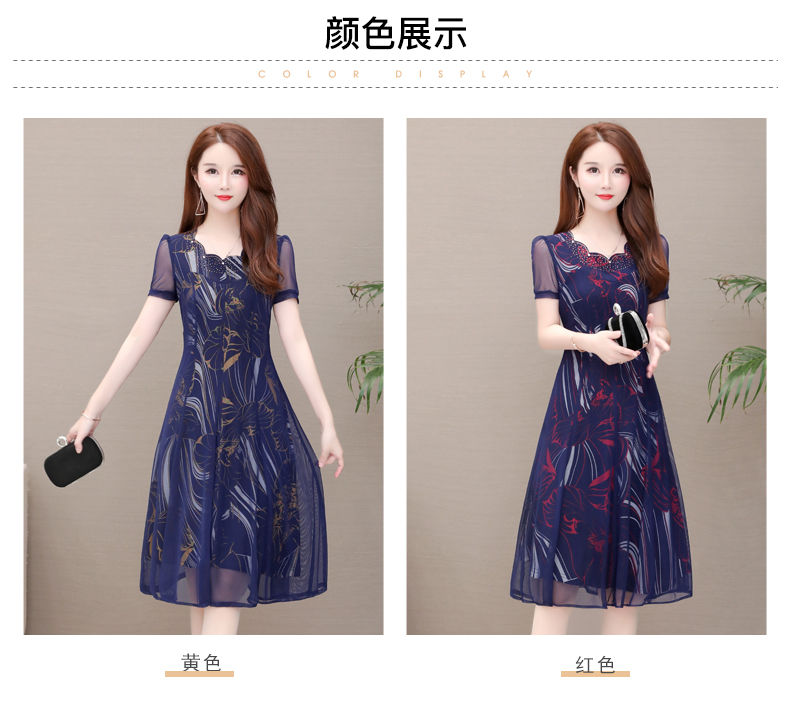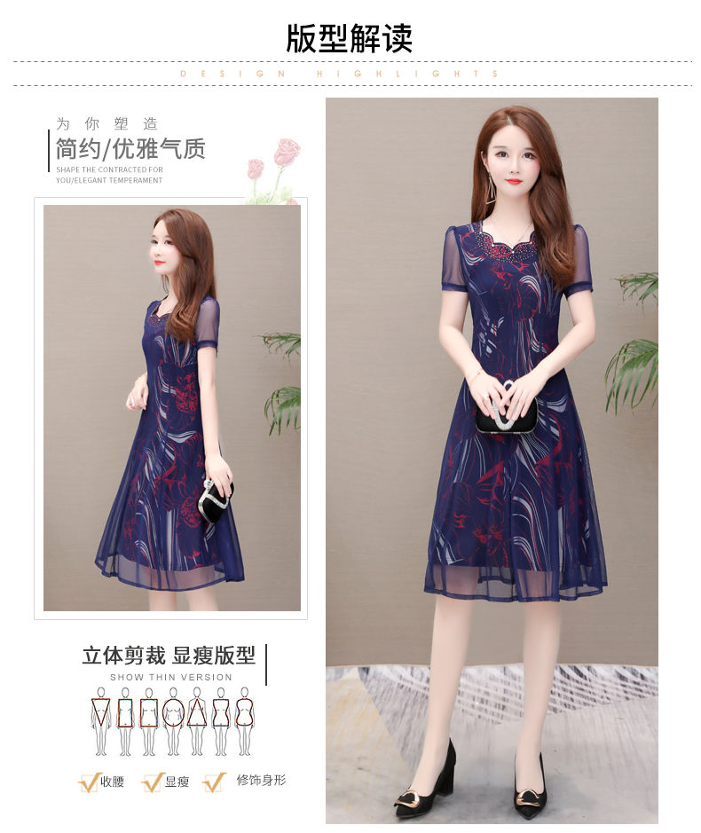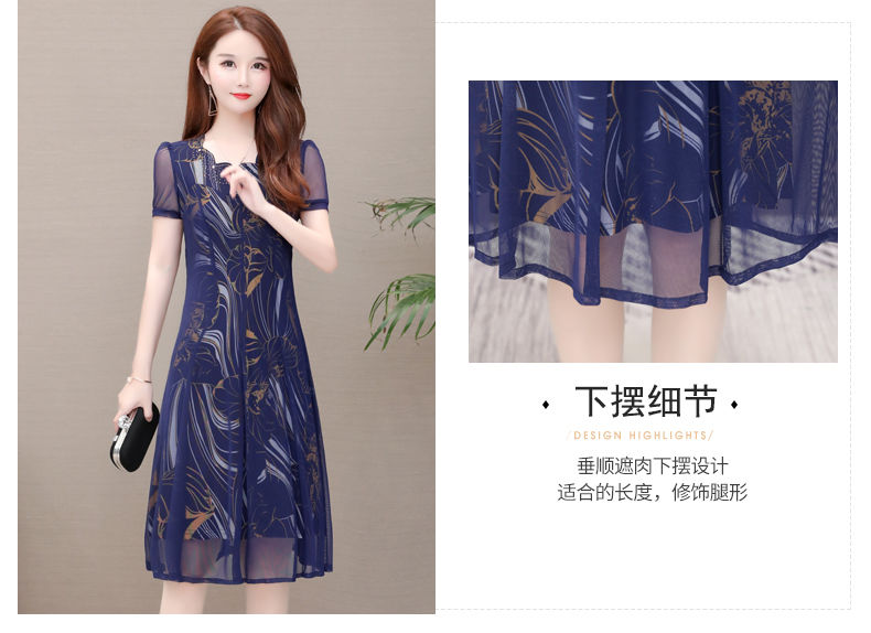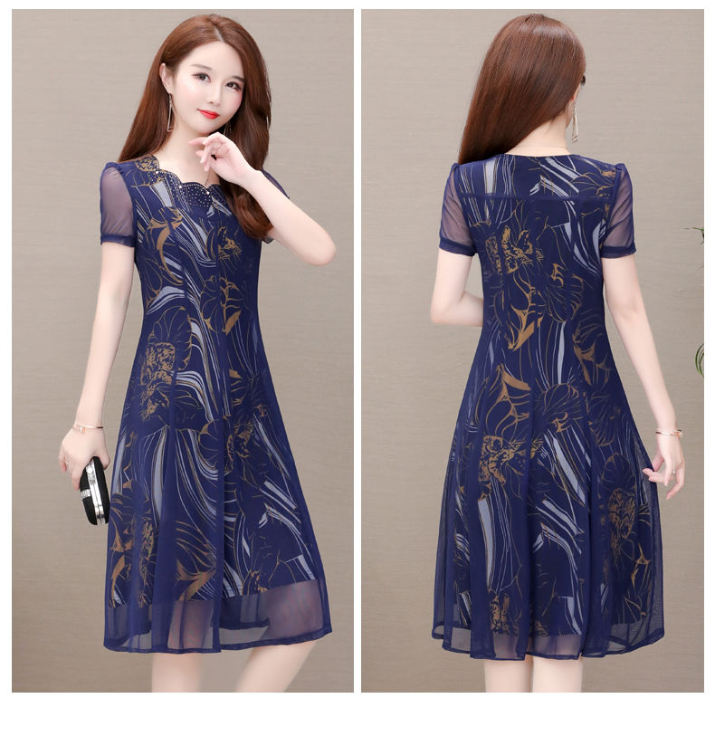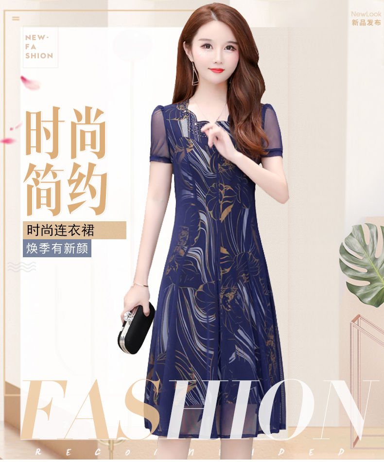 MY14367# 气质印花弹力雪纺连衣裙夏季新款大码宽松遮肚显瘦妈妈台湾纱女裝貨源服裝批發