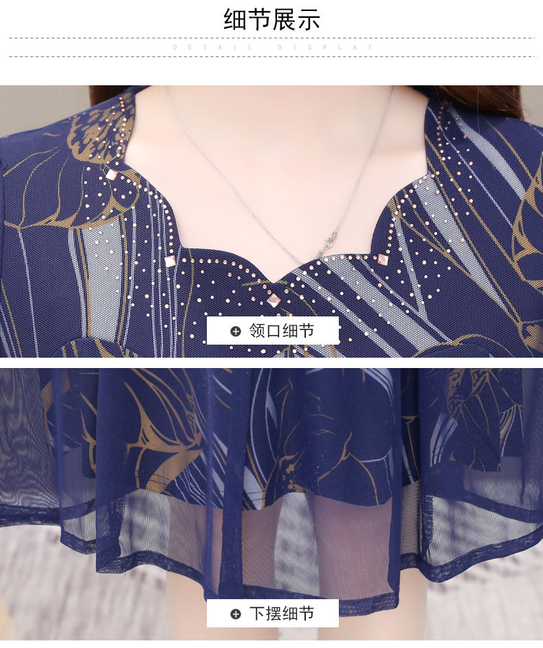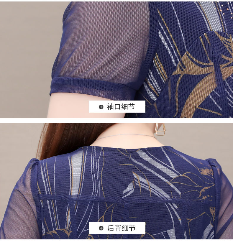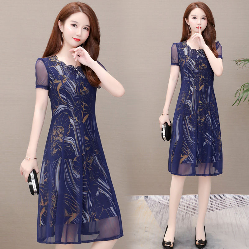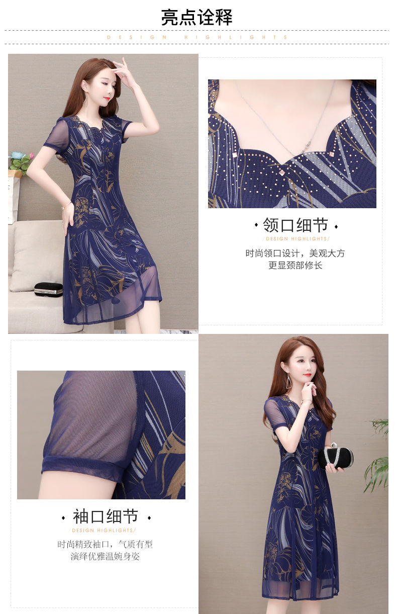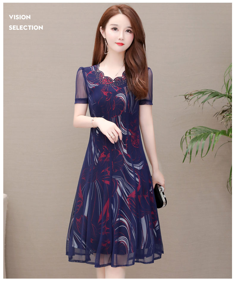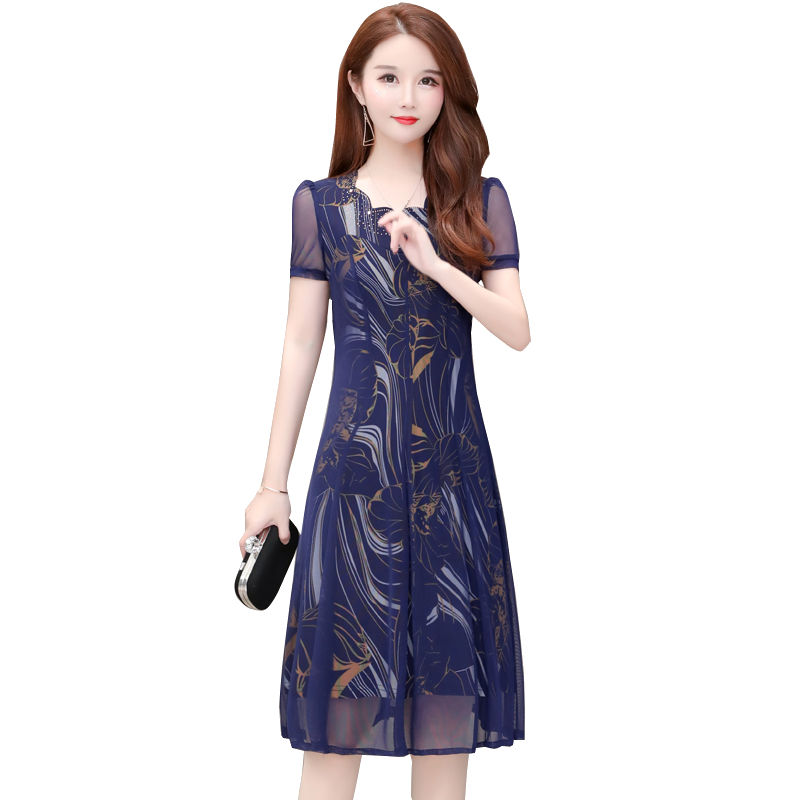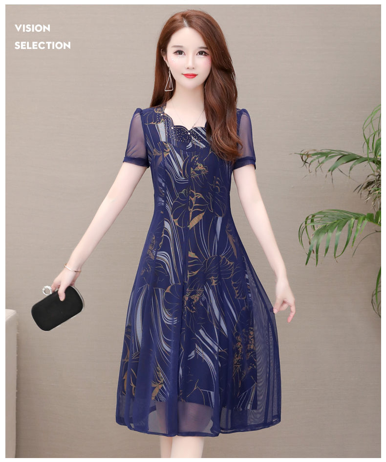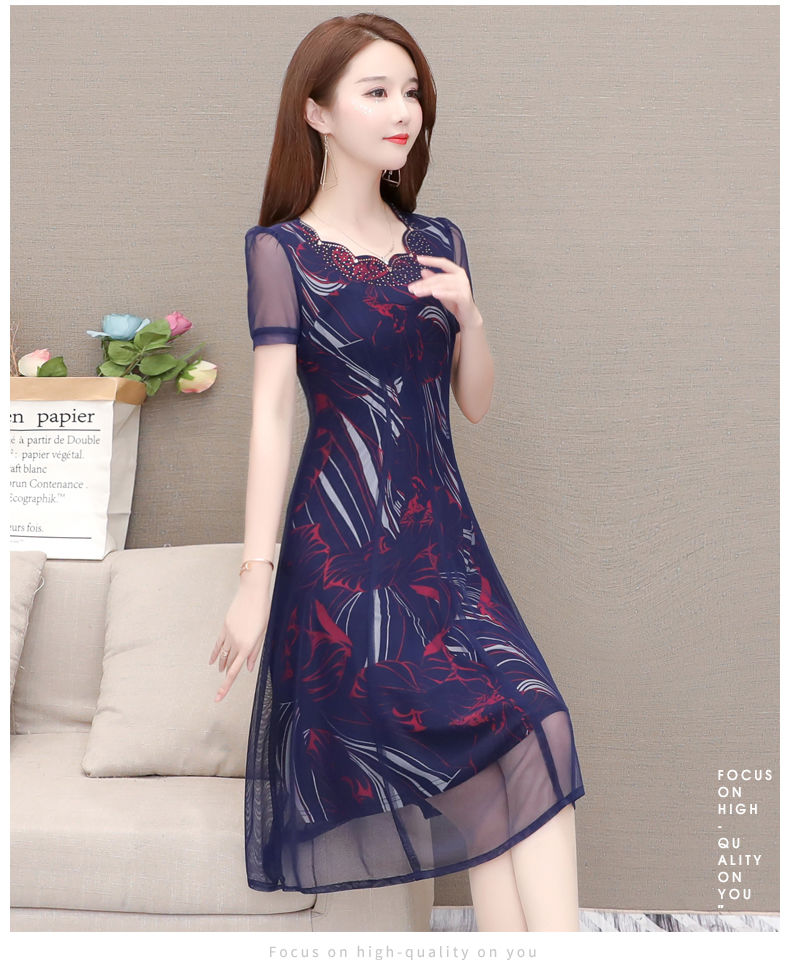MY14367# 气质印花弹力雪纺连衣裙夏季新款大码宽松遮肚显瘦妈妈台湾纱女裝貨源服裝批發