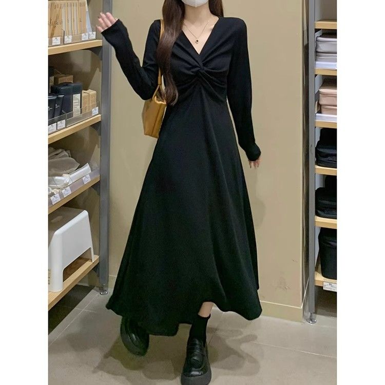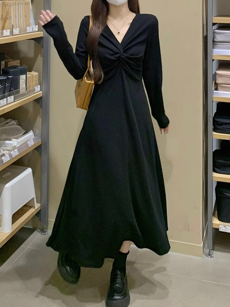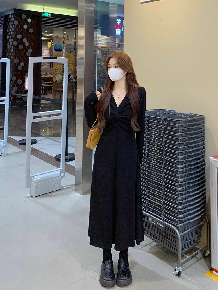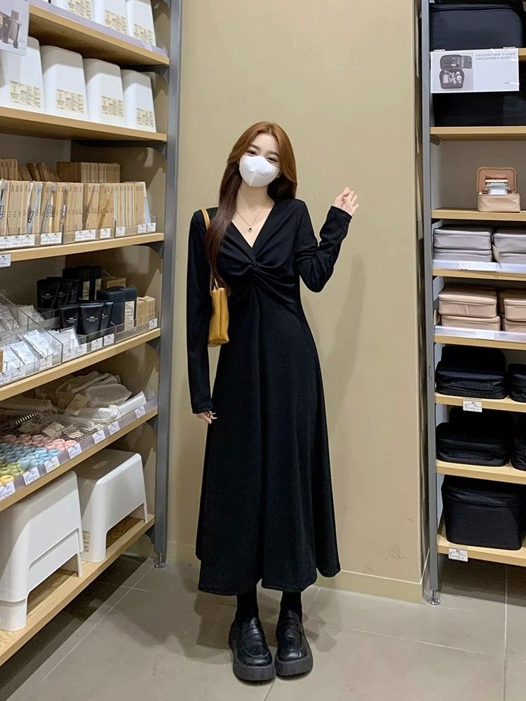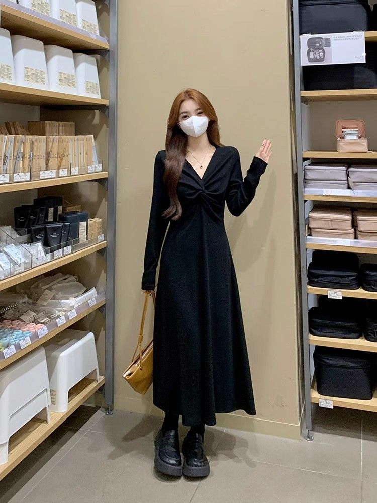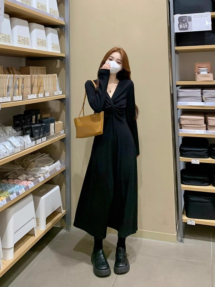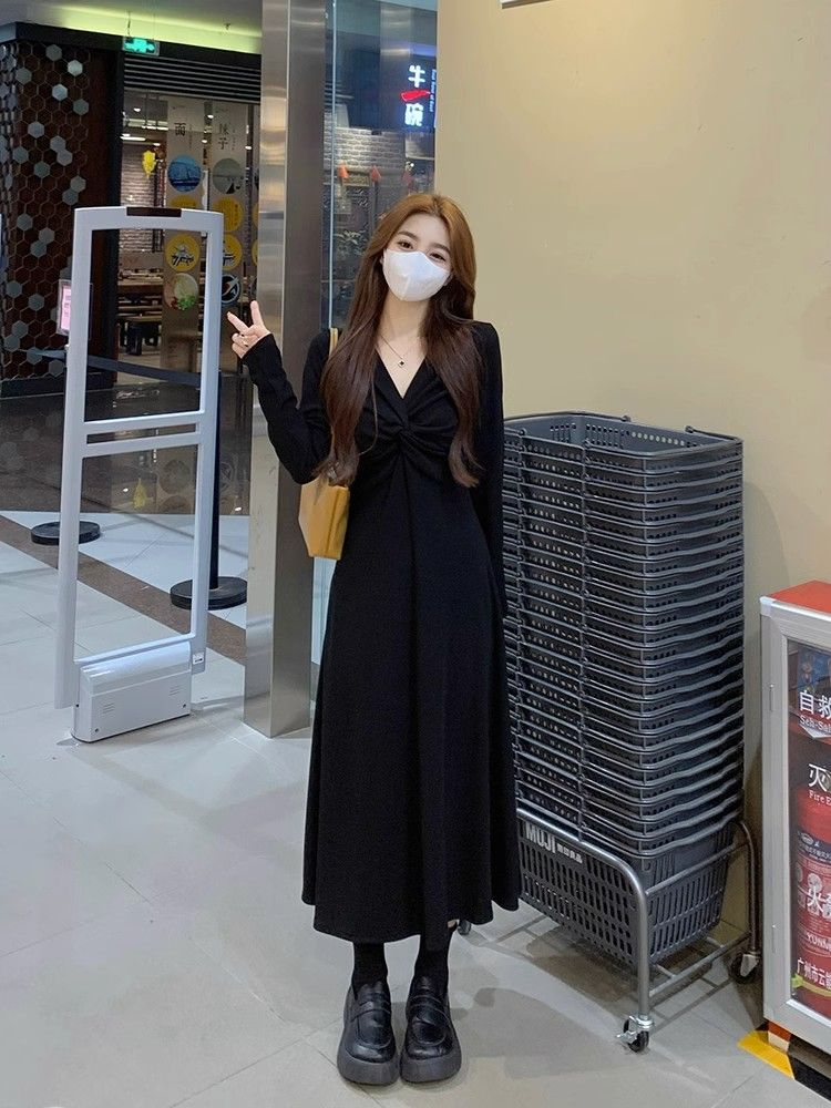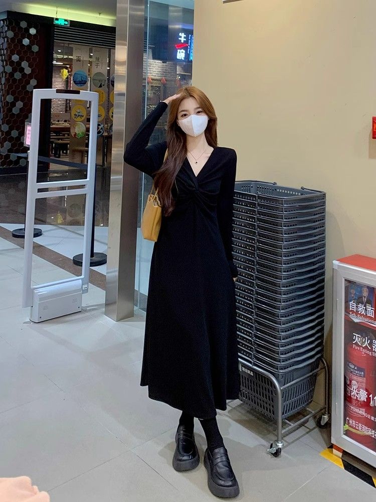 MY14502# 针织连衣裙女显瘦v领打底小黑裙赫本风胖mm垂感裙子女裝貨源服裝批發