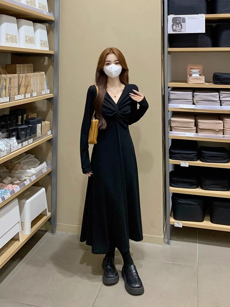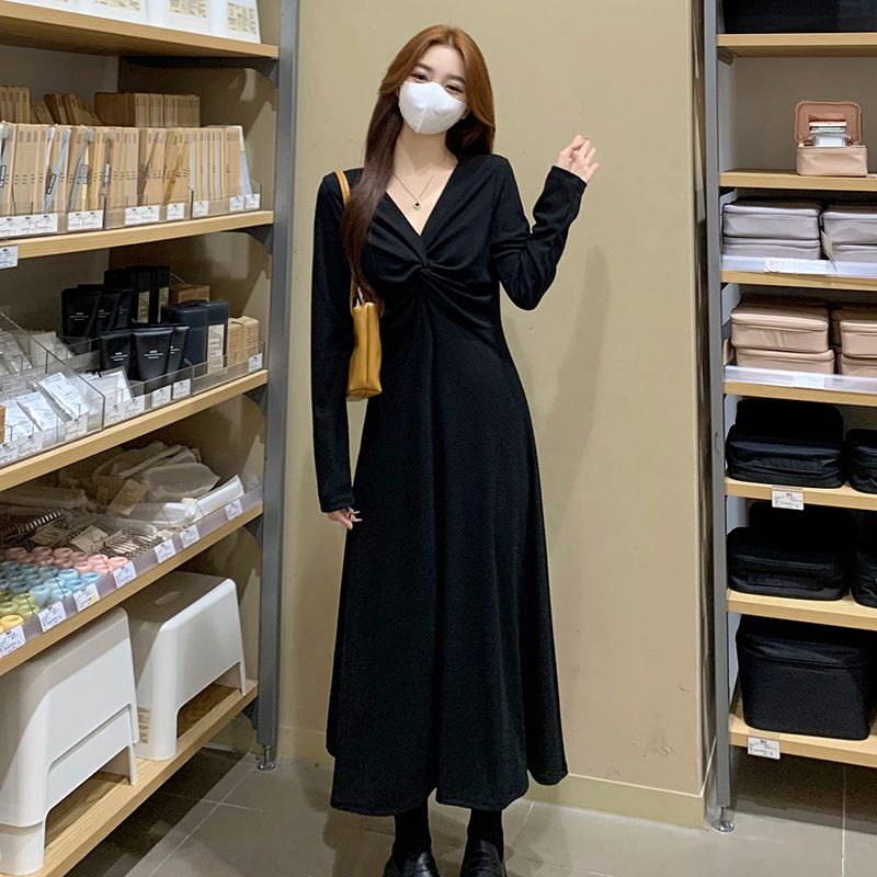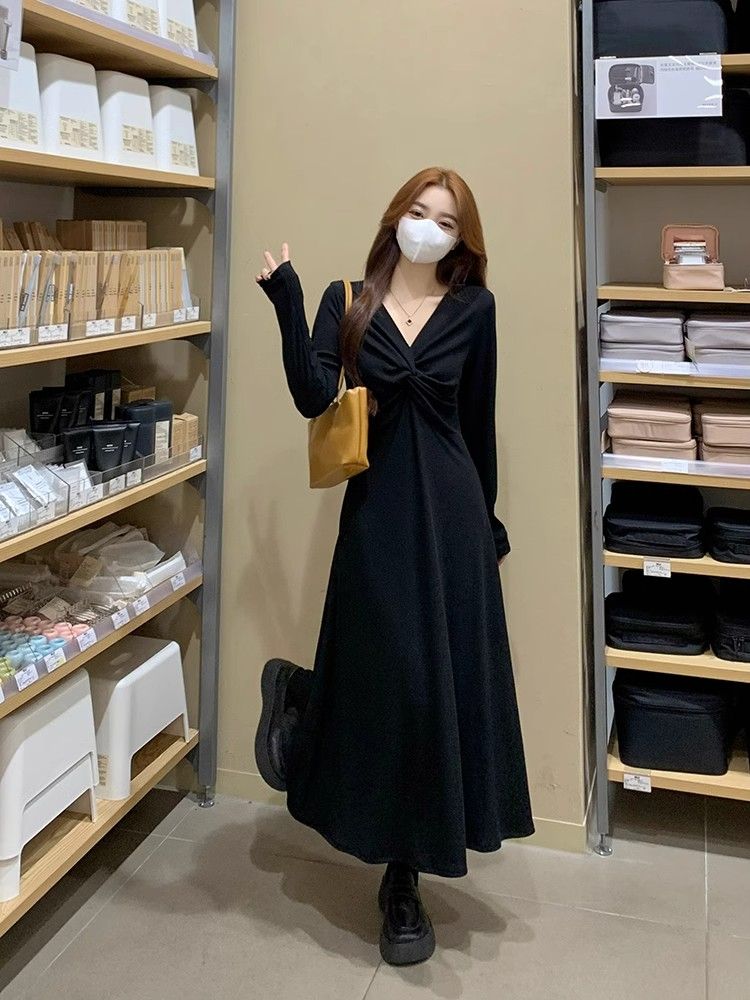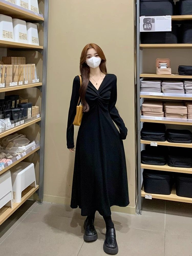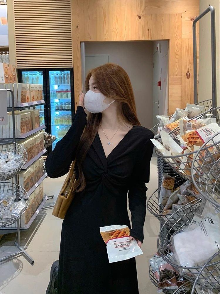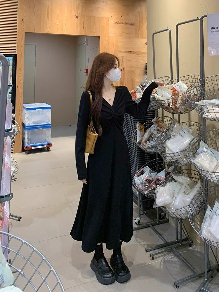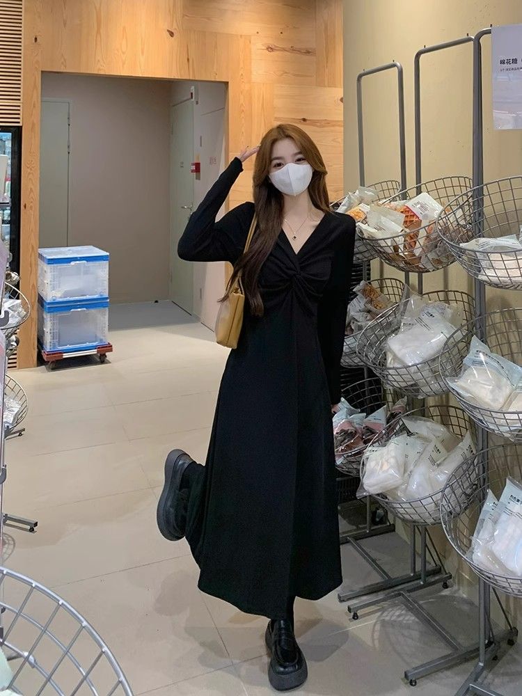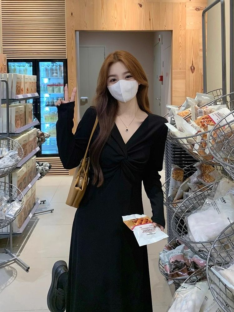 MY14502# 针织连衣裙女显瘦v领打底小黑裙赫本风胖mm垂感裙子女裝貨源服裝批發