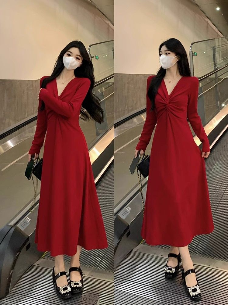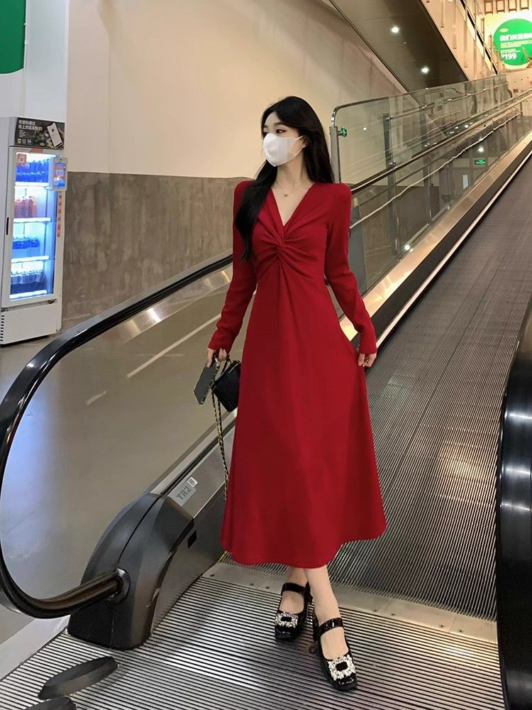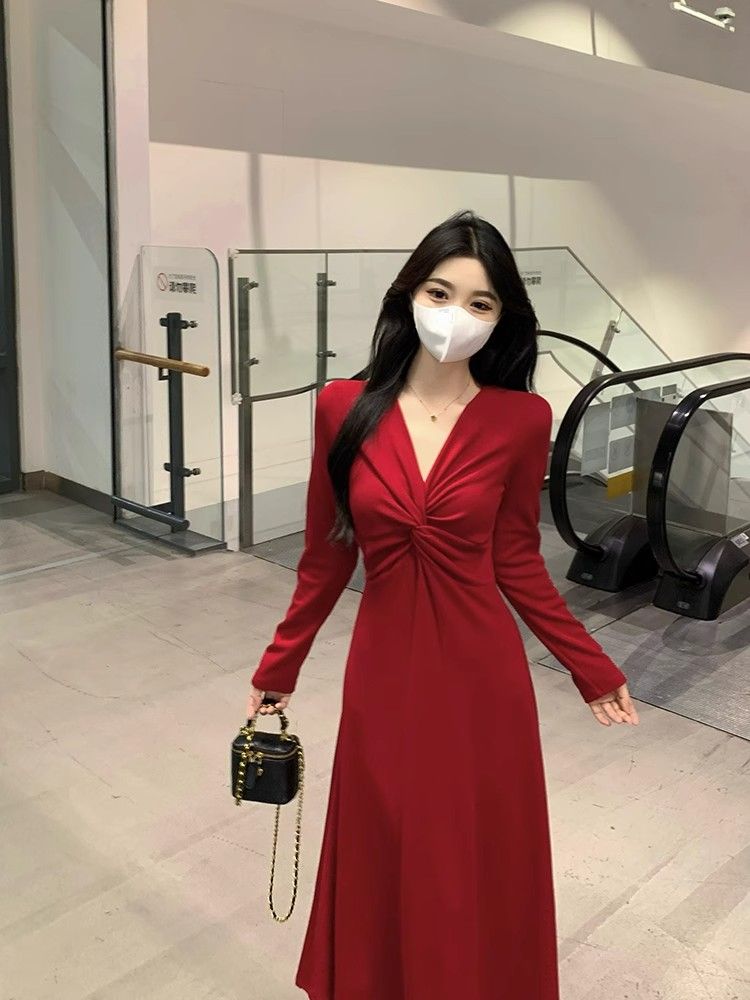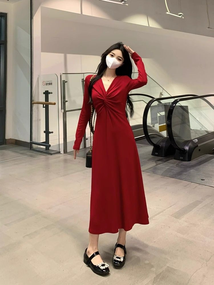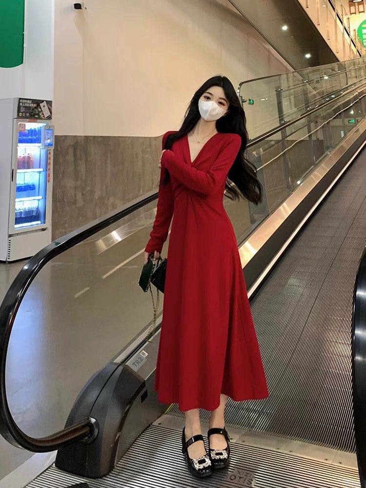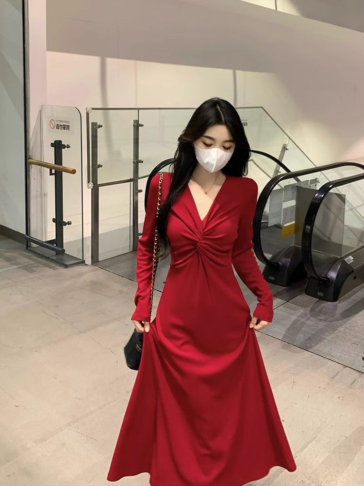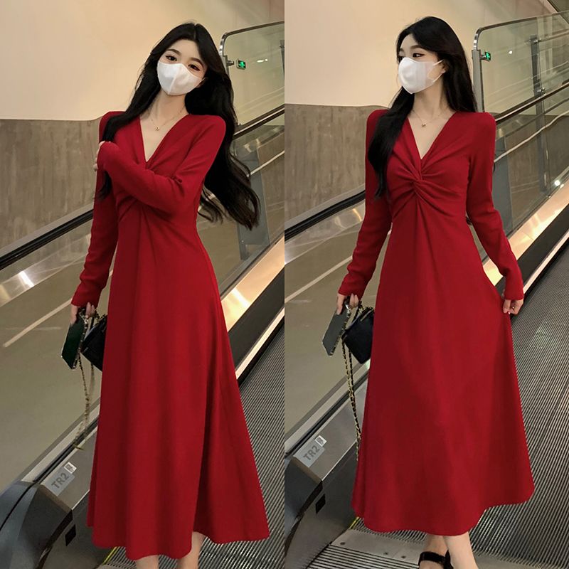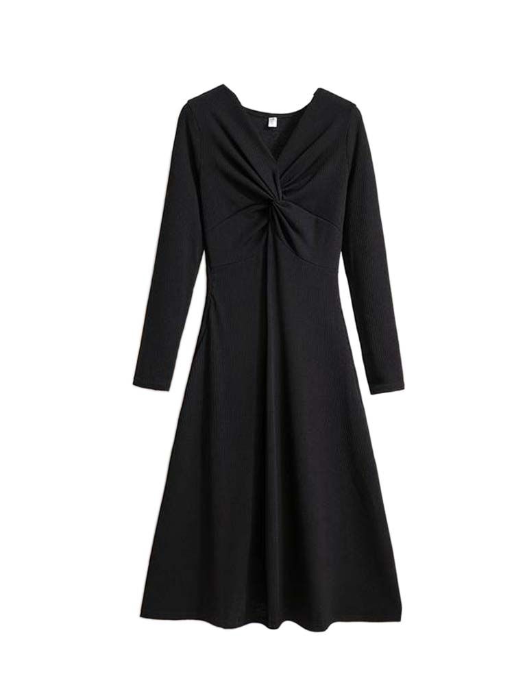 MY14502# 针织连衣裙女显瘦v领打底小黑裙赫本风胖mm垂感裙子女裝貨源服裝批發