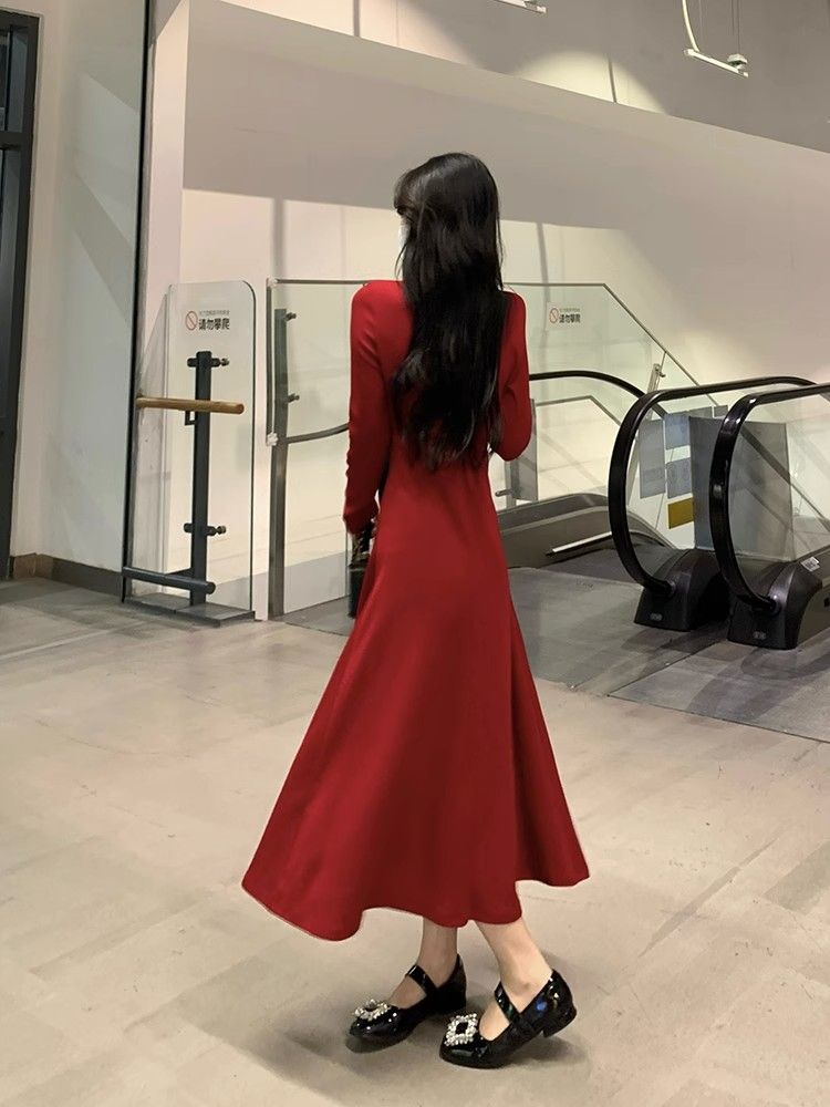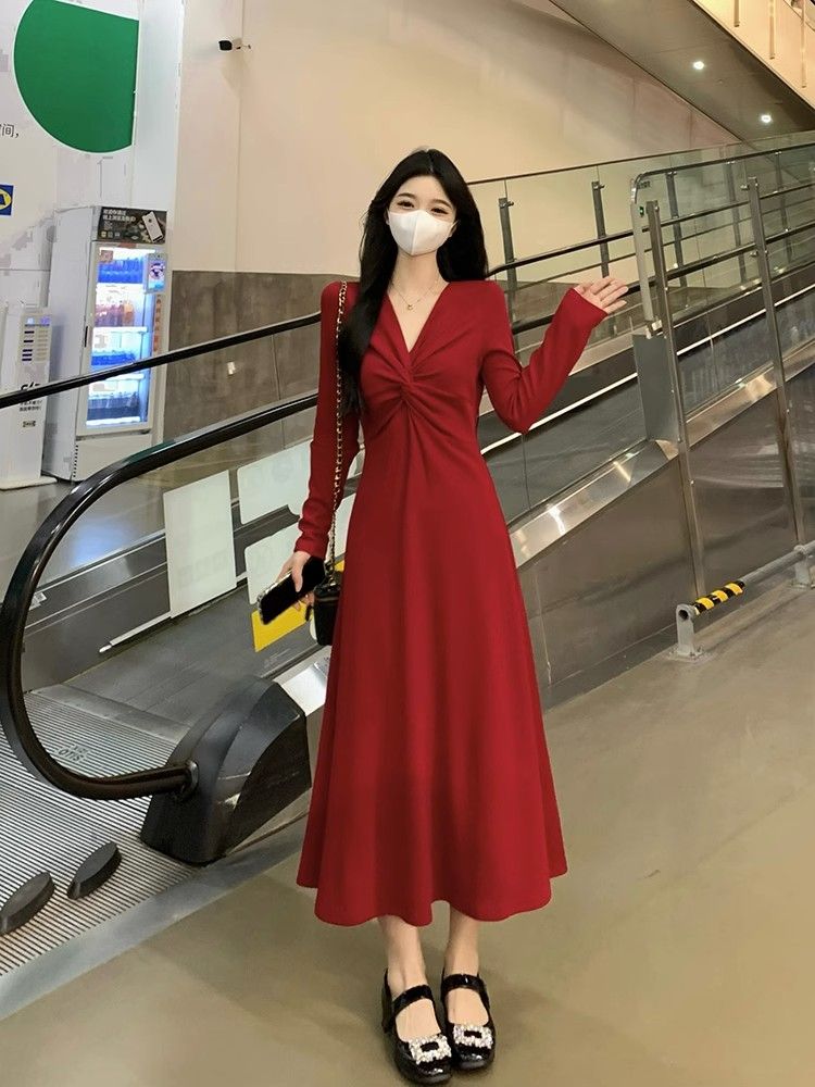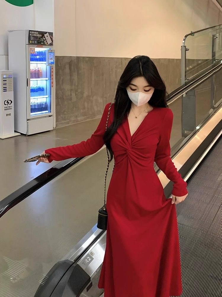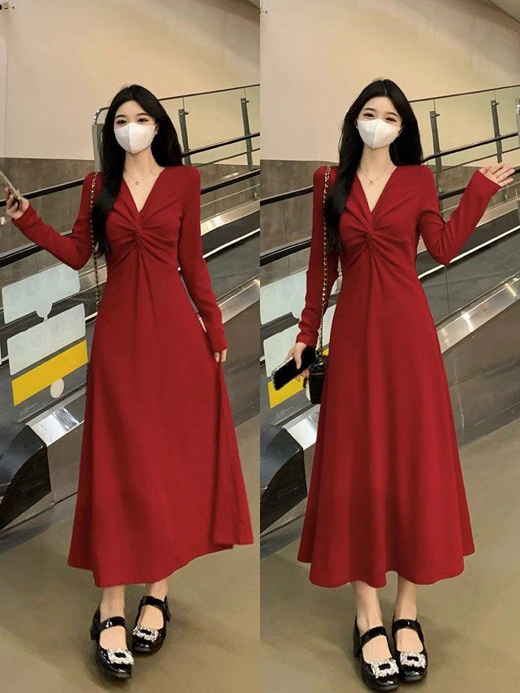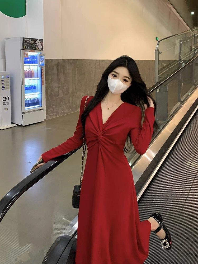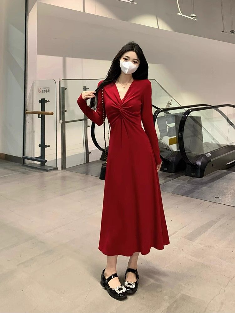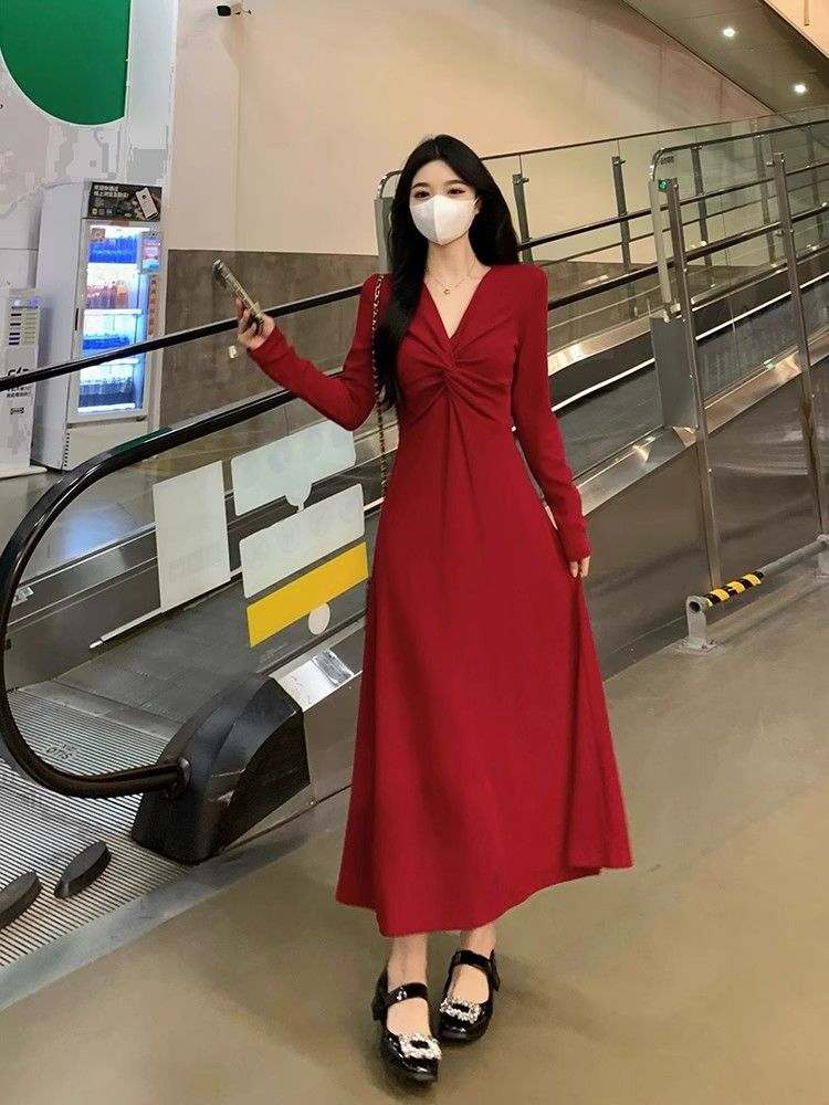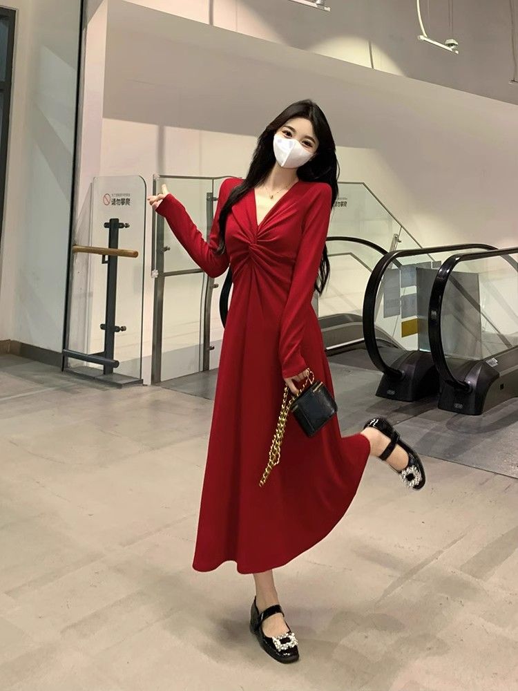 MY14502# 针织连衣裙女显瘦v领打底小黑裙赫本风胖mm垂感裙子女裝貨源服裝批發