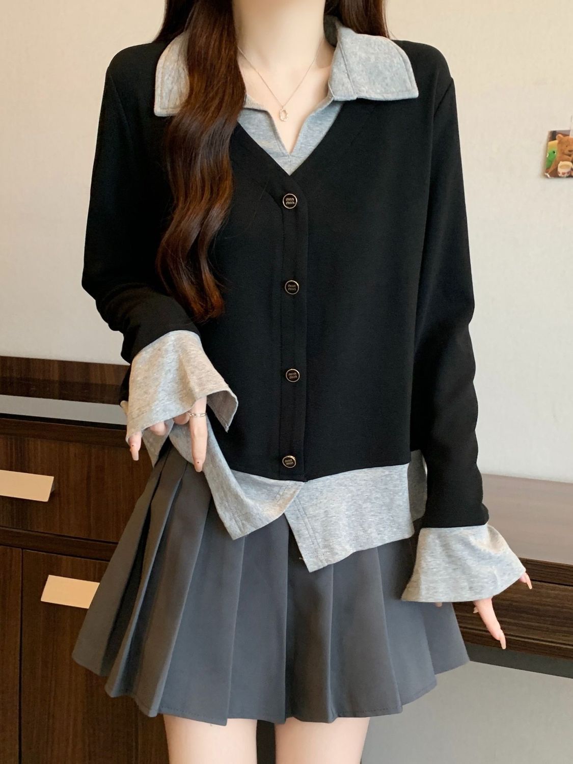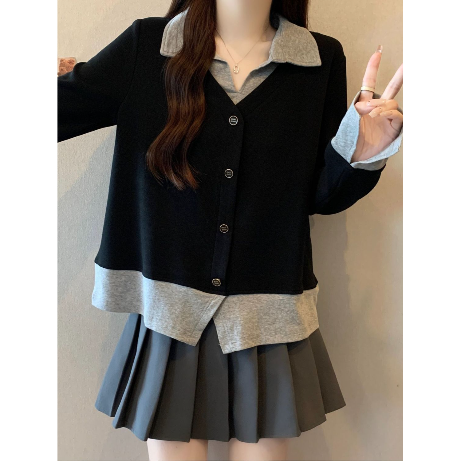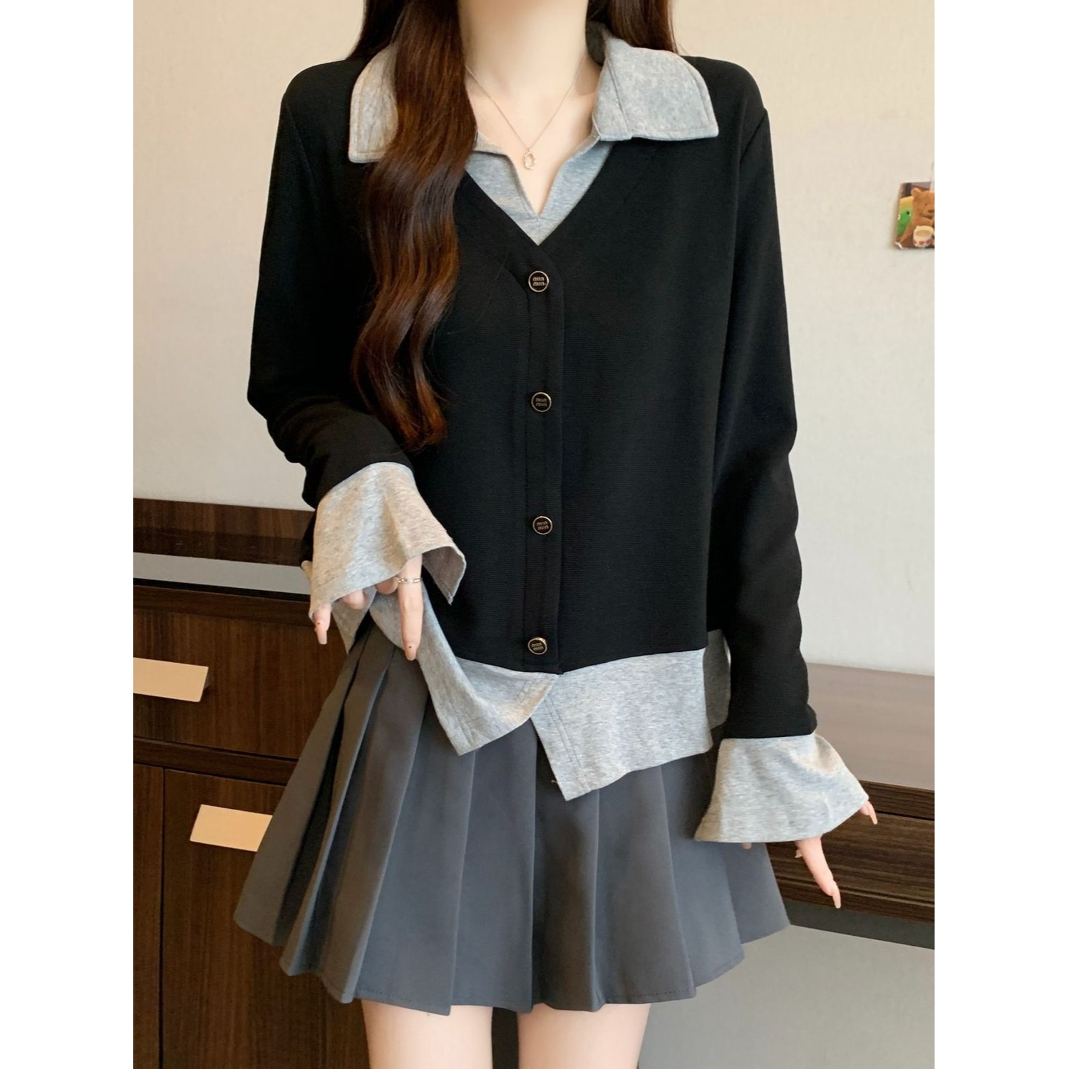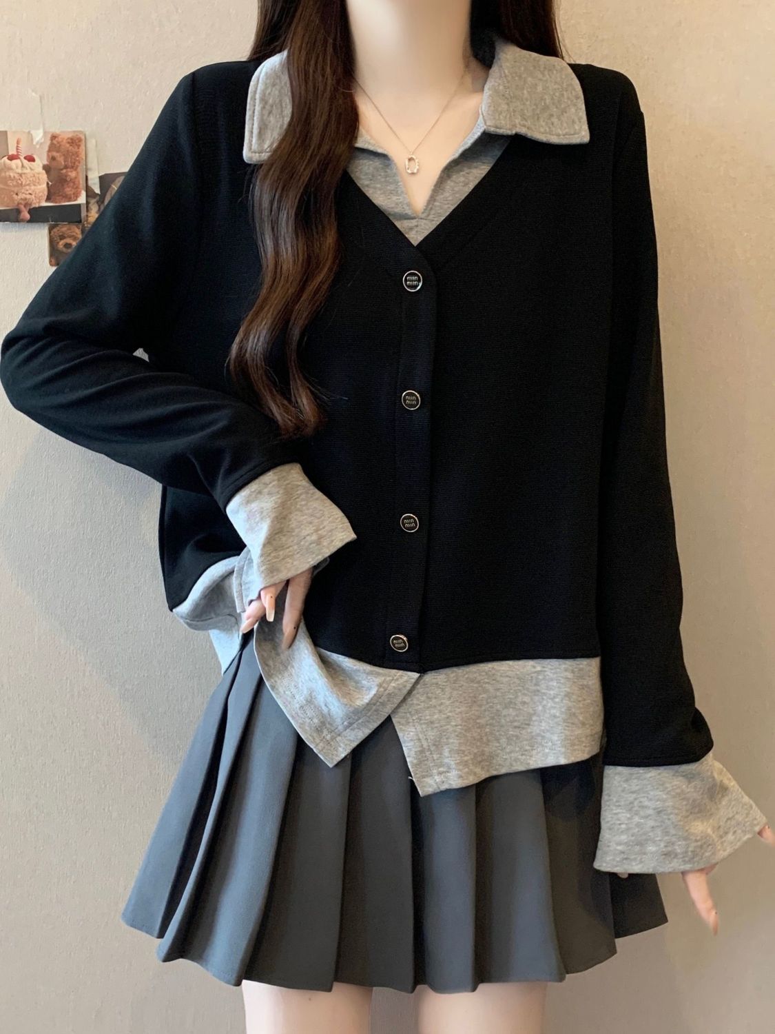 MY14513# 徳绒德绒设计感假两件拼接翻领长袖衬衫女上衣女裝貨源服裝批發
