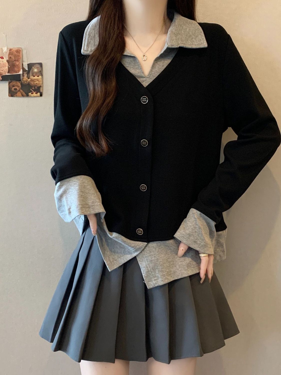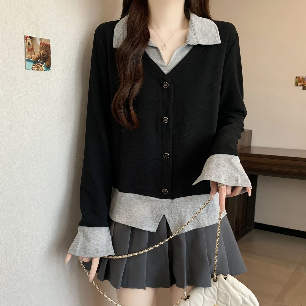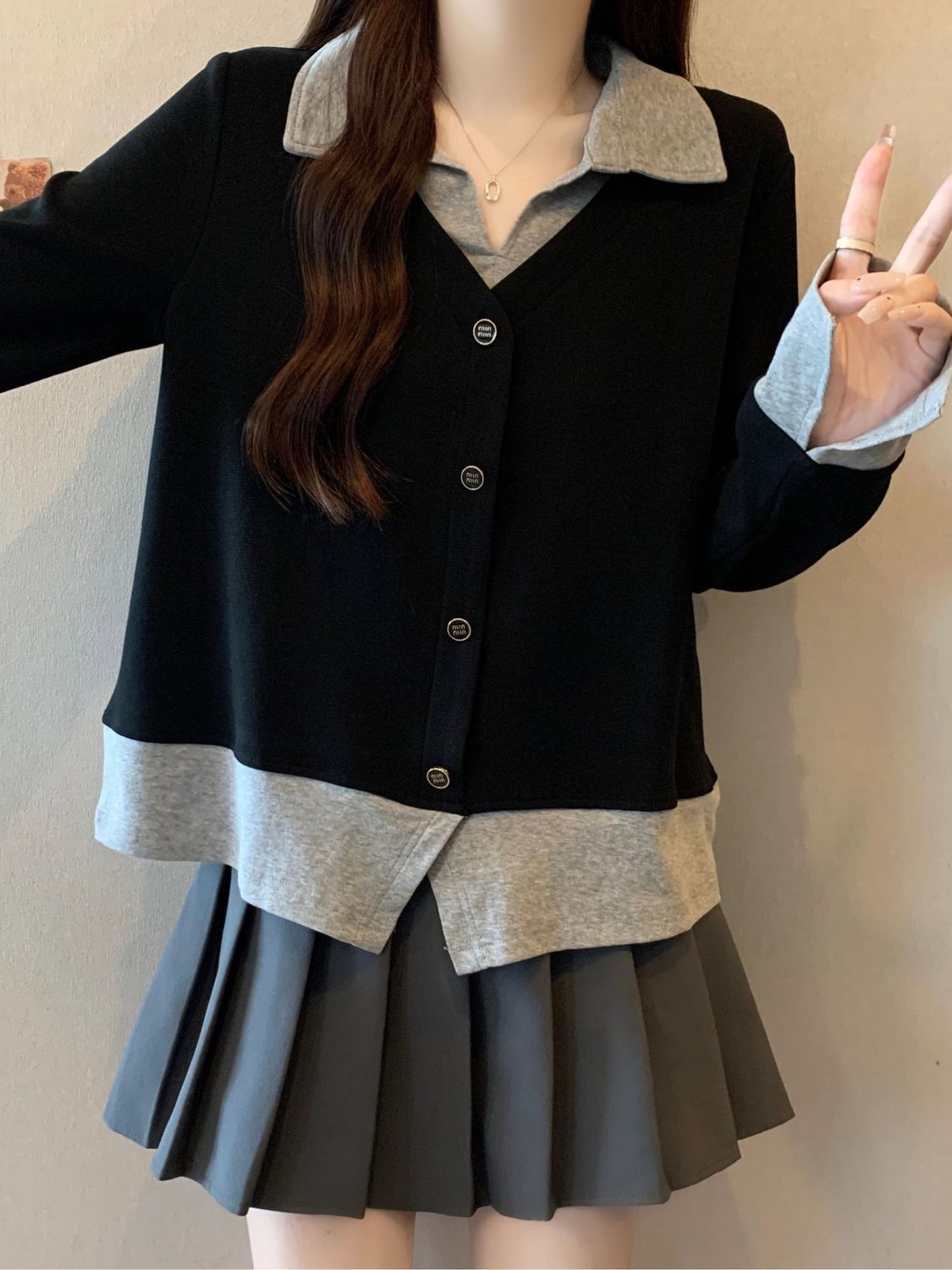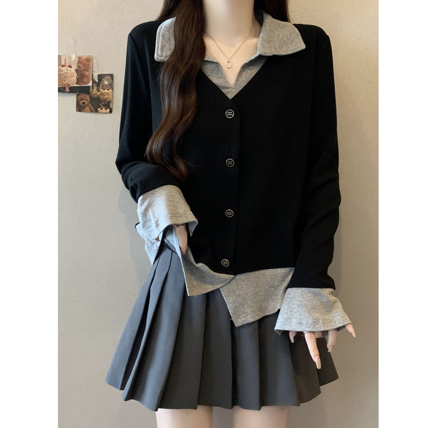 MY14513# 徳绒德绒设计感假两件拼接翻领长袖衬衫女上衣女裝貨源服裝批發