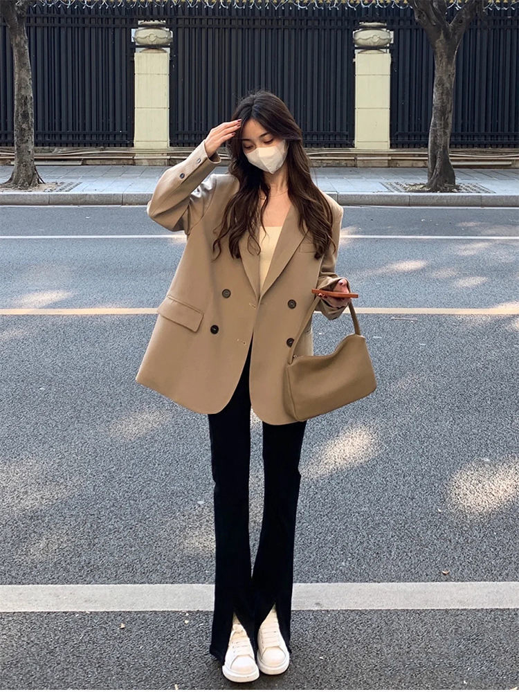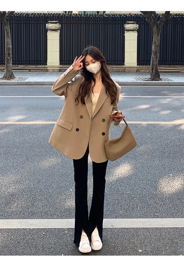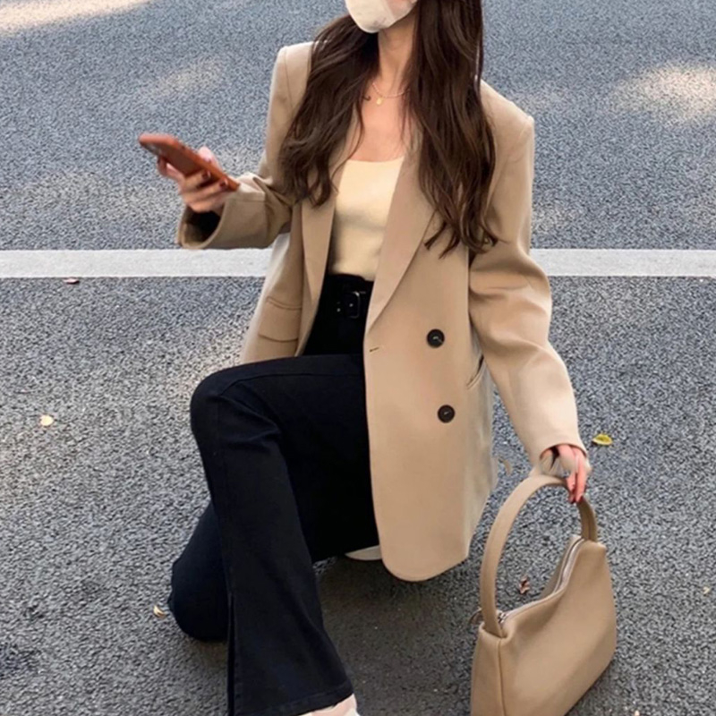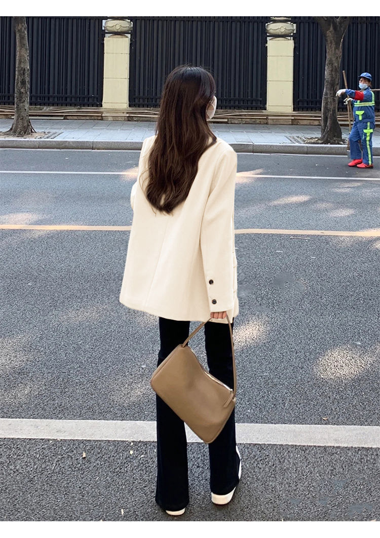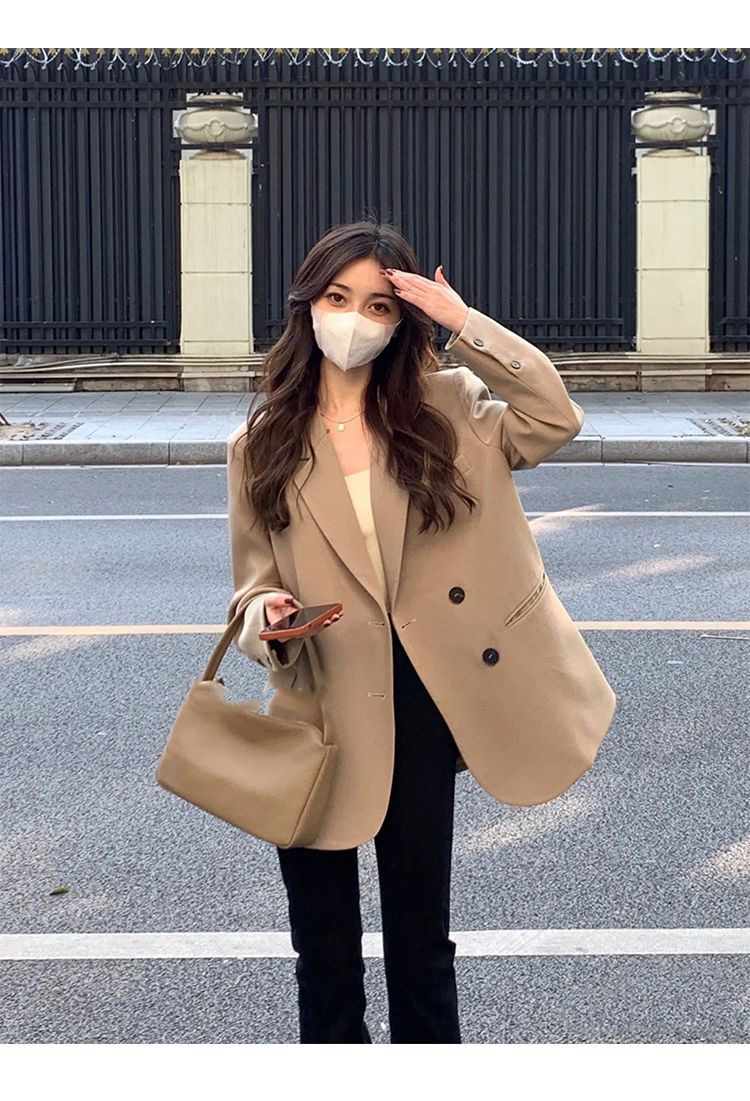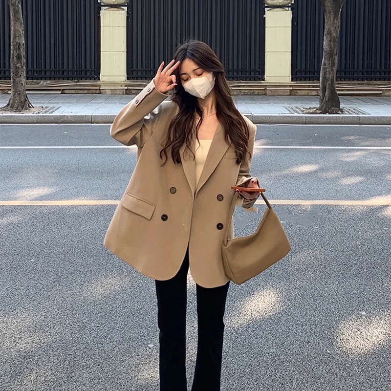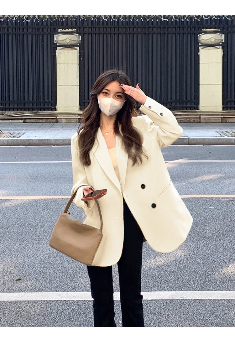 MY14514# 奶白色西装外套韩系双排扣小众百搭休闲oversize西服潮女裝貨源服裝批發