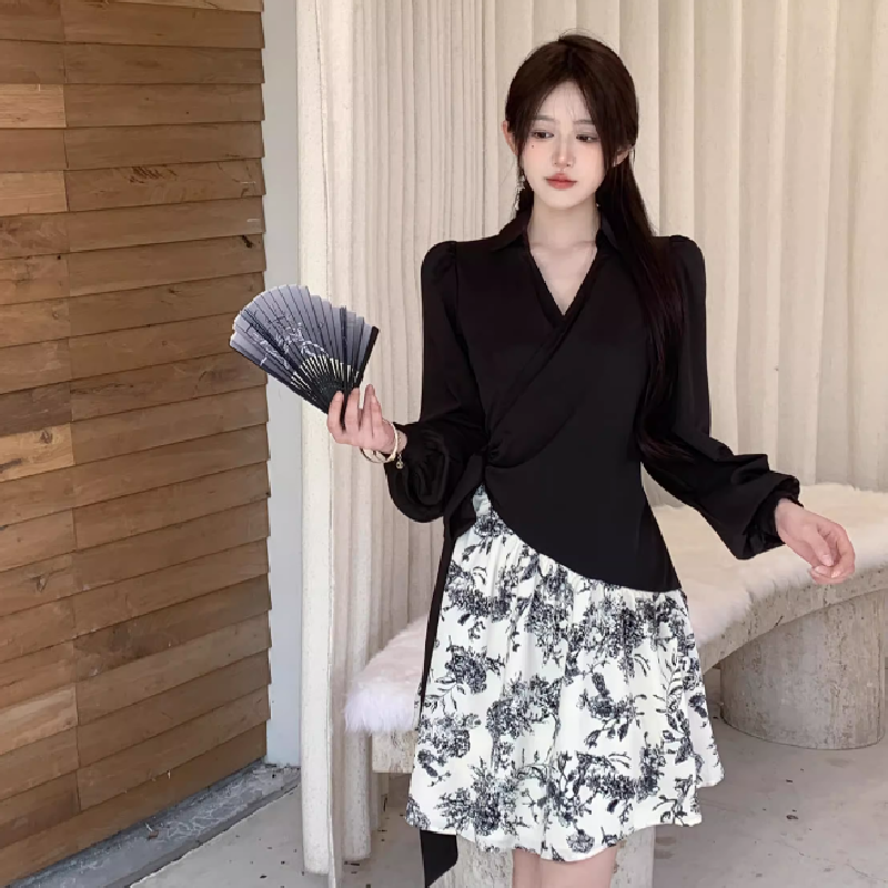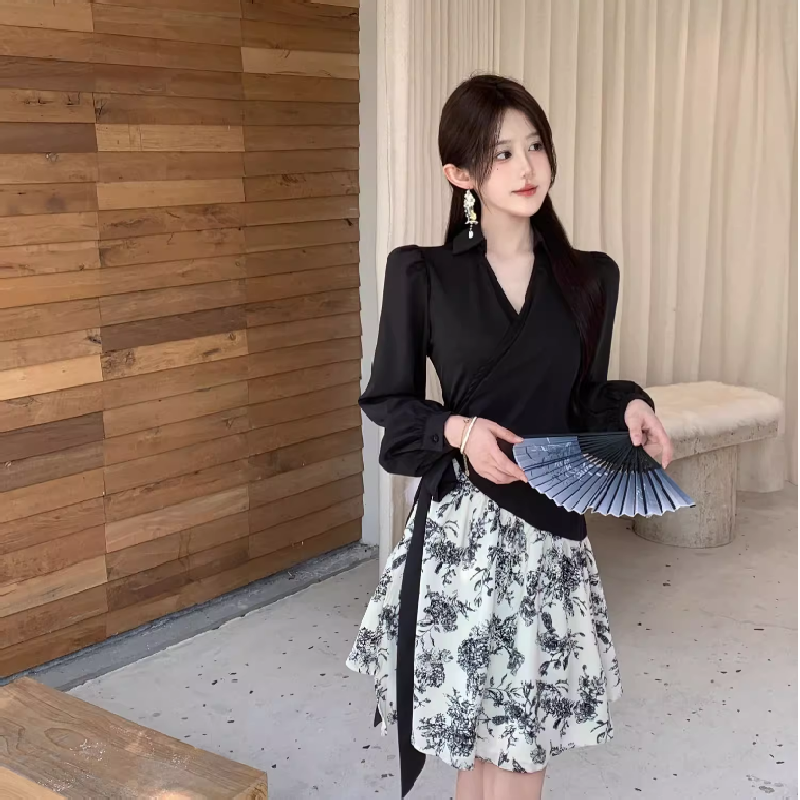 MY14530# 水墨碎花拼接连衣裙韩系氛围感气质收腰不规则裙女裝貨源服裝批發