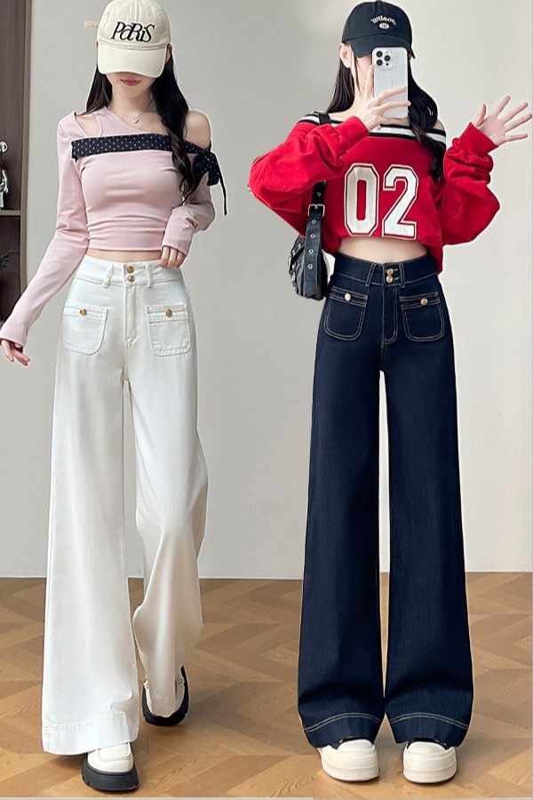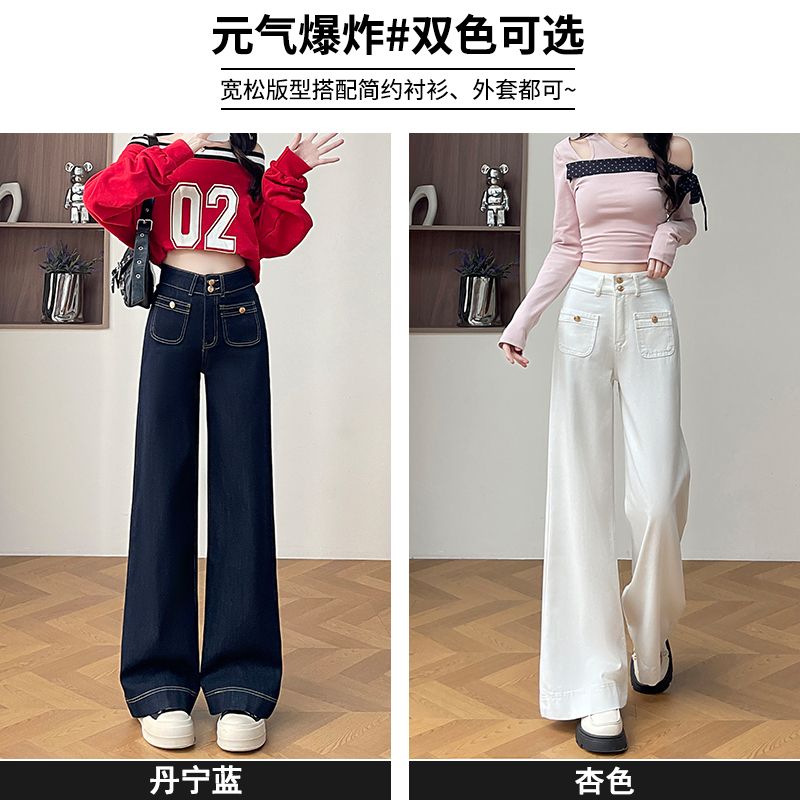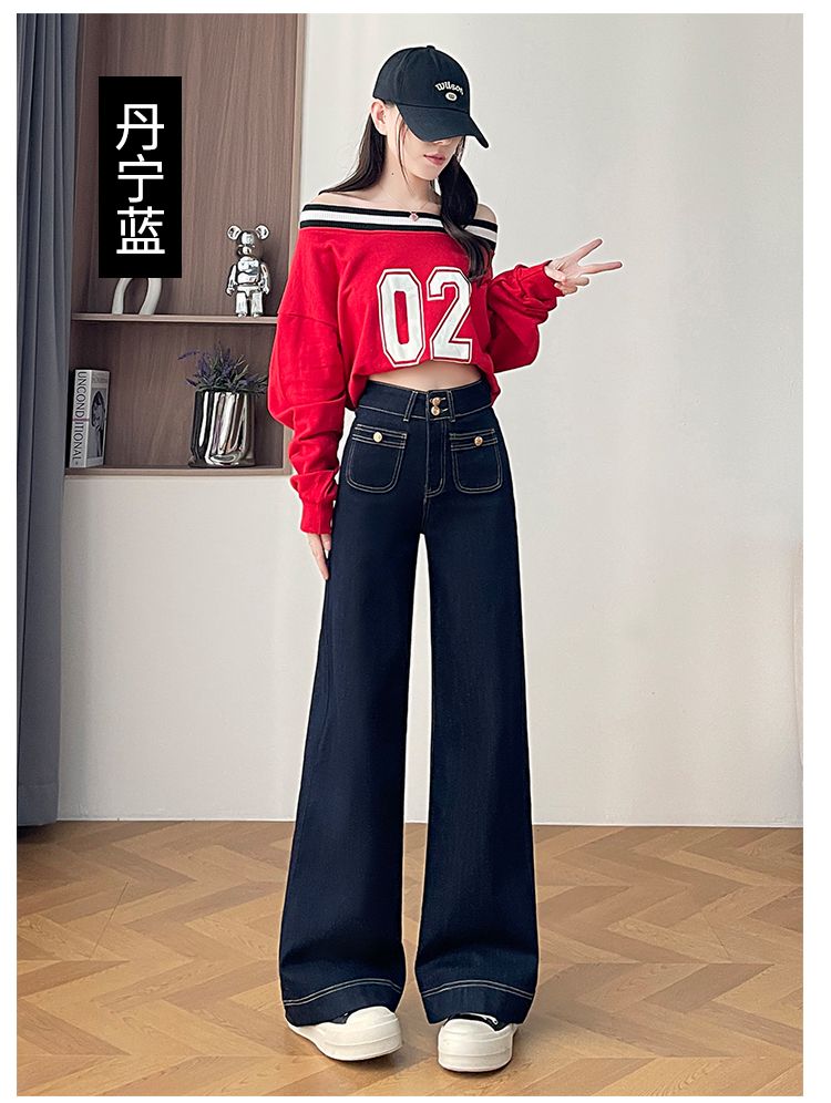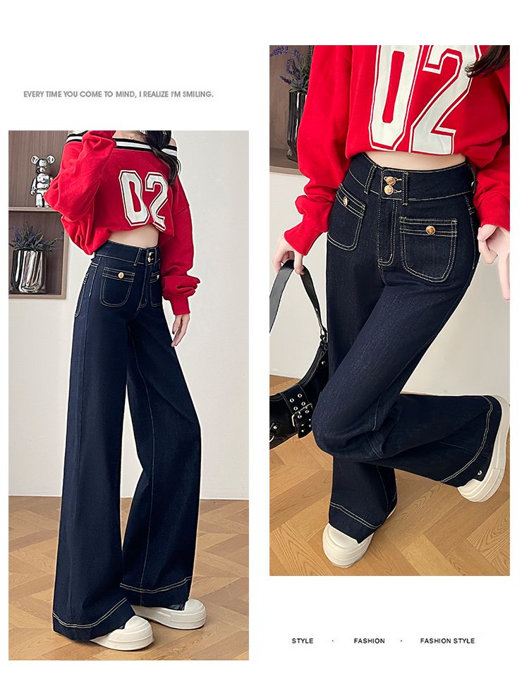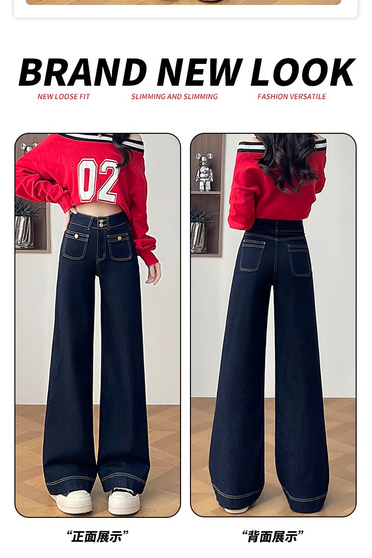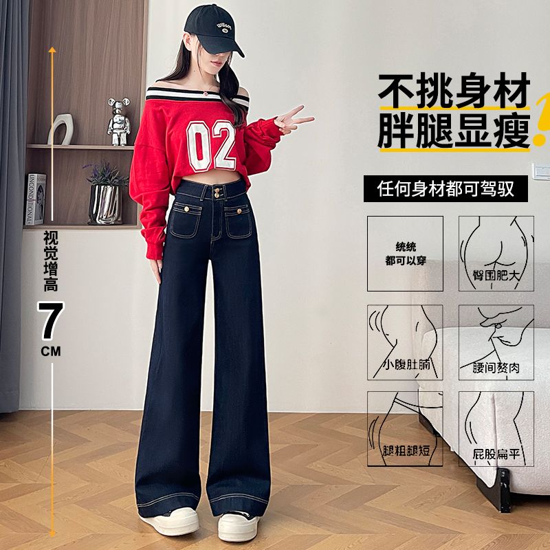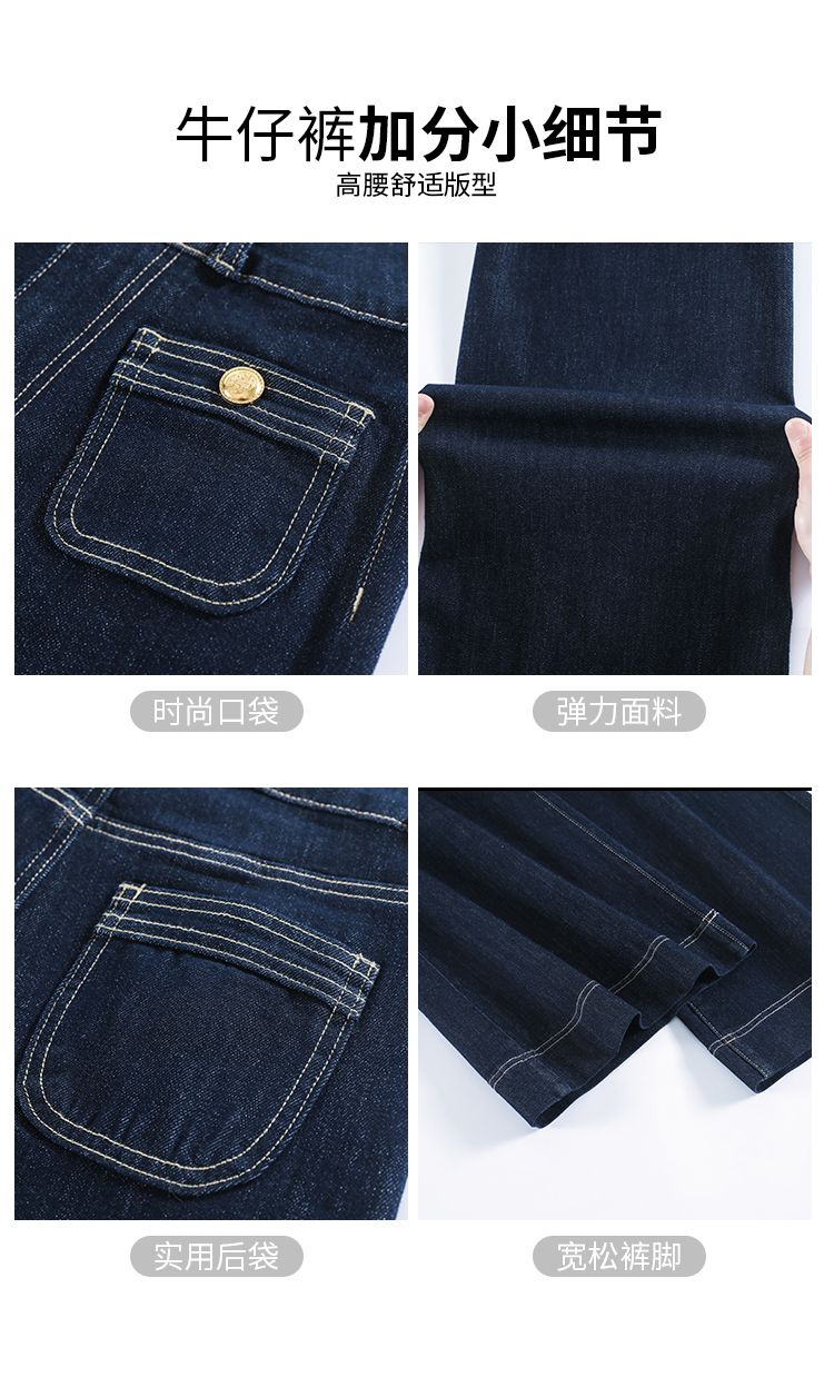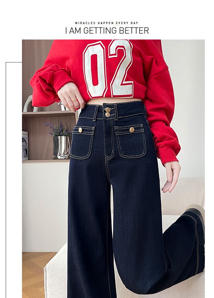 MY14533# 丹宁色窄版直筒牛仔裤新款高腰双扣显瘦弹力阔腿裤女裝貨源服裝批發