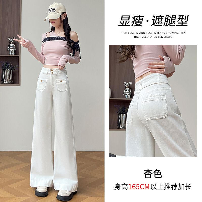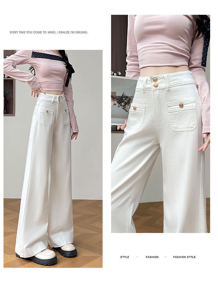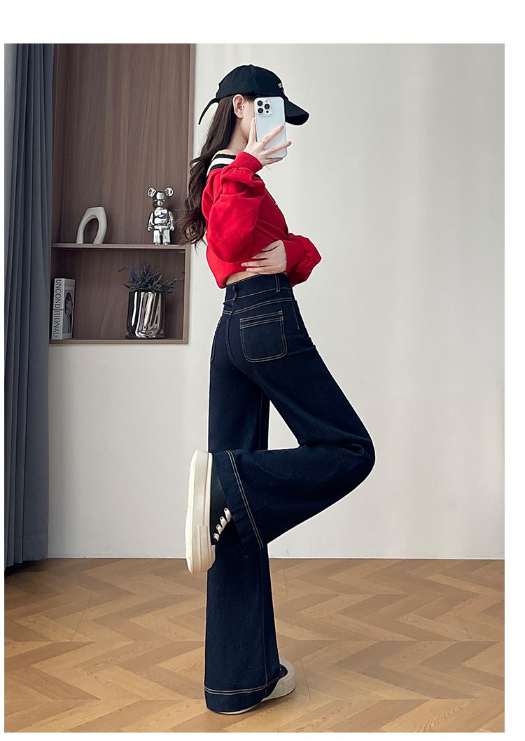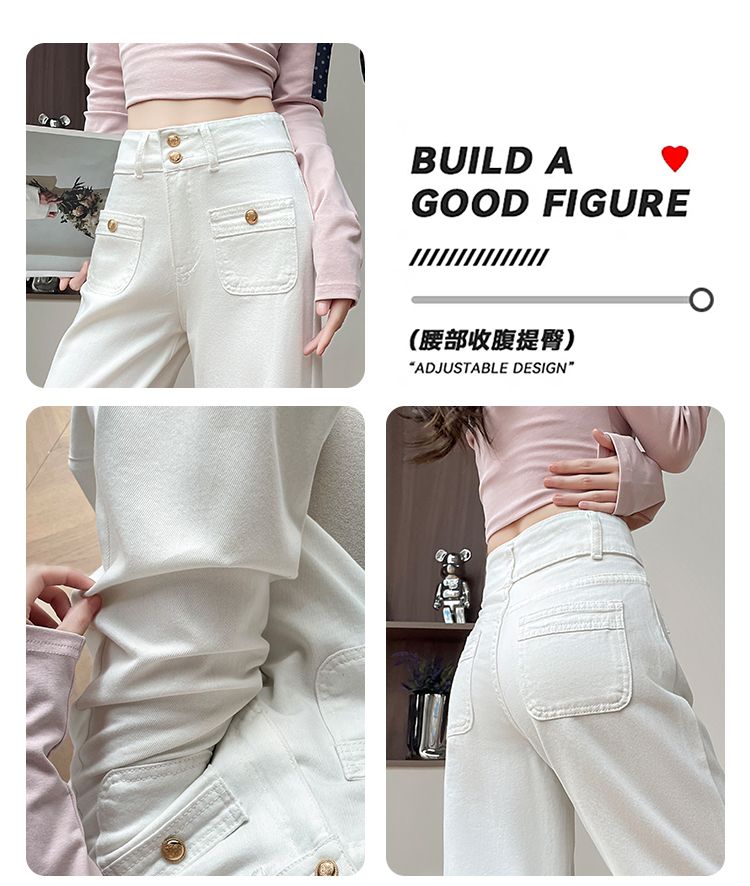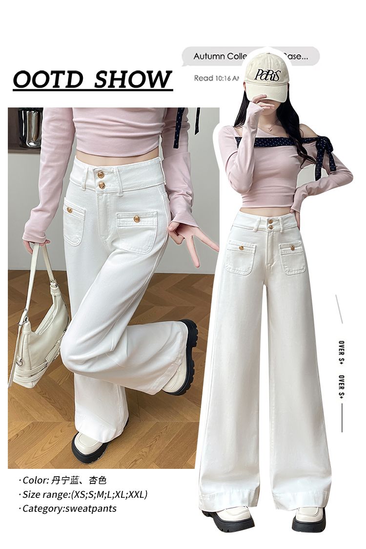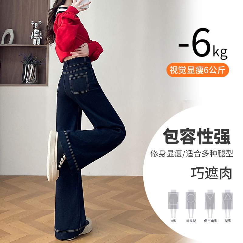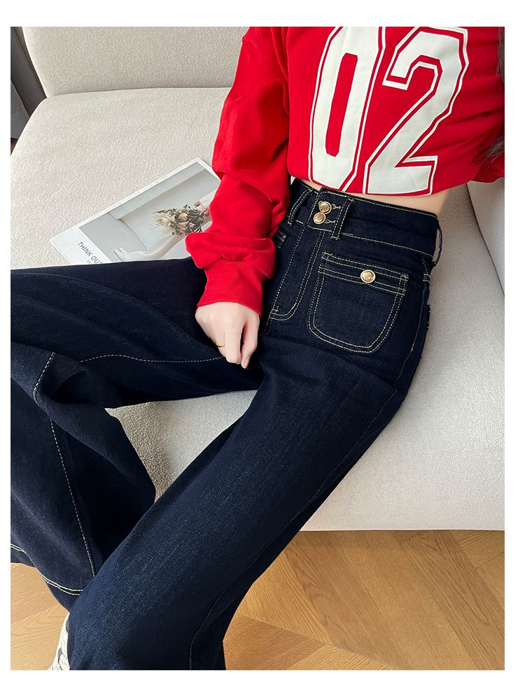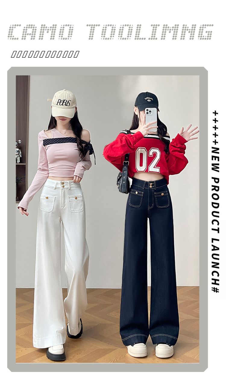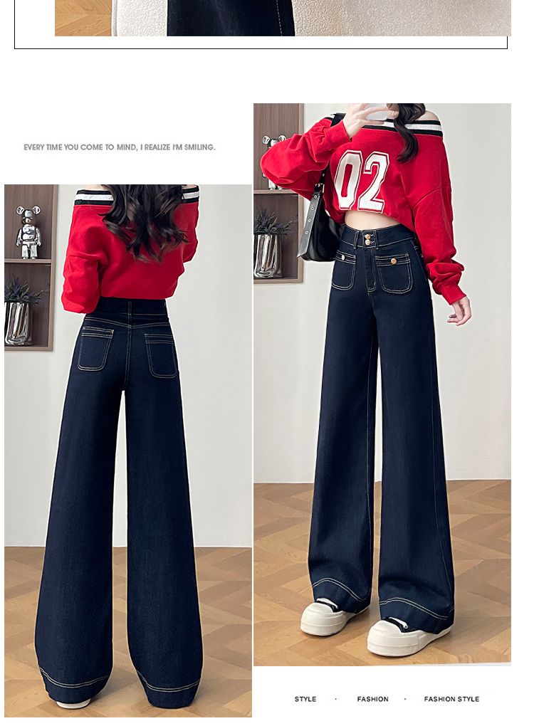 MY14533# 丹宁色窄版直筒牛仔裤新款高腰双扣显瘦弹力阔腿裤女裝貨源服裝批發
