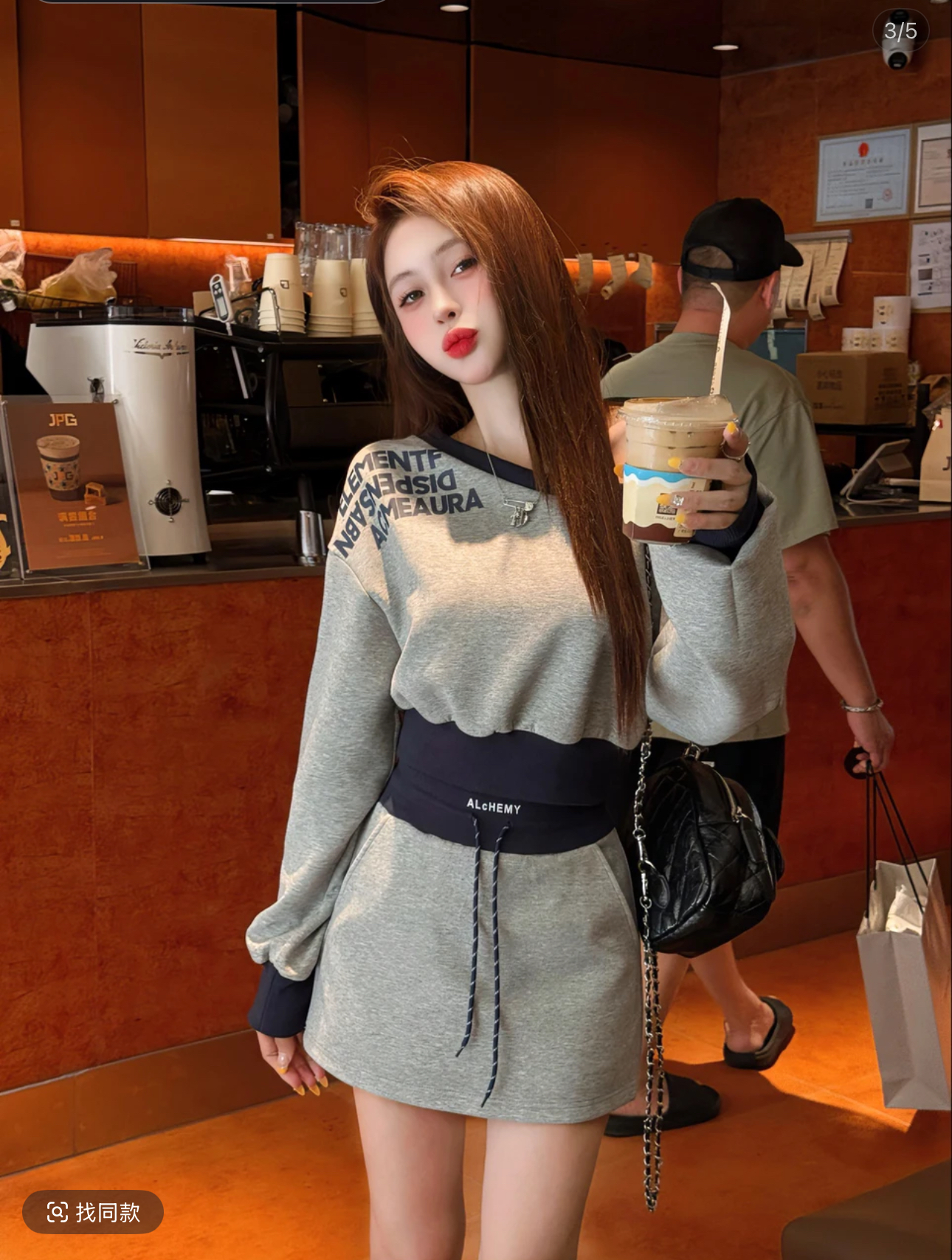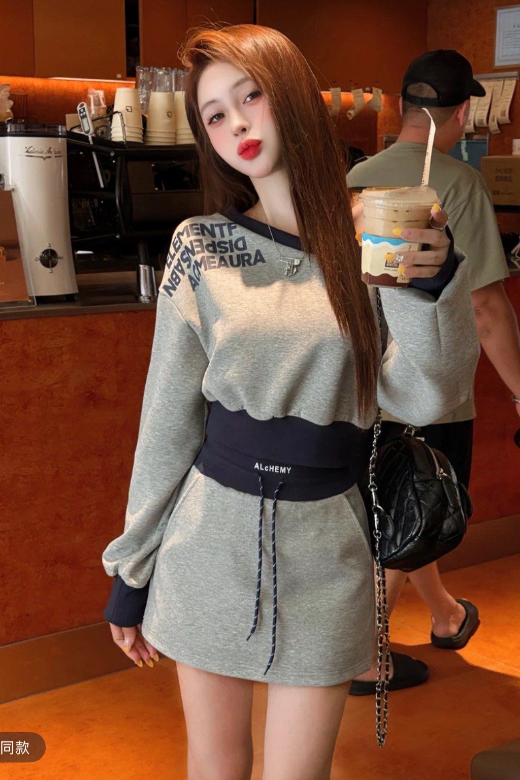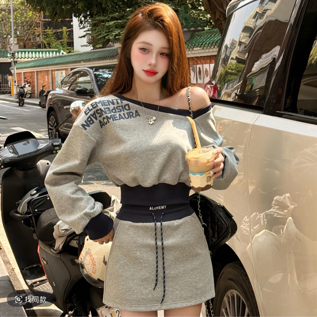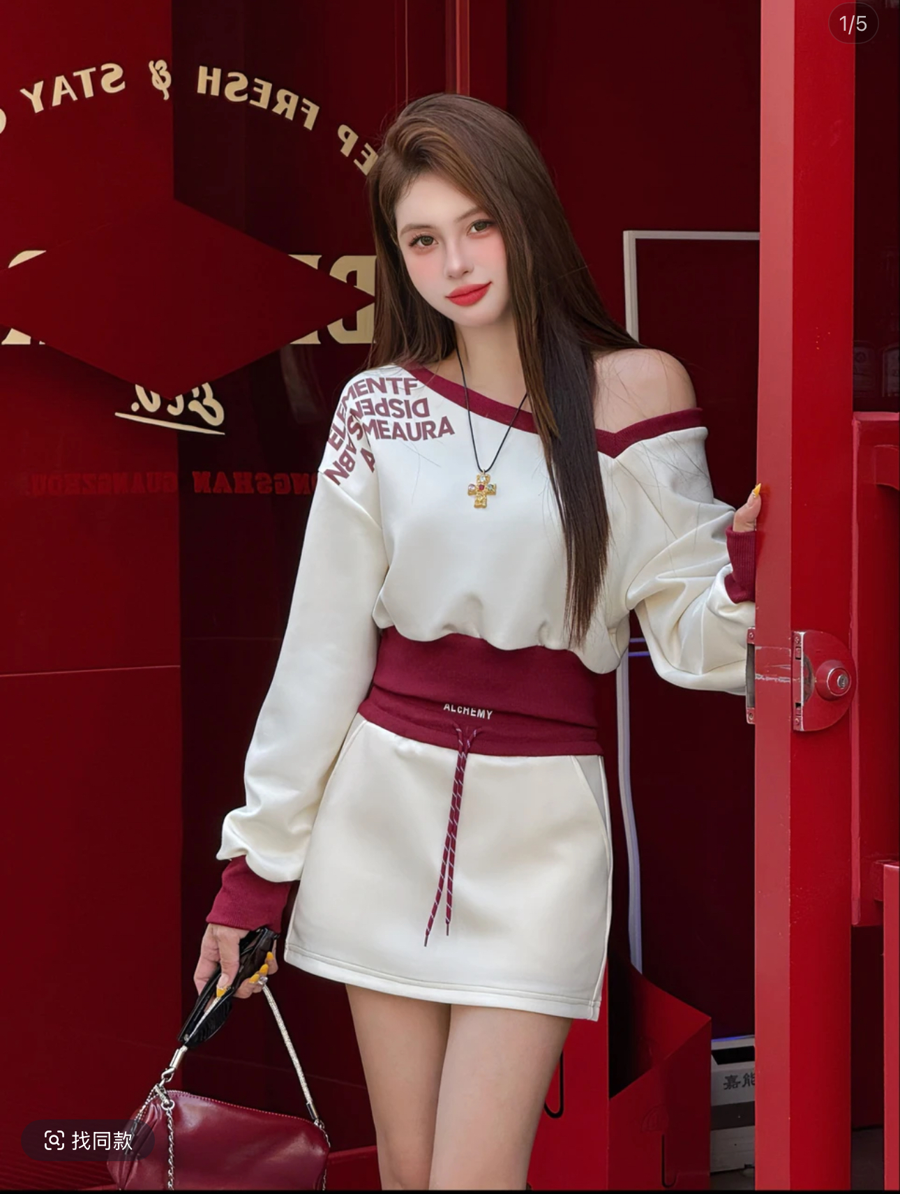 MY14538# 十一家原创云舒漫雅拼色字母露肩长袖上衣+短裙套装小个子两件套女裝貨源服裝批發