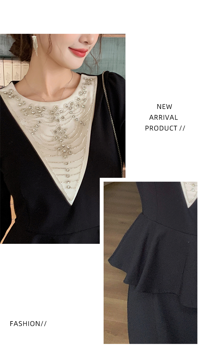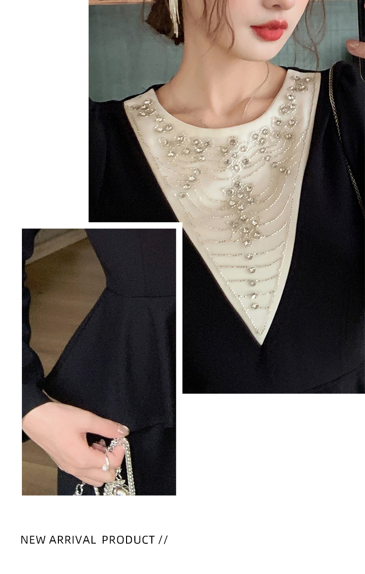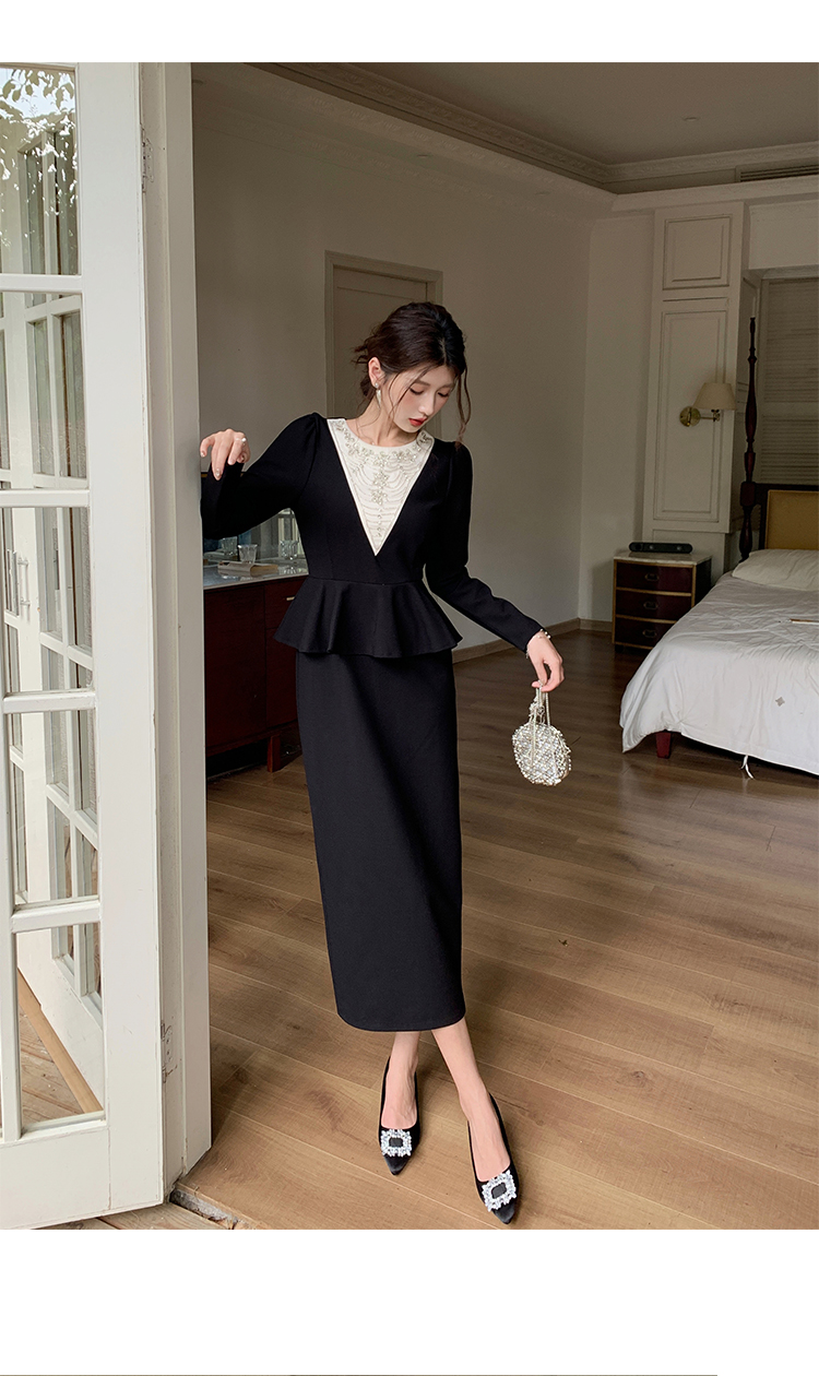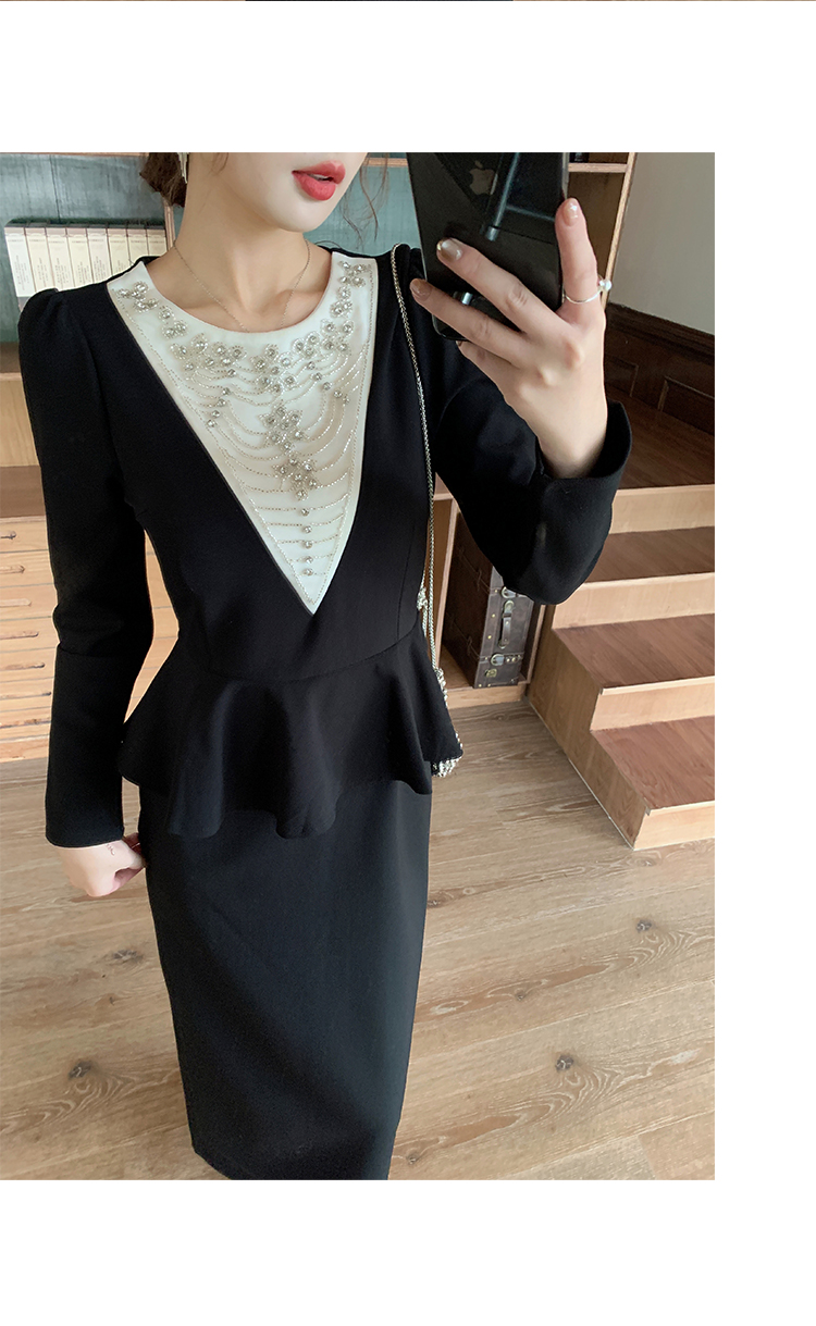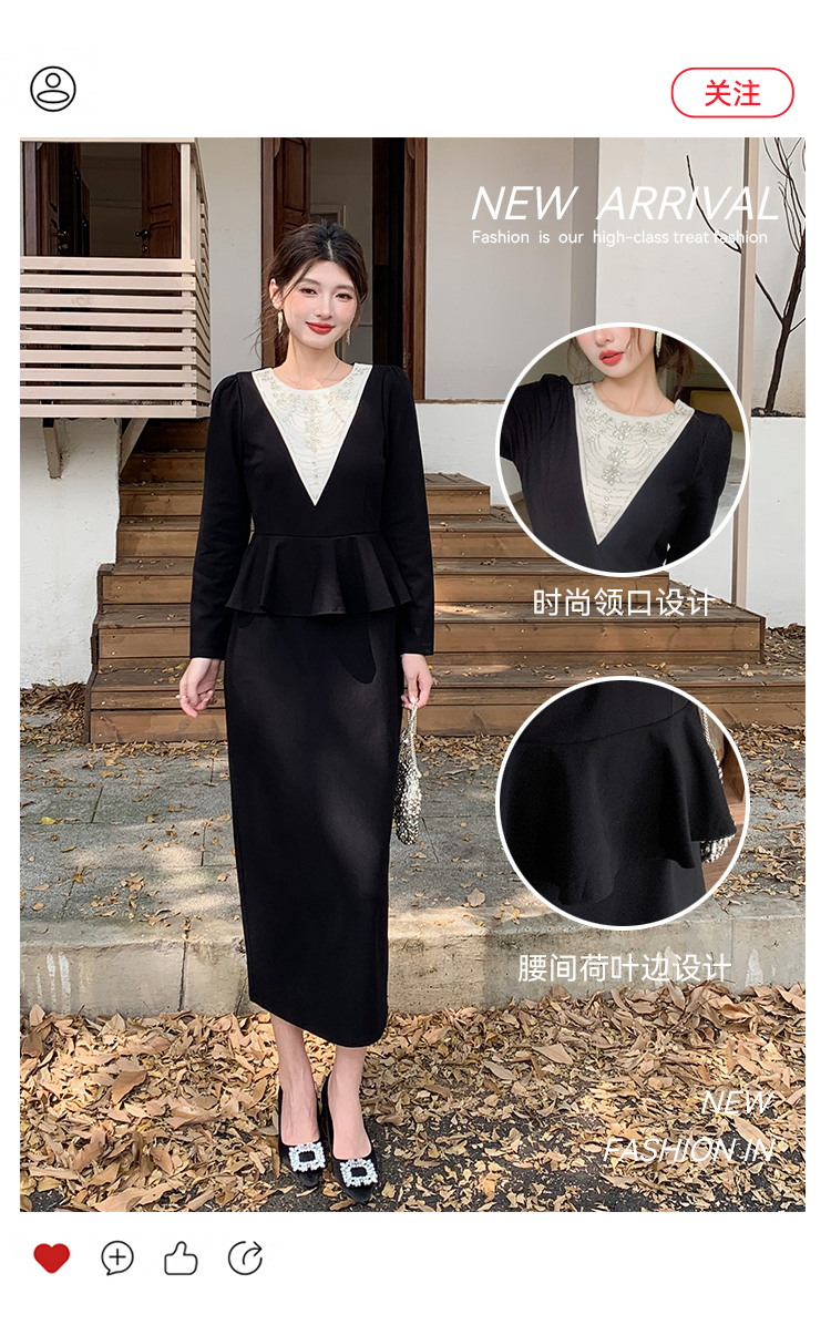 MY14543# 名媛气质减龄长袖拼接荷叶边钉珠假两件连衣裙女裝貨源服裝批發
