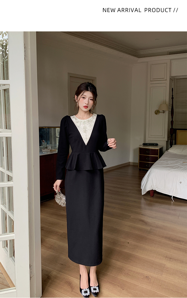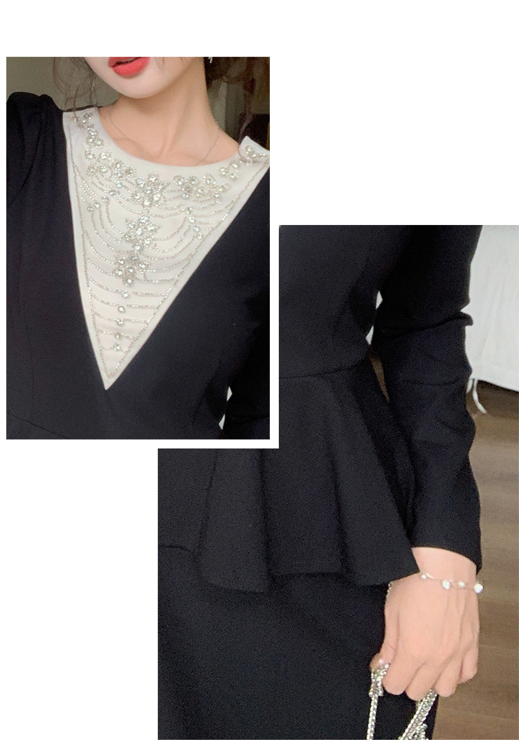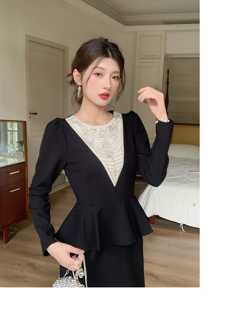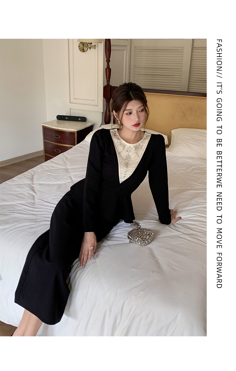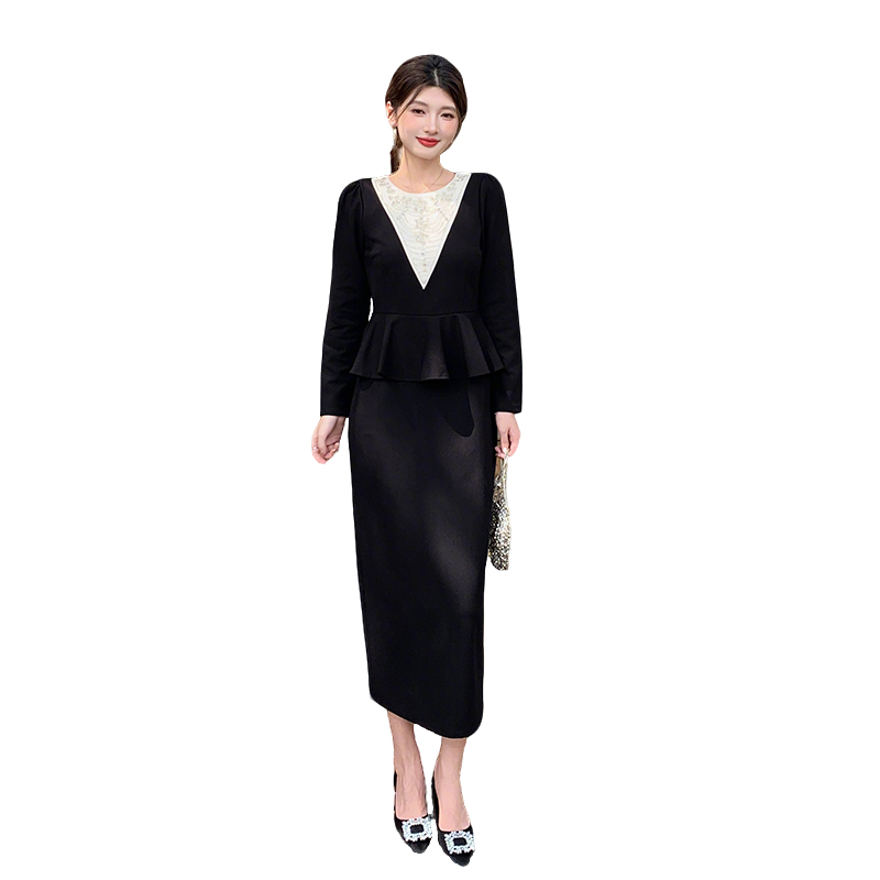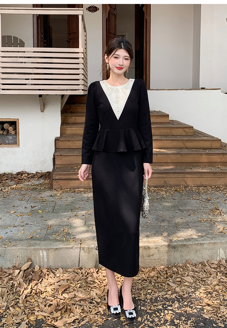 MY14543# 名媛气质减龄长袖拼接荷叶边钉珠假两件连衣裙女裝貨源服裝批發