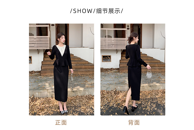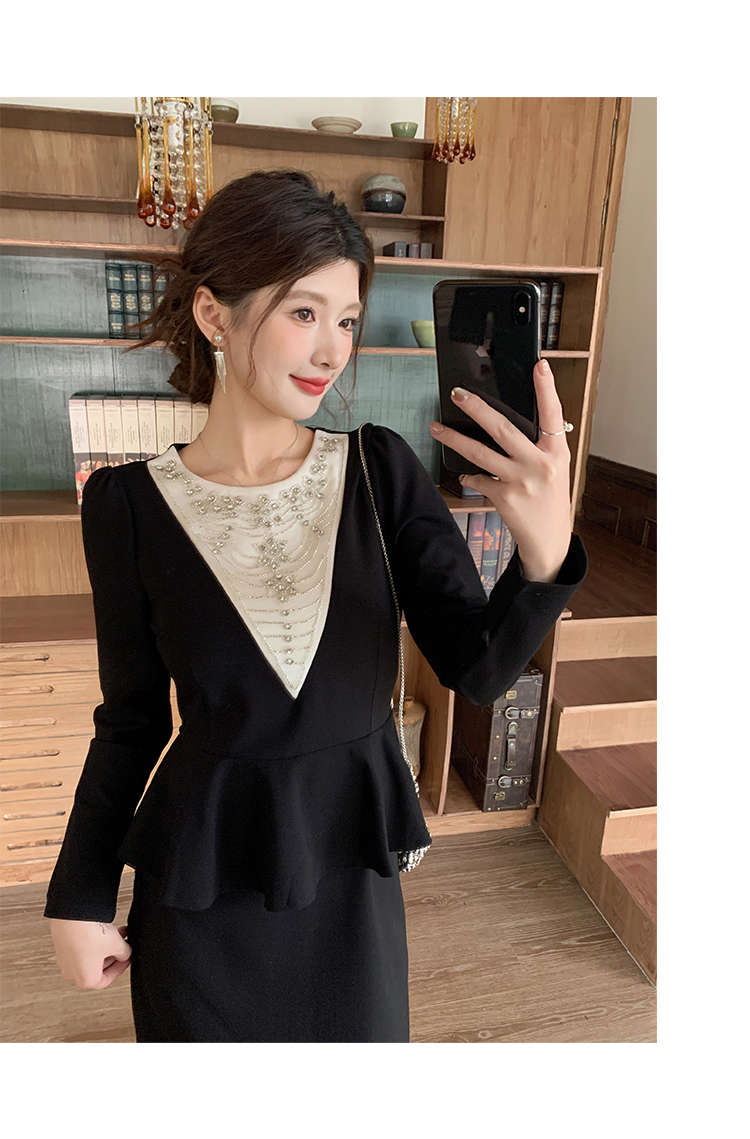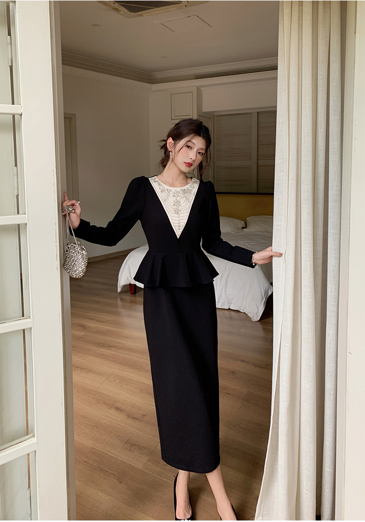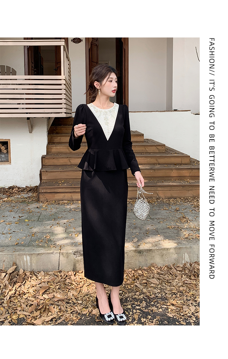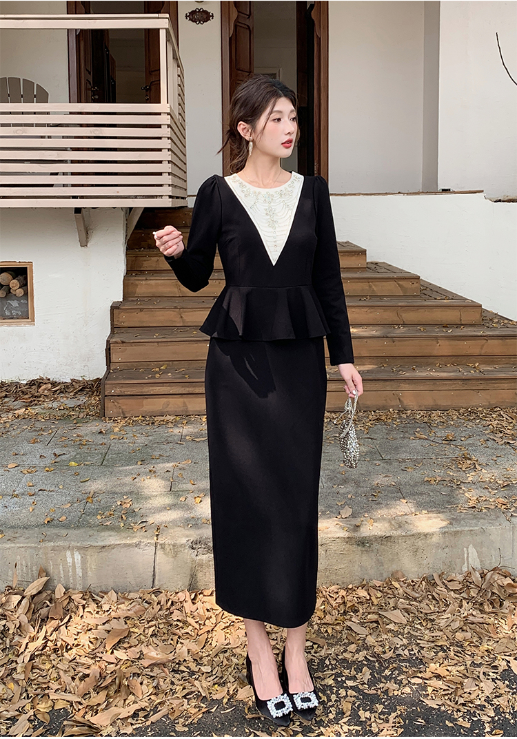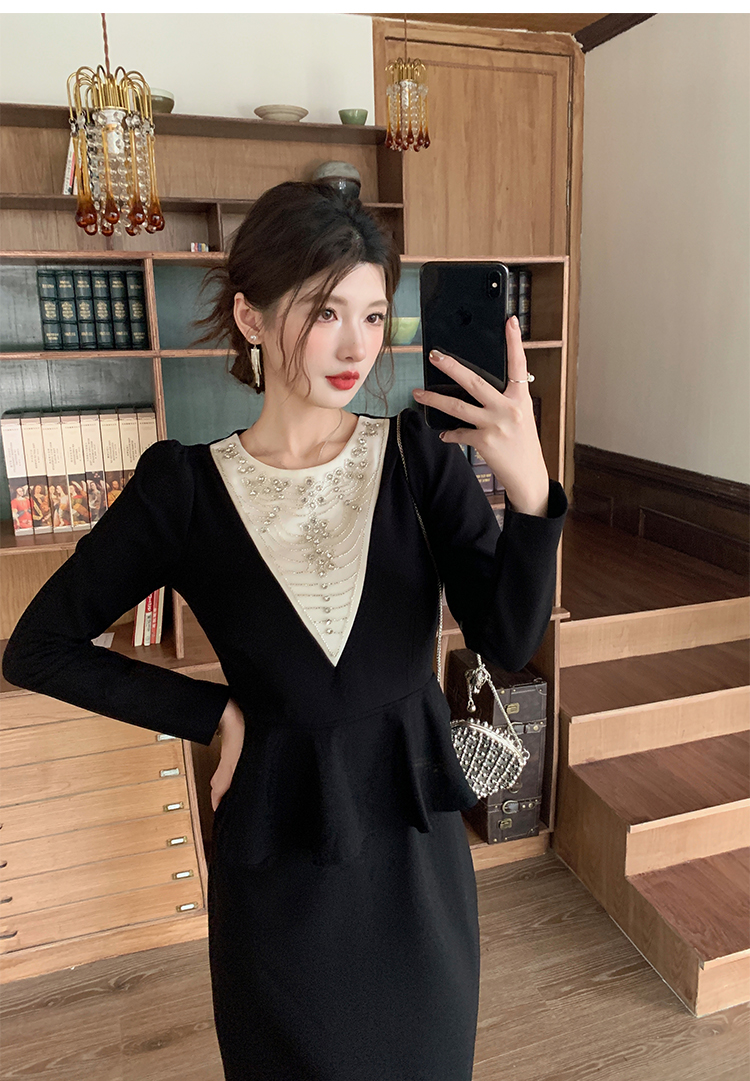 MY14543# 名媛气质减龄长袖拼接荷叶边钉珠假两件连衣裙女裝貨源服裝批發
