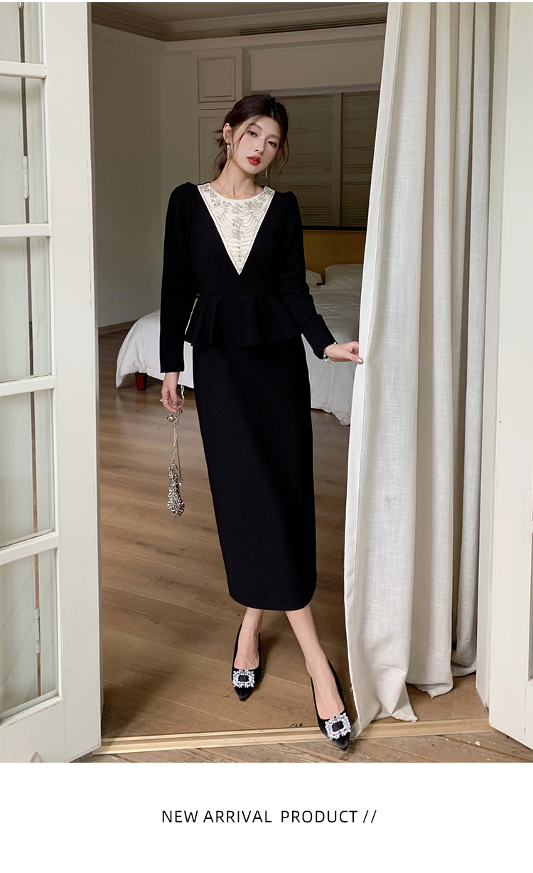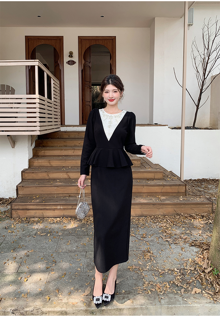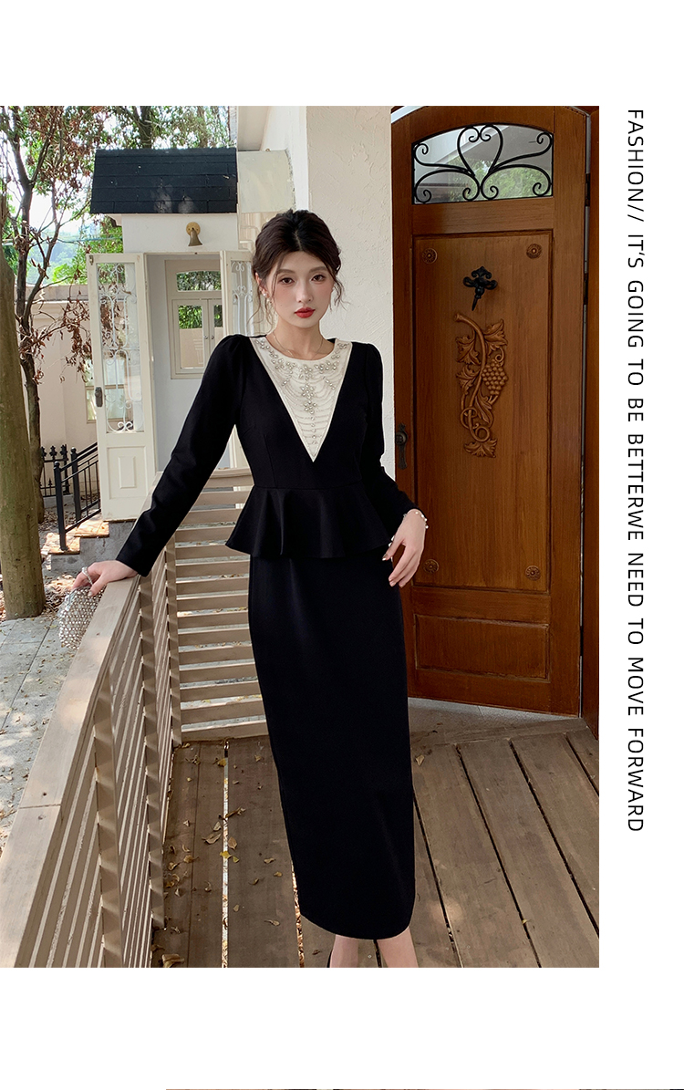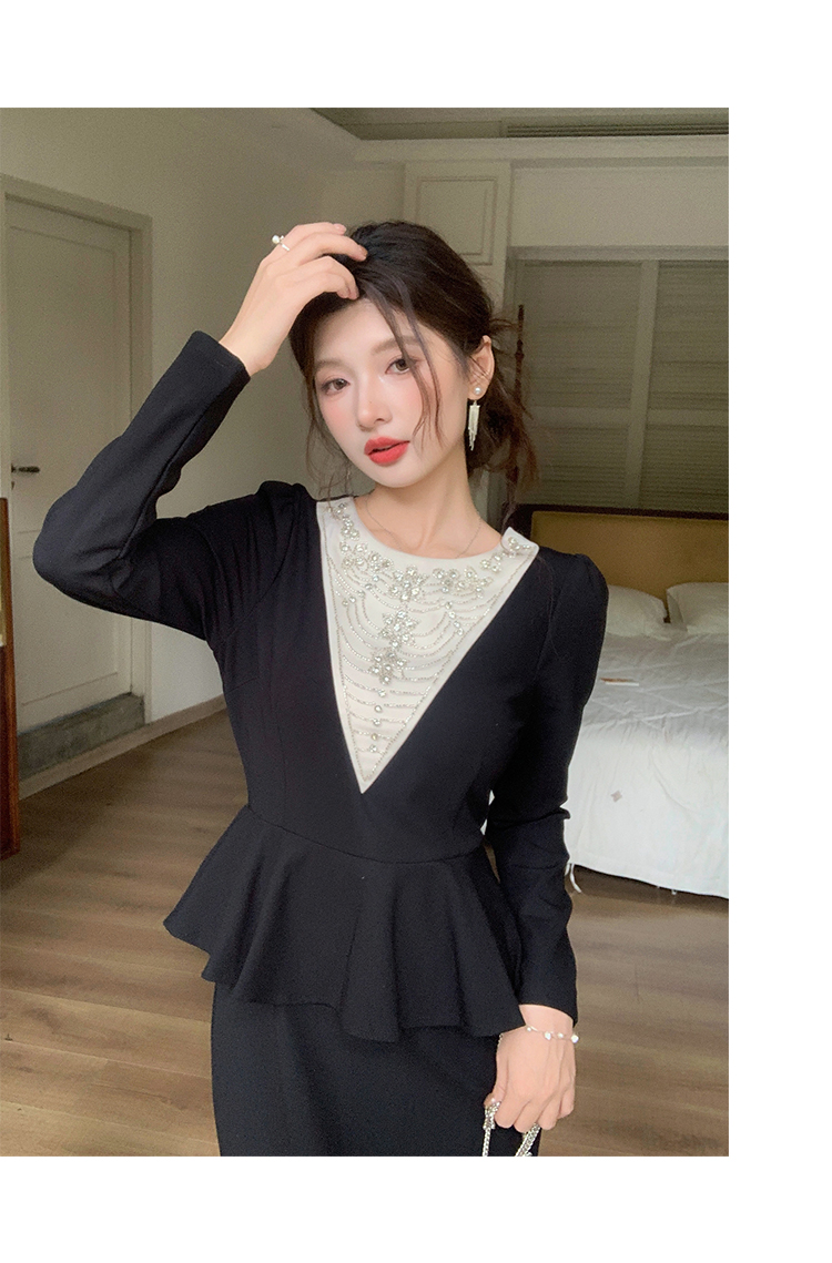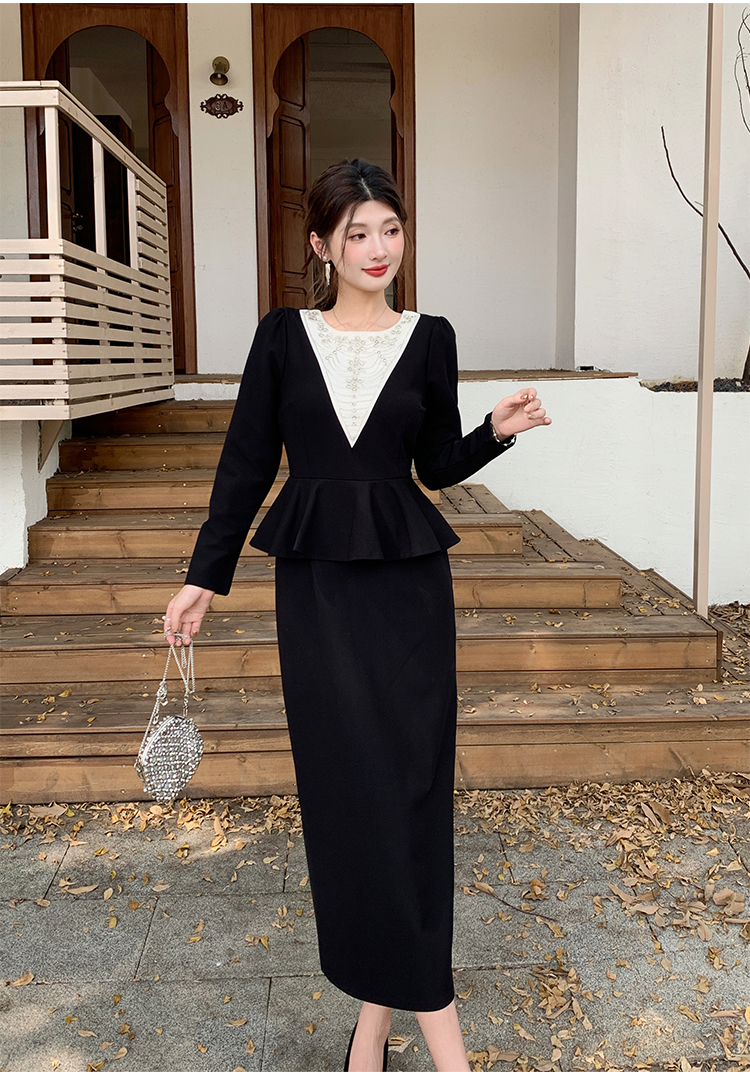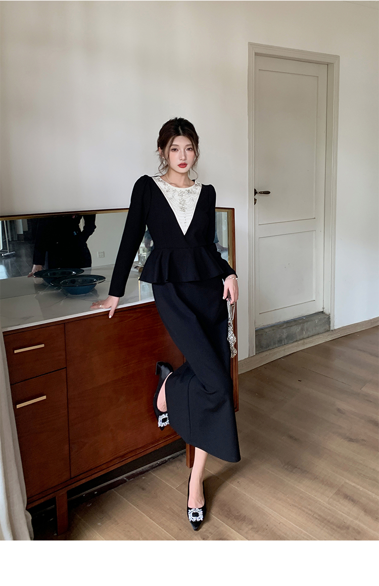 MY14543# 名媛气质减龄长袖拼接荷叶边钉珠假两件连衣裙女裝貨源服裝批發